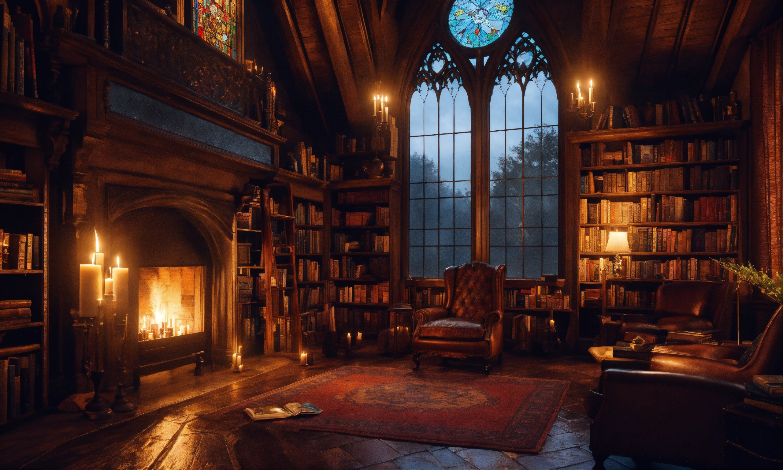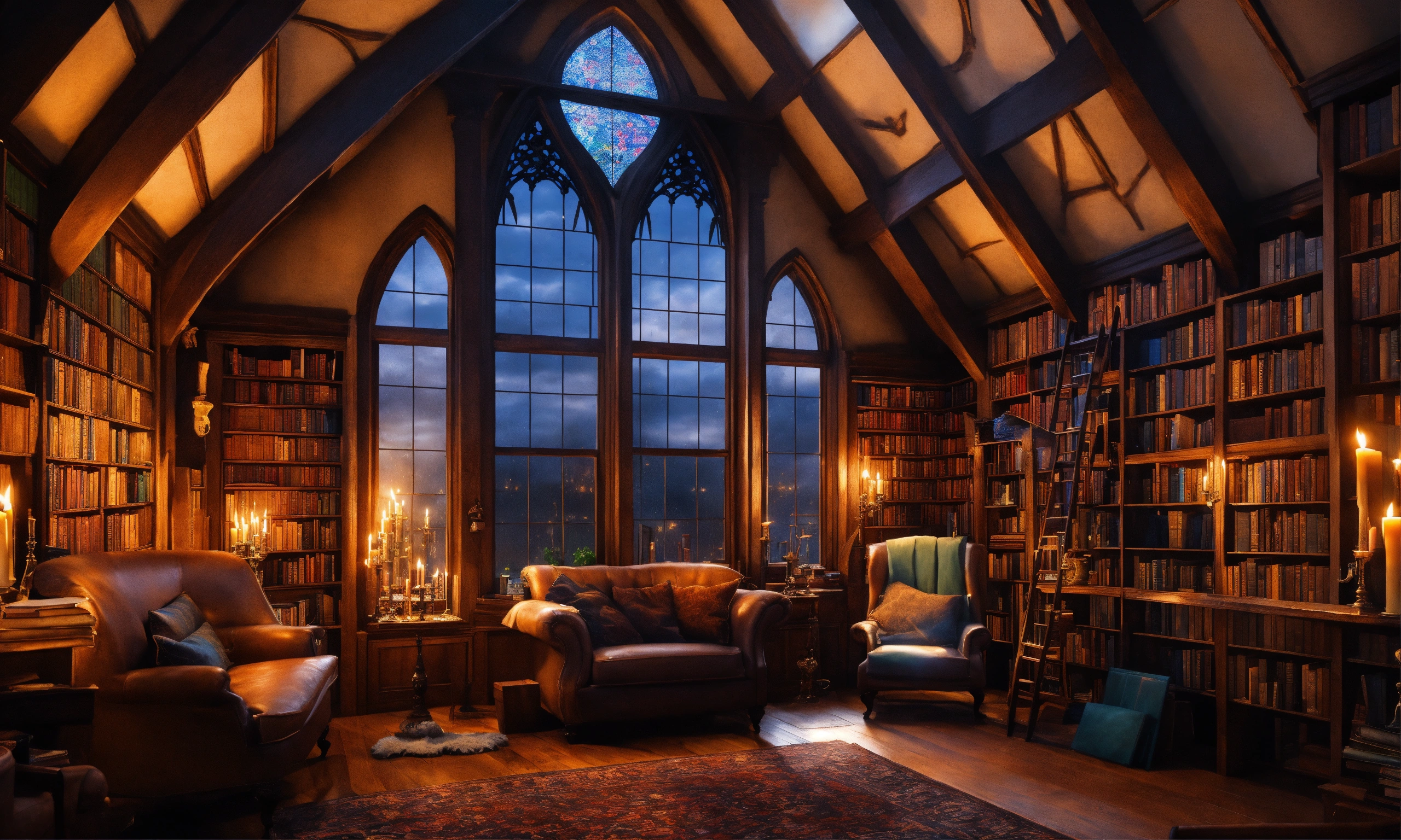 Epic shot of very cozy ultra detailed harry potter library with high vaulted ceilings and a ladder leaning against the bookshelf, winged armchair by the fireplace next to the large gothic leaded glass window, outside it is a rainy night, rain runs down the windows from outside, inside cozy with candle lights and magical books, little photorealistic, digital painting, sharp focus, ultra cozy and inviting, wish to be there. very detailed, arty, should rank high on youtube for a dream trip.