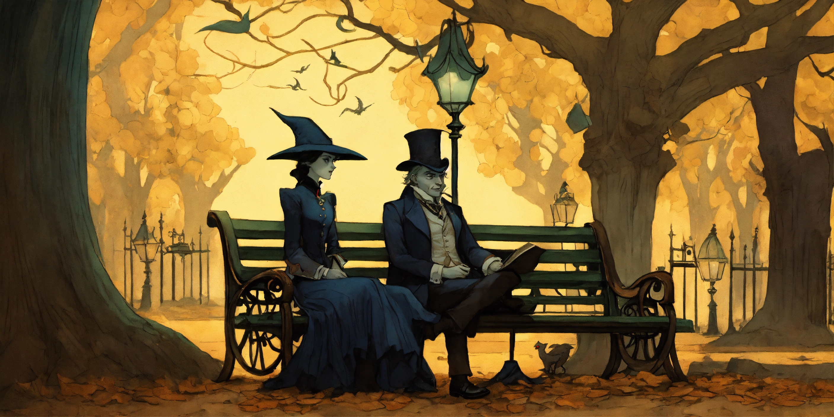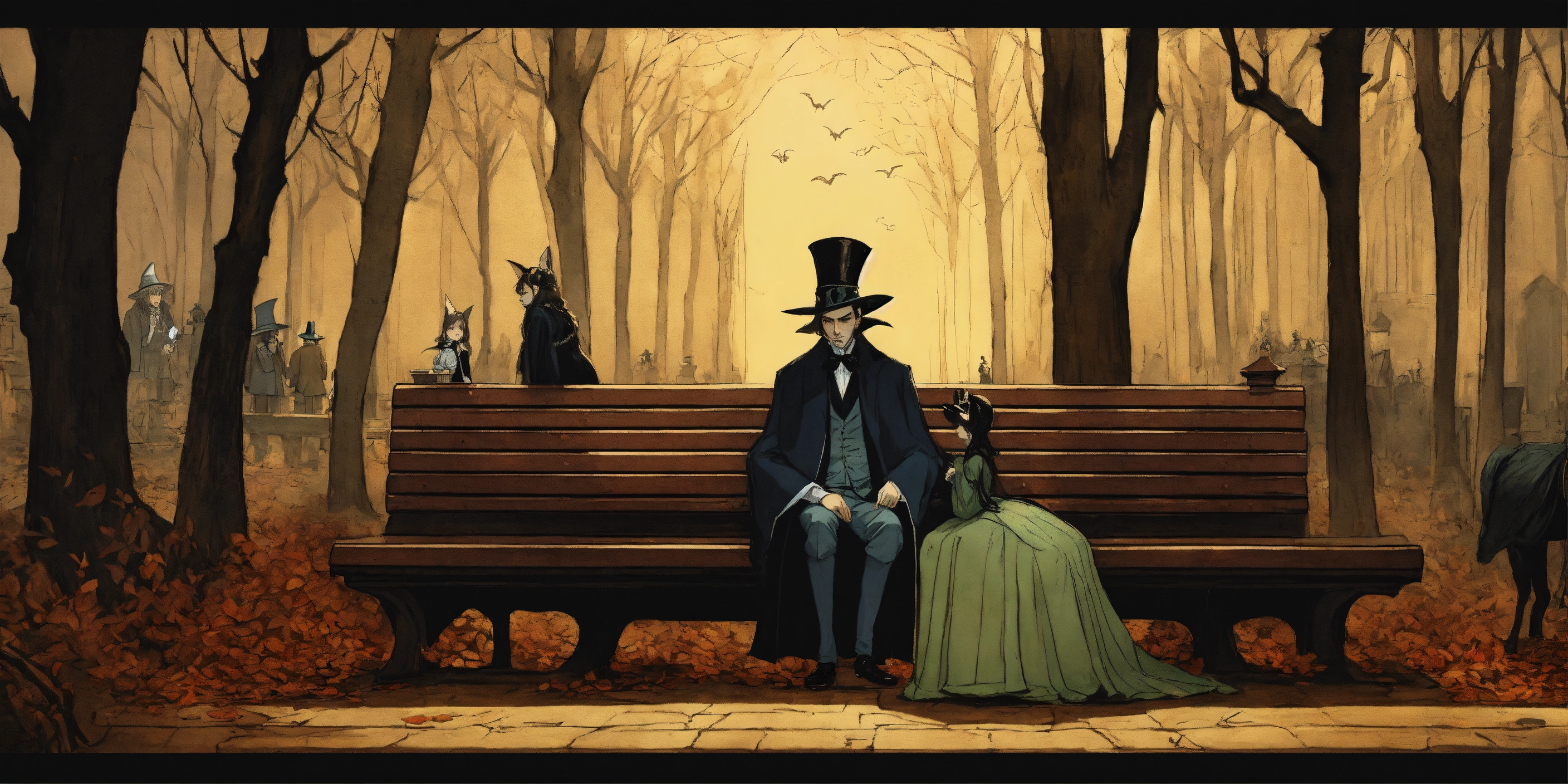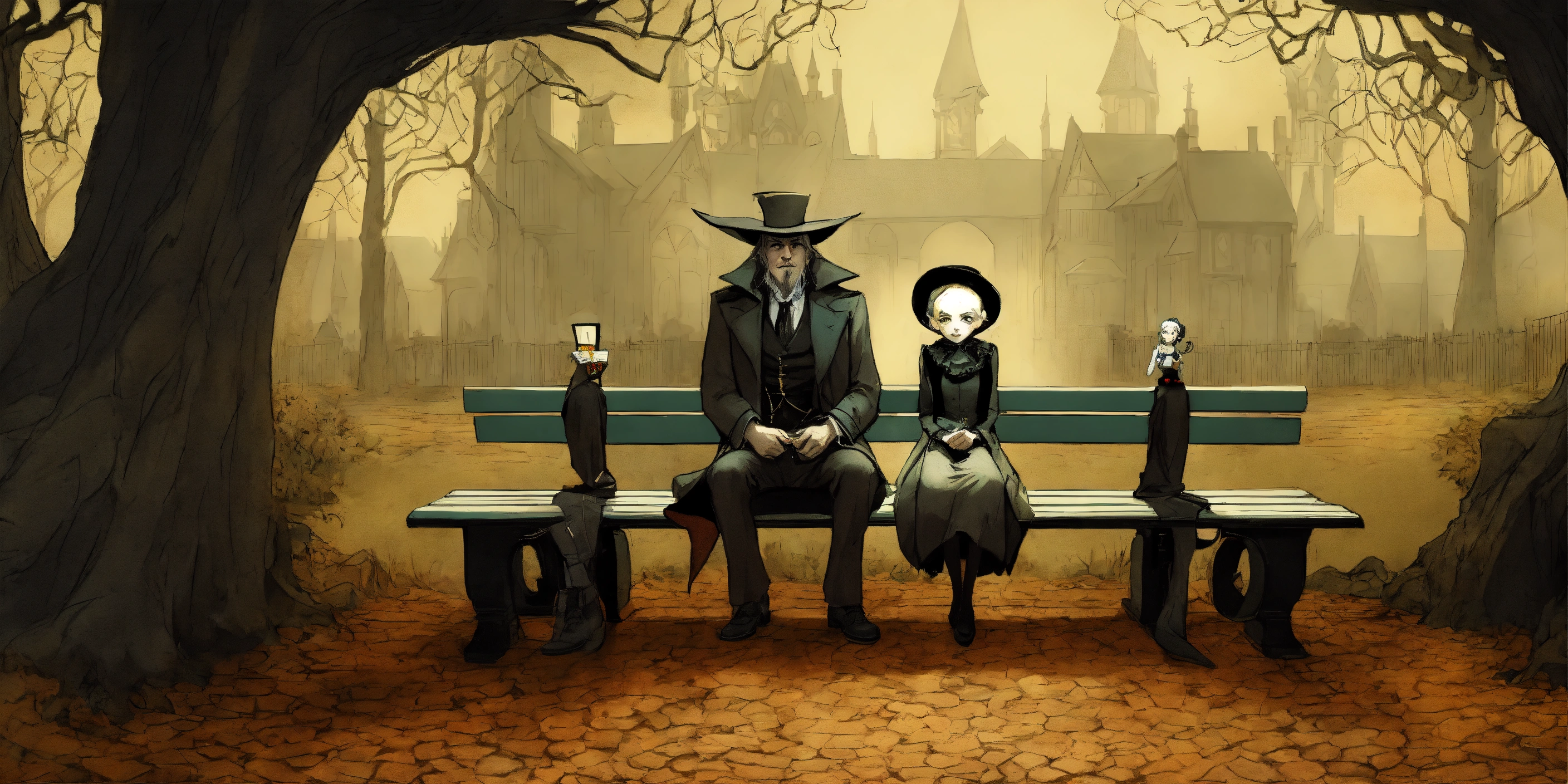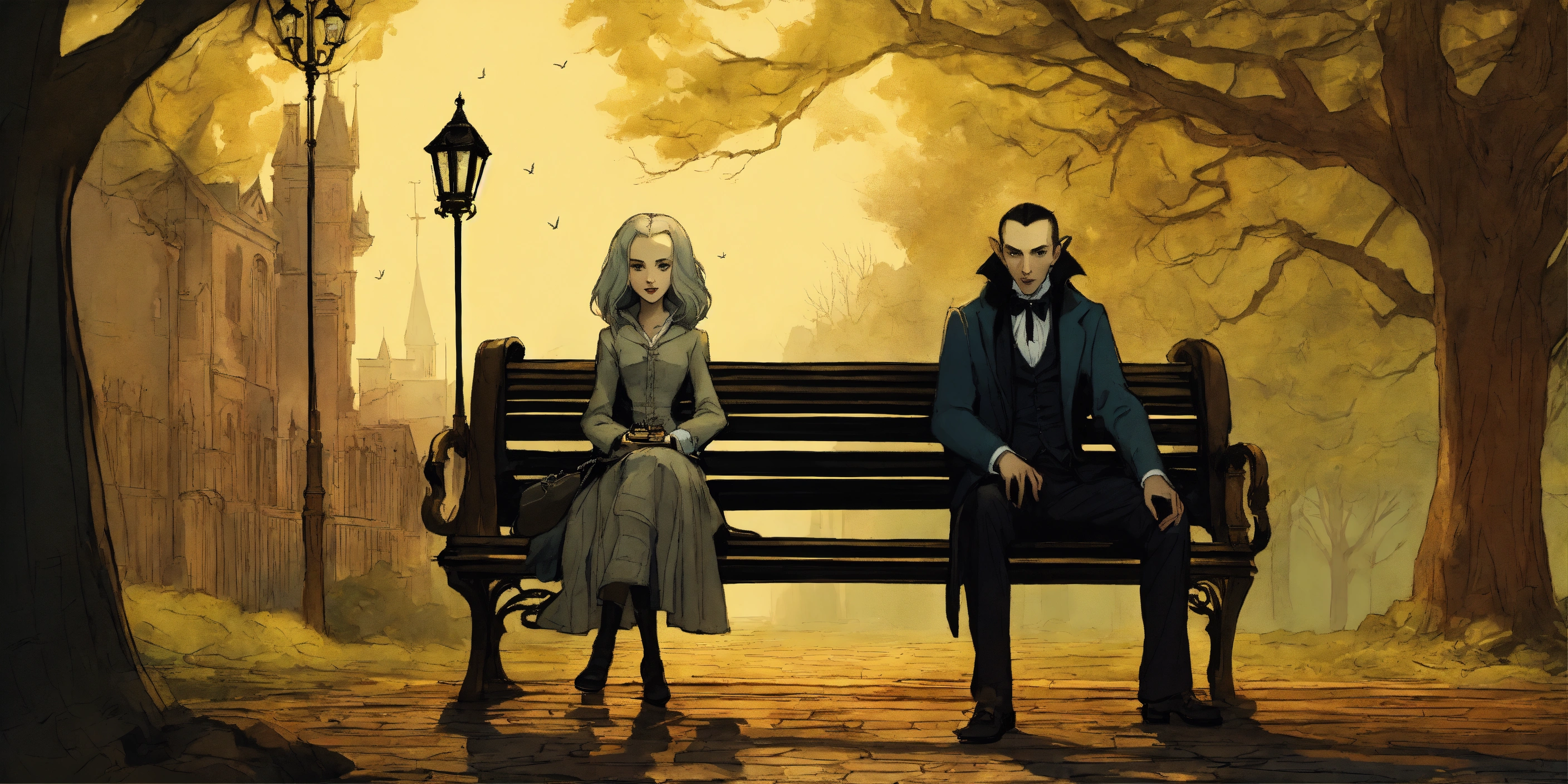By gris grimly, maurice sendak, dracula and mina harker sitting on a park bench, in the style of jean-baptiste monge, tim burton, remedios varo, juni ito, giorgio de chirico 8k resolution concept art trending on artstation hyperdetailed medium shot, vignette 8k resolution hyperdetailed intricate liminal eerie precisionism dslr filmic, cinematic, sharp focus, brightly lit.