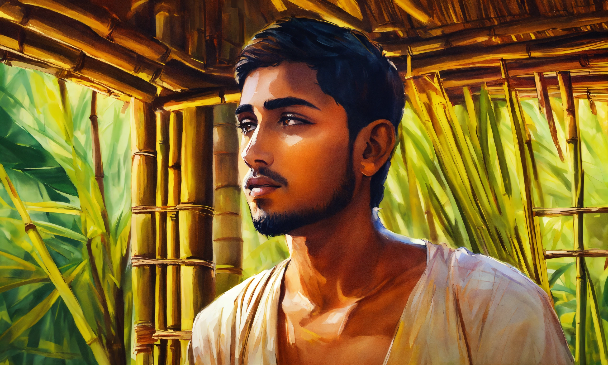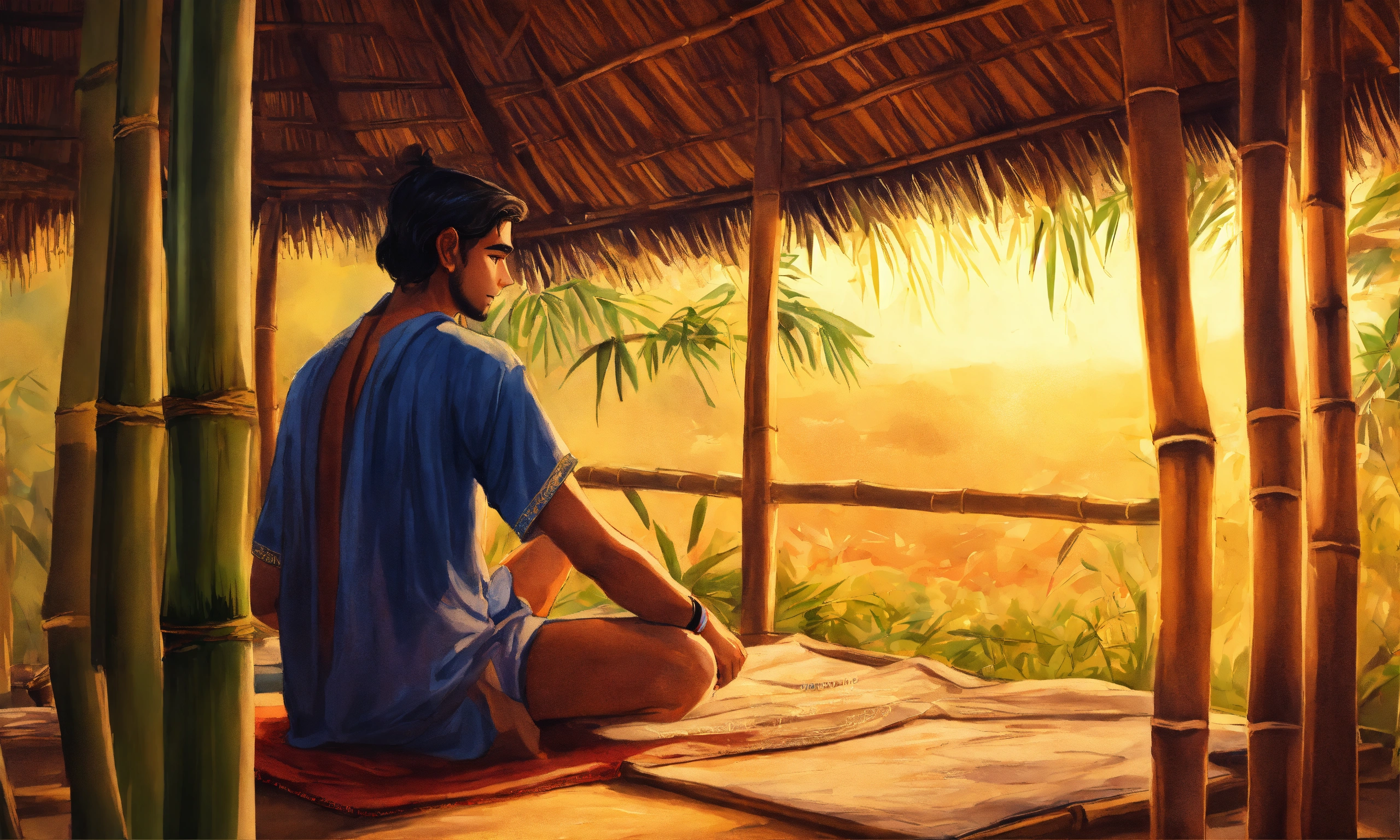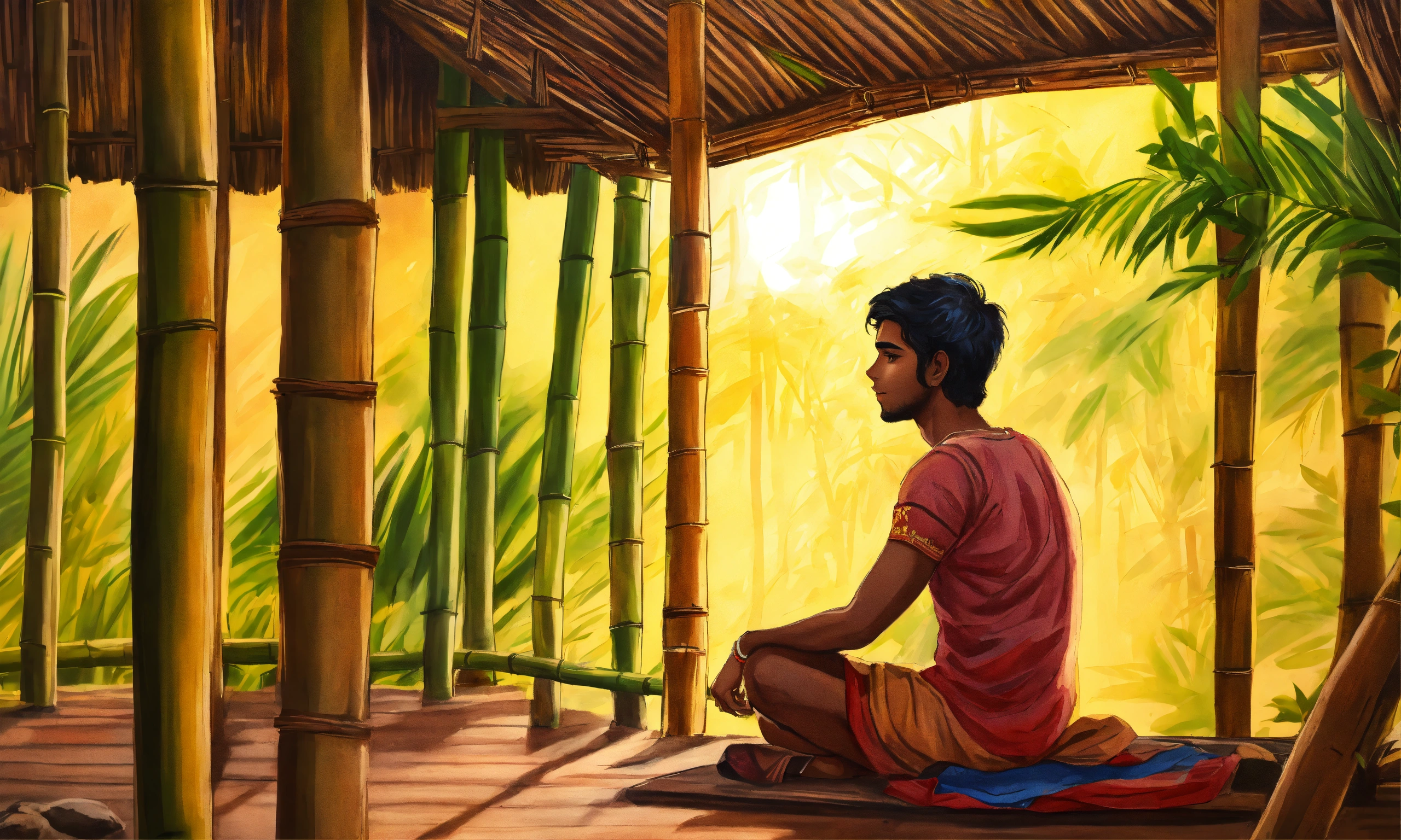A hand drawn painting of young indian man in a bamboo hut