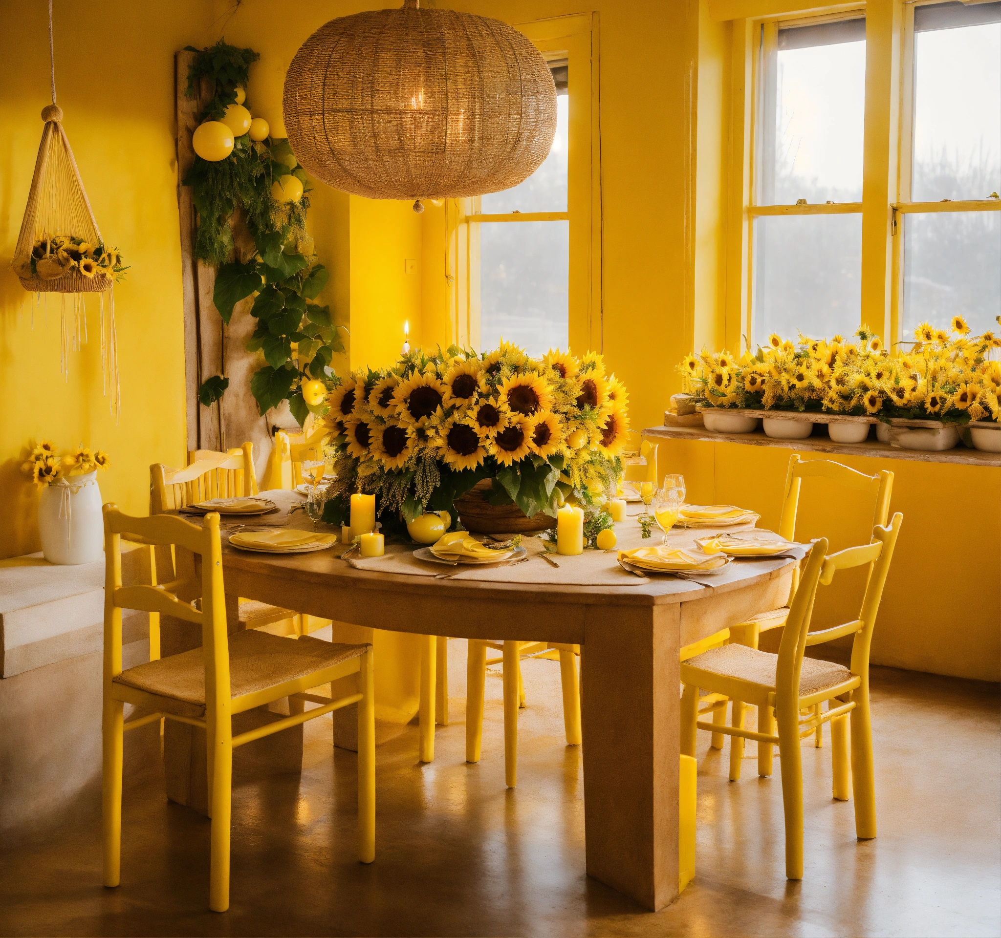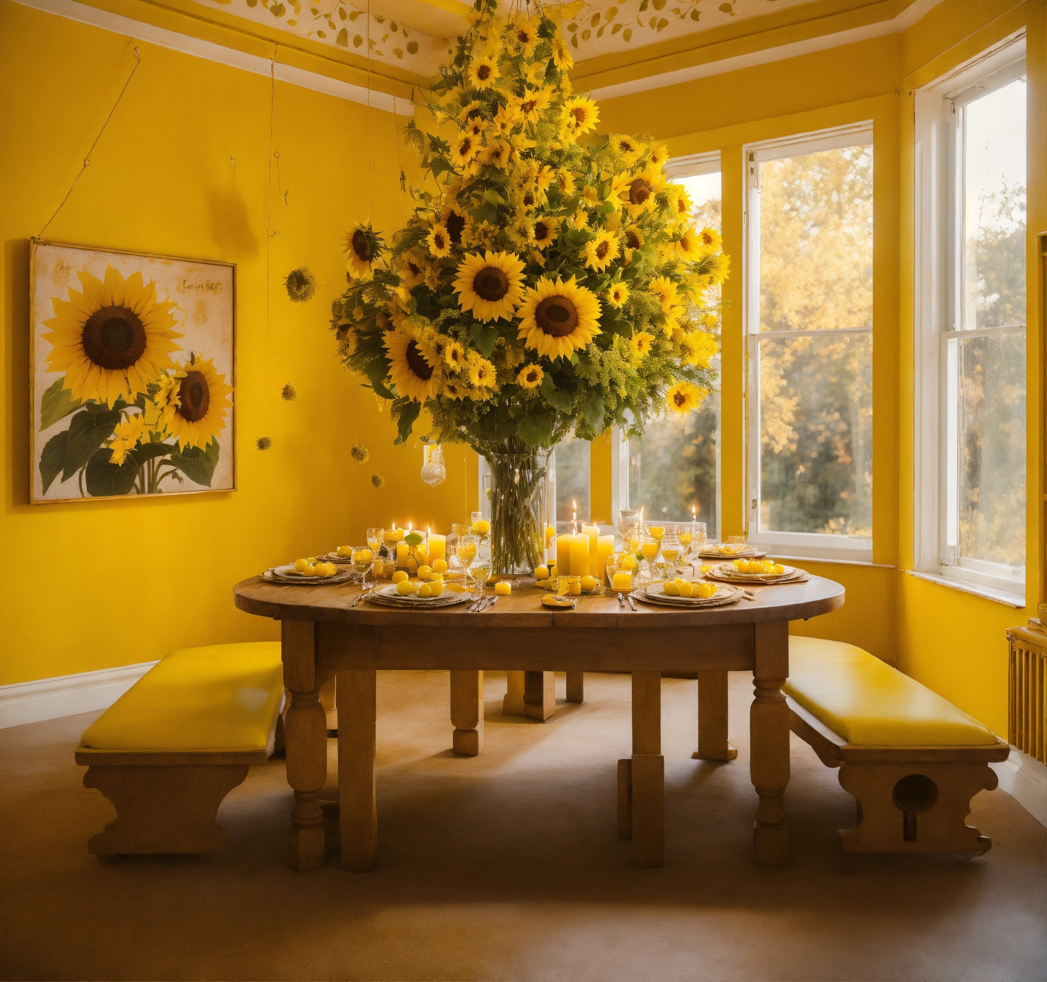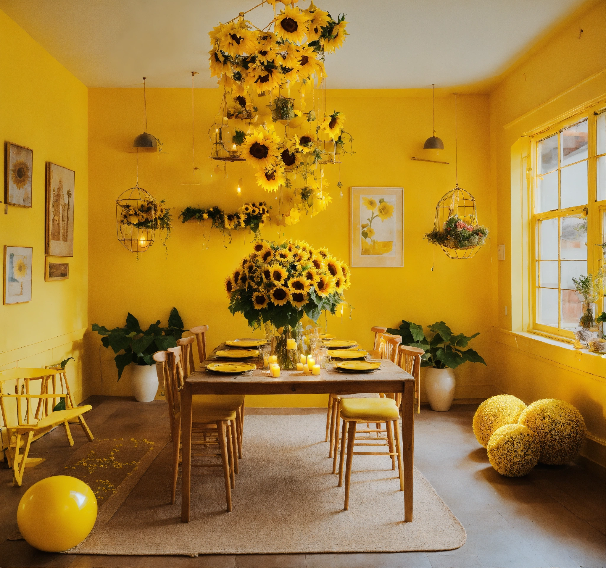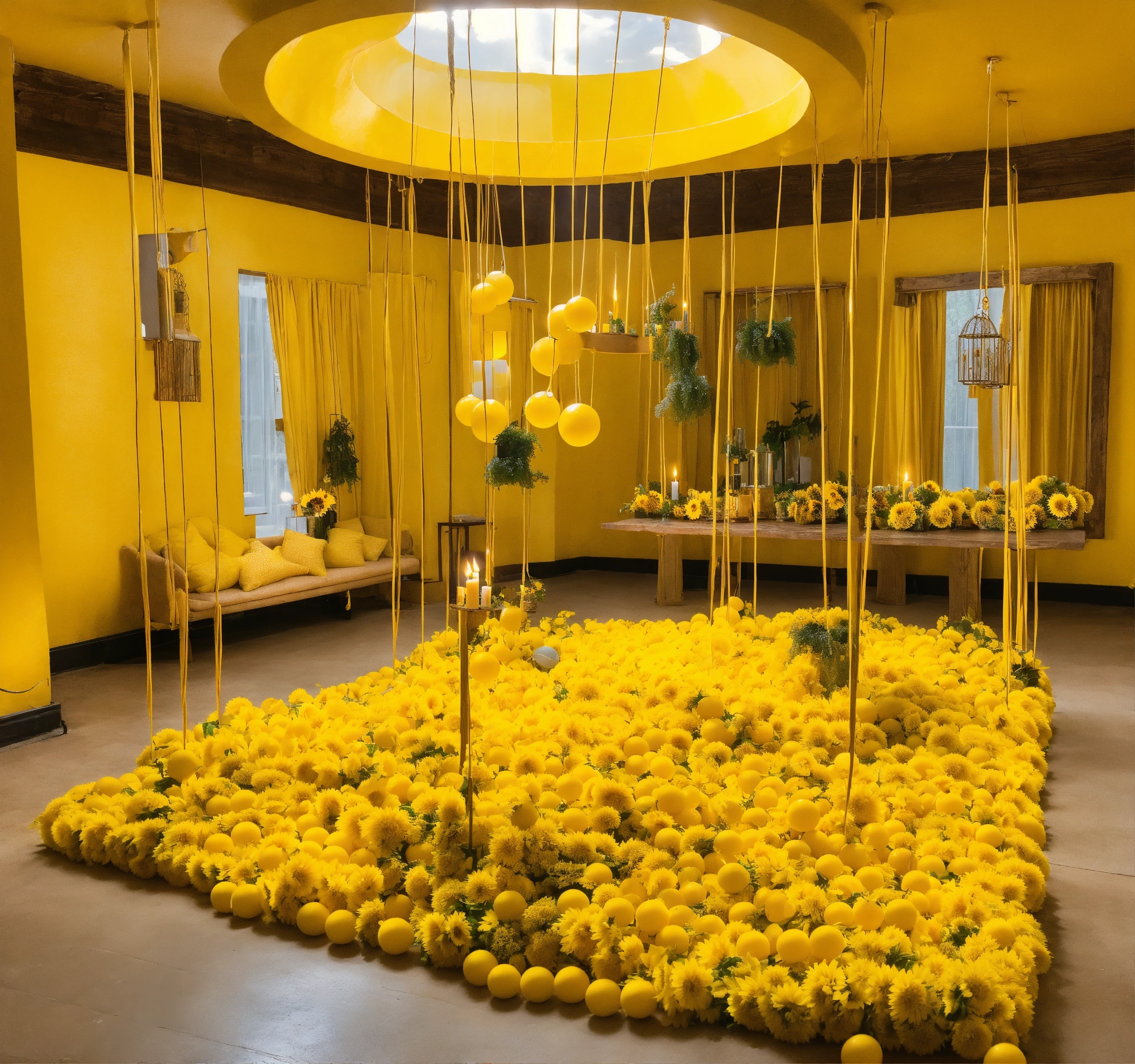 In a yellow room, sunflower swing a dinner table, yellow ball pit, slide yellow flowers everywhere, candles romantic decor