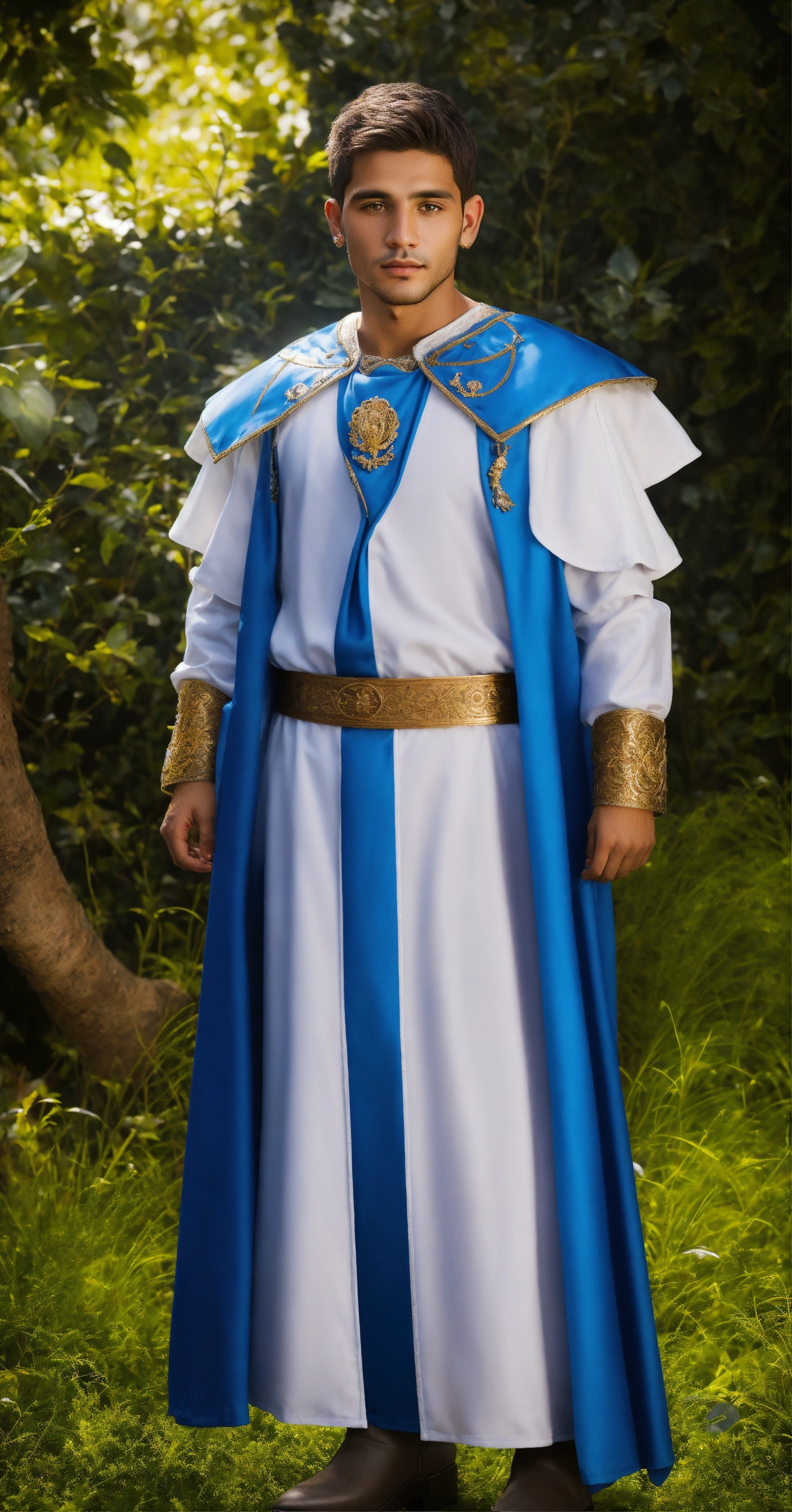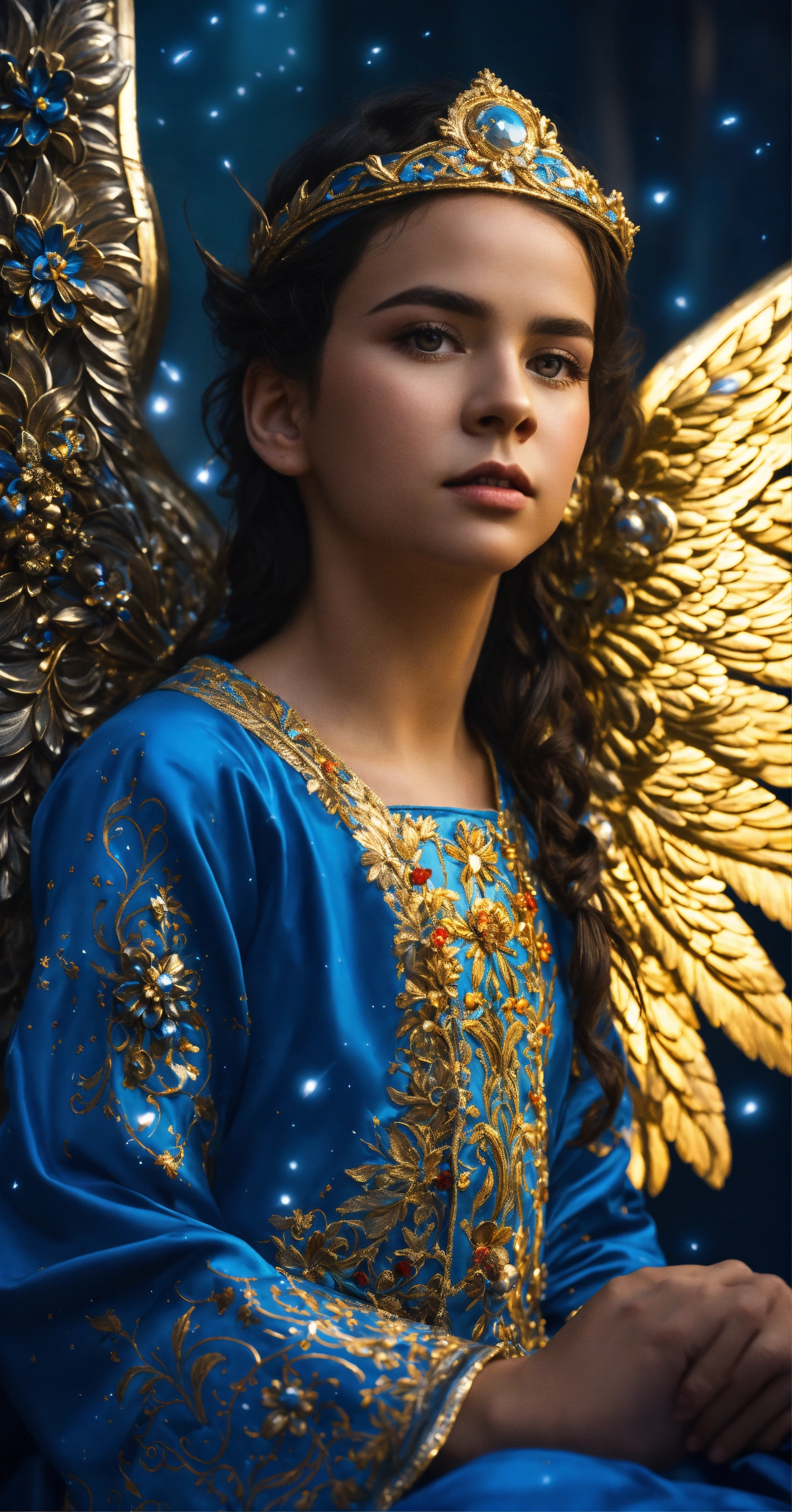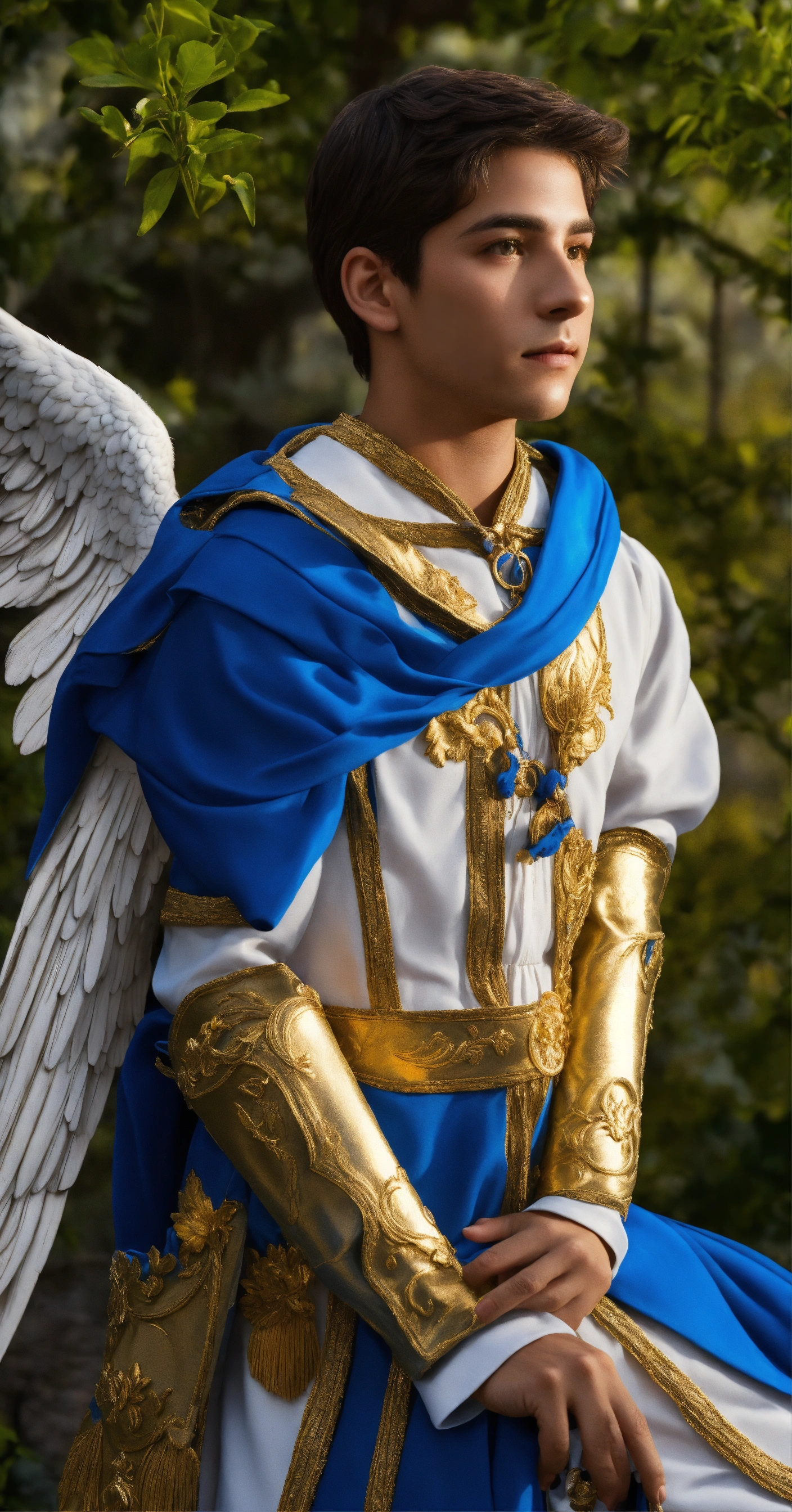 2 arcangel miguel varones con alas de angel de color azul detalladas y luminosas. 1 arcangel miguel varon de 30 años protegiendo a un niño varon angel de 9 años. los 2 arcangeles miguel varones tienen alas azules luminosas grandes y uniformes . sus rostros bellos y detallados. ojos muy claros que se abren con una mirada profunda y penetrante. cabello blanco detallado y varonil. vestidos tipo túnica de color blanco con muchos detalles azules con plateado. están en un jardín hermoso y detallado con un firmamento nocturno. ilustracion hiperdetallada, hiperrealista. realismo. obra maestra. arte digital, hd, alta calidad. alta definición, alta definición. 8k.