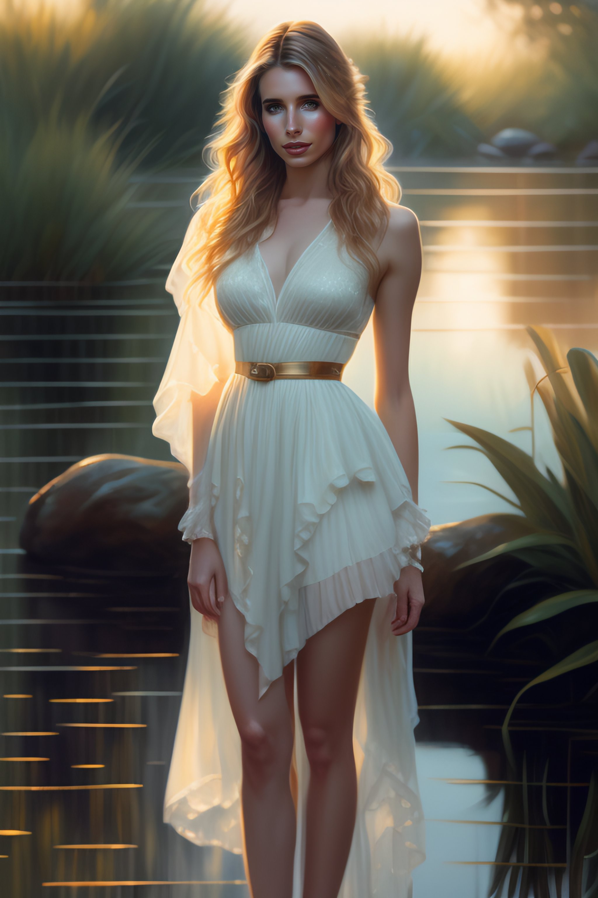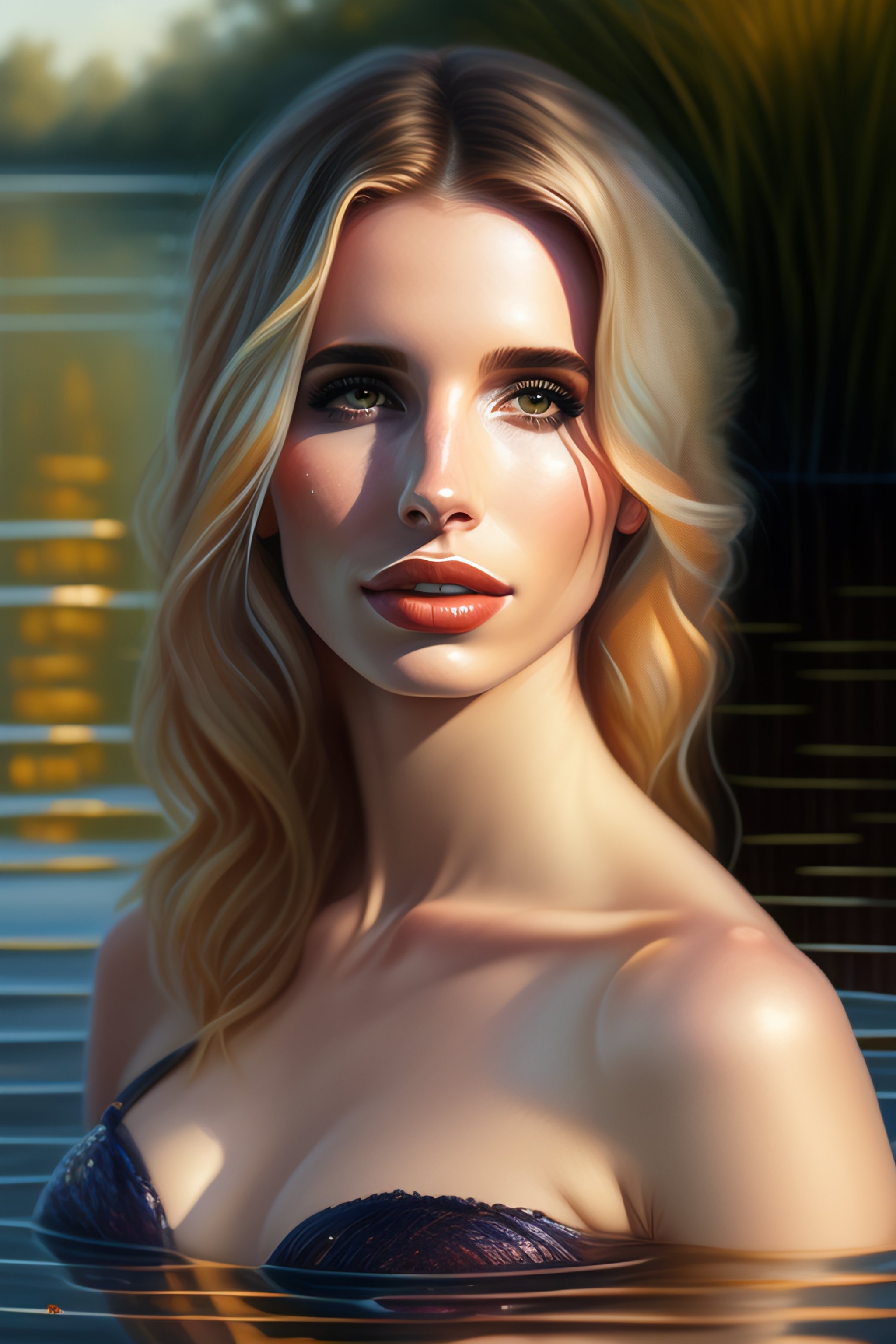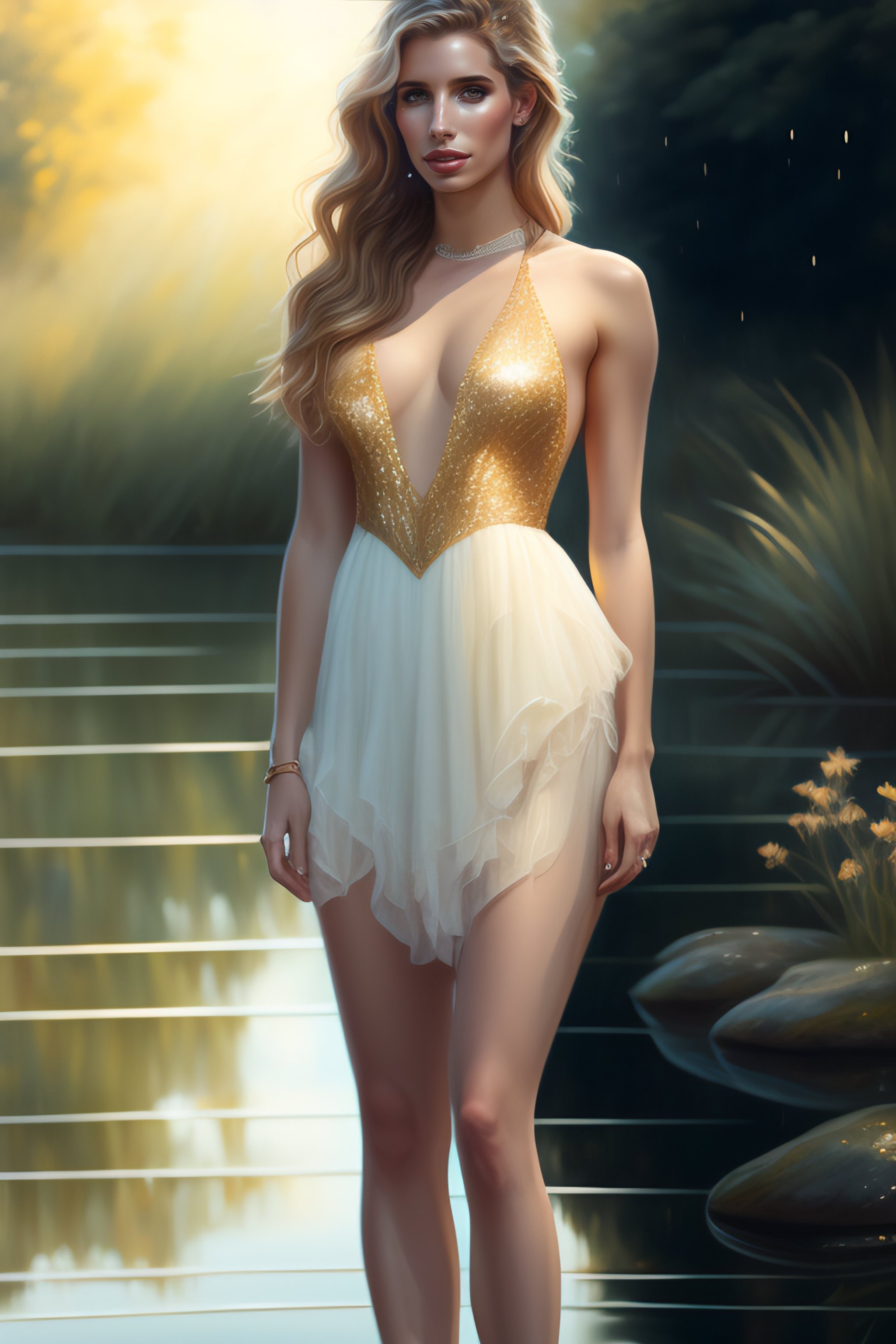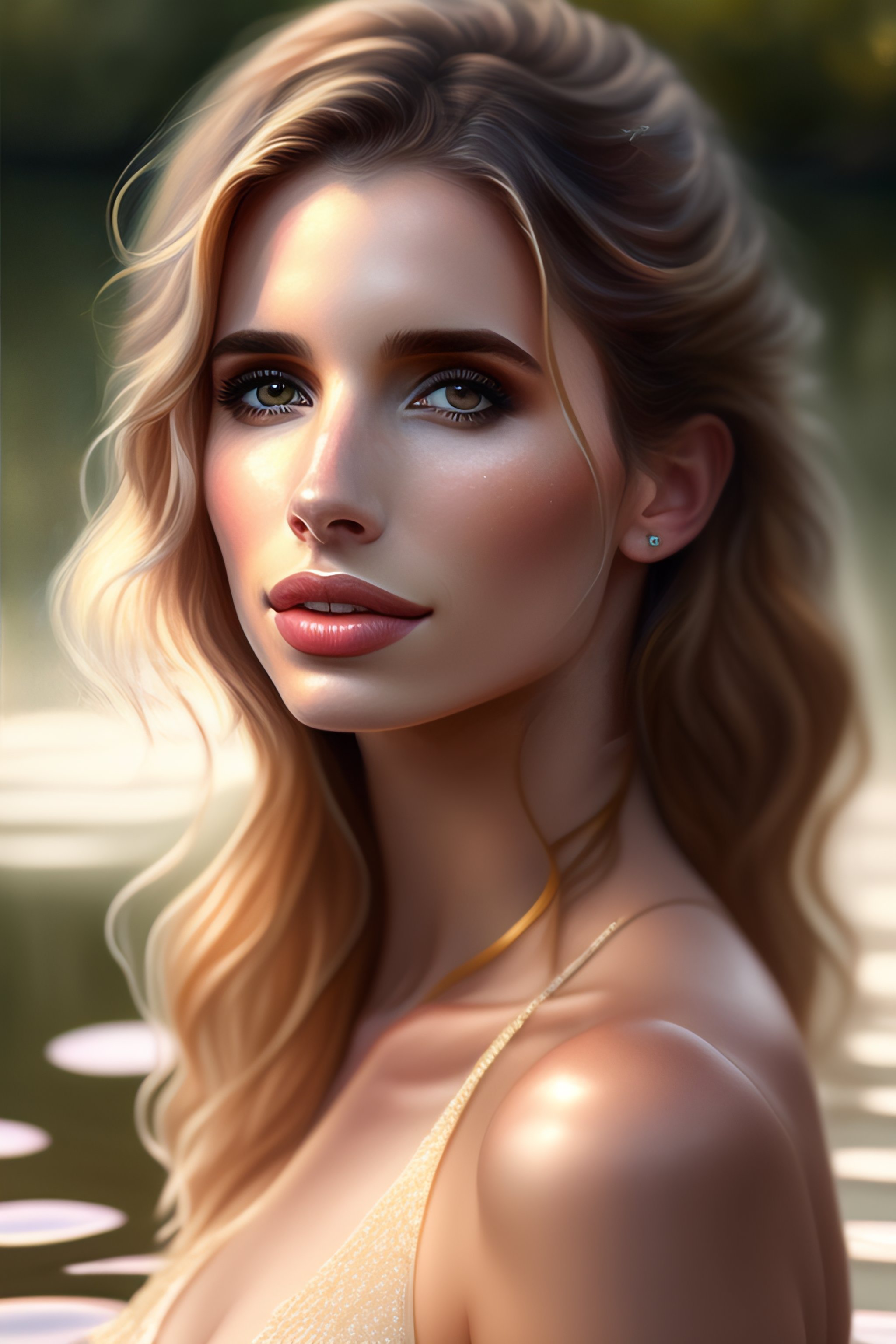 Full body portrait of emma roberts, standing in a pond, soaking wet hair, by terry o'neill intricate, elegant, highly detailed, digital painting, glistening skin, artstation, concept art, smooth, sharp focus, bright lighting, illustration, art by artgerm and greg rutkowski and alphonse mucha, 8 k