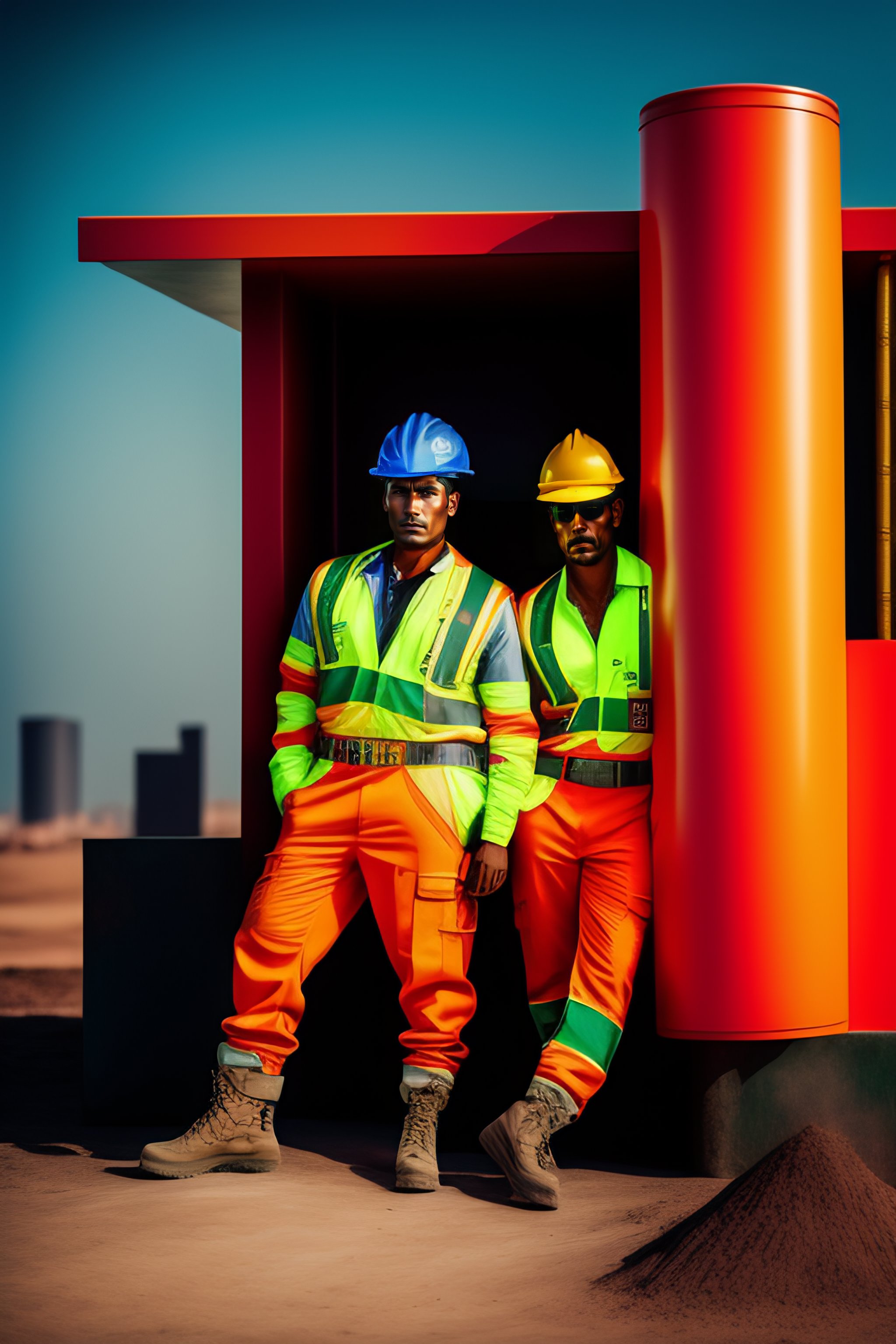 Portrait of mexican construction workers on job site in ((gucci suits and neon construction vests)) epic photoshoot by annie leibovitz. lounging, editorial fashion magazine photoshoot, fashion poses, architecture. vogue magazine. film grain.