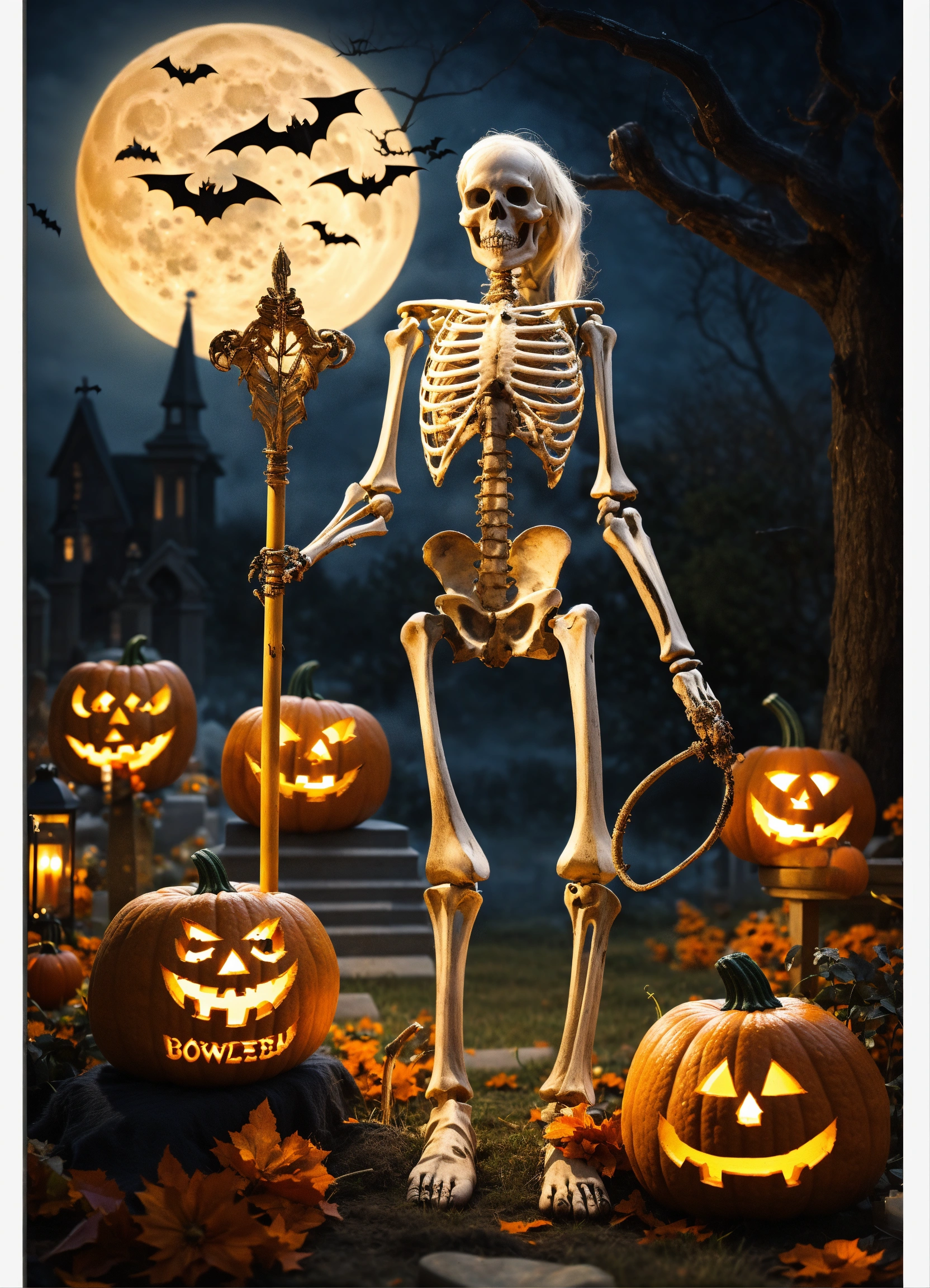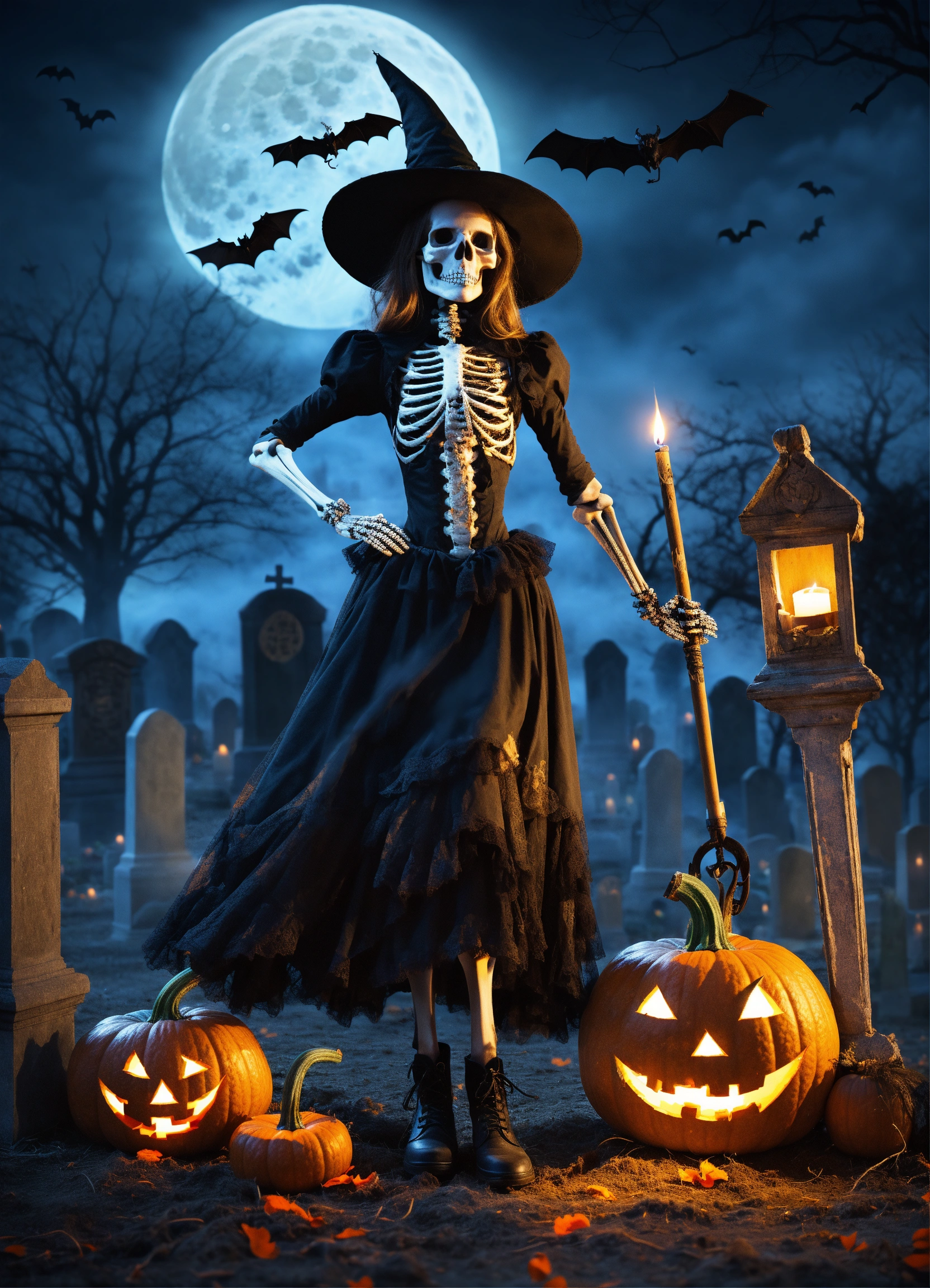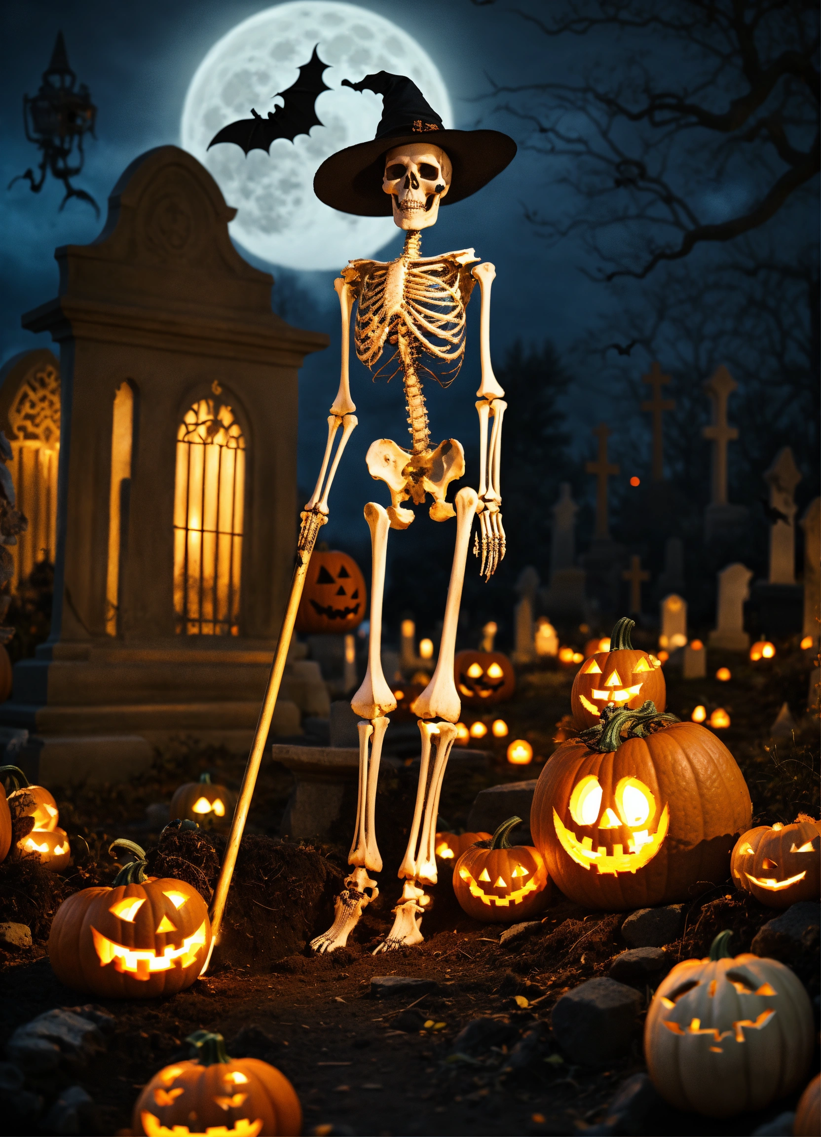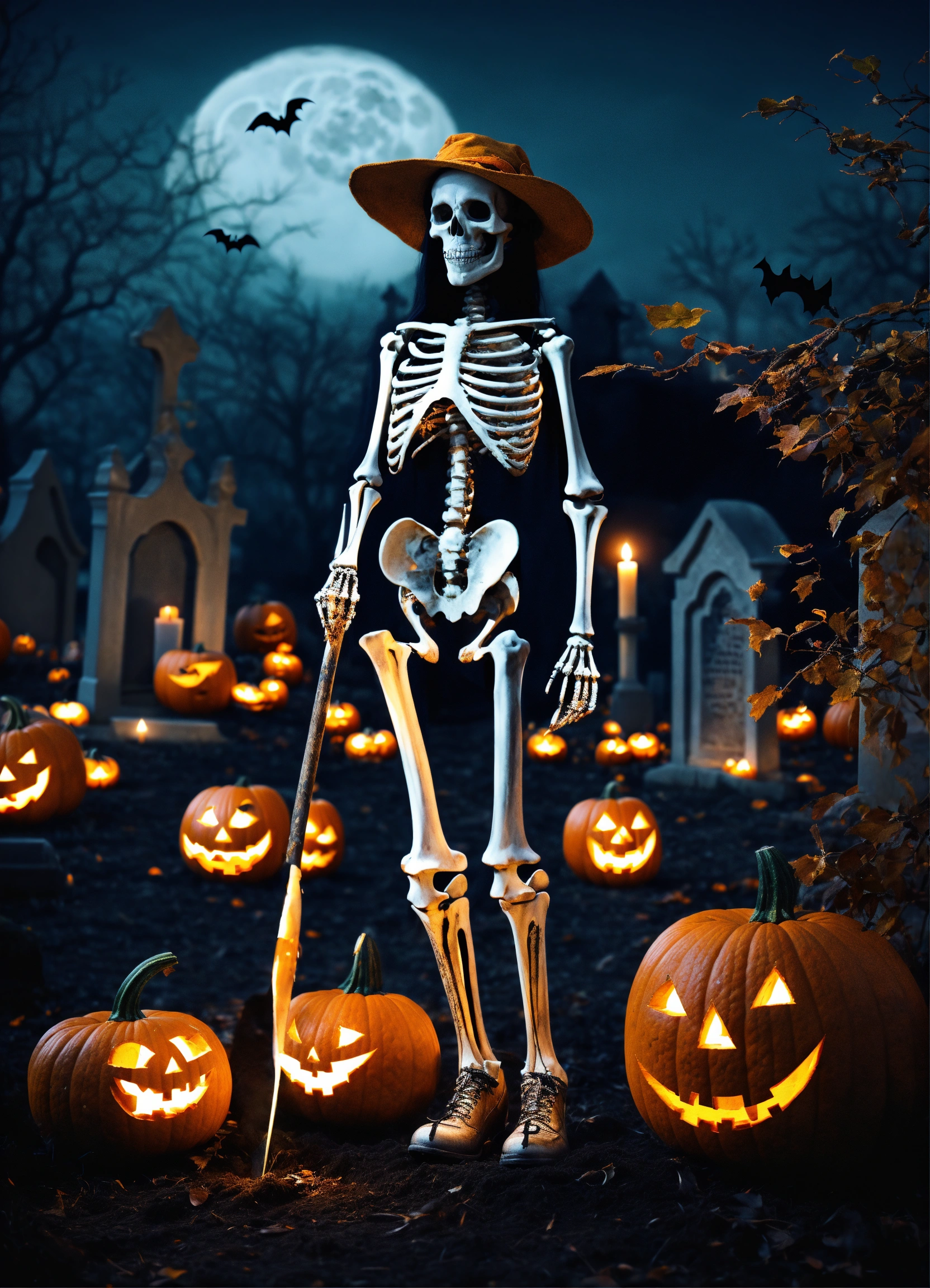Beautiful dressed female realistic skeleton digging with a spade, with top, short, high healed boots, in a cemetery, at night, full moon, fog, several flying ghosts in the background, halloween scene, halloween ports, pumpkins, pumpkin lanterns, candles, bats, halloween atmosphere