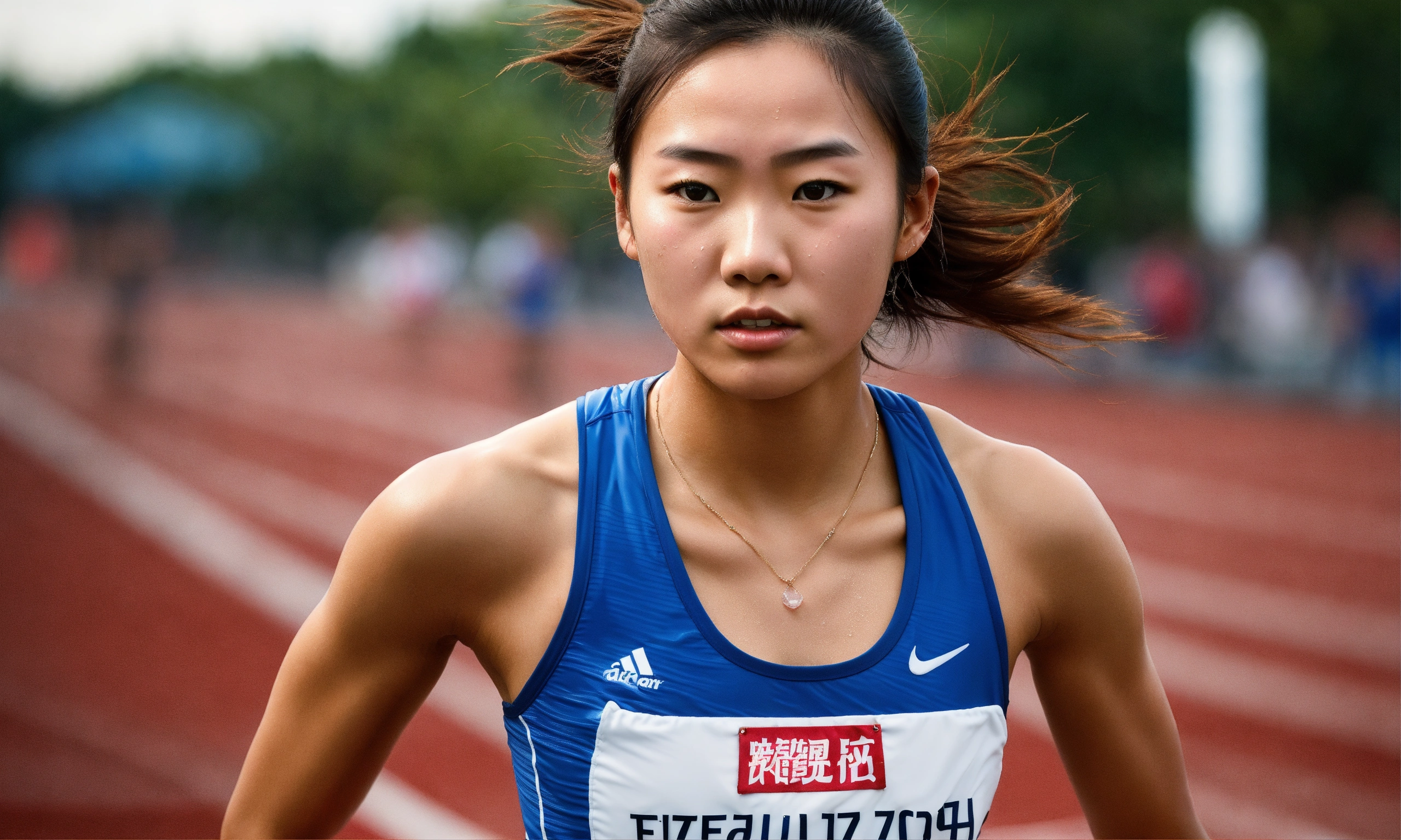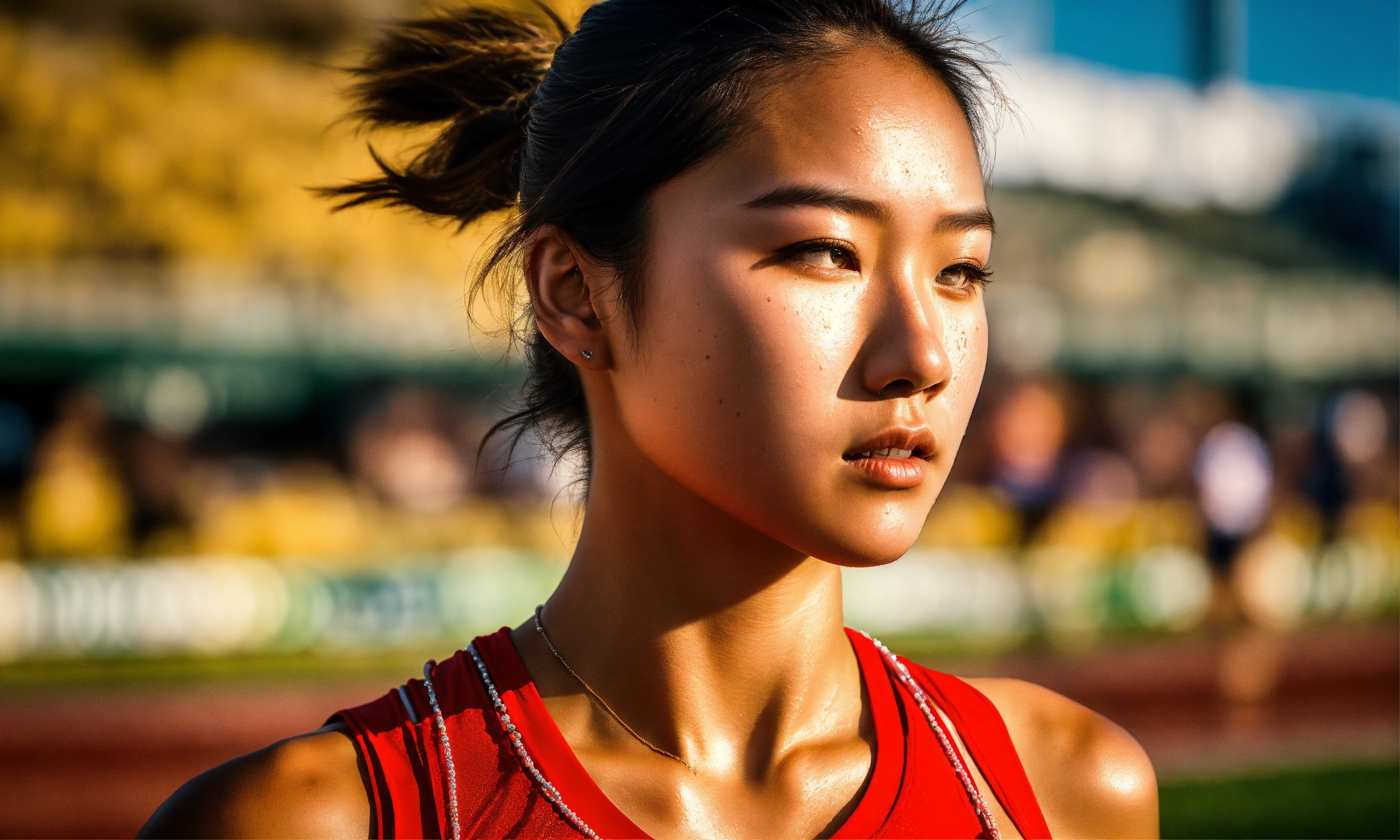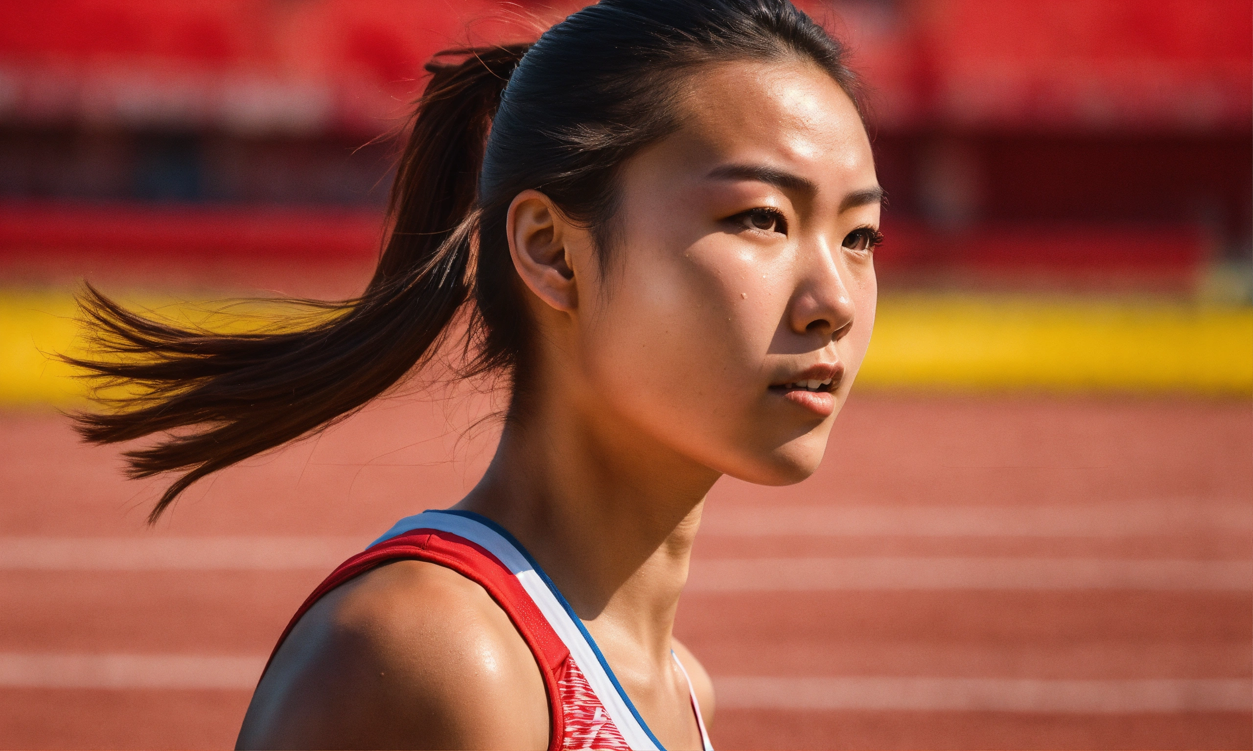 Mid-day at a track field. ultra close-up shot of an 18-year-old tanned and athletic chinese girl, a determined national team runner captured as she is running, her toned skin, bronzed from hours under the sun, complements her youthful yet intense exertion evident on her face, glistening beads of sweat stand out on her forehead, coupled with signs of heavy breathing, she's adorned in athletic wear in red and white. every droplet of sweat exudes determination and perseverance, while her focused gaze radiates ambition and drive, shot with a nikon d850, 85mm f/1.4 lens, with a shallow depth of field to emphasize her features, digital photography infused with subtle watercolor rendering for artistic depth, the bright mid-day light contrasts her determination, creating a powerful juxtaposition.