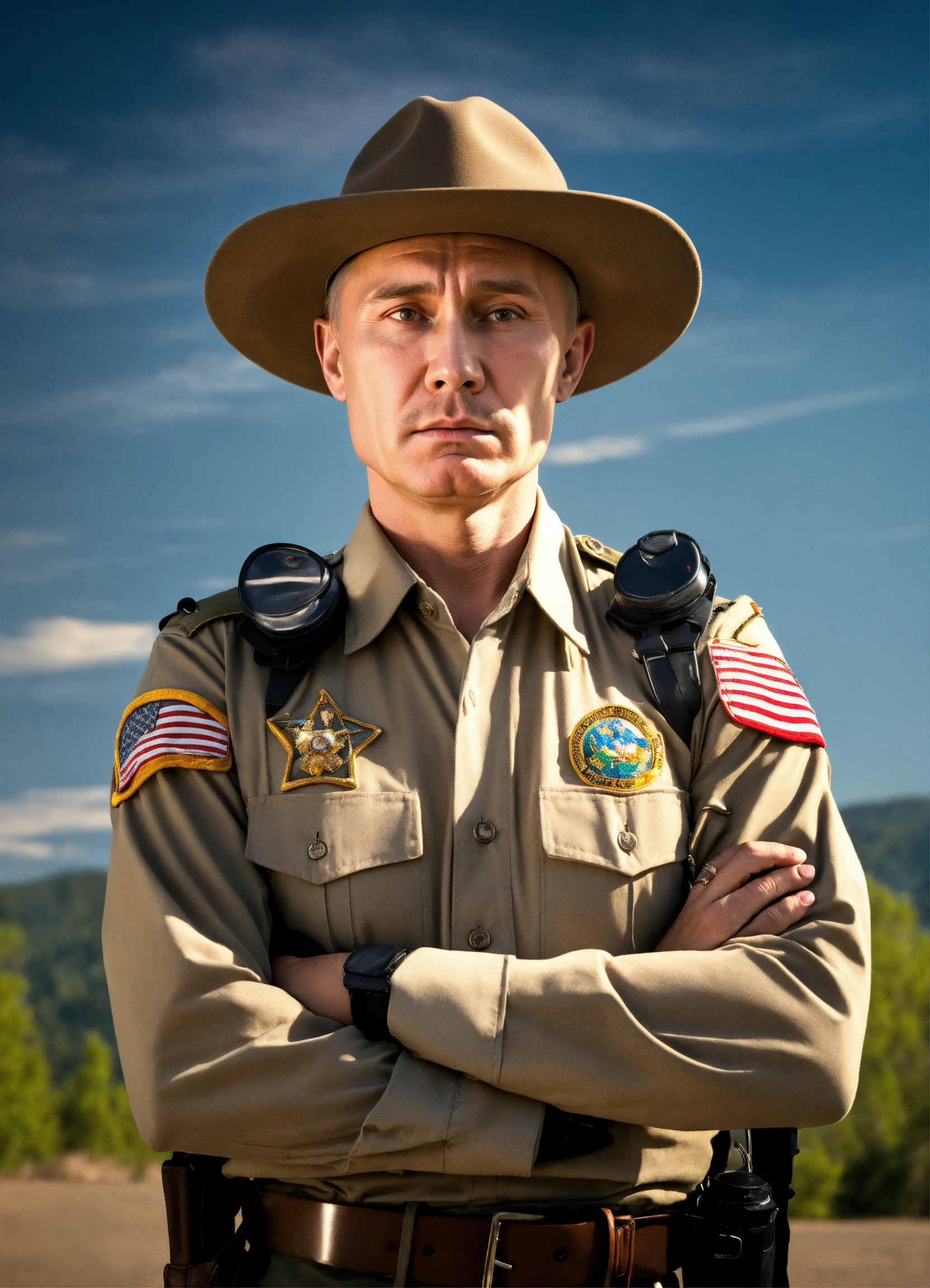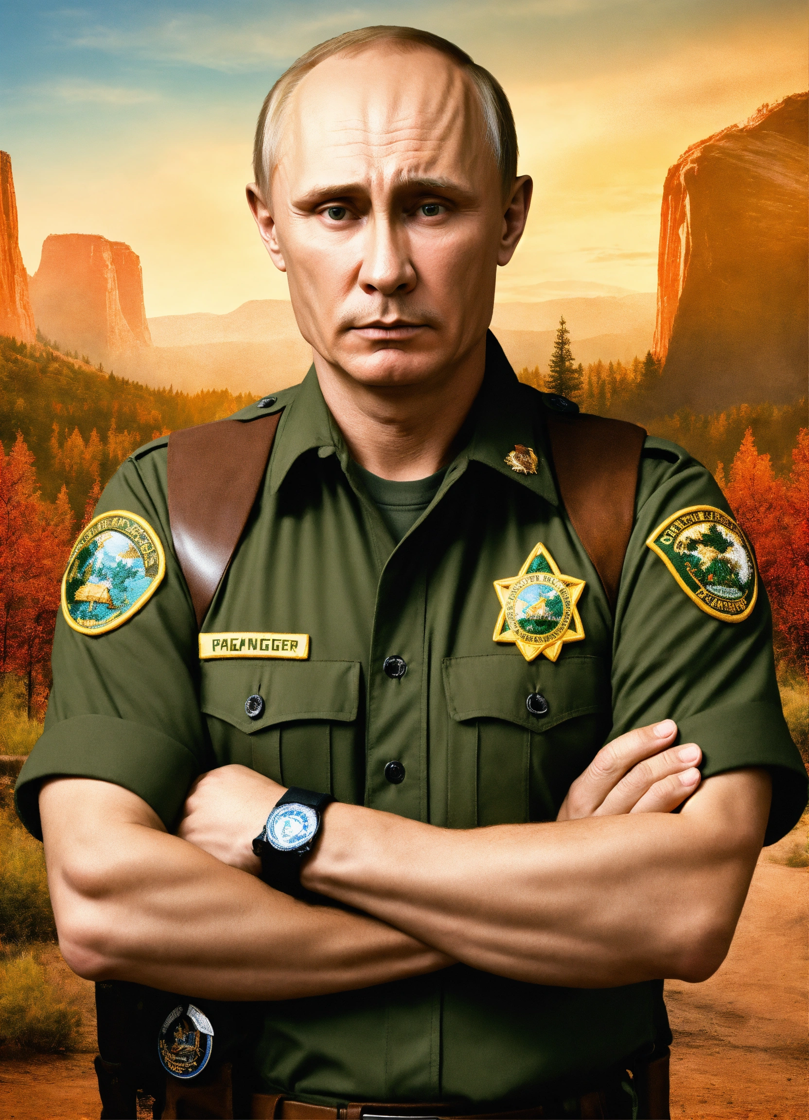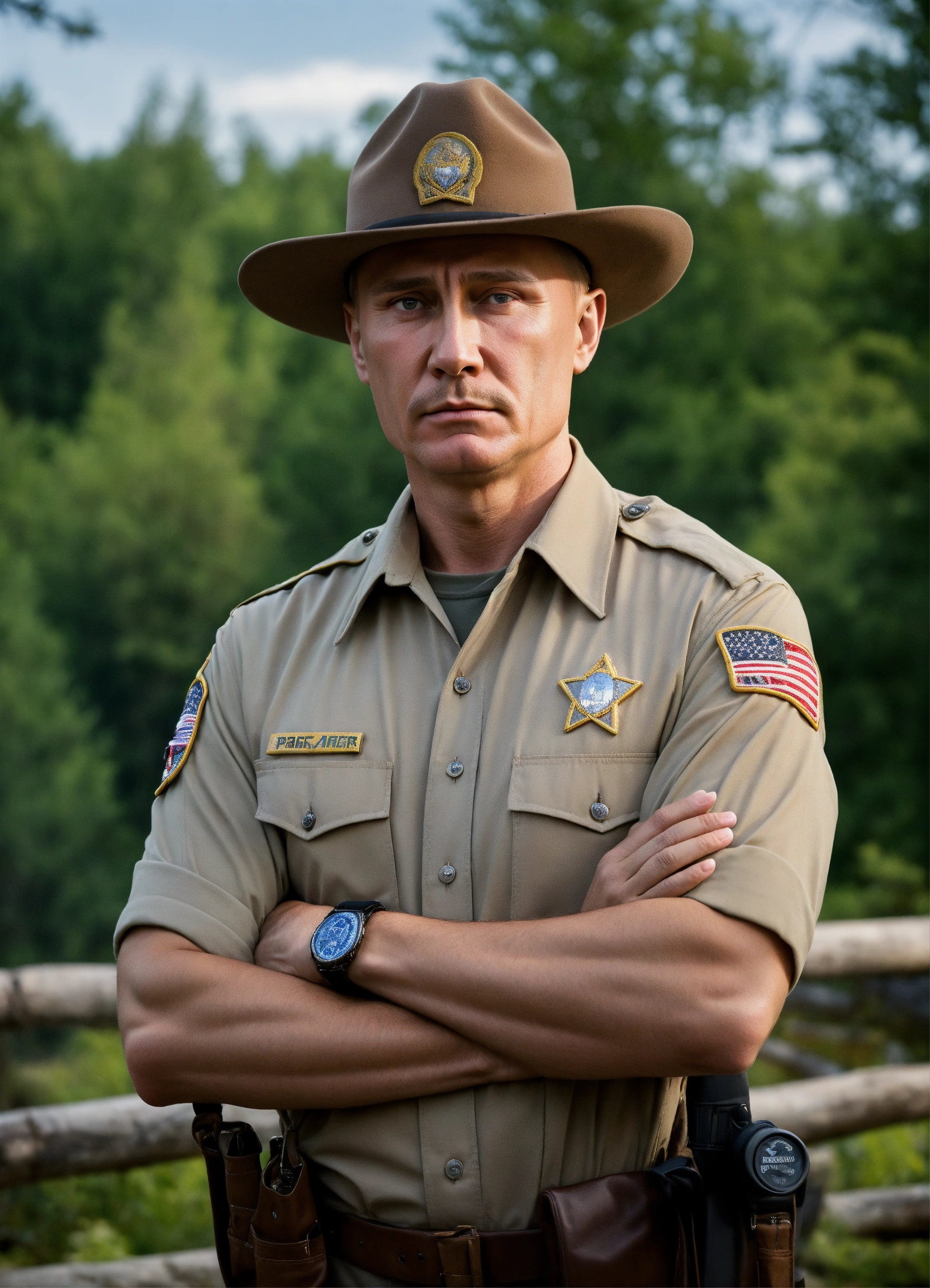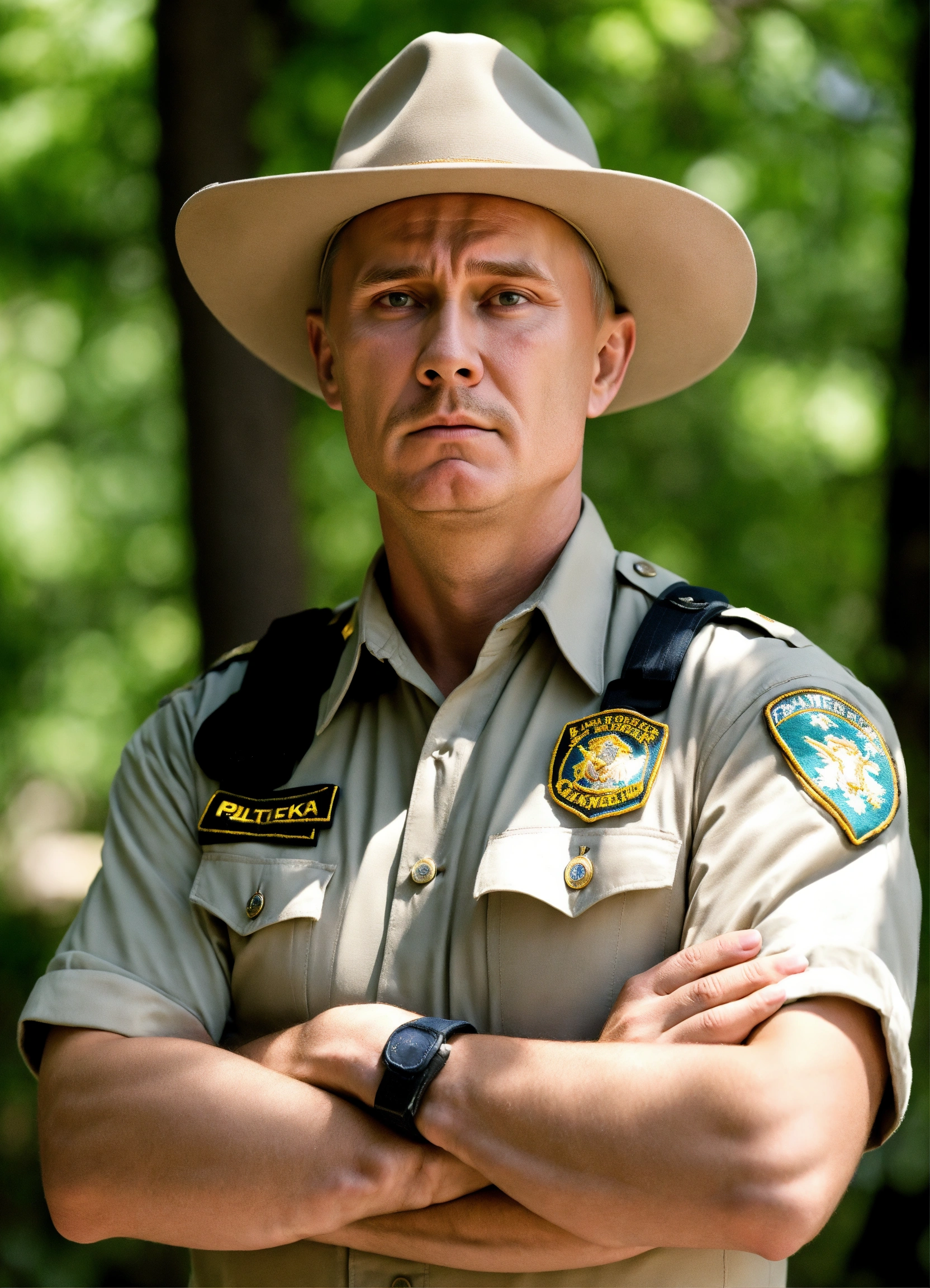 Scared man, usa park ranger, front view, casual clothes, arms crossed, looking at the camera, unique facial features, unique facial characteristics, putin lookalike, realistic
