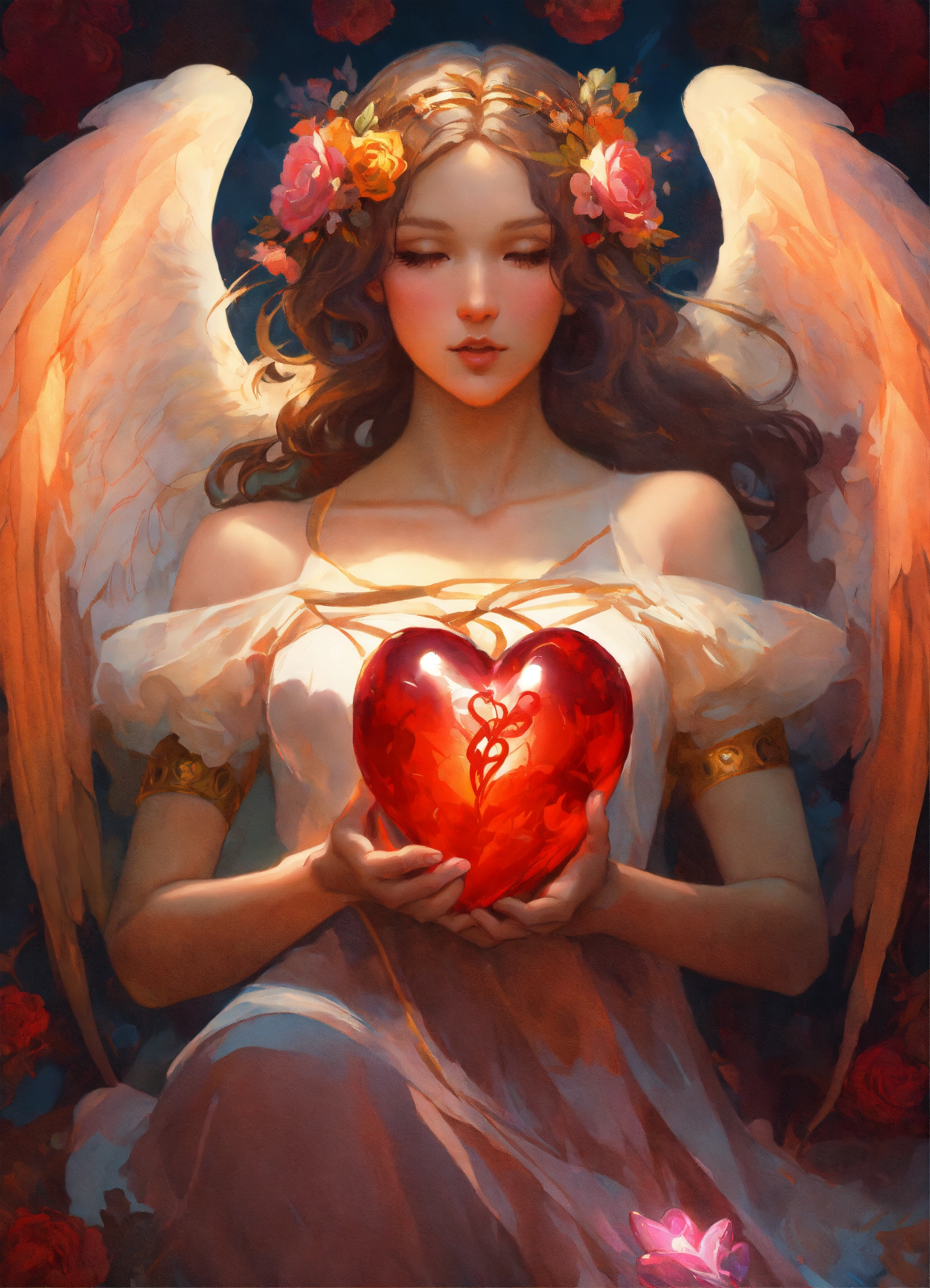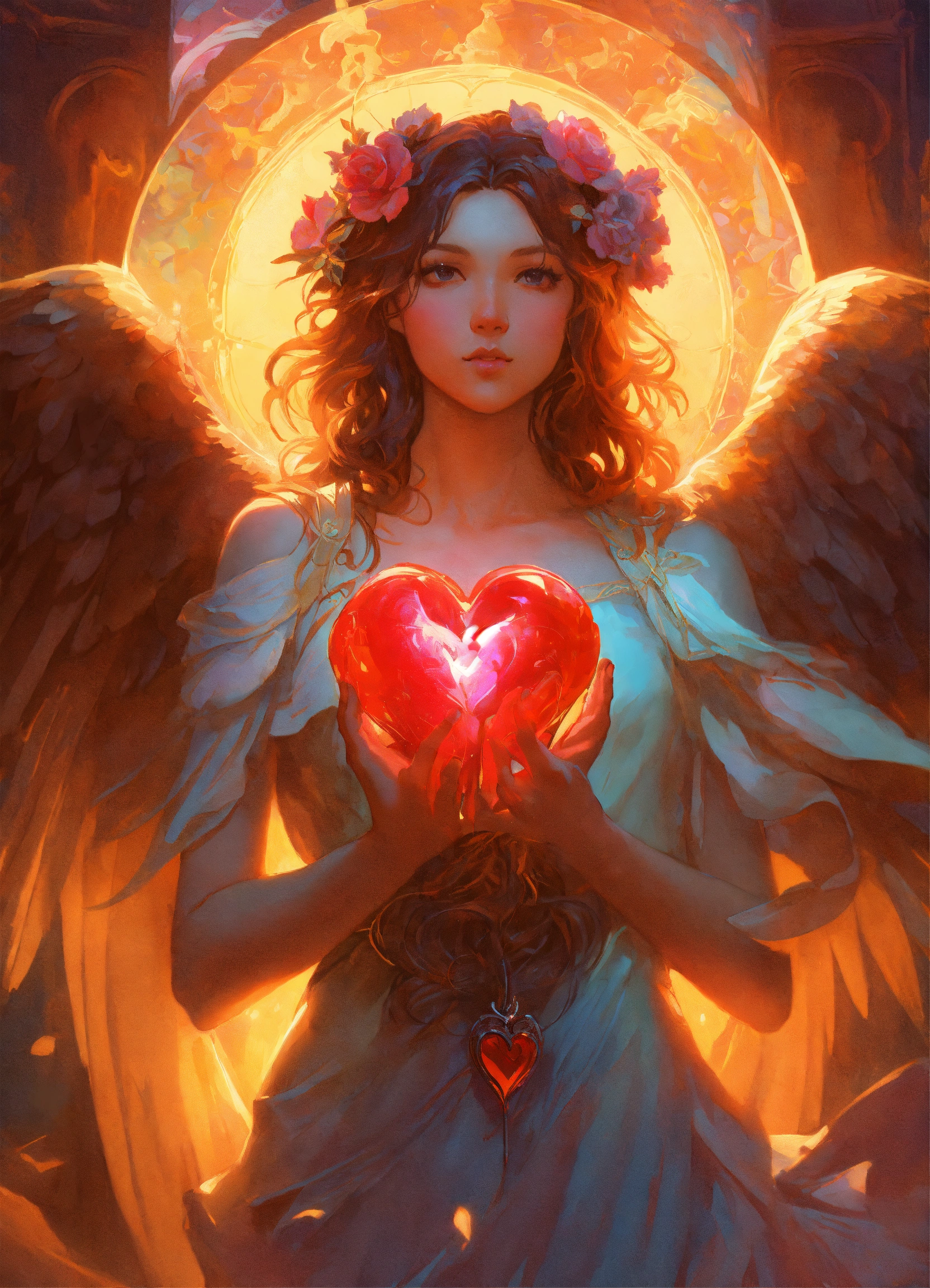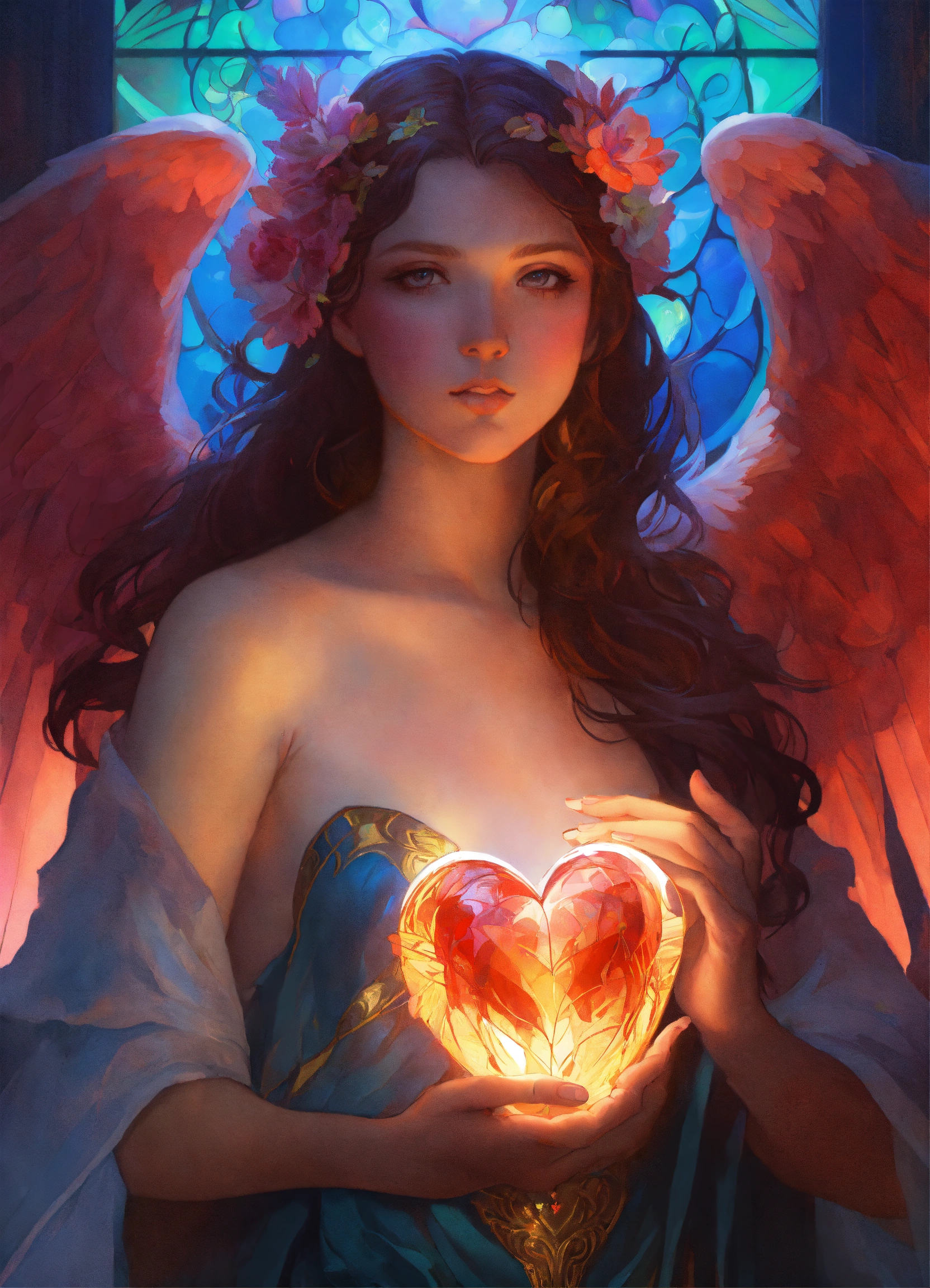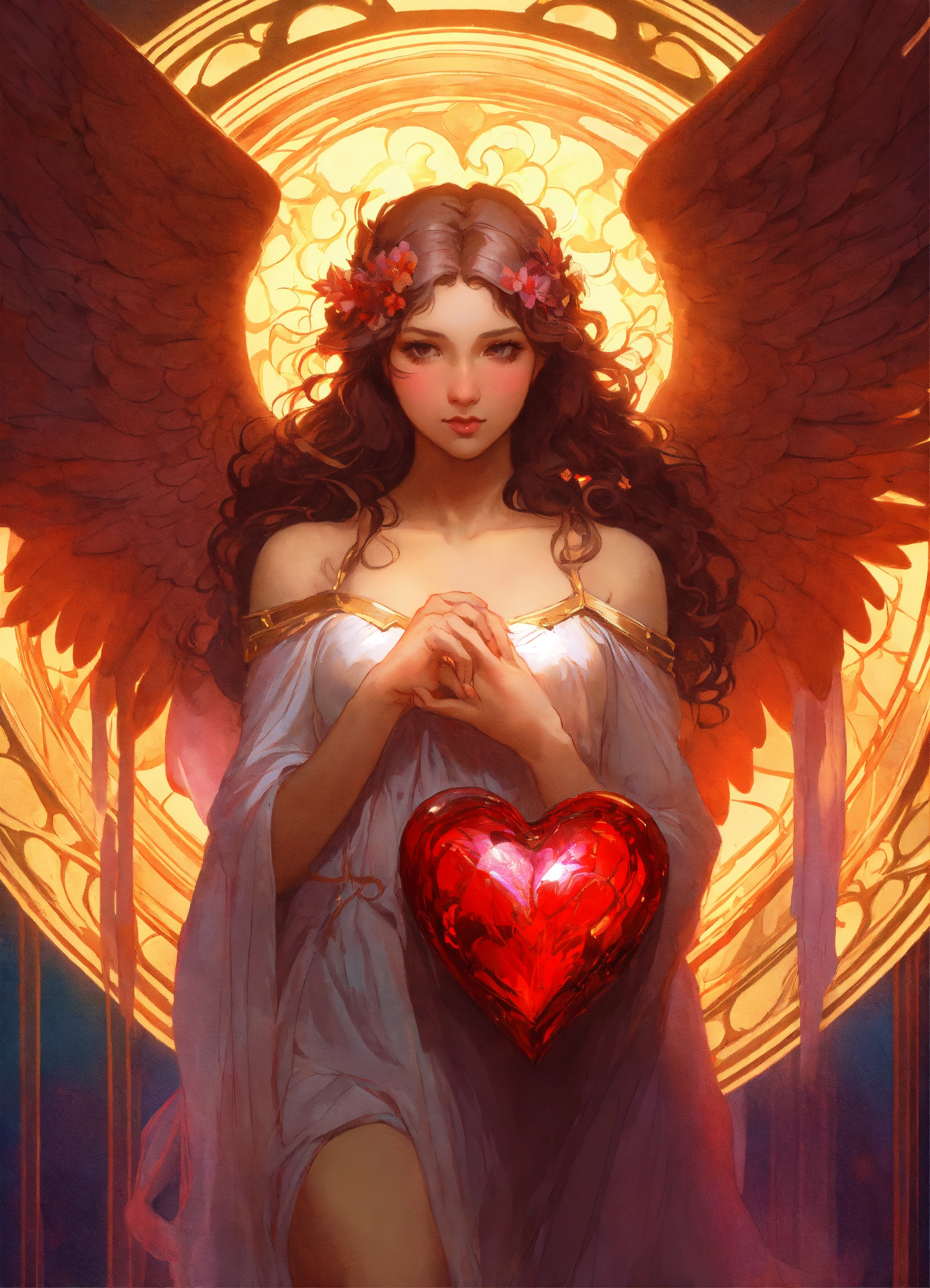 Fallen angel holding human heart, art by artgerm and greg rutkowski and alphonse mucha and william - adolphe bouguereau and stephanie law, 8k, dynamic lighting, colorful lighting