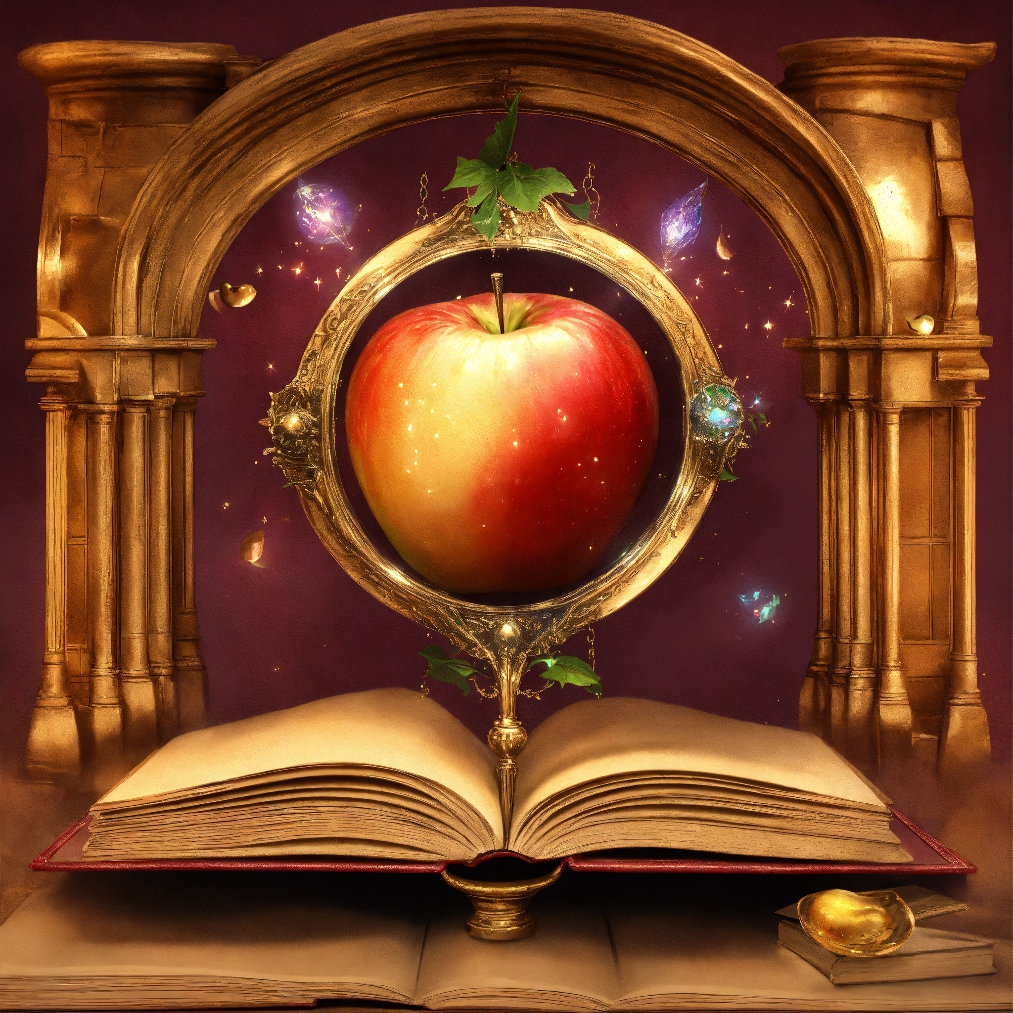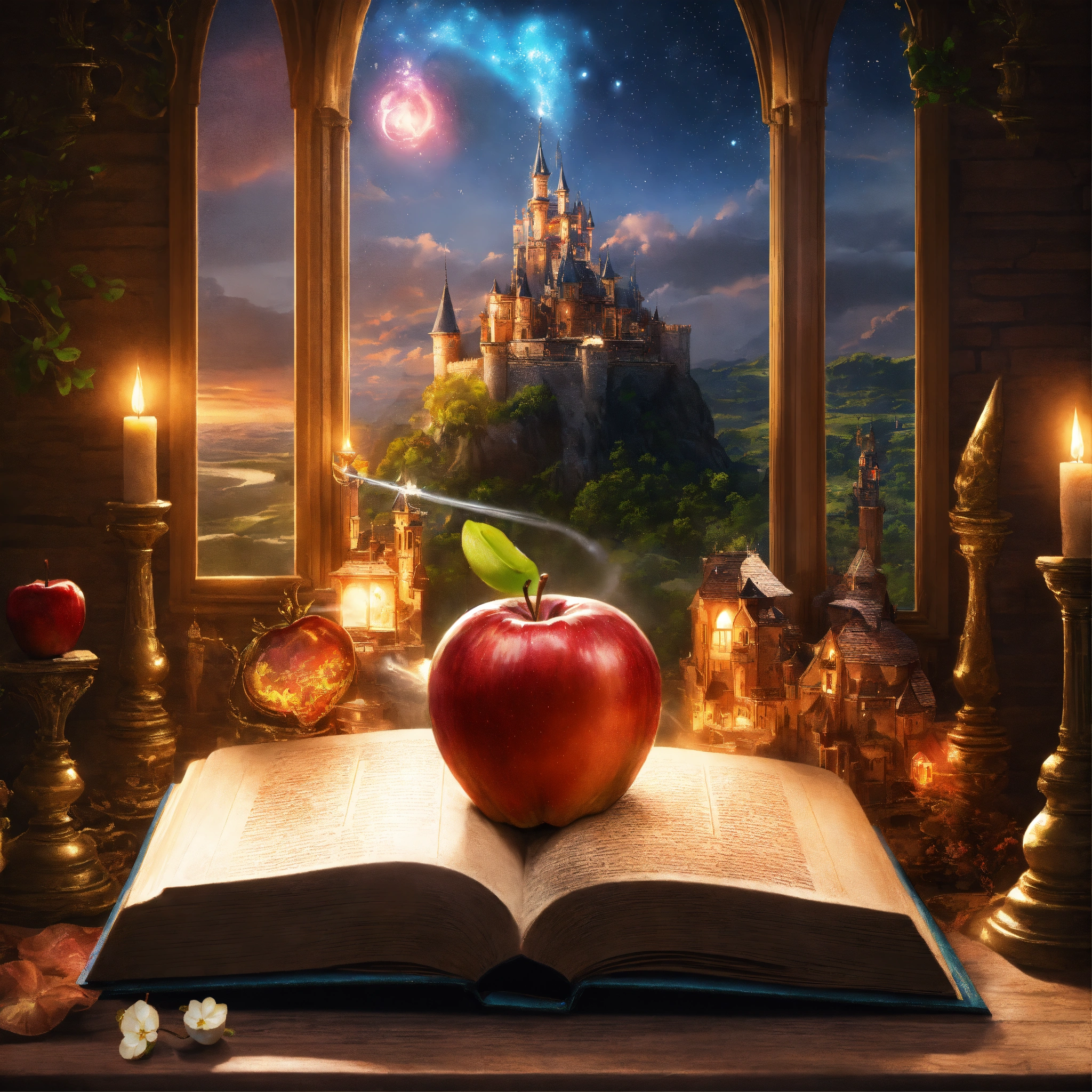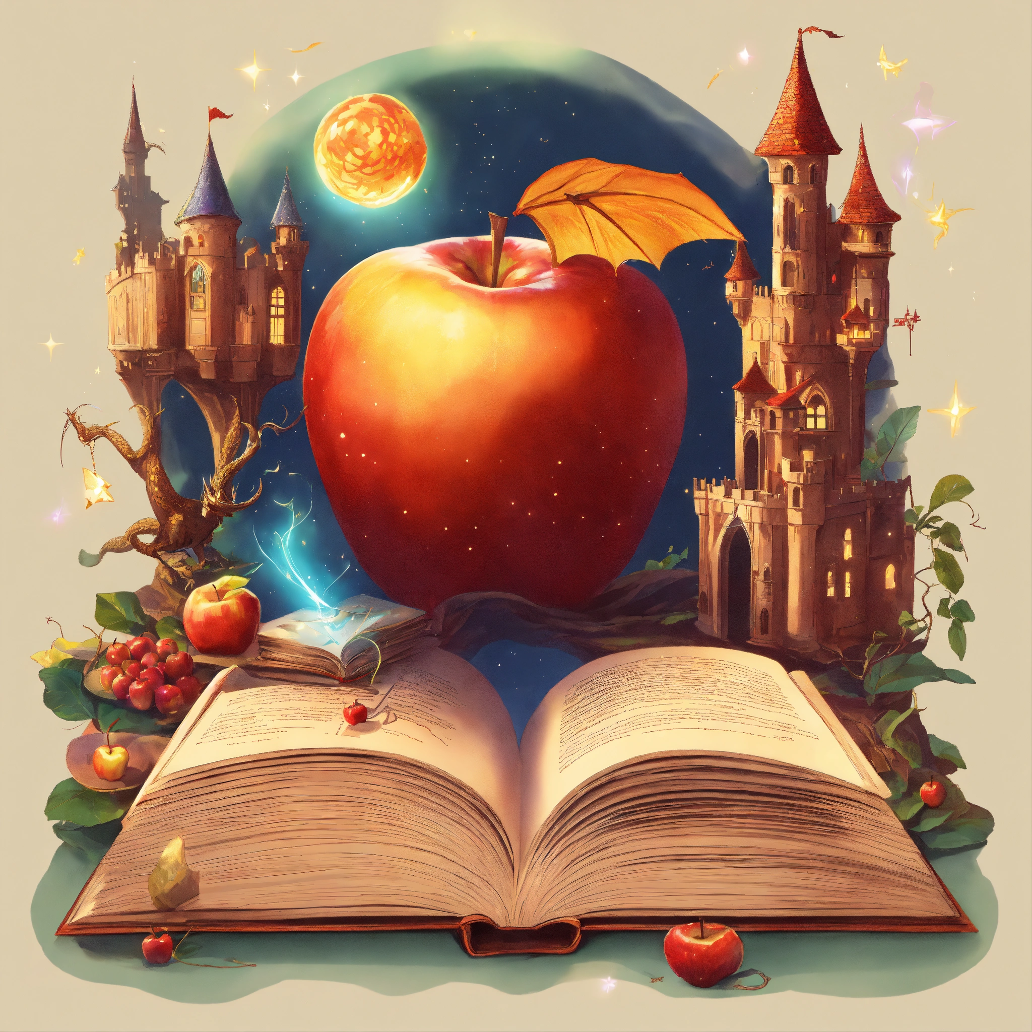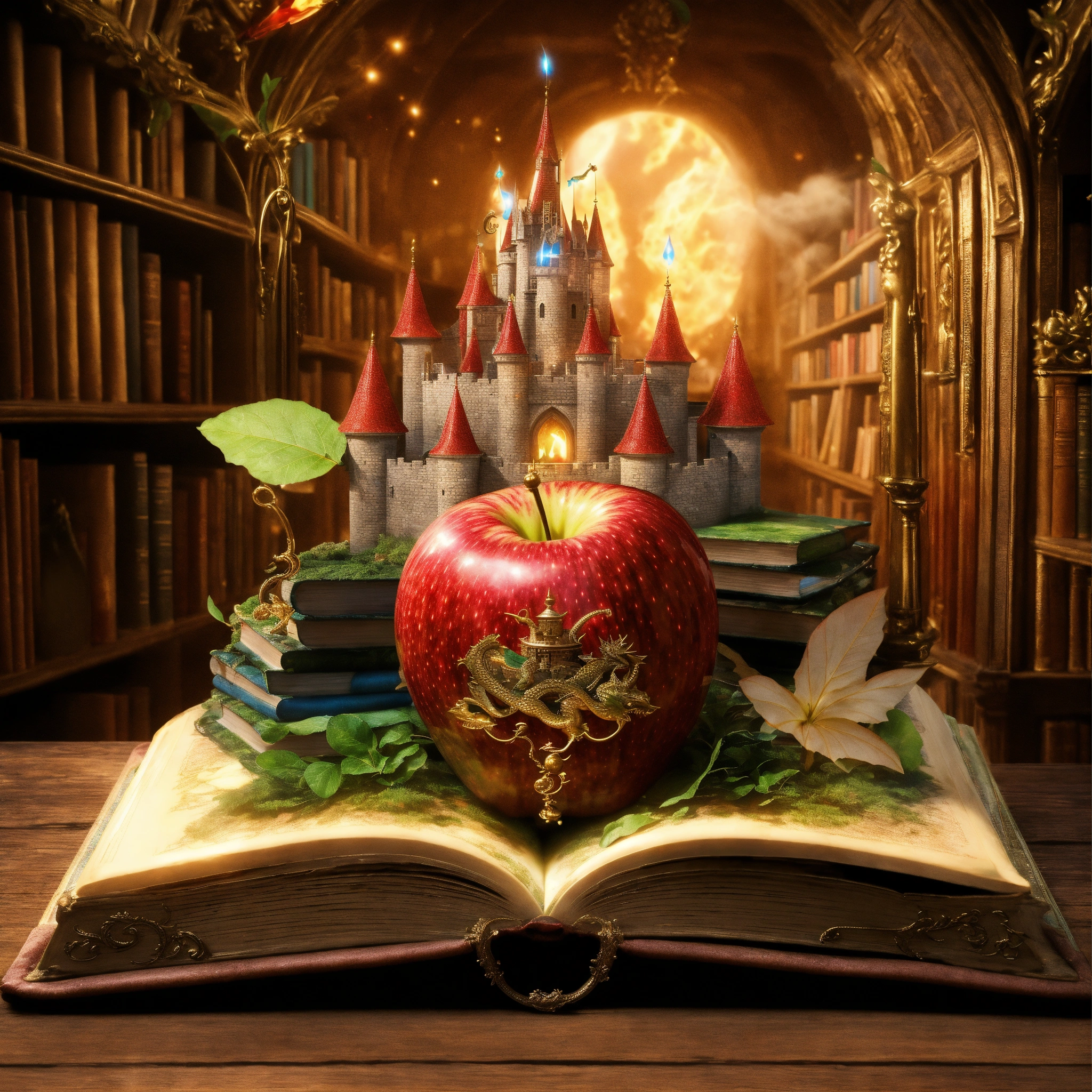 A fancy magic book from which magic bursts into the world, a magical castle, a dragon, a magic wand, an apple, a mirror
