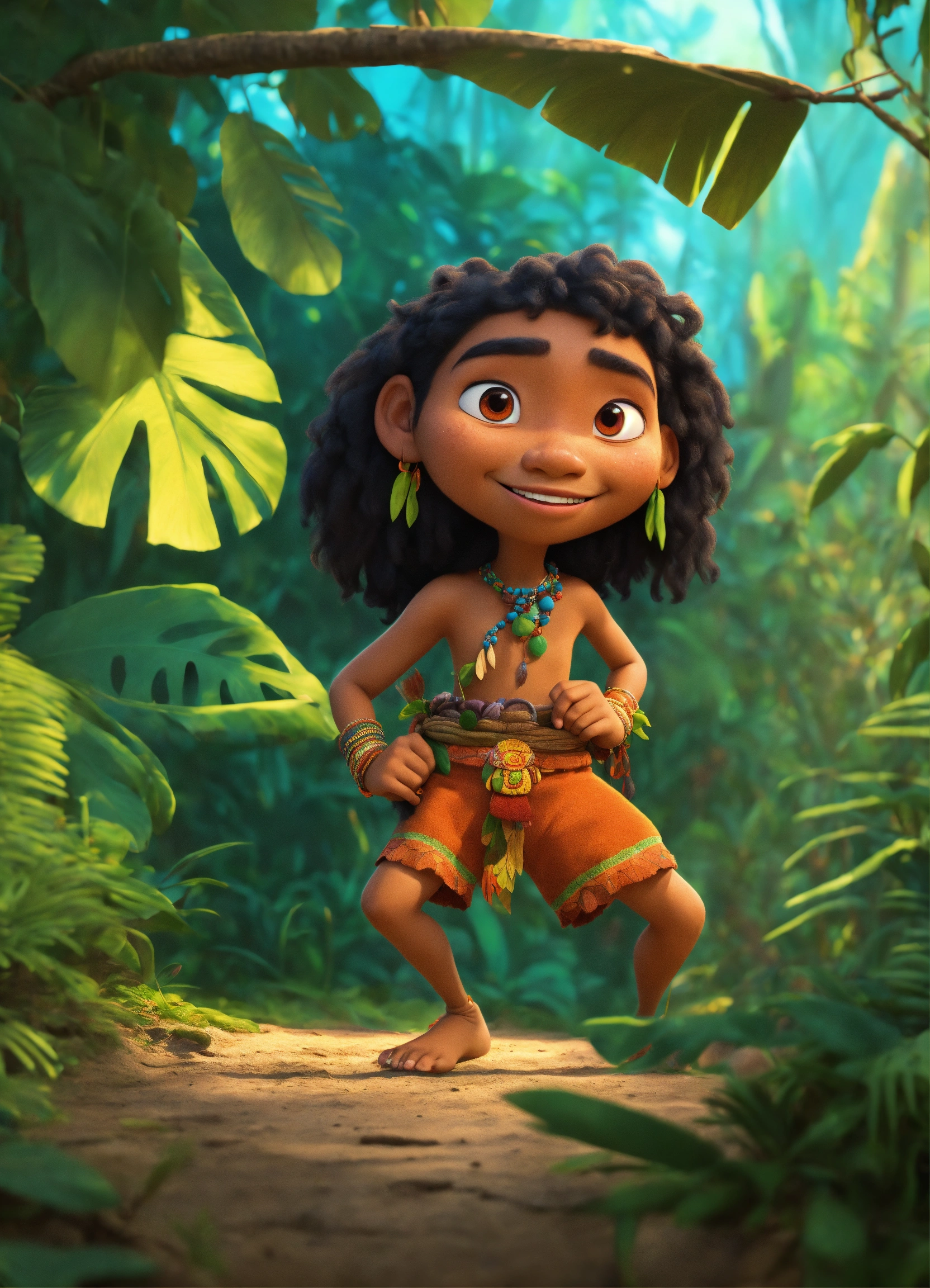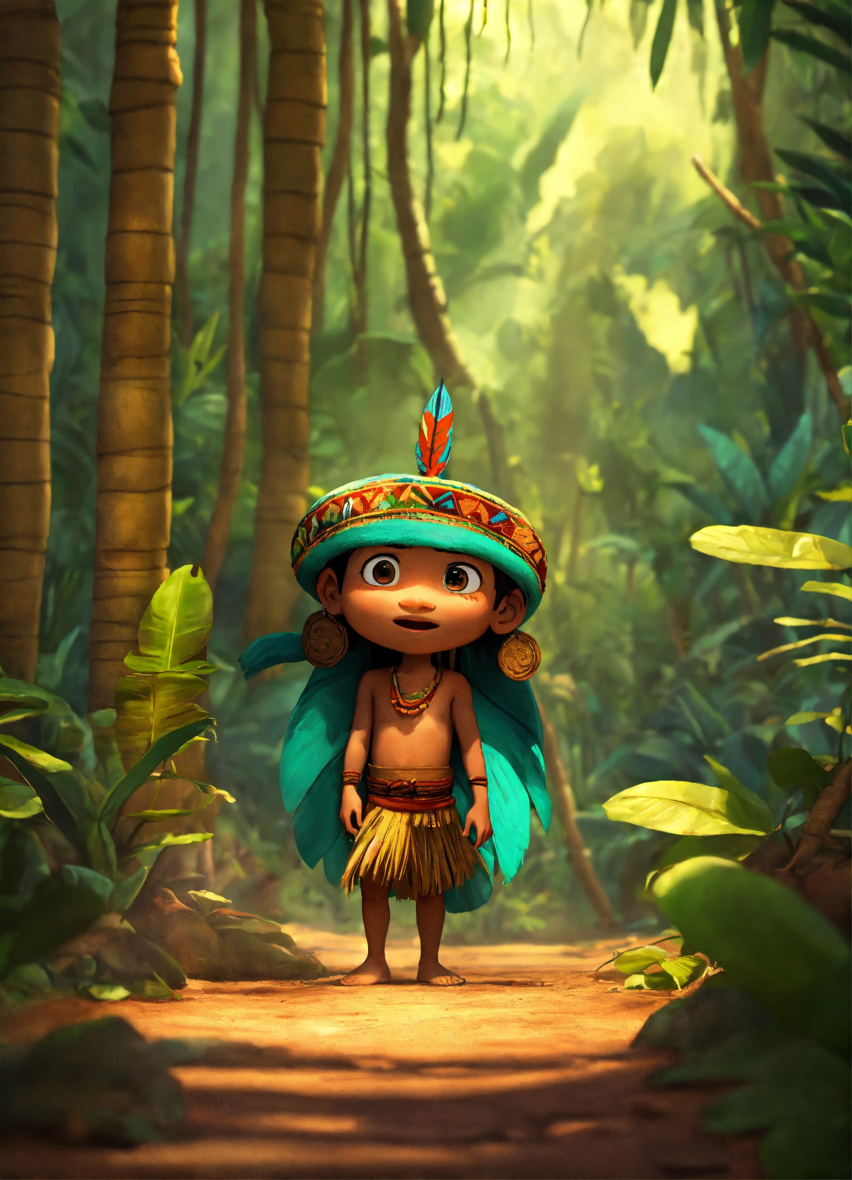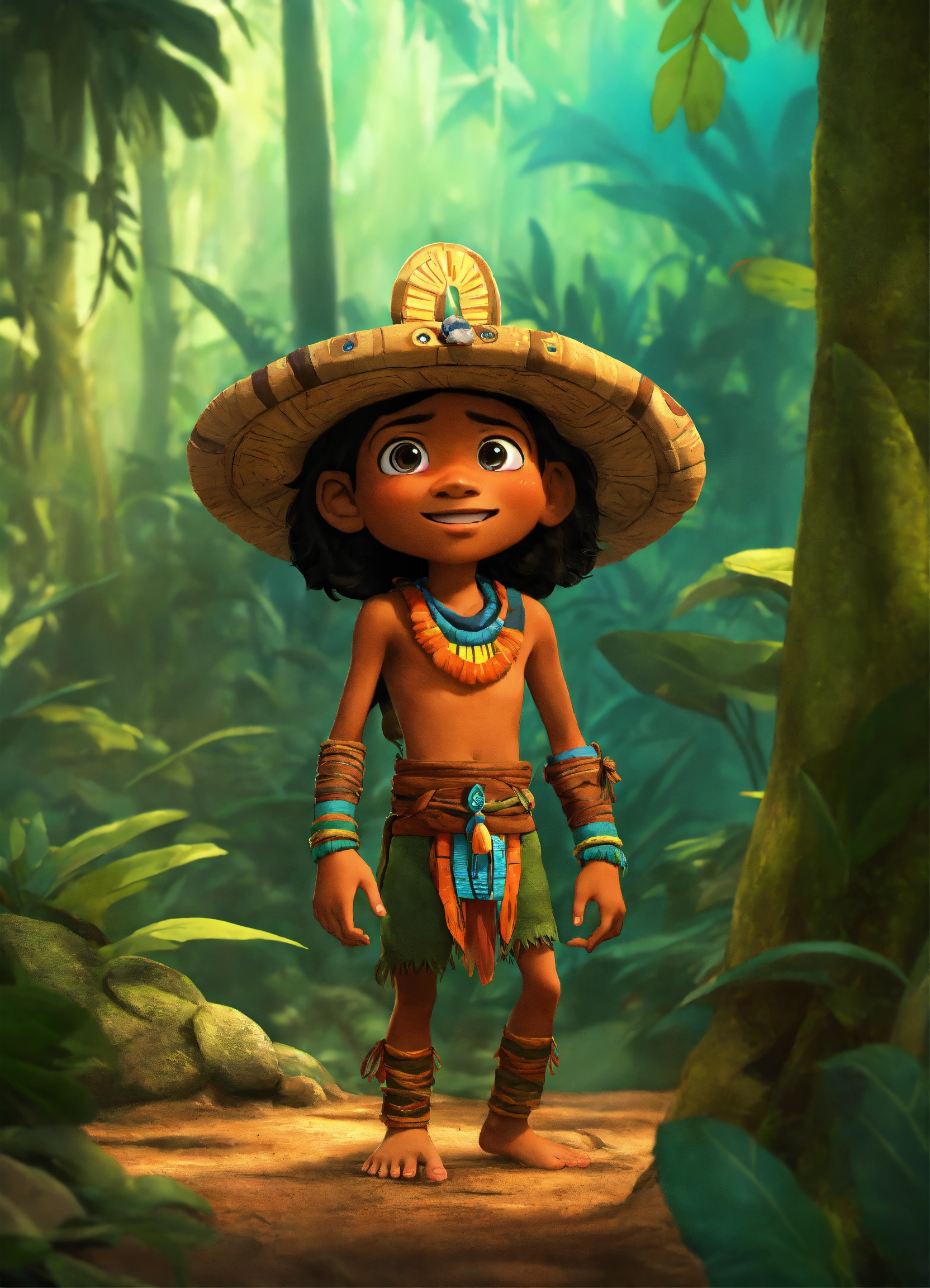 Pixar animation of a native mayan hiding in the jungle