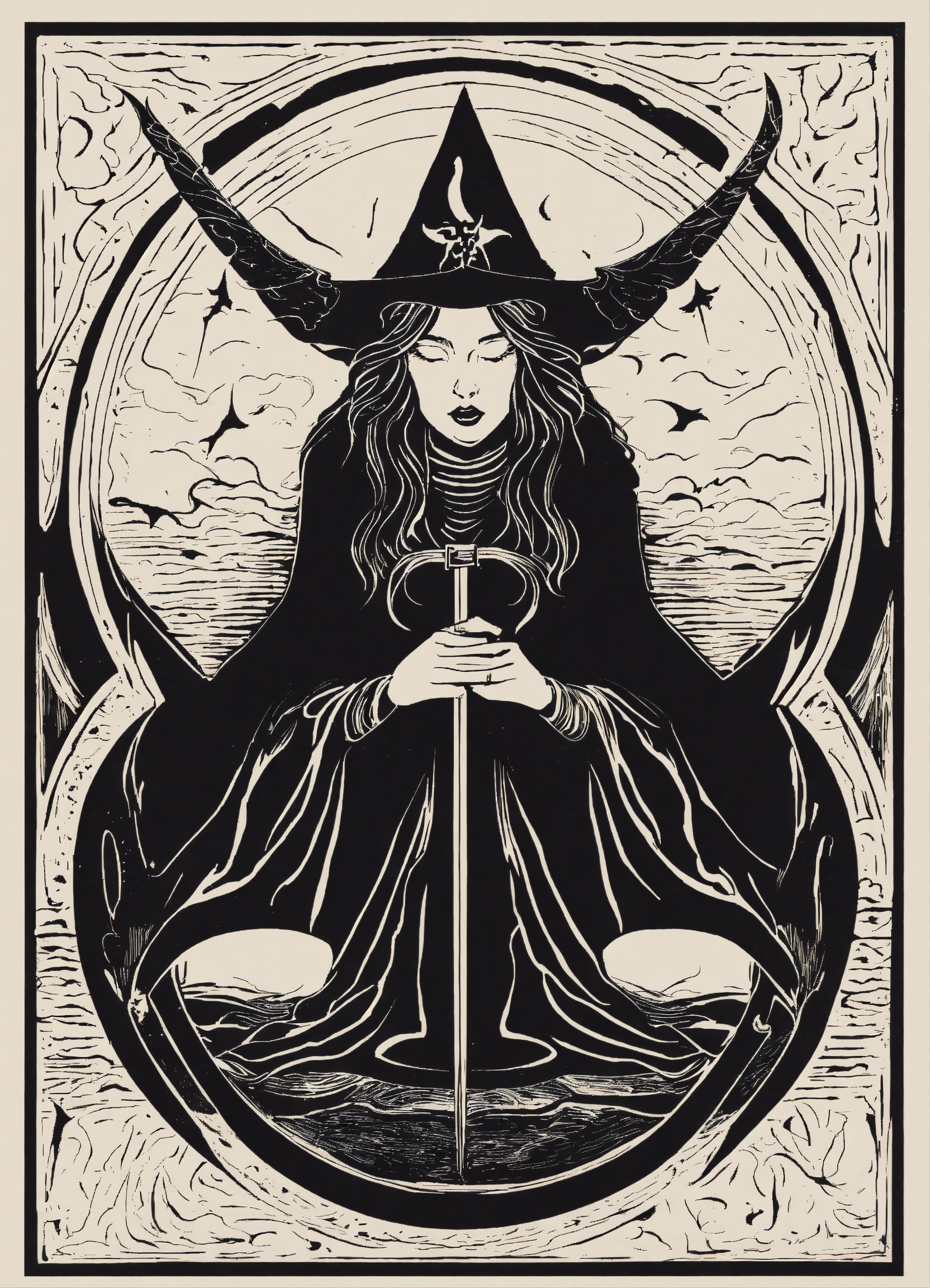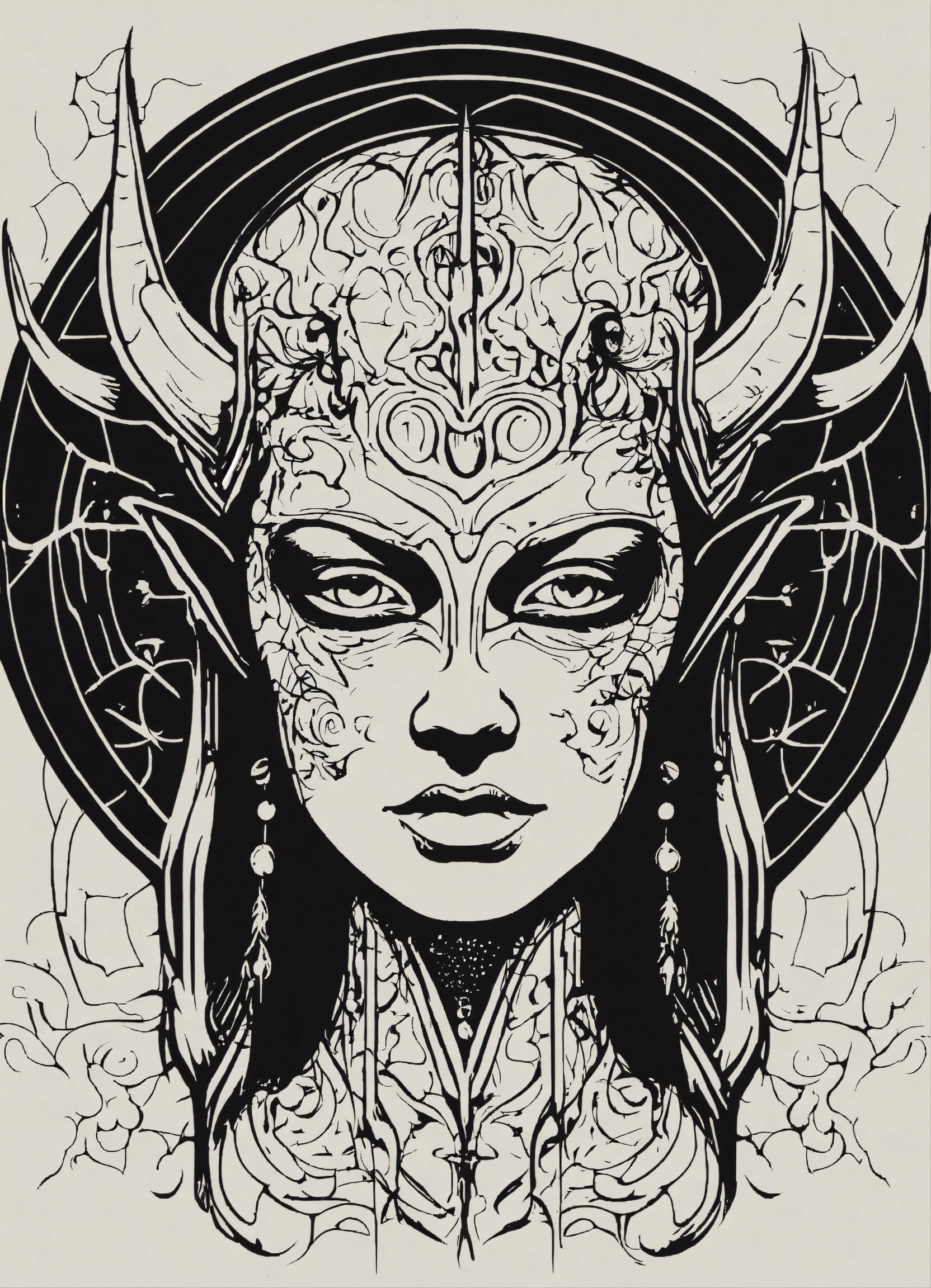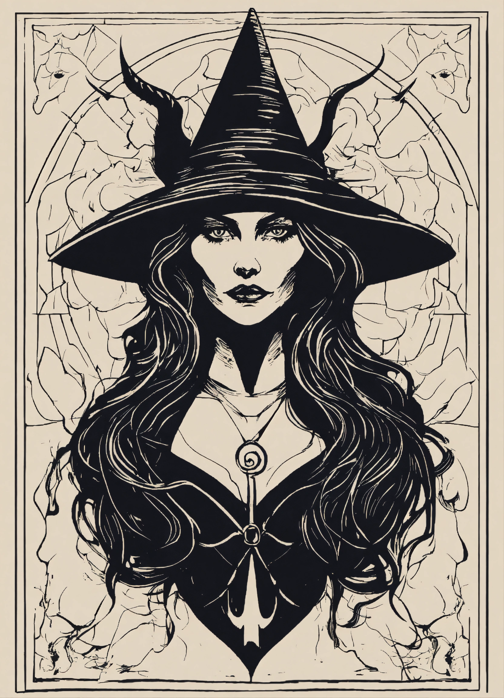 Minimal linocut art design, supernatural demon witch, occult, evil, terrifying, style of kathleen neely, black and white, simple, clean lines, cutting style, blank ink, vector, blank background, unique, creative