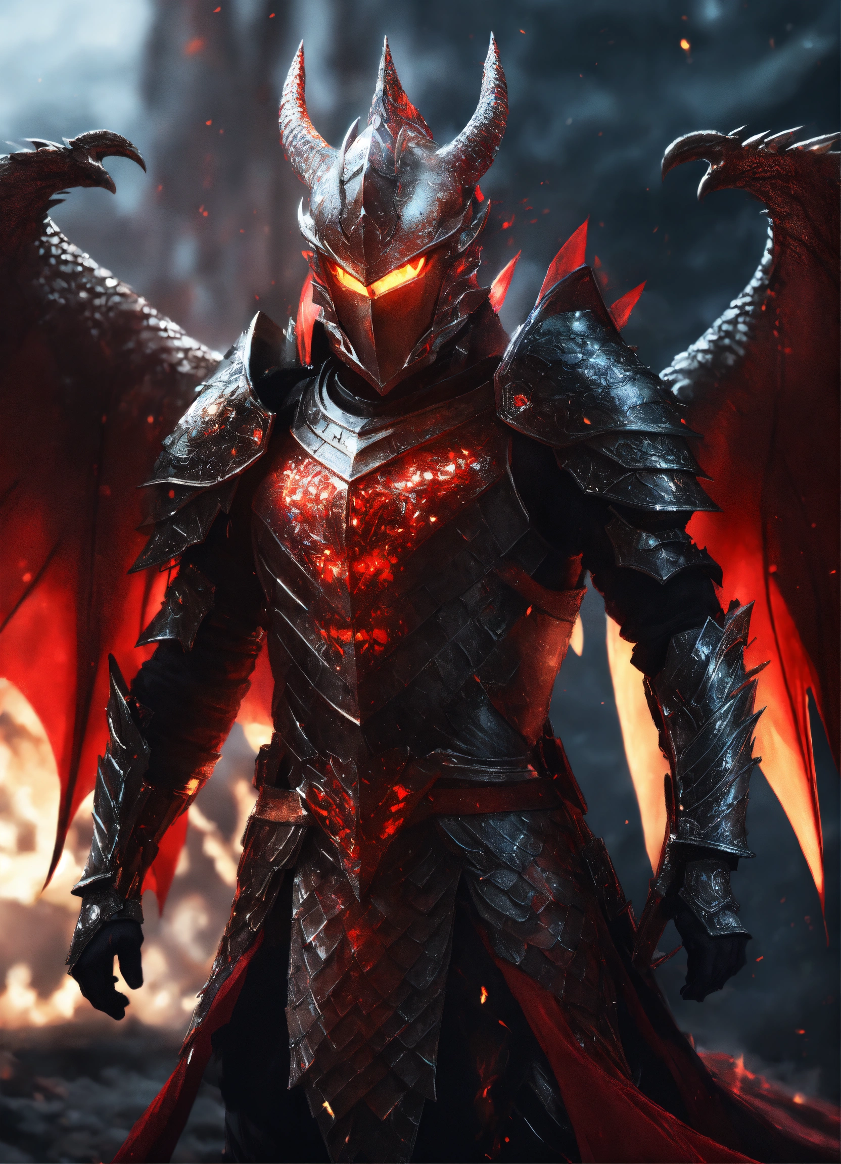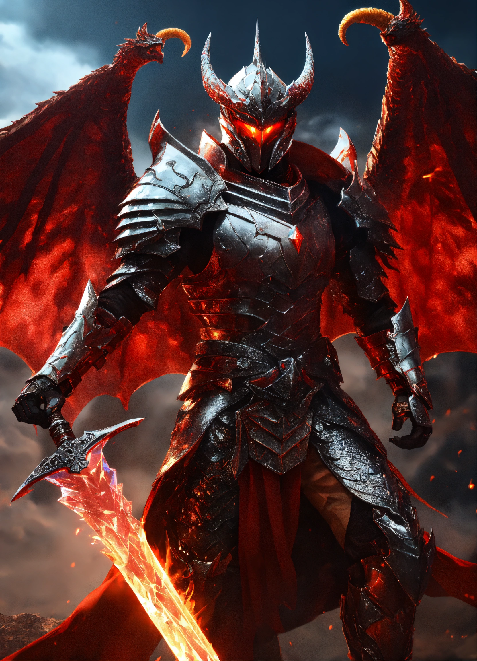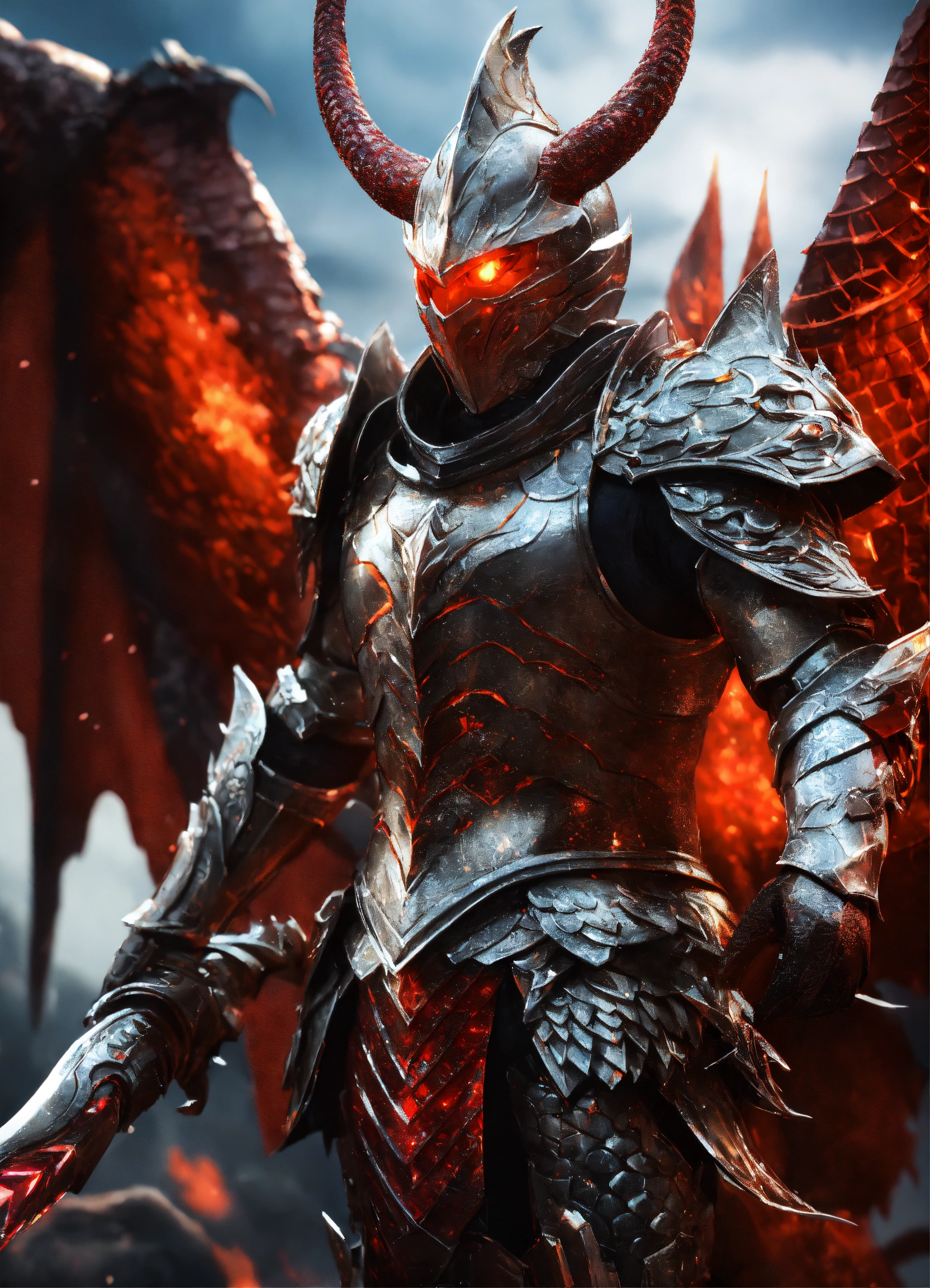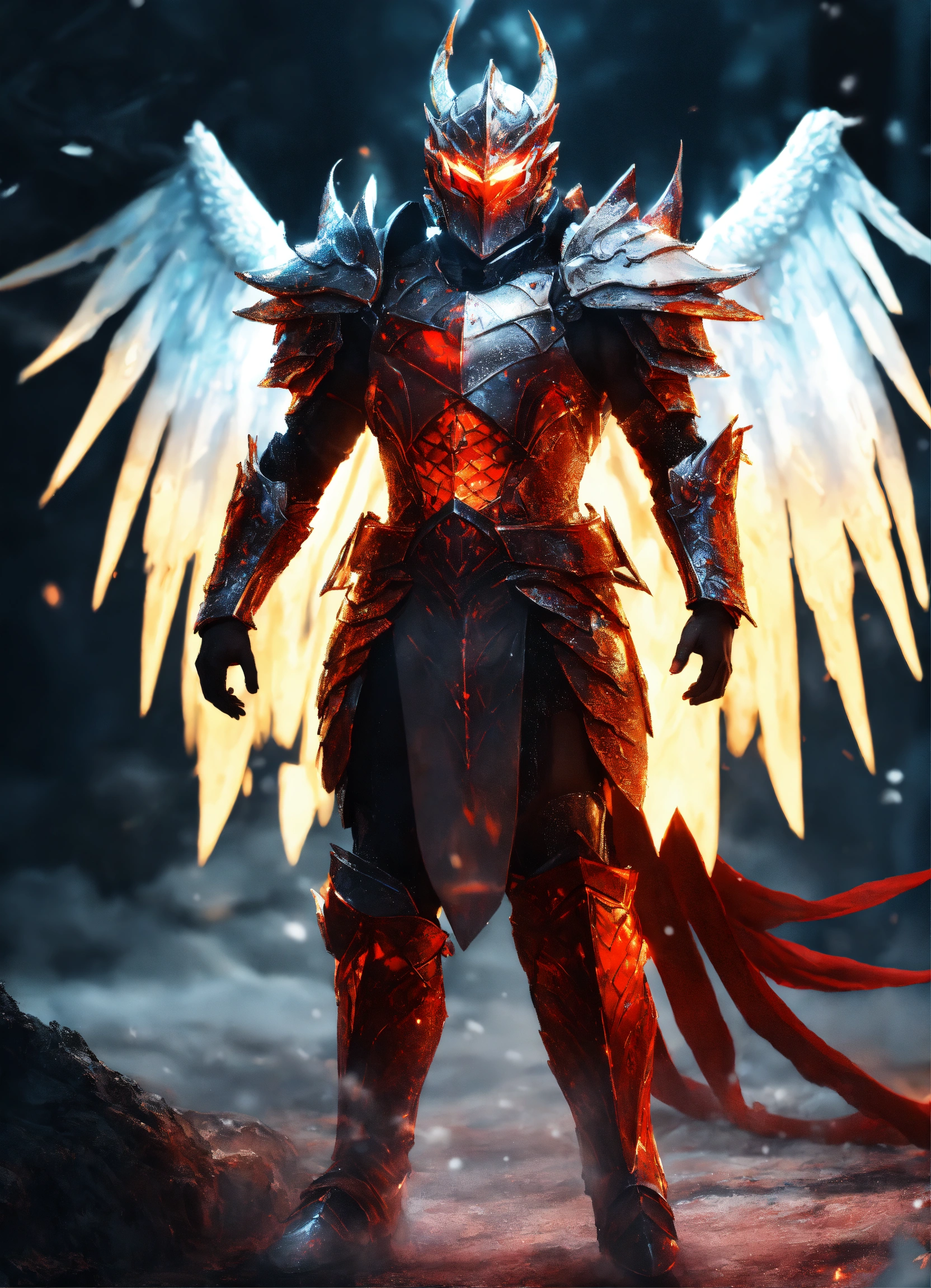 Glowing red eyes knight with a snow white diamond-plated armor and 85% transparent smoke dragon wings, the chest should glow and smoke, shiny glowing diamond-plated armor white red glowing and burning, dragon scale sword with fire blade and lightning shining, adorned with dragon scales behind the dragon, fantasy, high detail, realistic photo, high detail, digital painting, cinematic, stunning, hyperrealistic, sharp focus, high resolution 8k, insanely detailed, front view, idle, metallic, glossiness