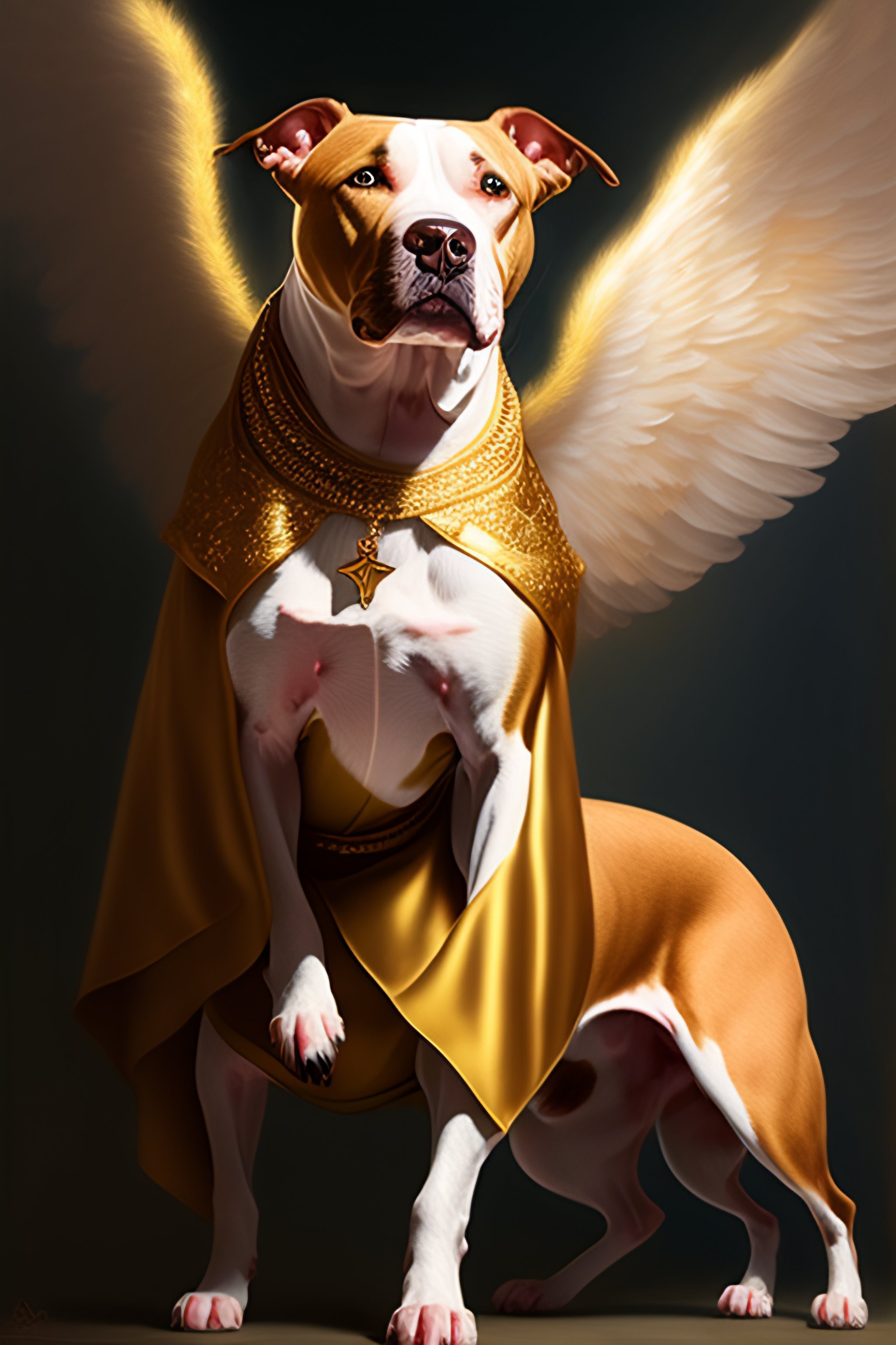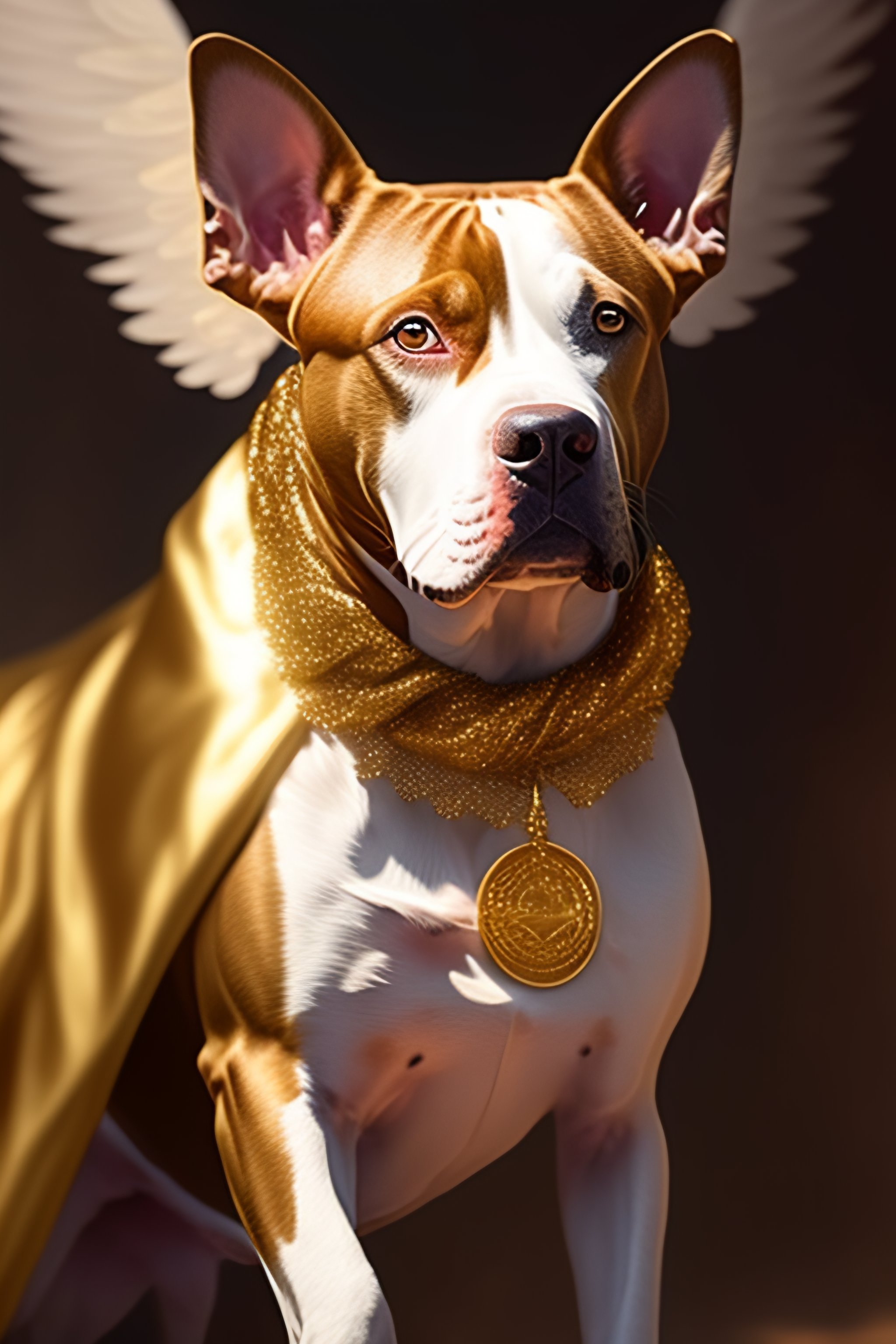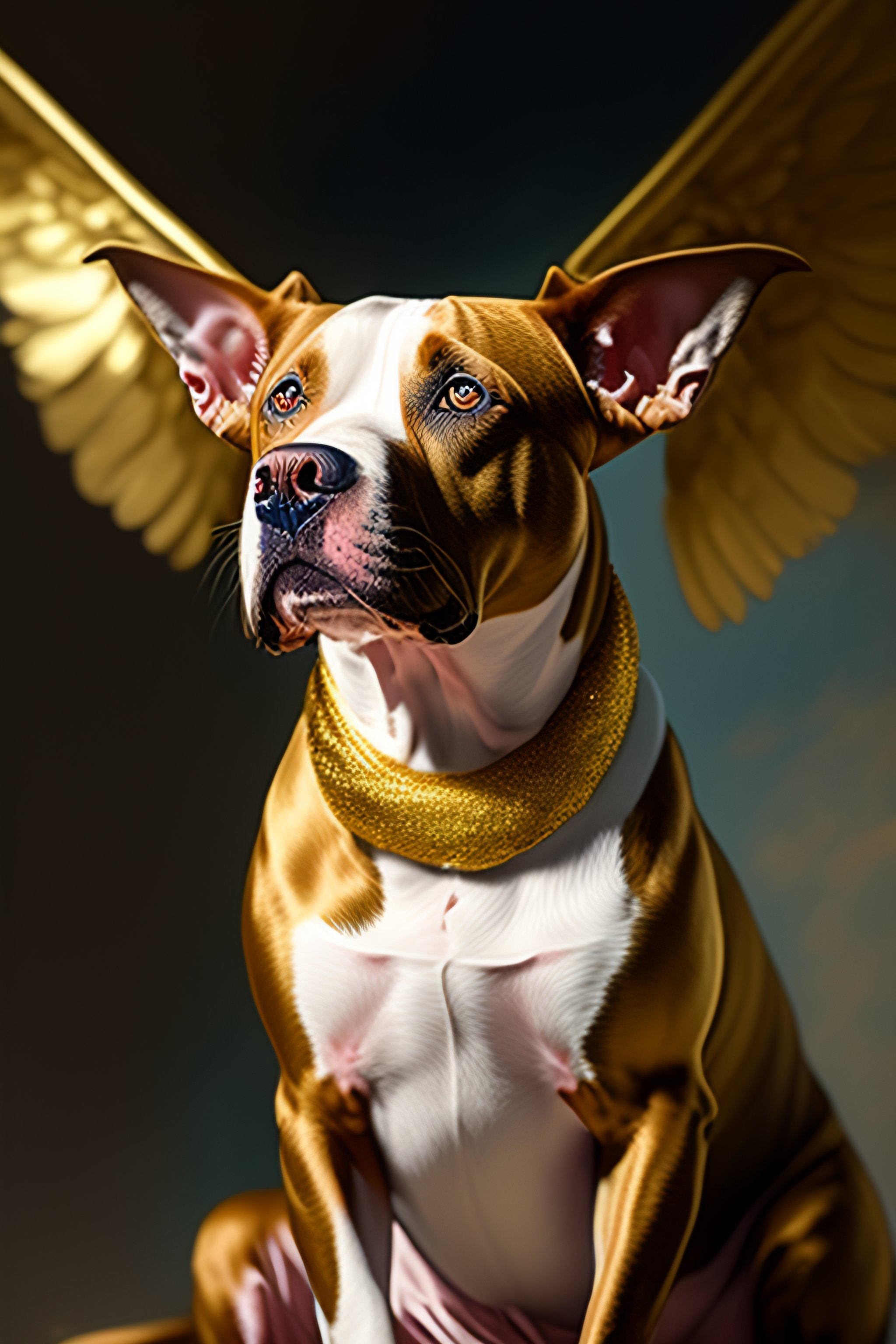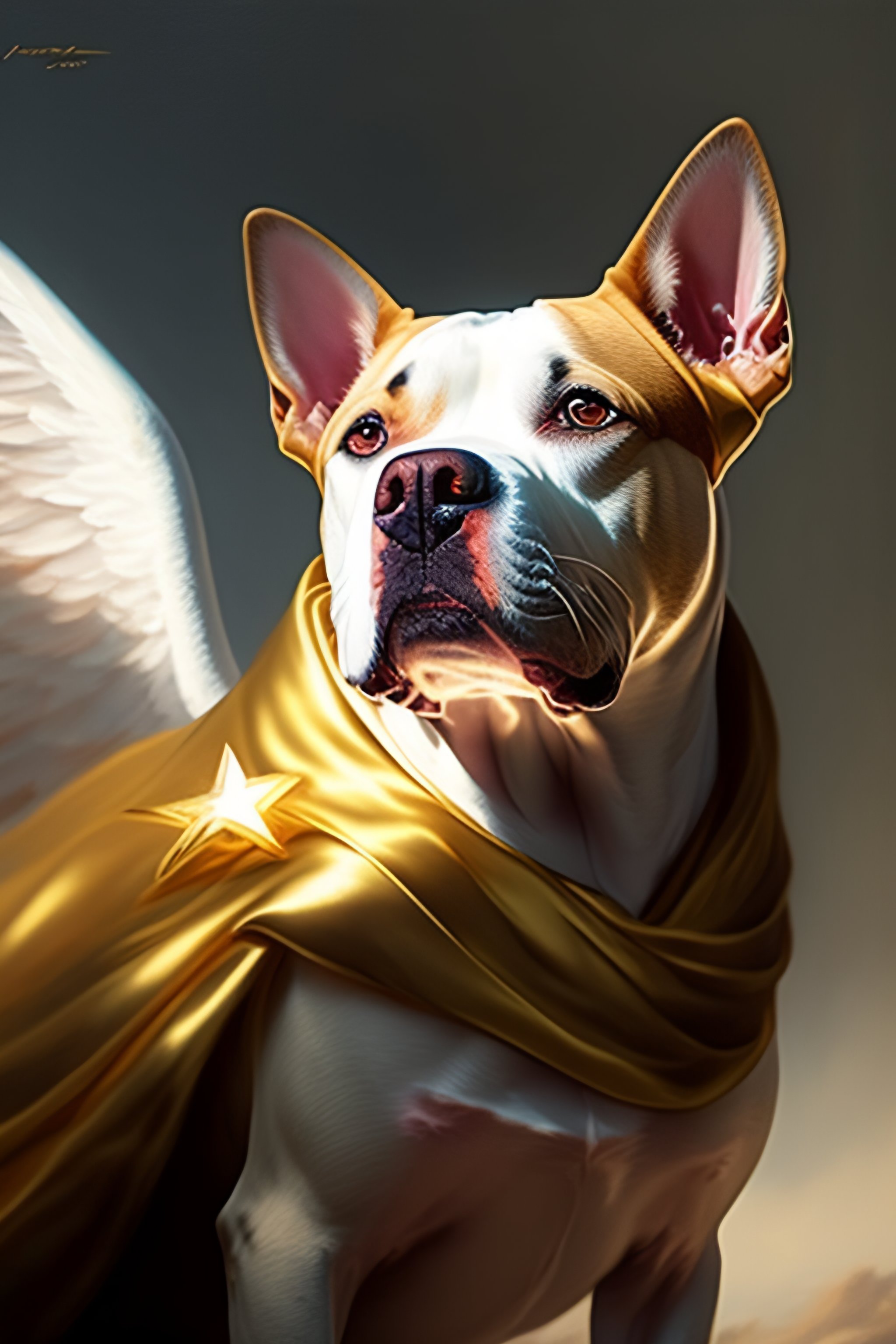 A pitbull dog as an angel with a gold scarf, windy, cape, ribbons, stars, melancholic, modern maximalist . light dust, magnificent, hyperdetailed, theatrical, painted by jean honore fragonard and greg rutkowski