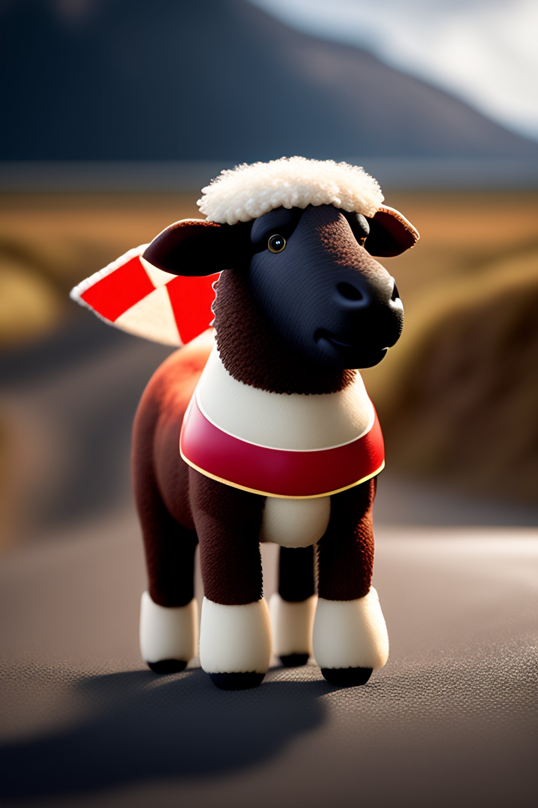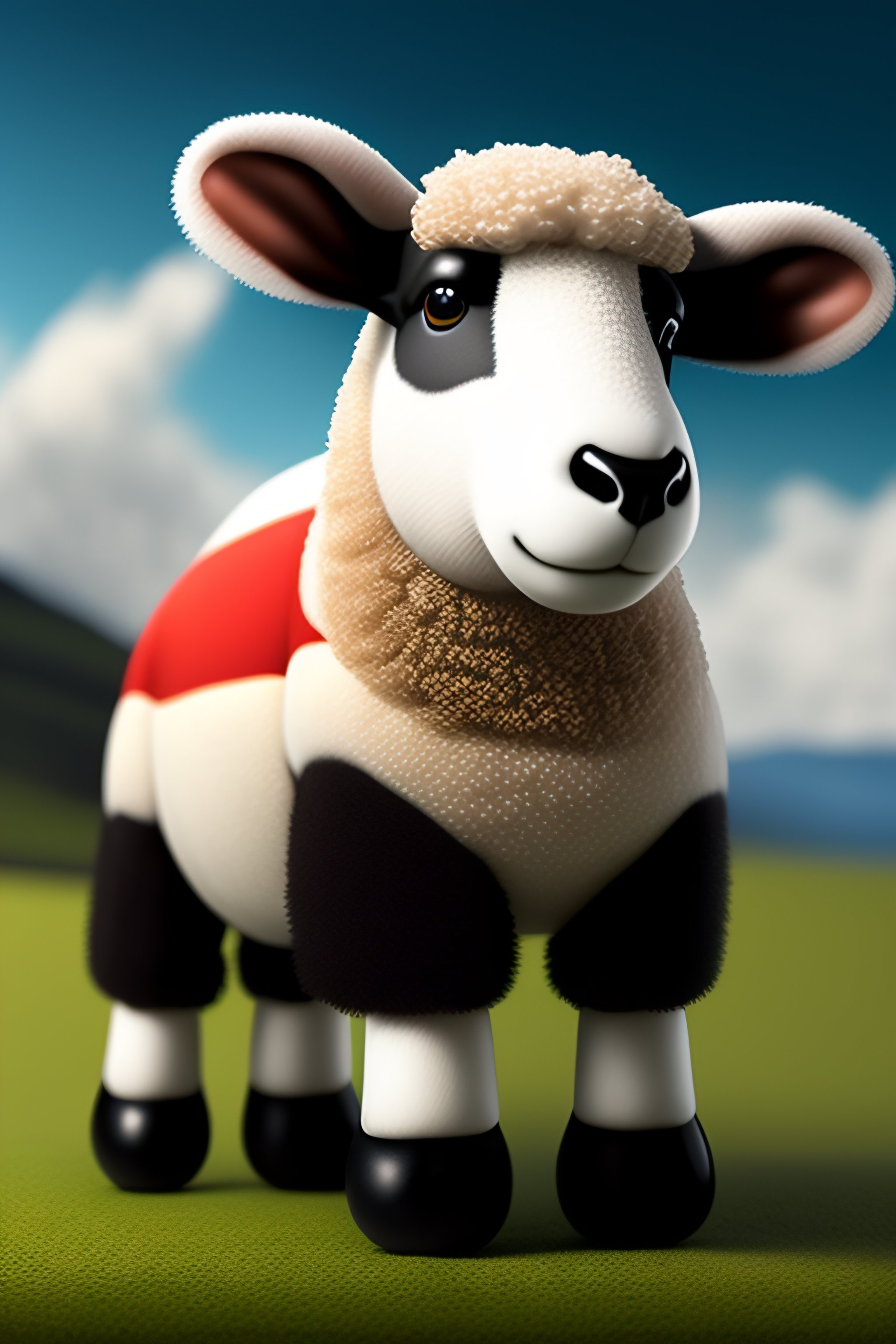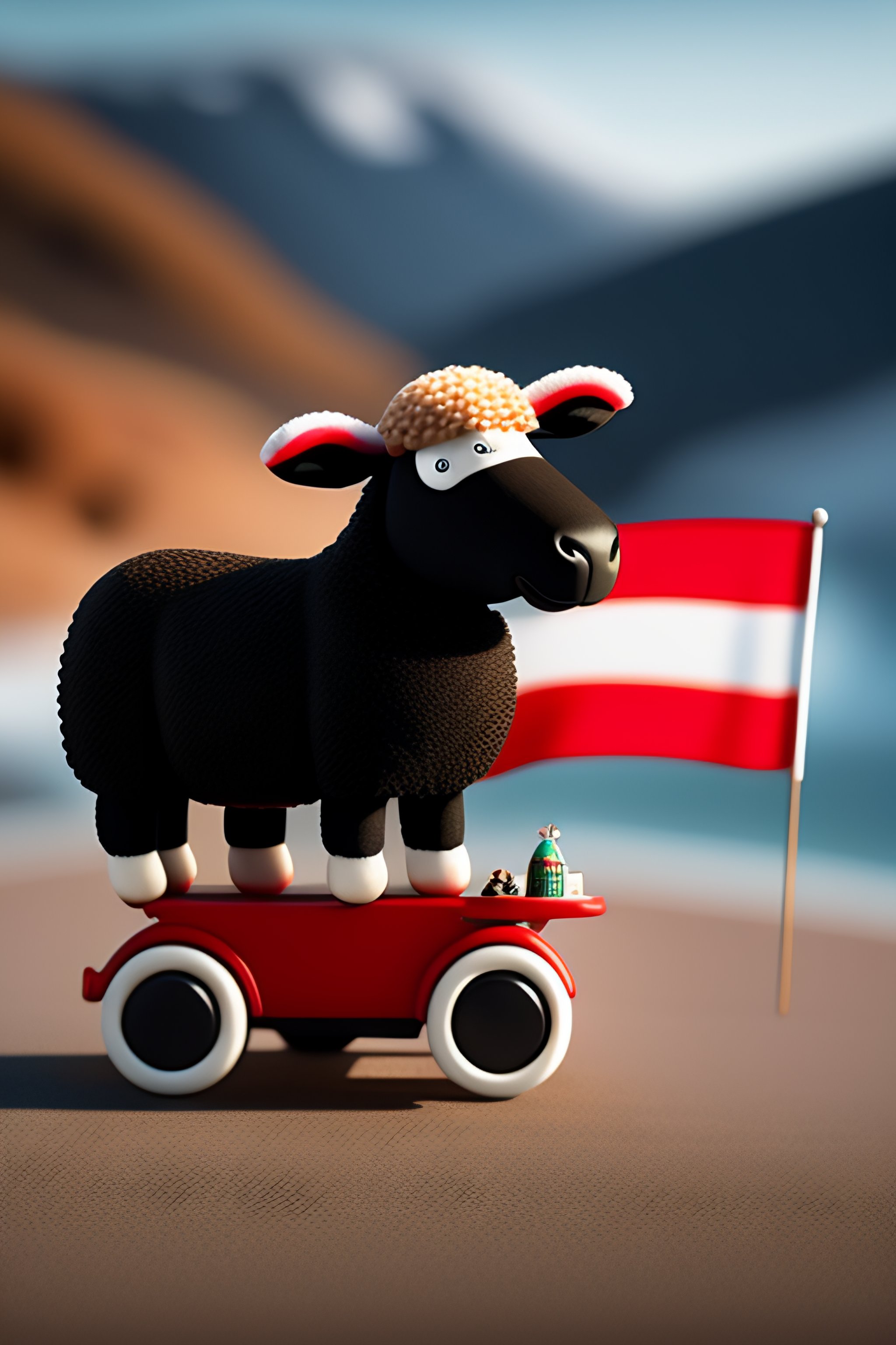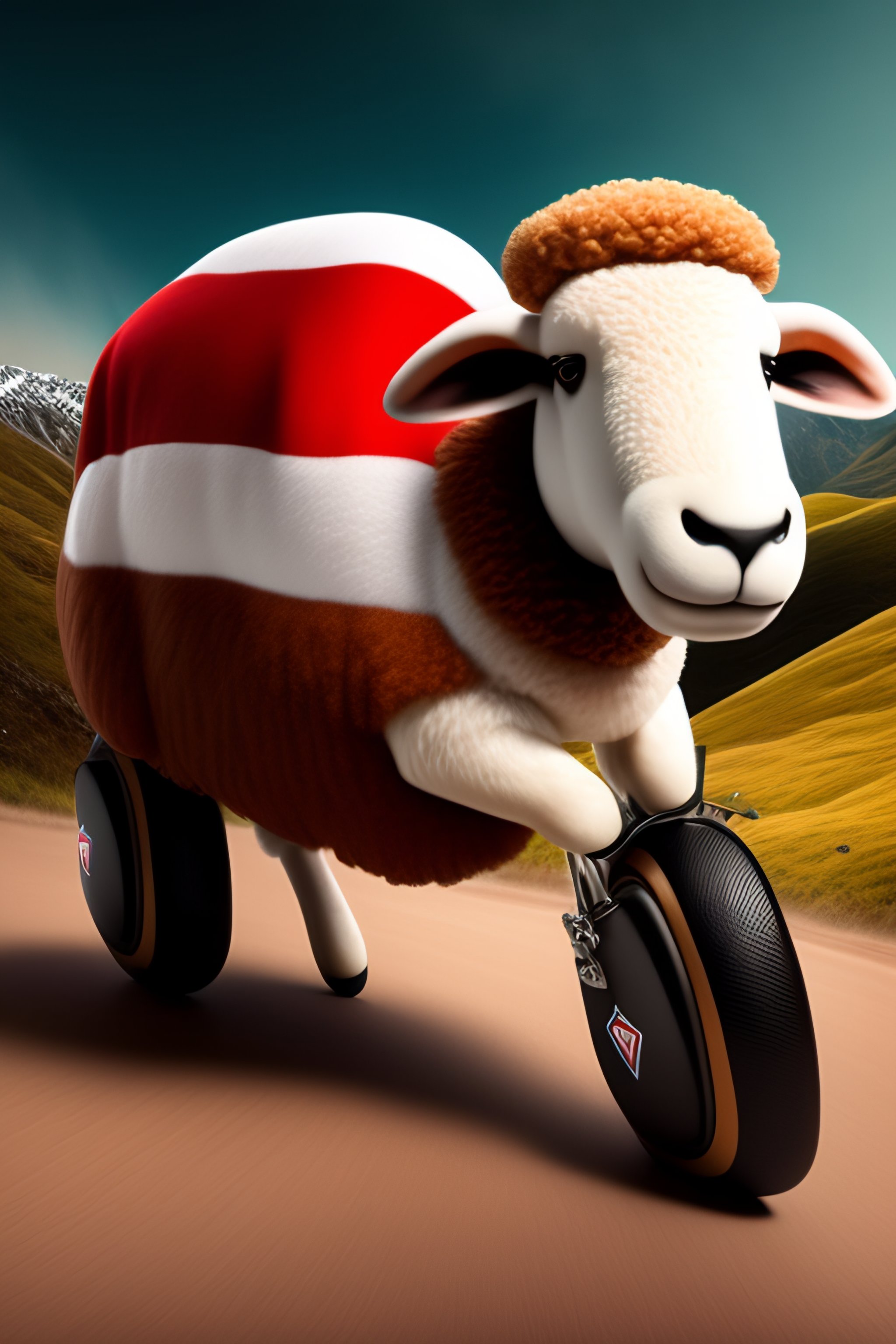 An anamorphic image of shawn the sheep wearing underpants covered in the welsh flag riding a bmw motorbike