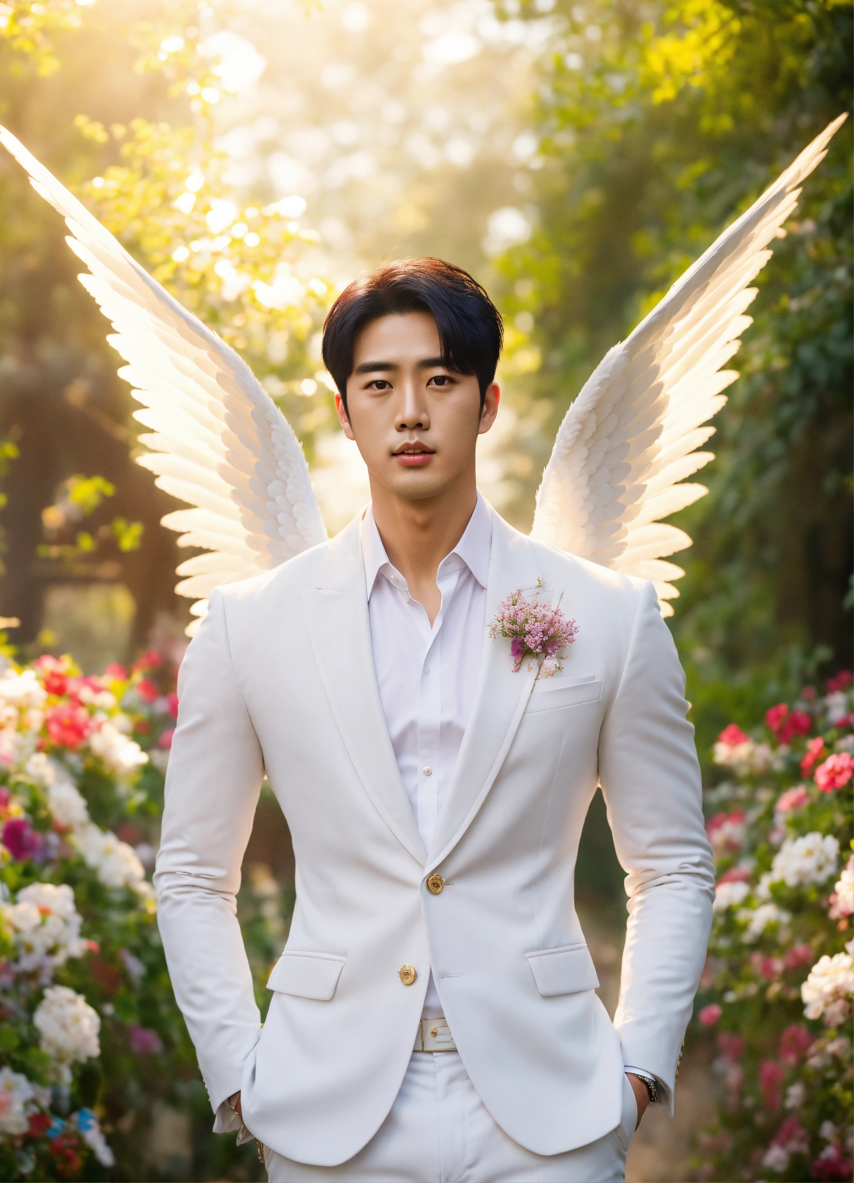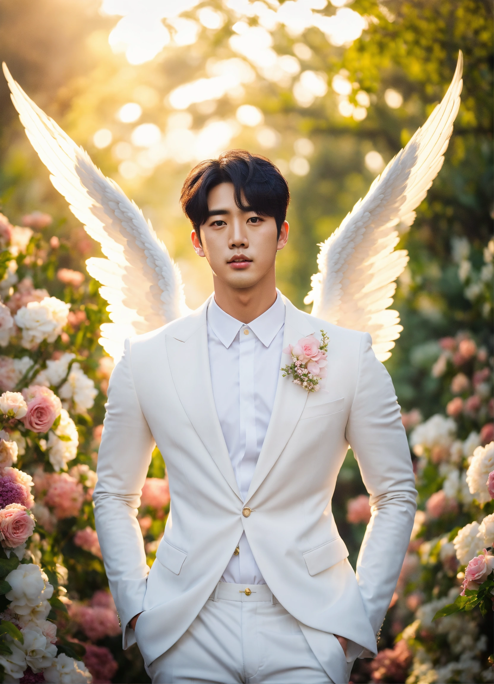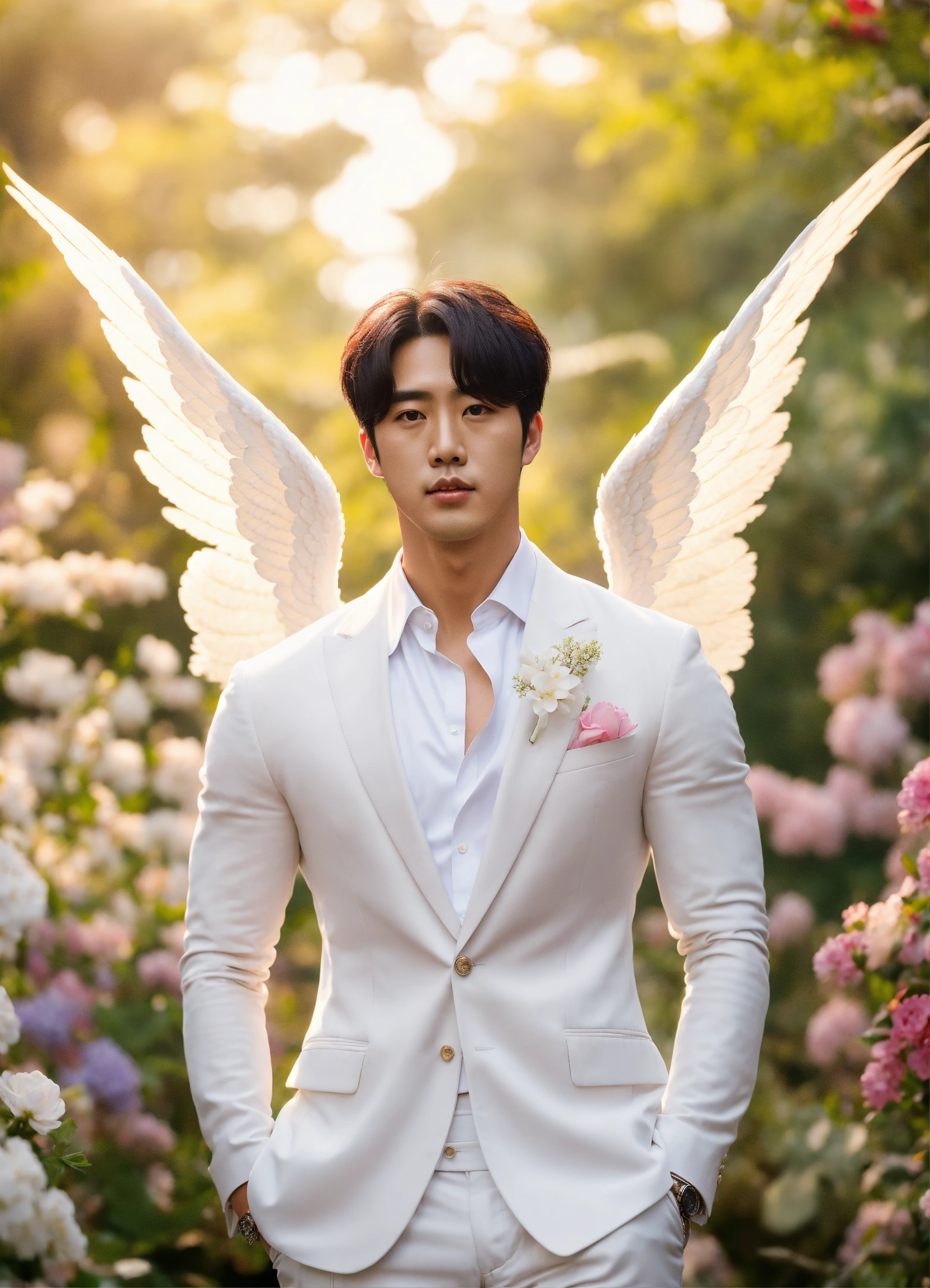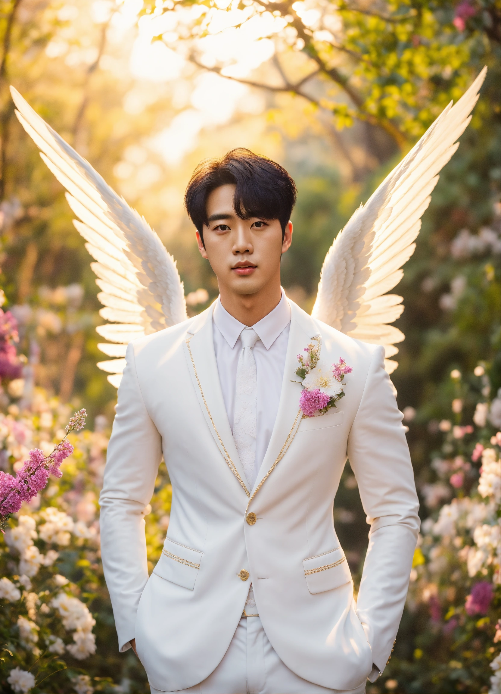 A strong handsome muscular asian angel seokjin man with wings with short hair dressed in a white suit with beautiful flowers and nature around him