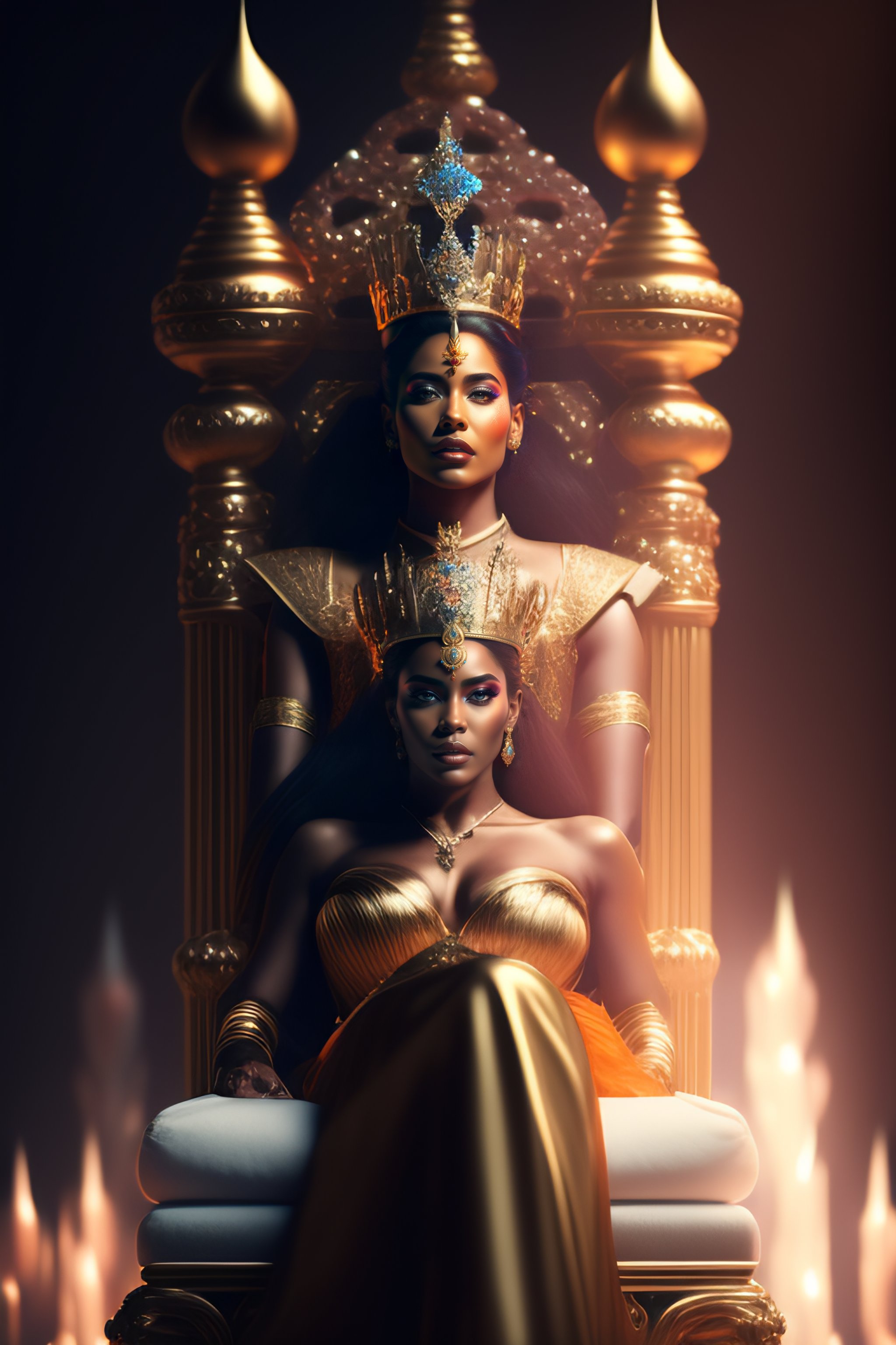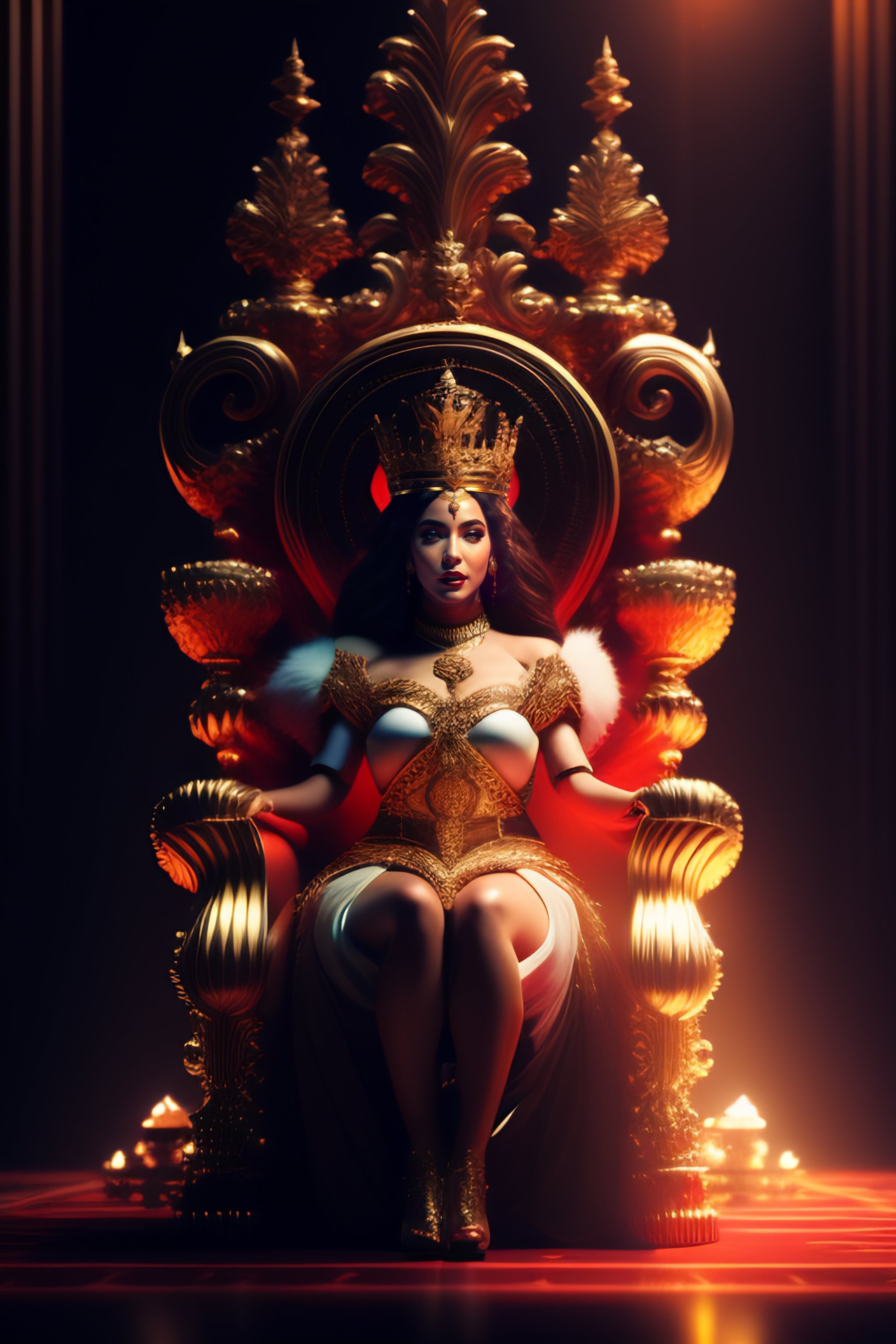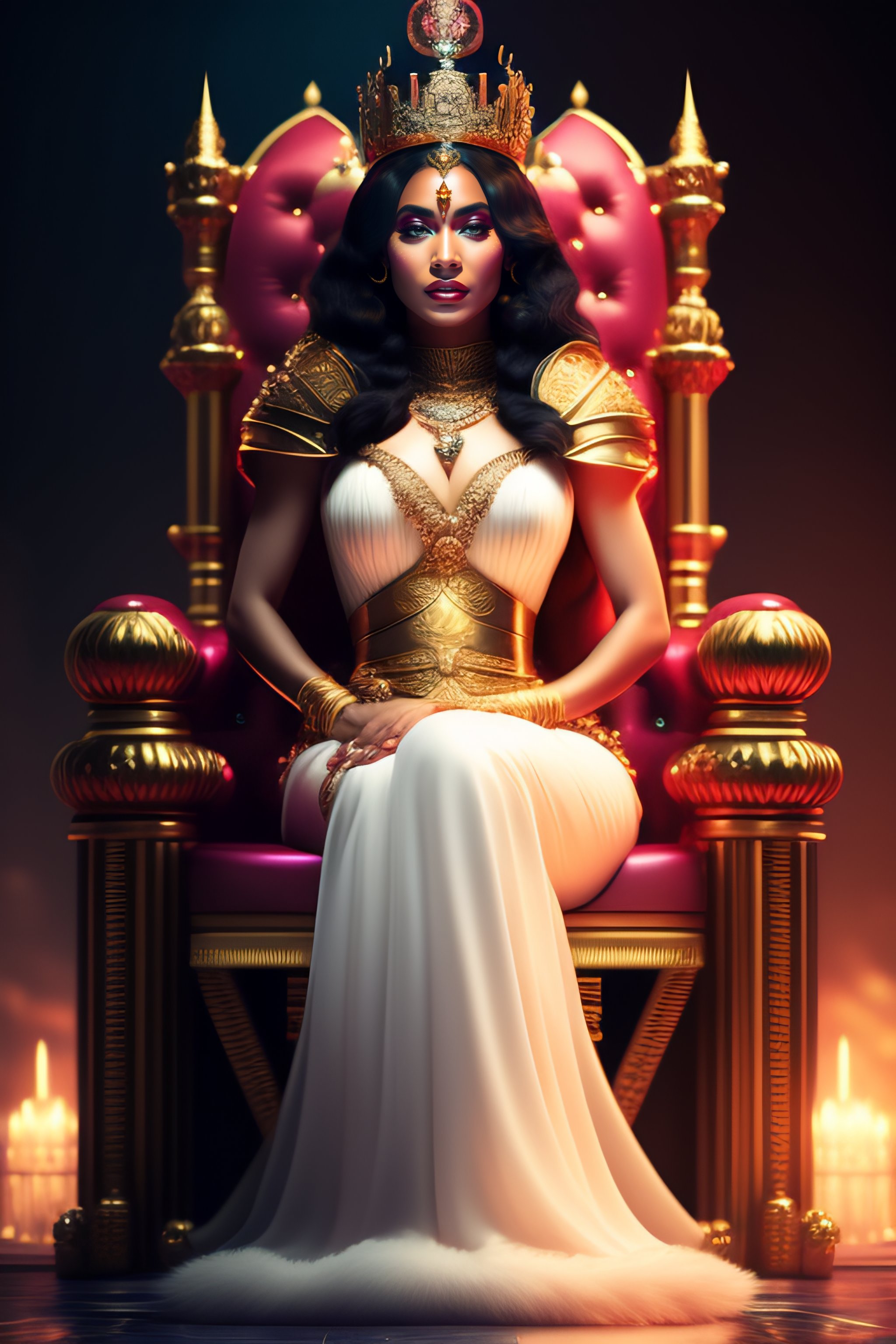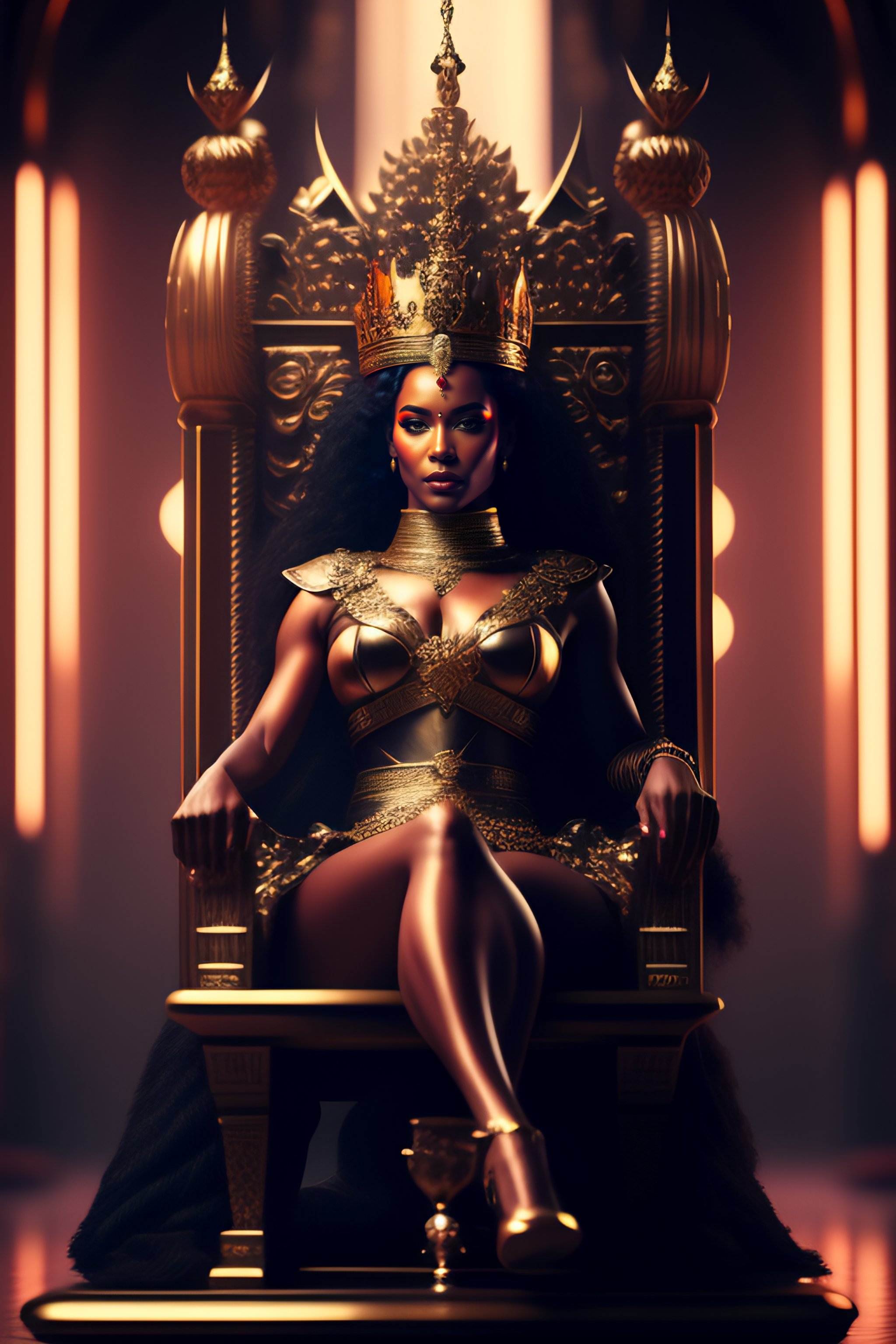 Low angle full body shot photo of a young beautiful queen of pain sitting on a throne in the style of stanley kubrick, mischievous smile, movie concept art, cinematic composition, high detail, octane render, 8k, volumetric lighting