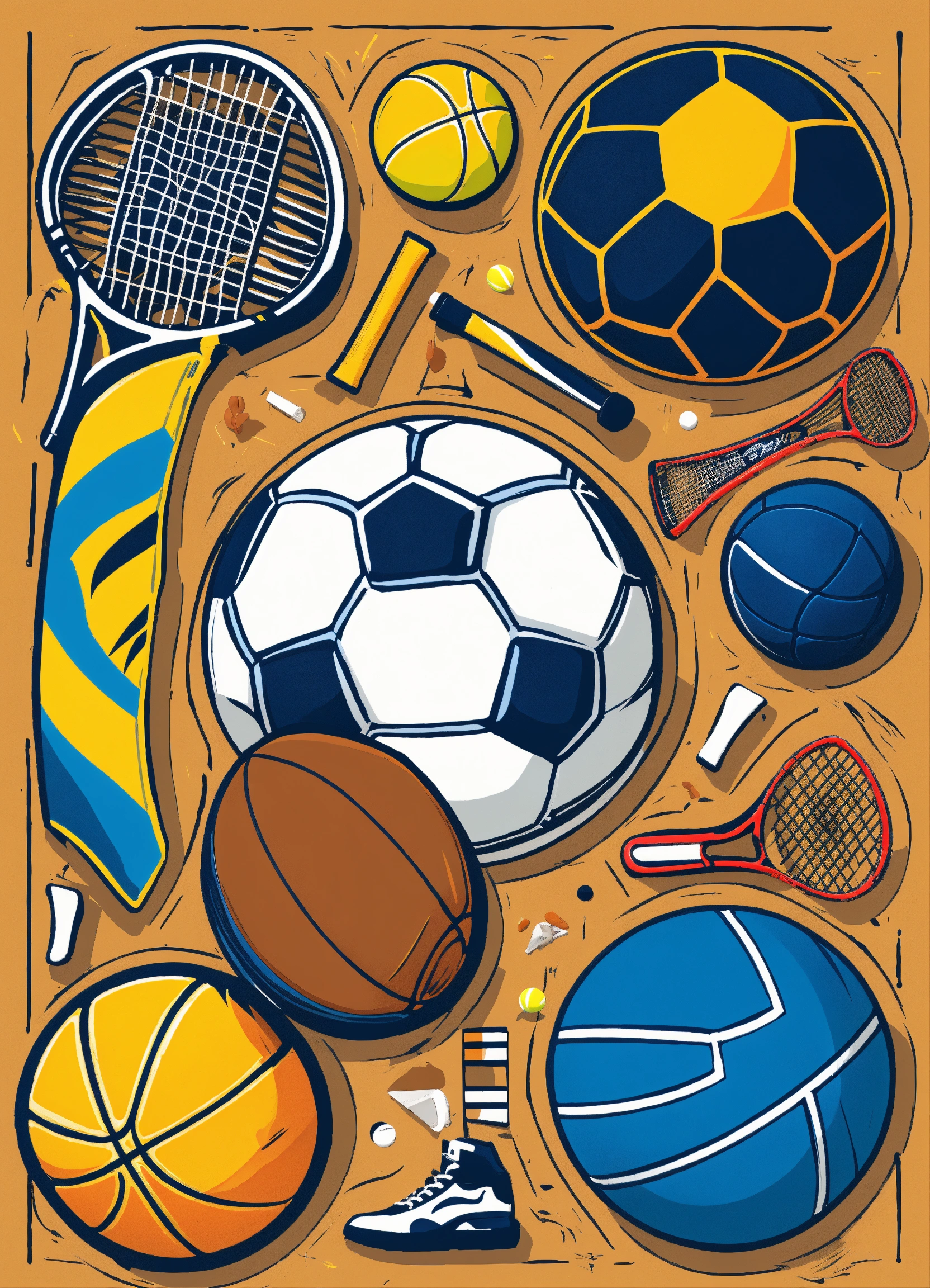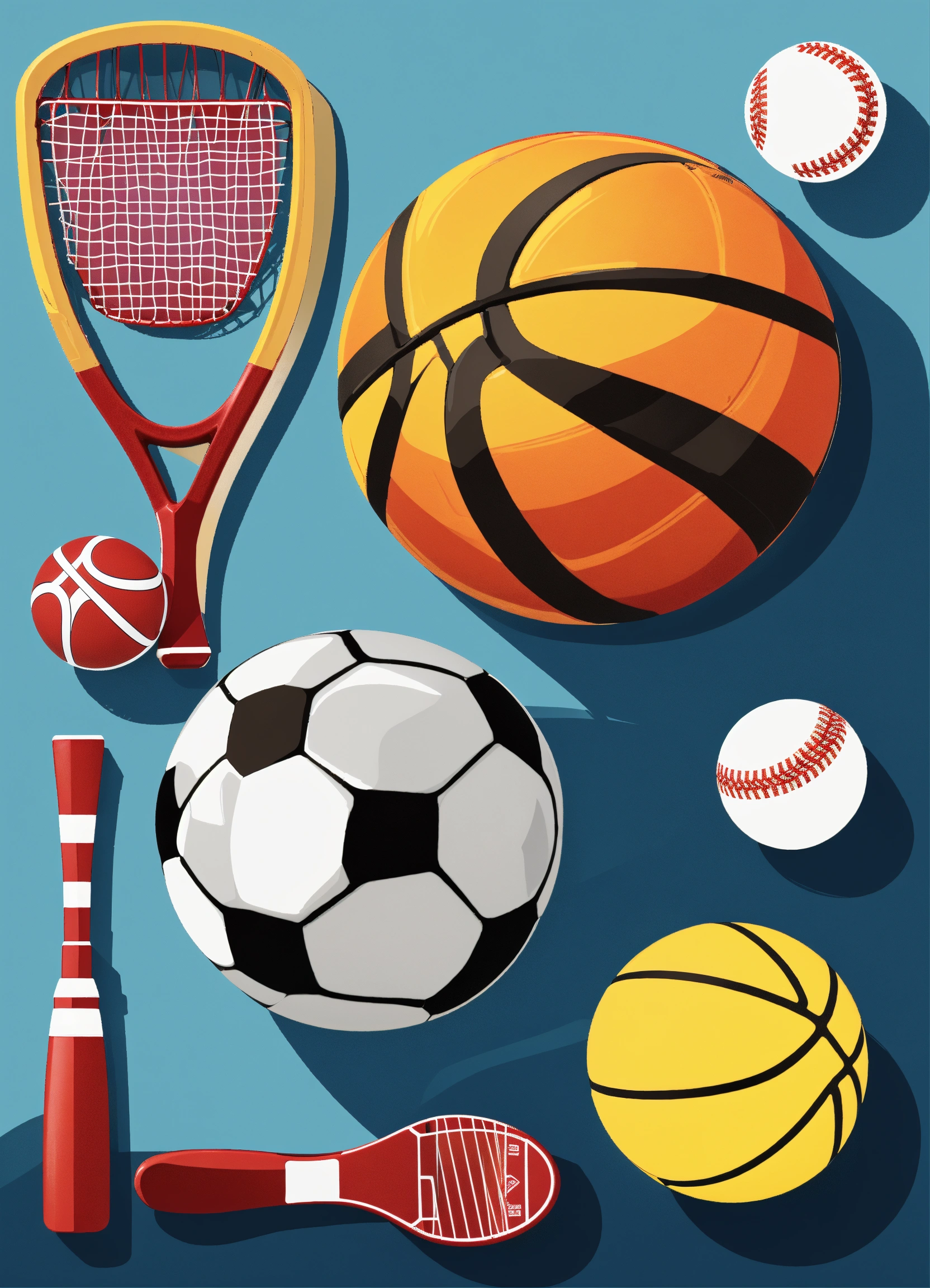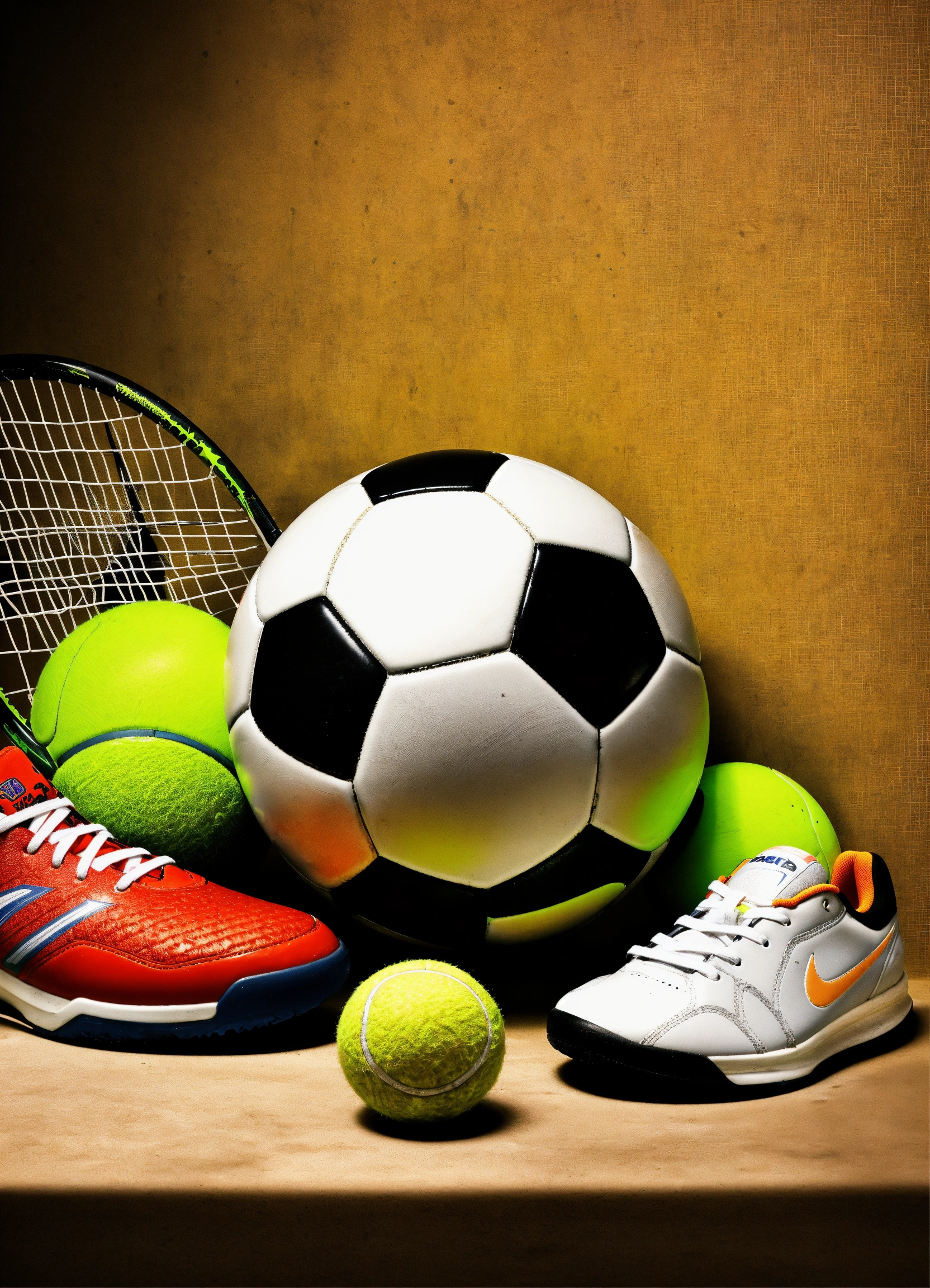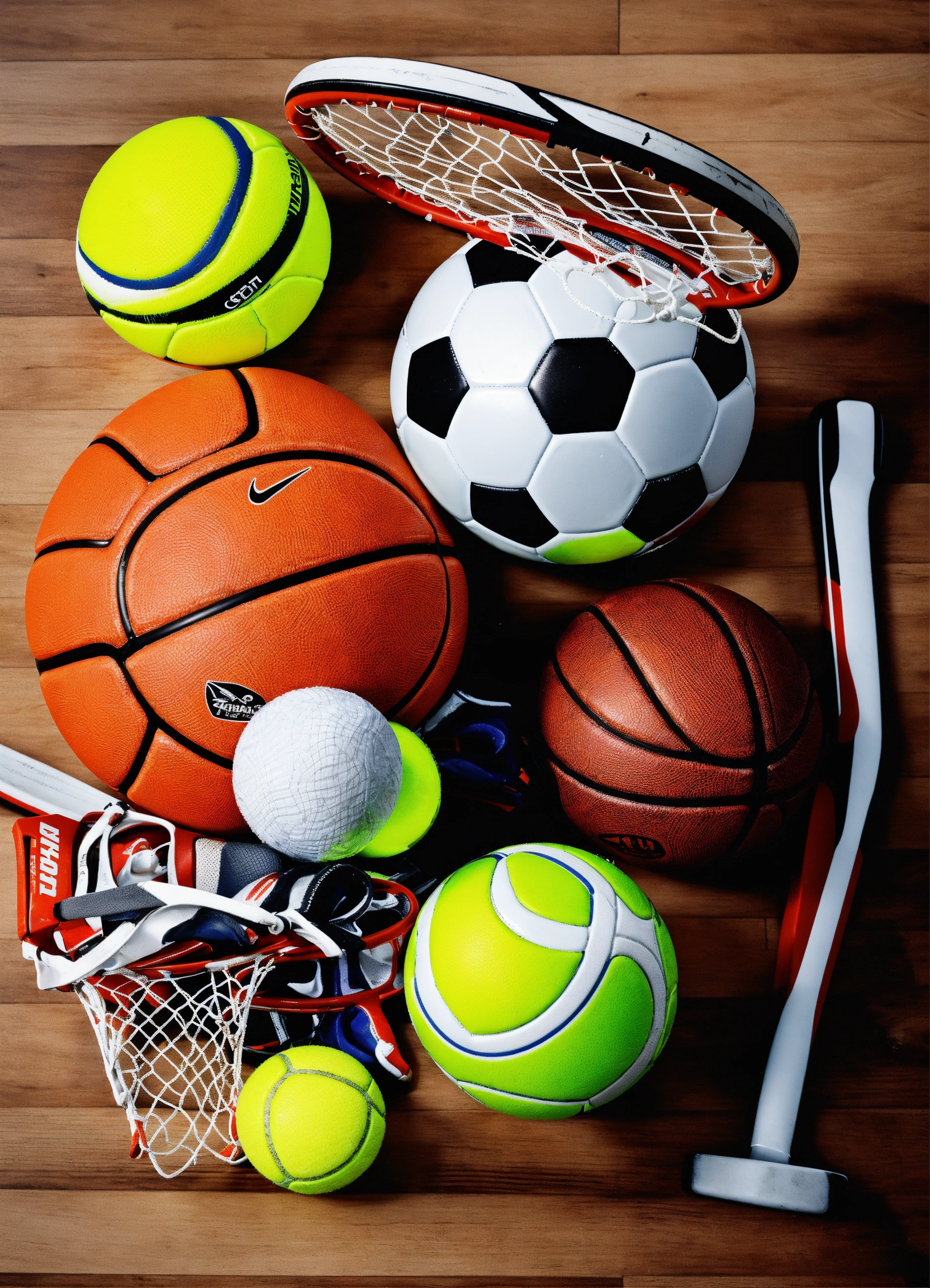 Create an image featuring a soccer ball, a basketball, a racket, and a tennis ball placed side by side. the objects should be arranged in a visually appealing manner, highlighting the diversity of sports equipment. the image should capture the essence of multiple sports, each represented by its respective item, and convey a sense of athletic versatility and enthusiasm