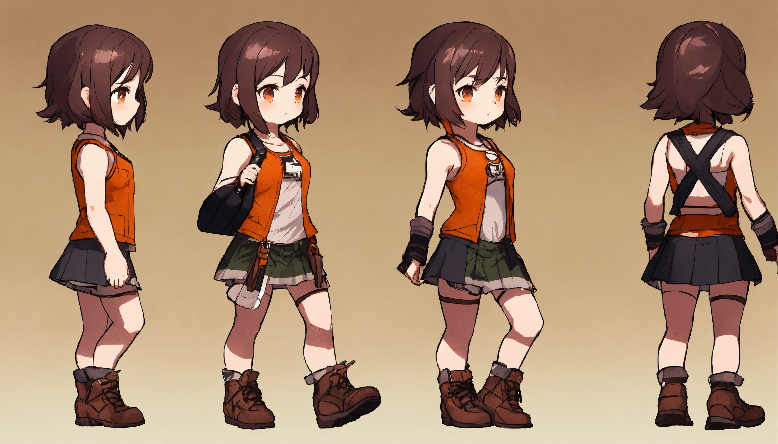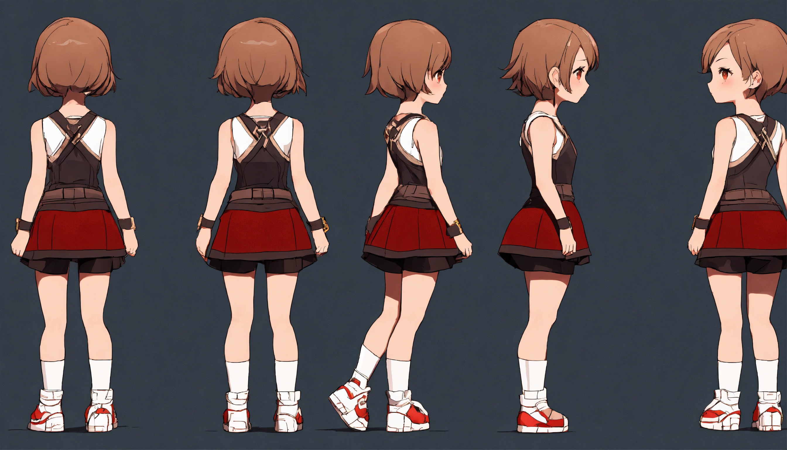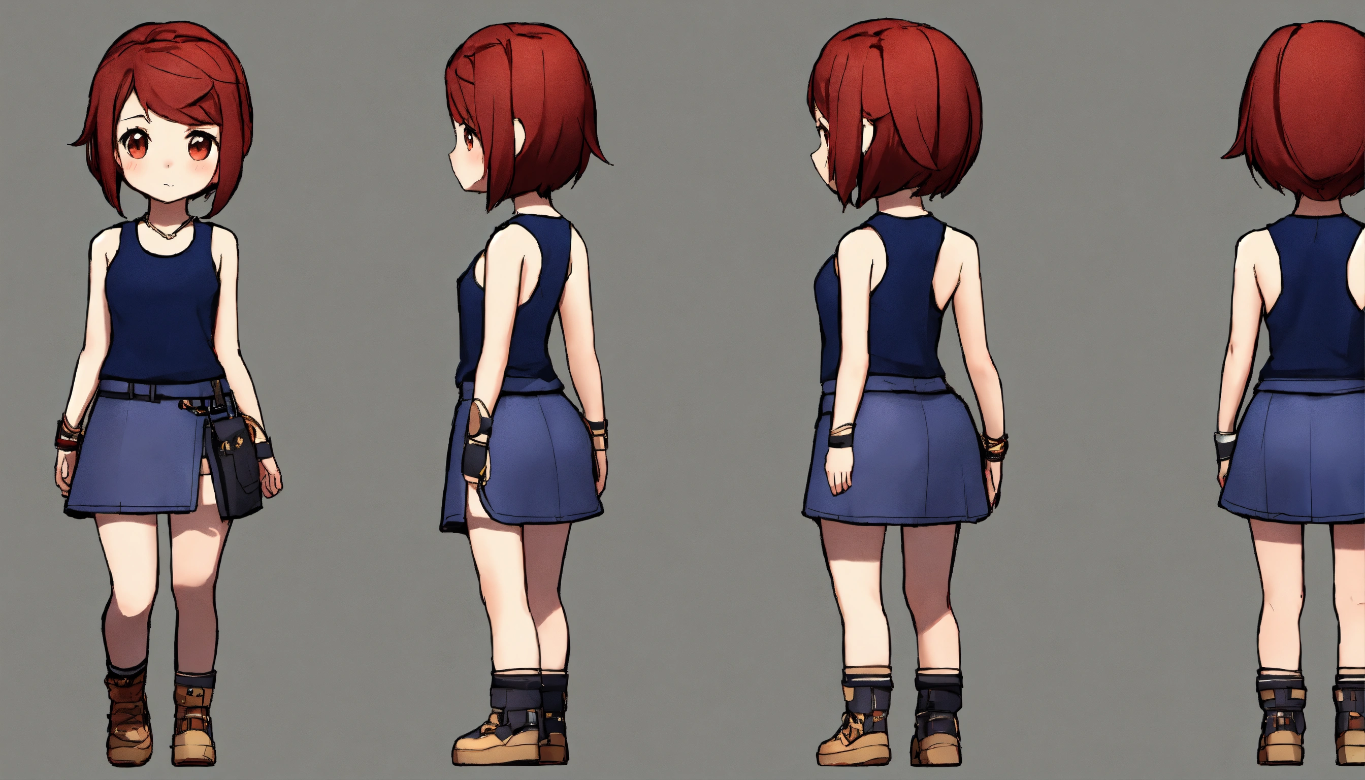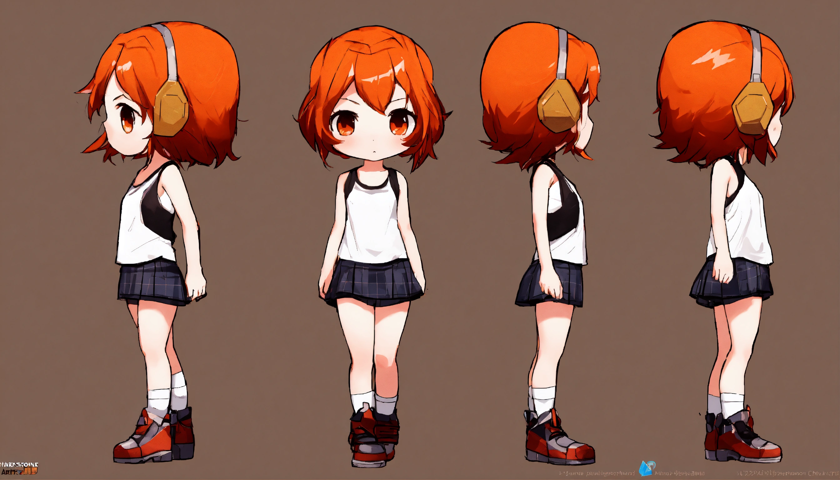 Short haired girl wearing tank top and short skirt, walking, game art, full body view, side view, artstyle from heartstone, chibi proportions, blank background