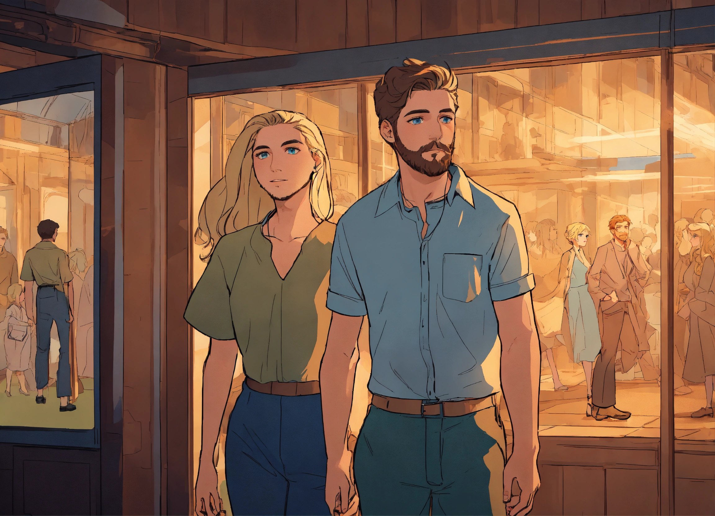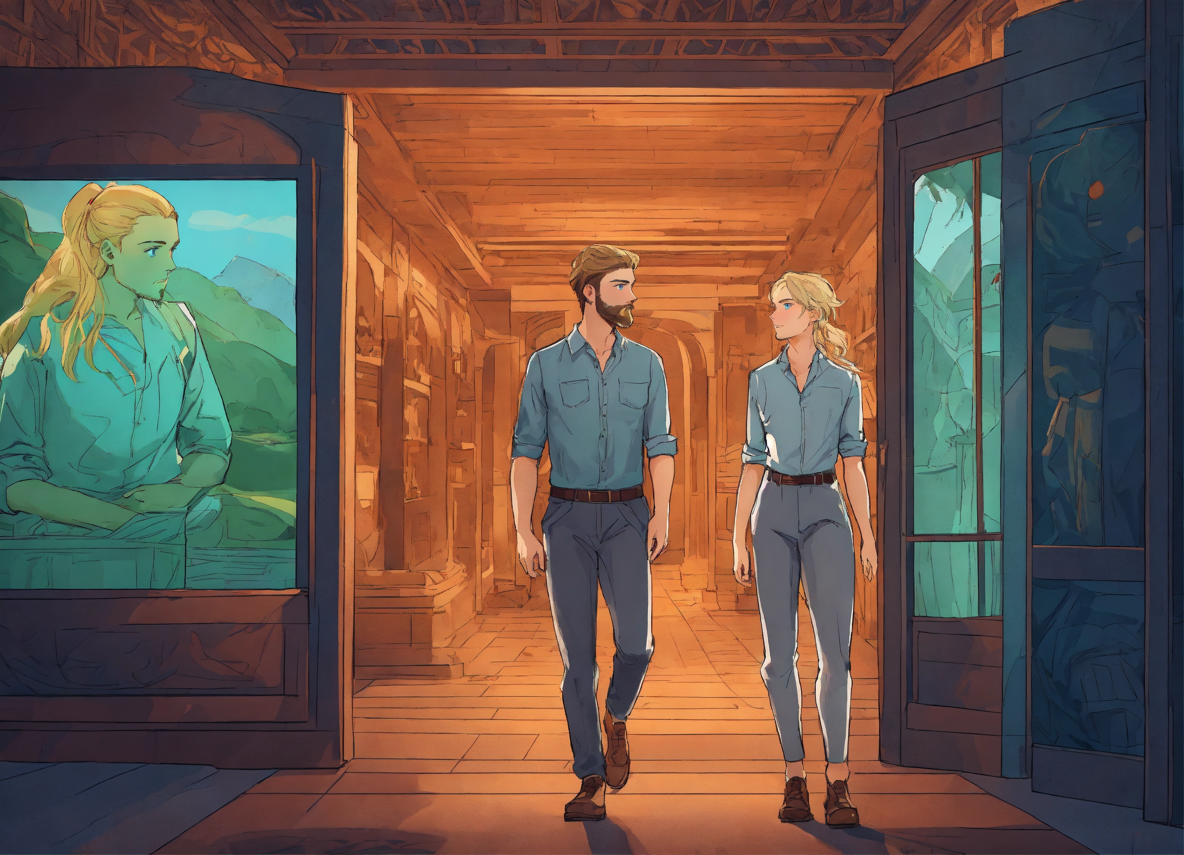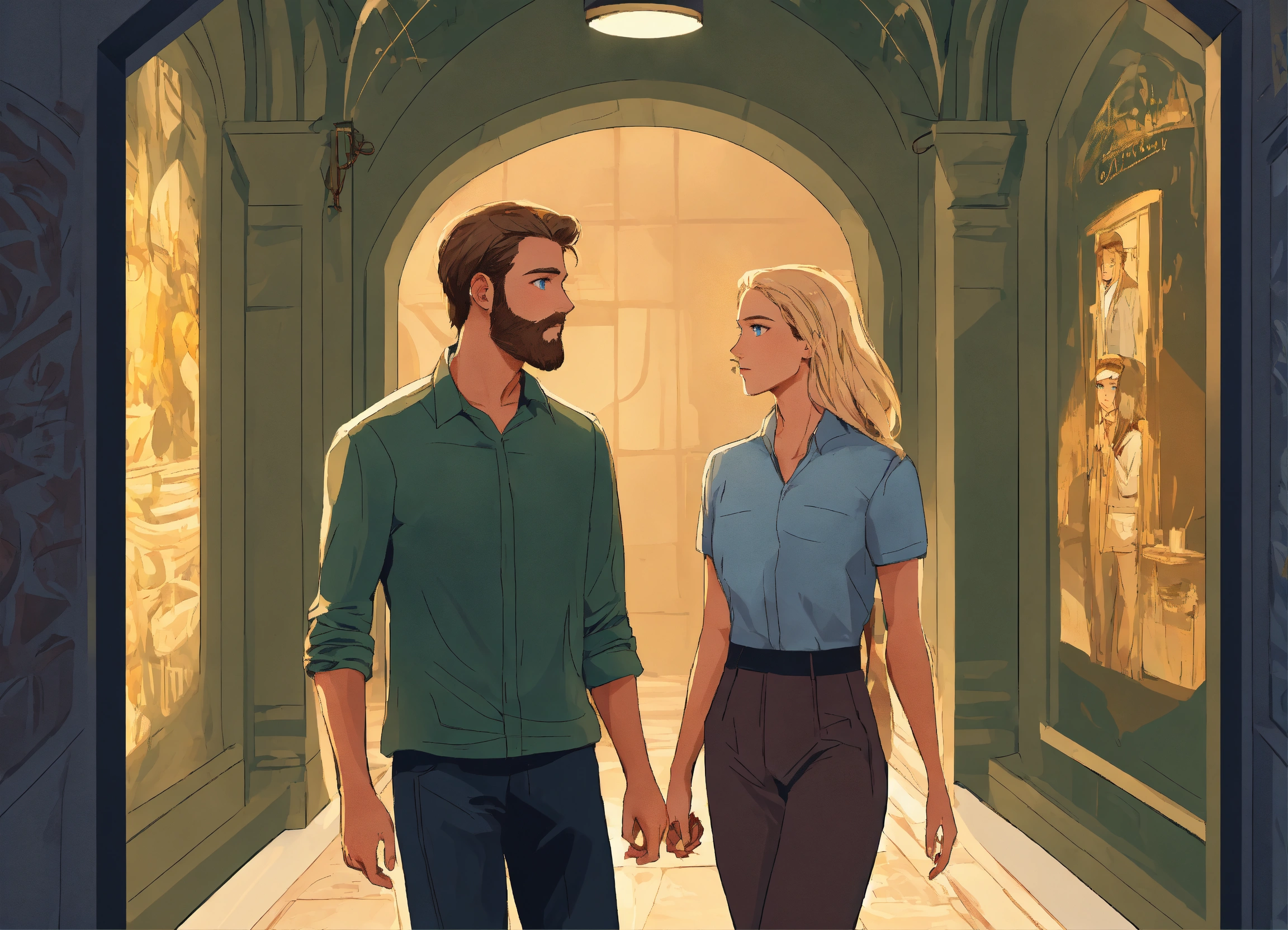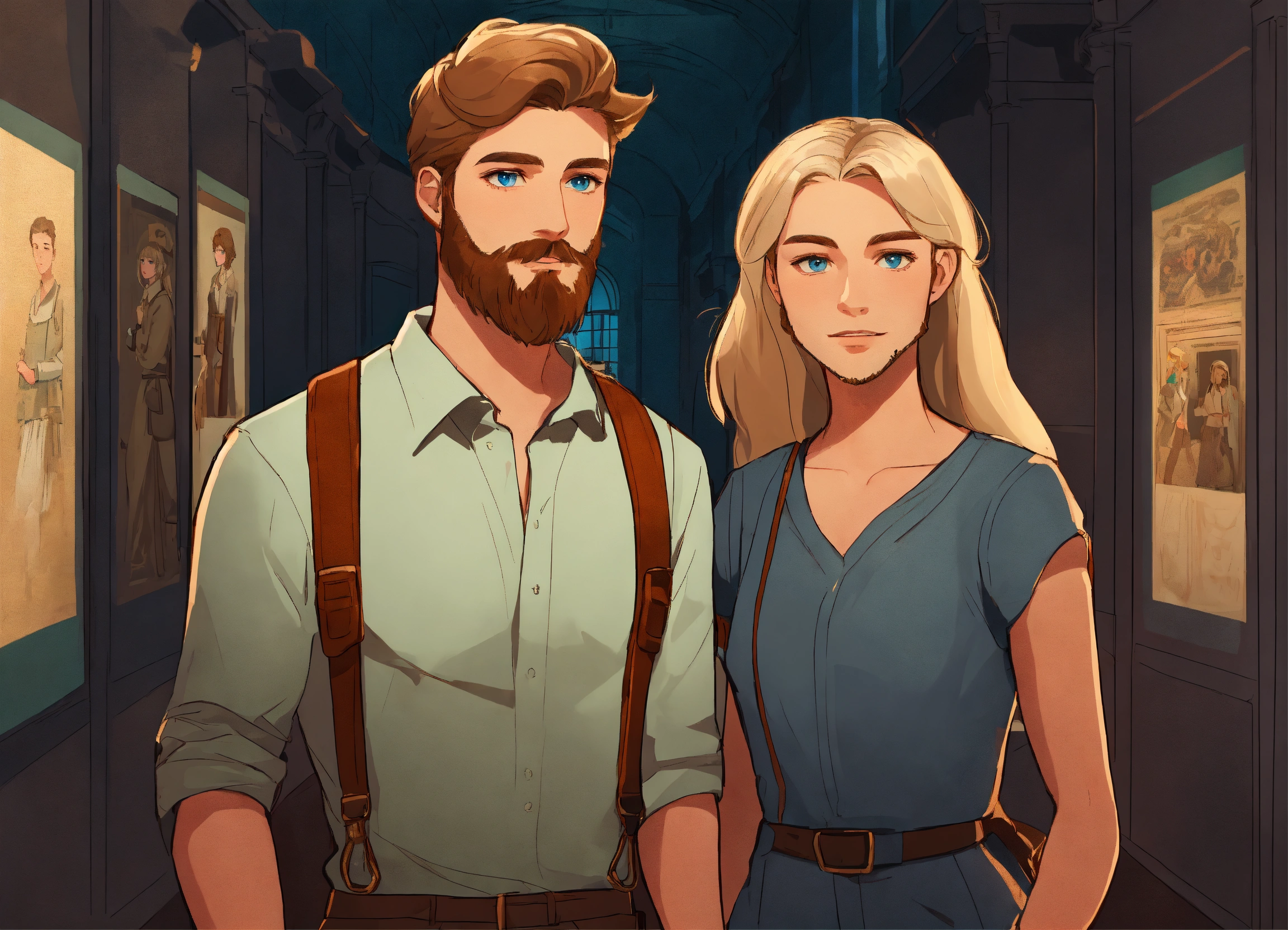 An illustration style where young man with green eyes, sparse light thin brown beard wearing silver shirt dark gray pants meeting his friend, her name is olivia and she is blonde girl with blue eyes and v shape face and they both go to history museum. walking inside dark history museum to find ancient mural secrets