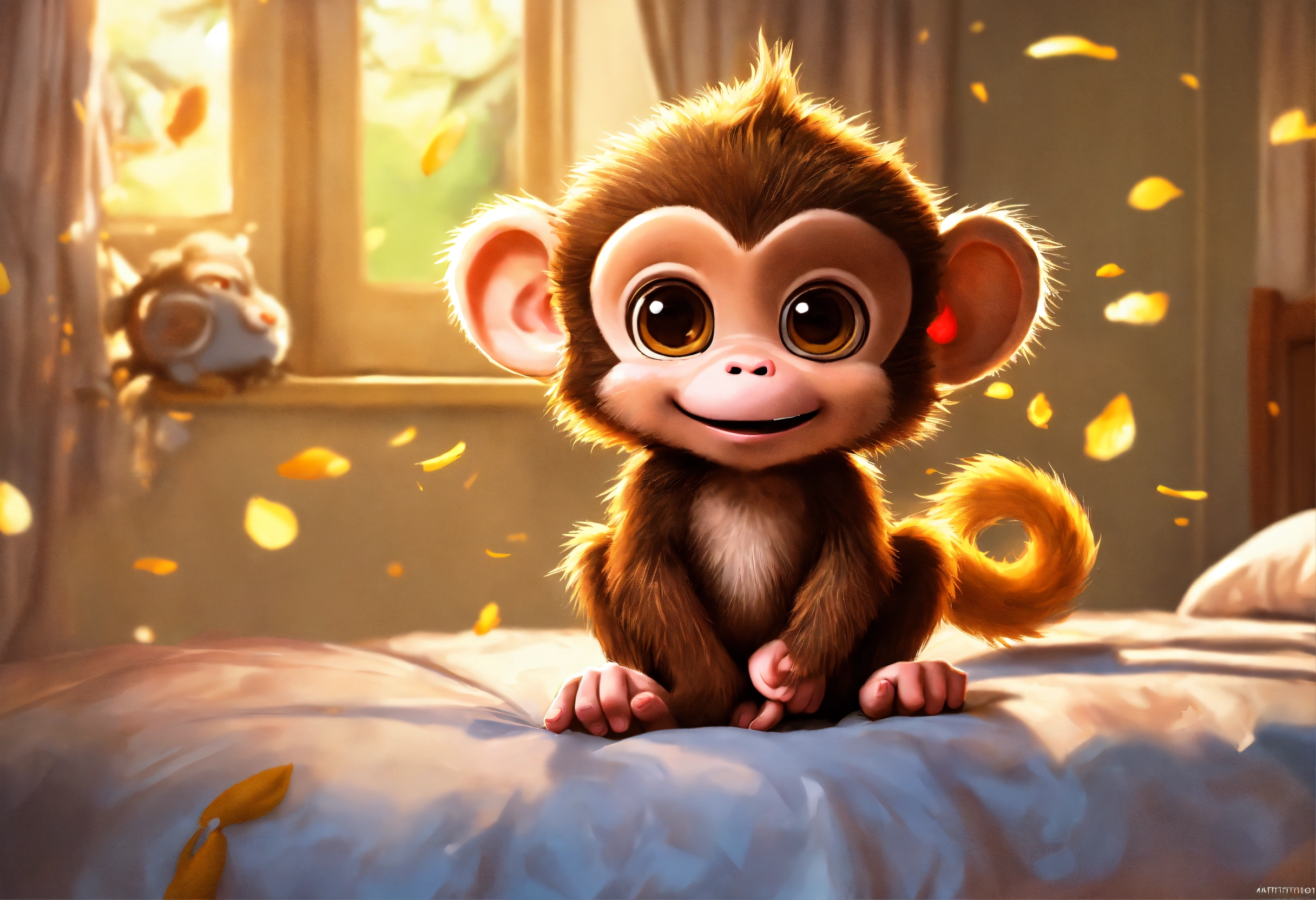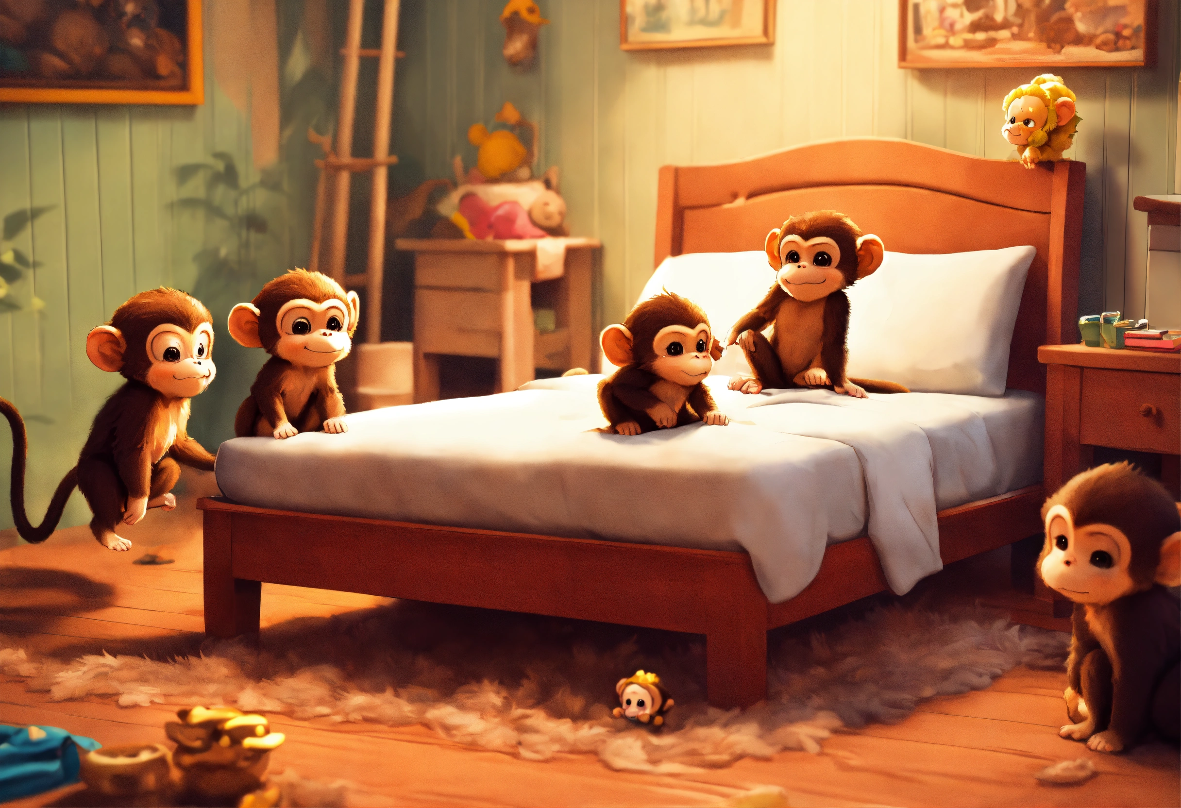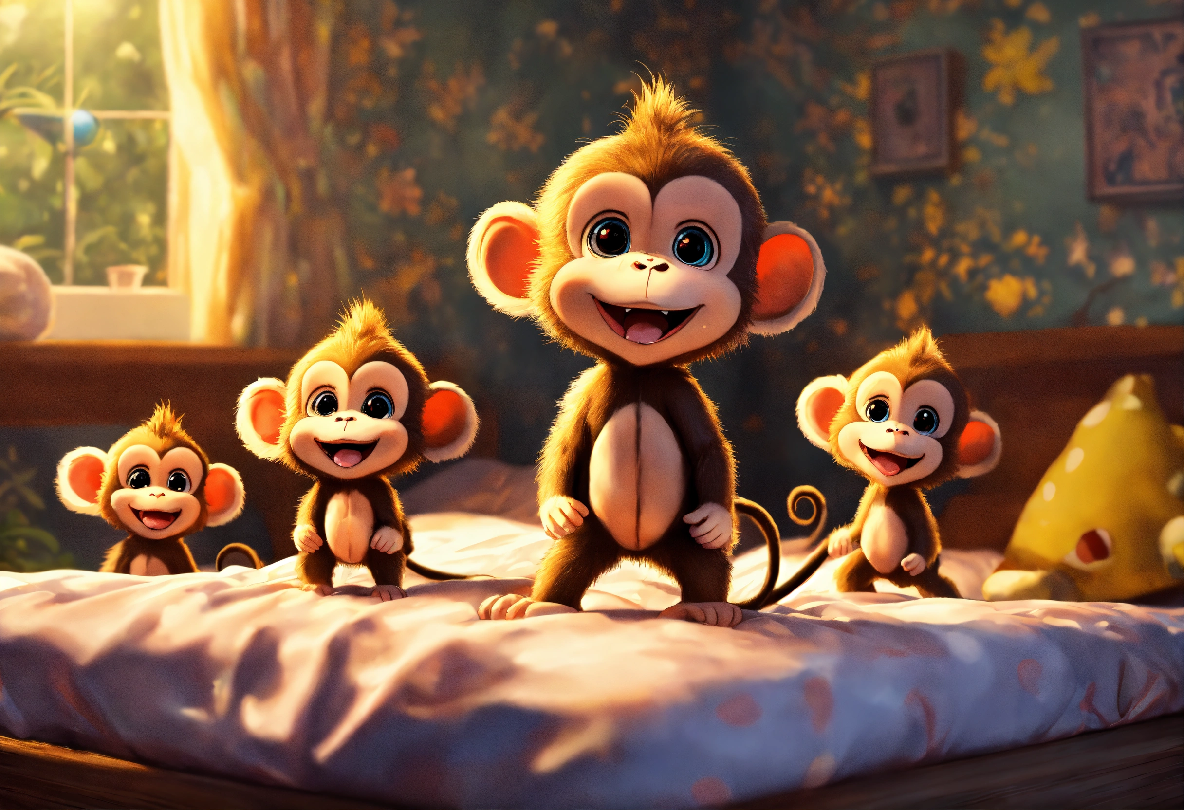 4 cute and adorable cartoon fluffy baby monkey, five little monkeys are jumping on the bed someone fell and hit his head fantasy, dreamlike, surrealism, super cute, trending on artstation, cartoon, ar-169