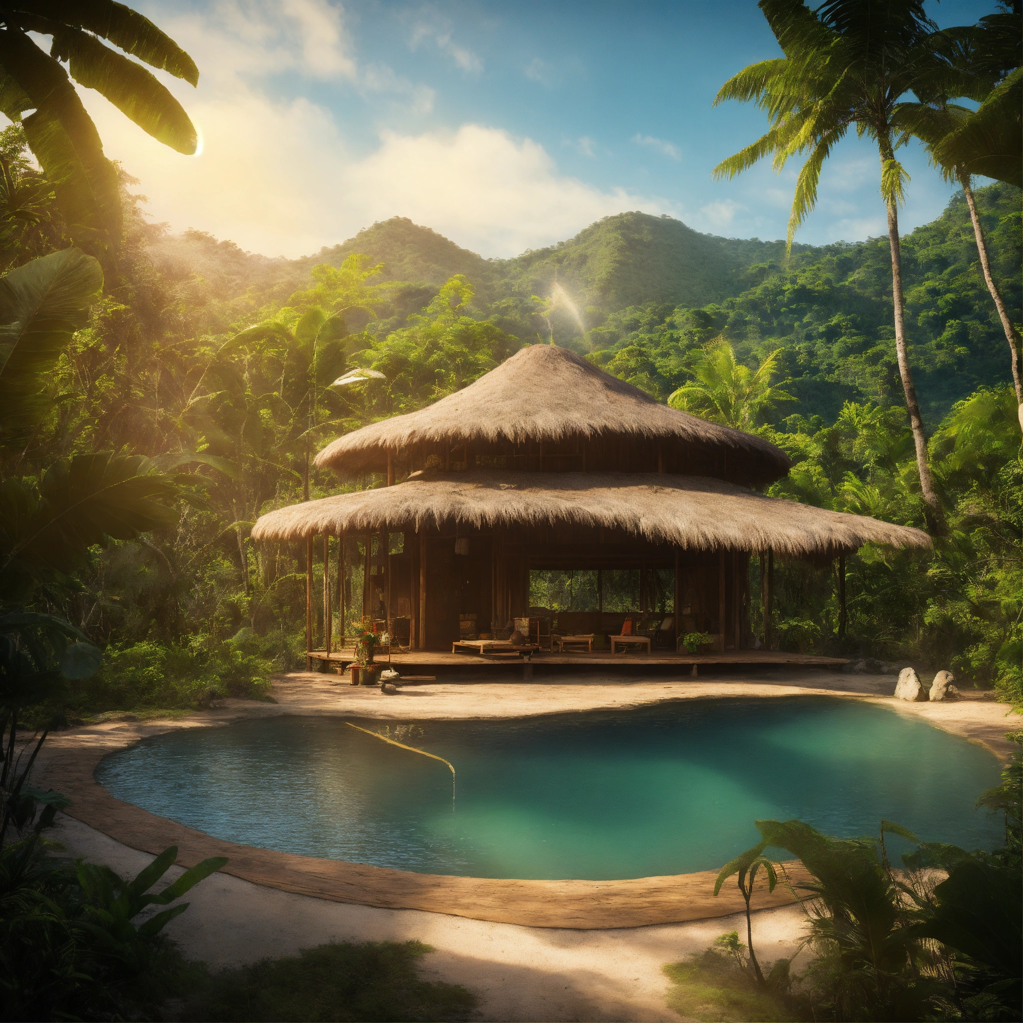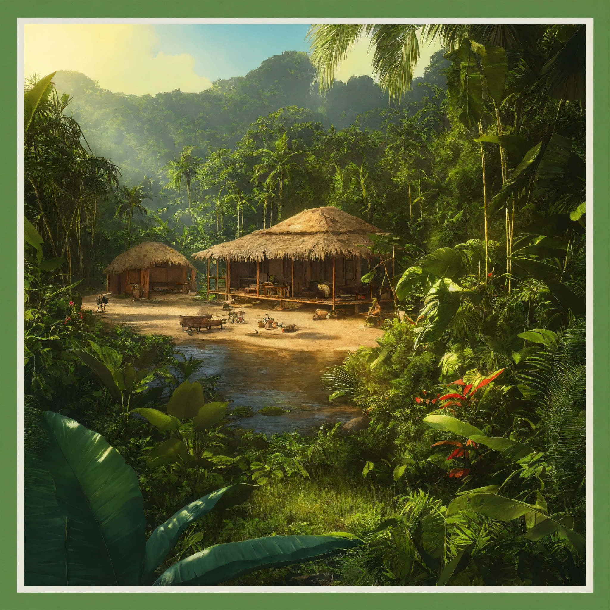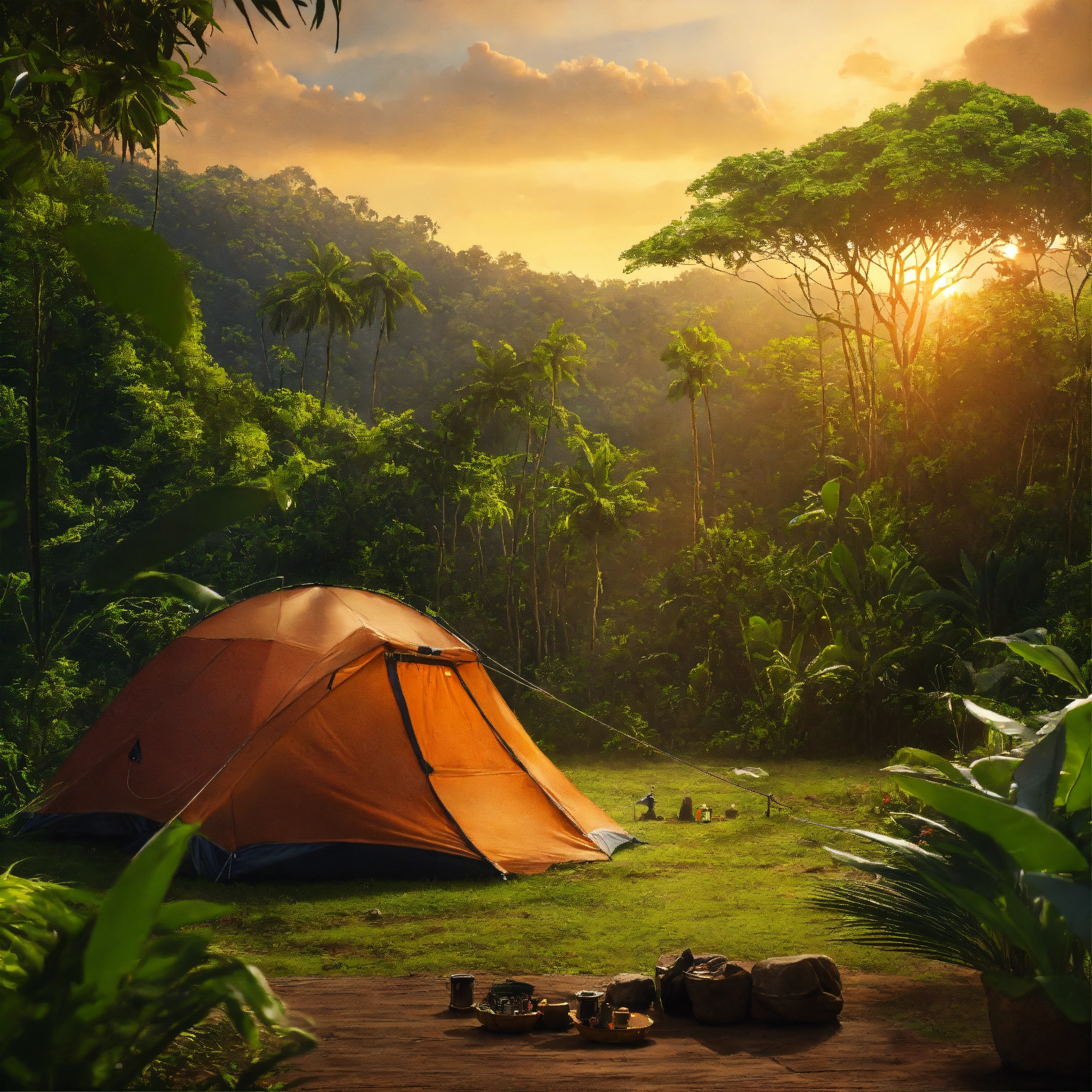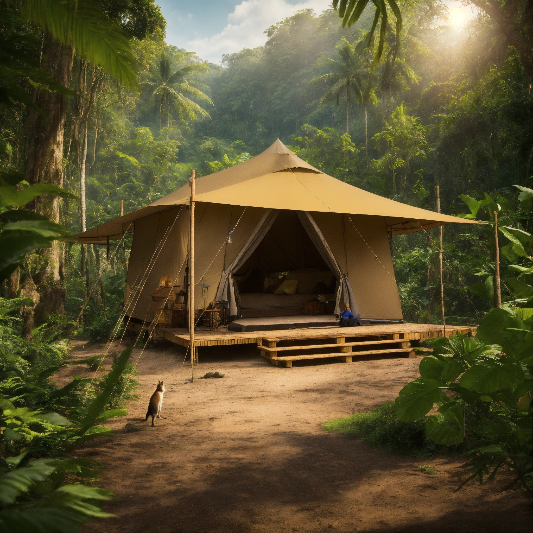 Plan américain explorateur de film d'animation biologiste de la faune sauvage, second plan camp d'explorateur, arrières plan jungle tropicale luxuriante