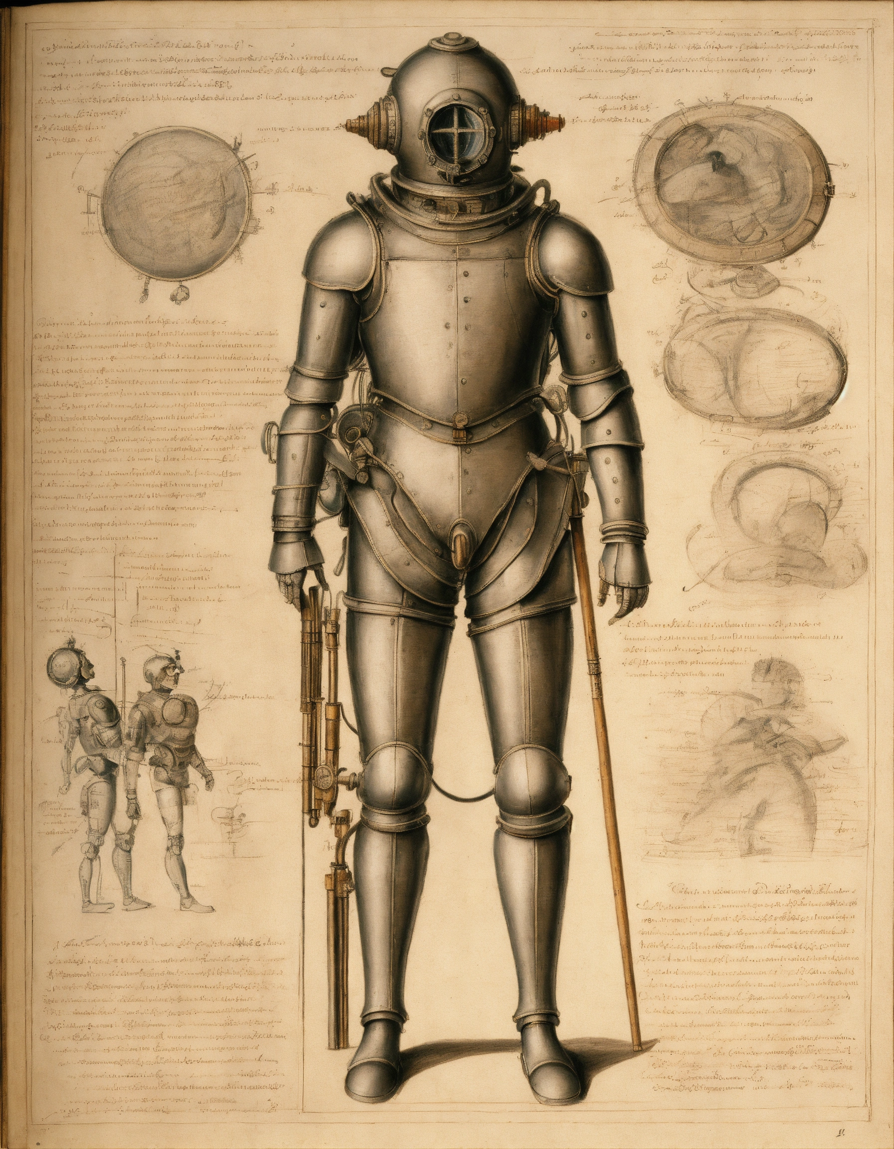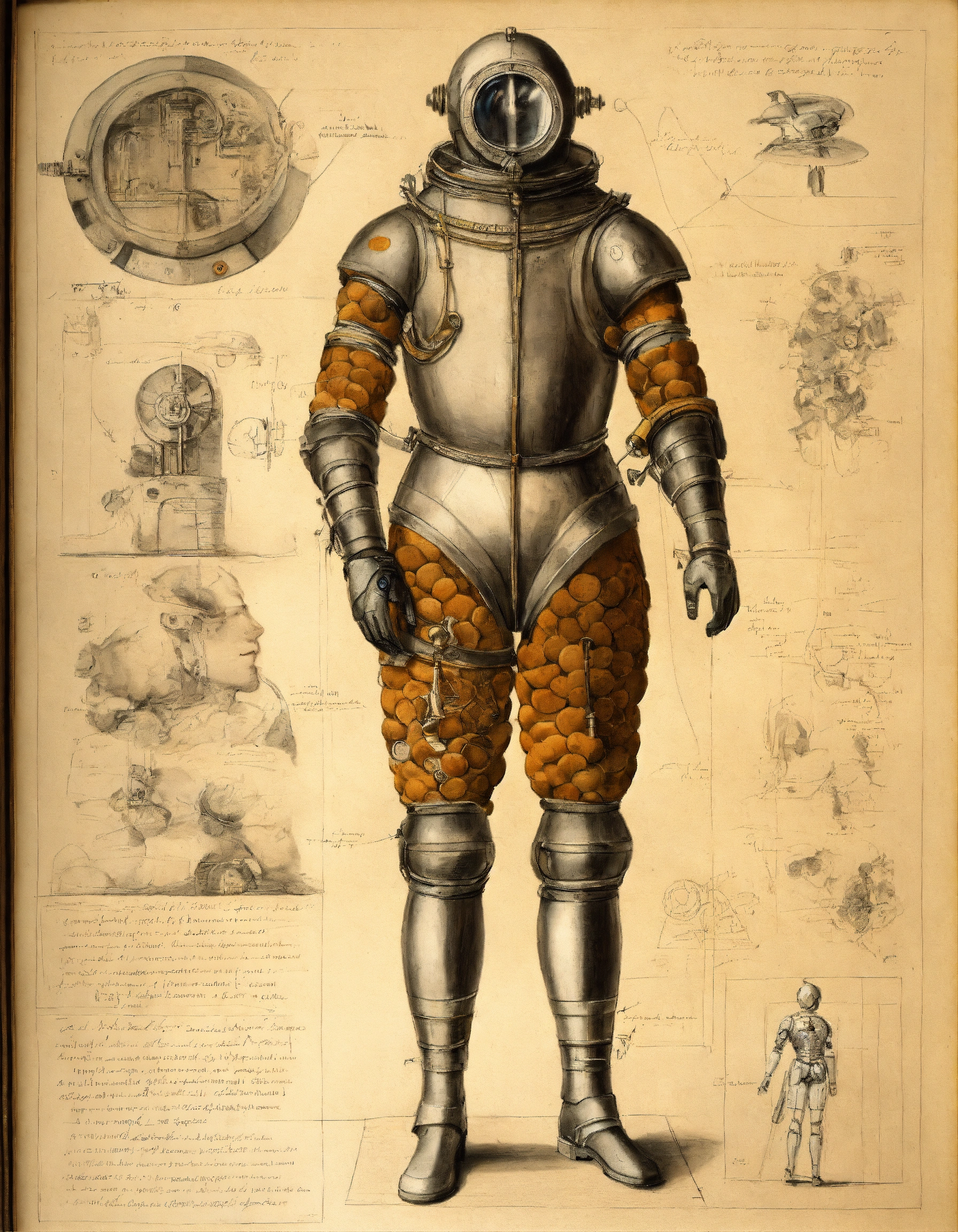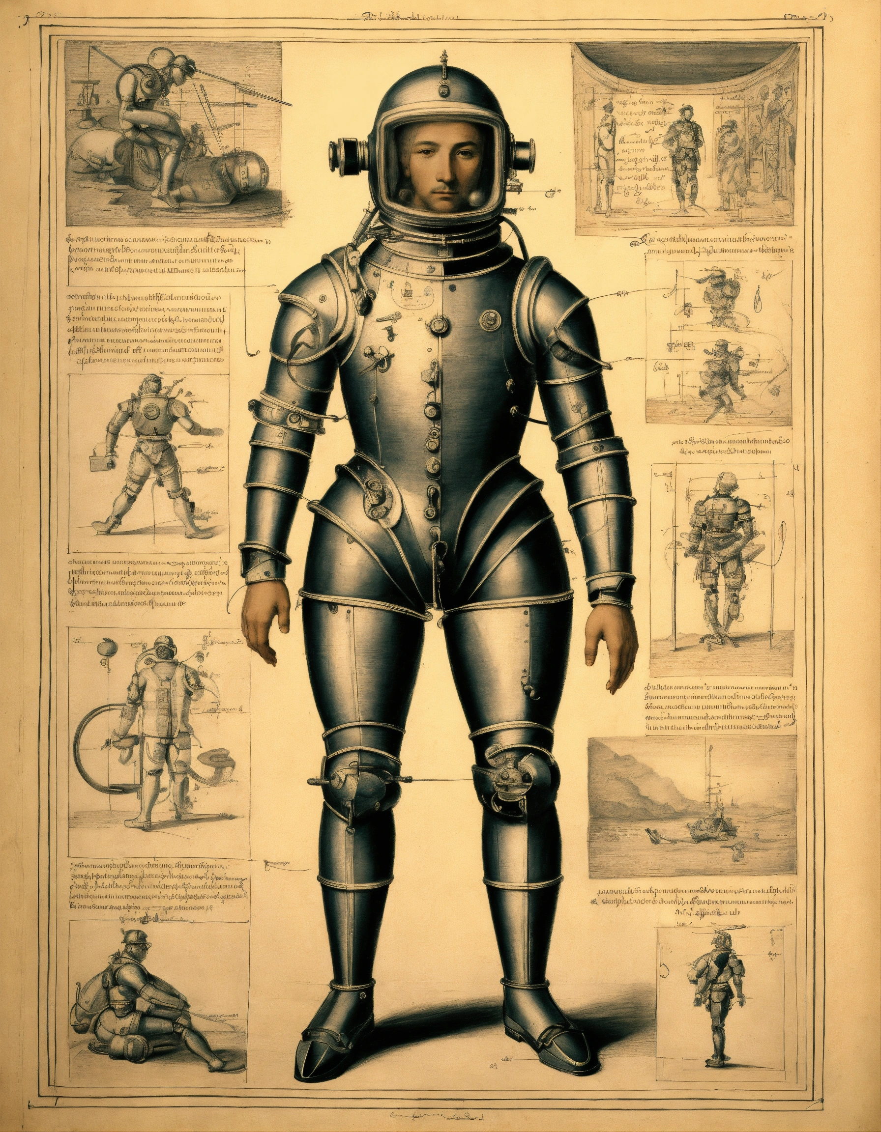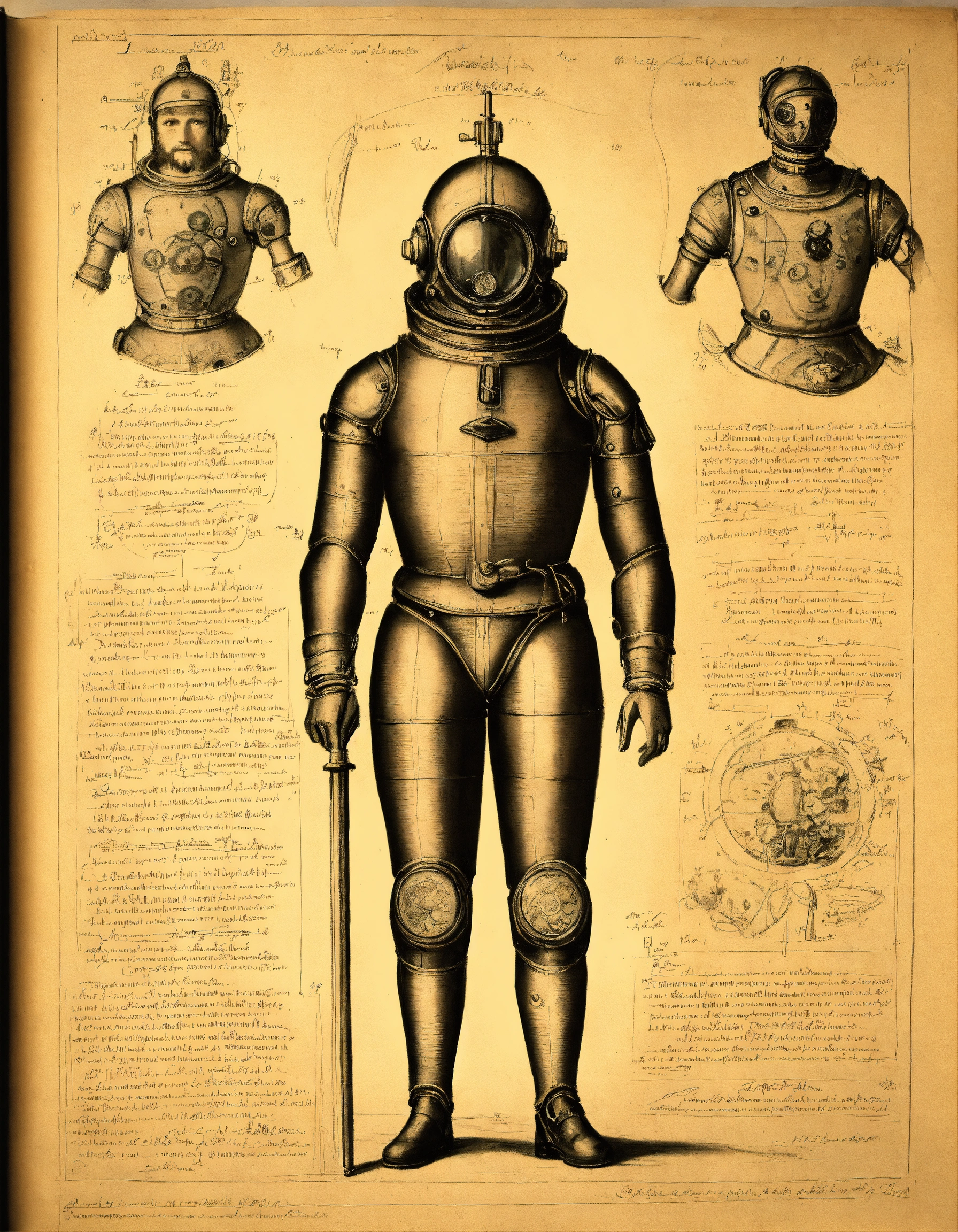 Drawing of a diver in a diving suitold (diver's suit), anatomical sketches of an automaton with artificial intelligence in the style of leonardo da vinci, notes and sketches in renaissance calligraphy, anatomically correct, detailed diagrams of a male cyborg, renaissance man