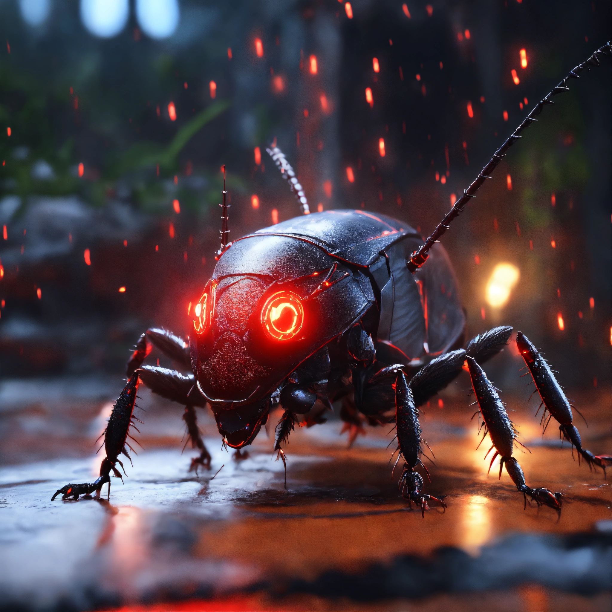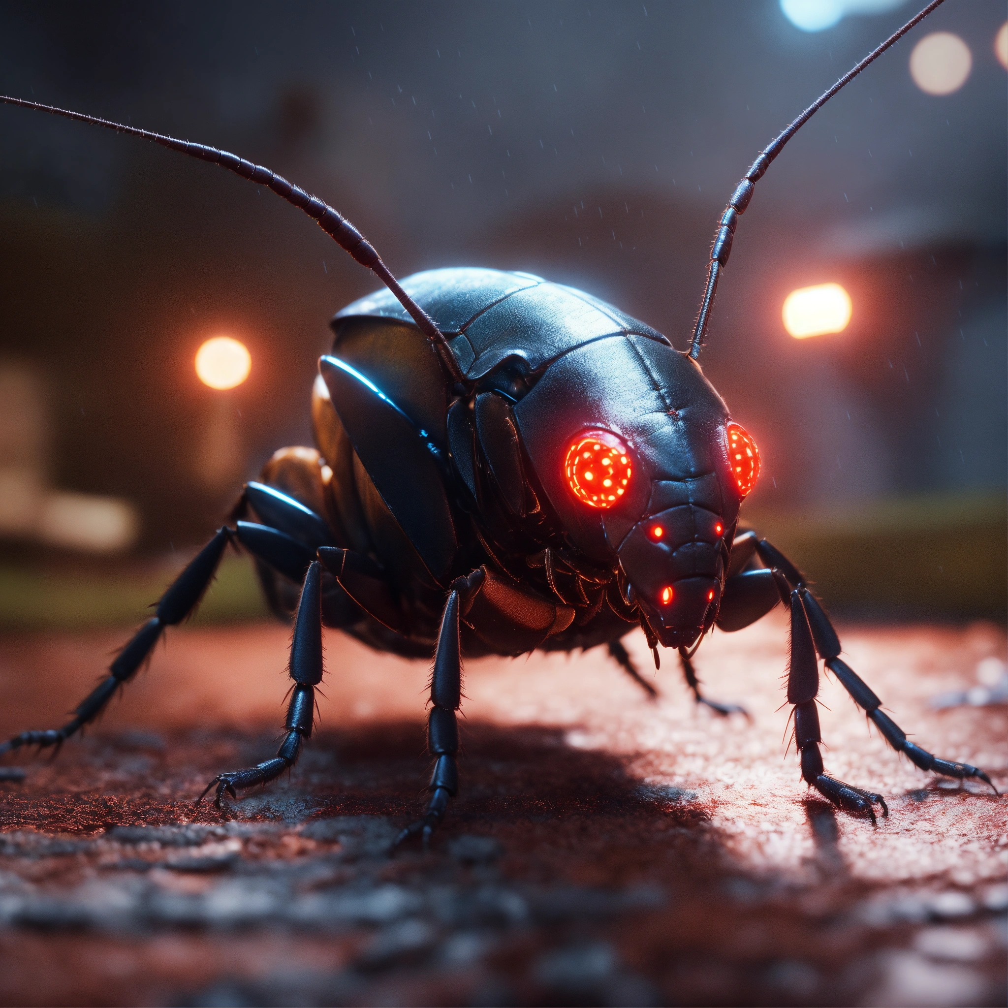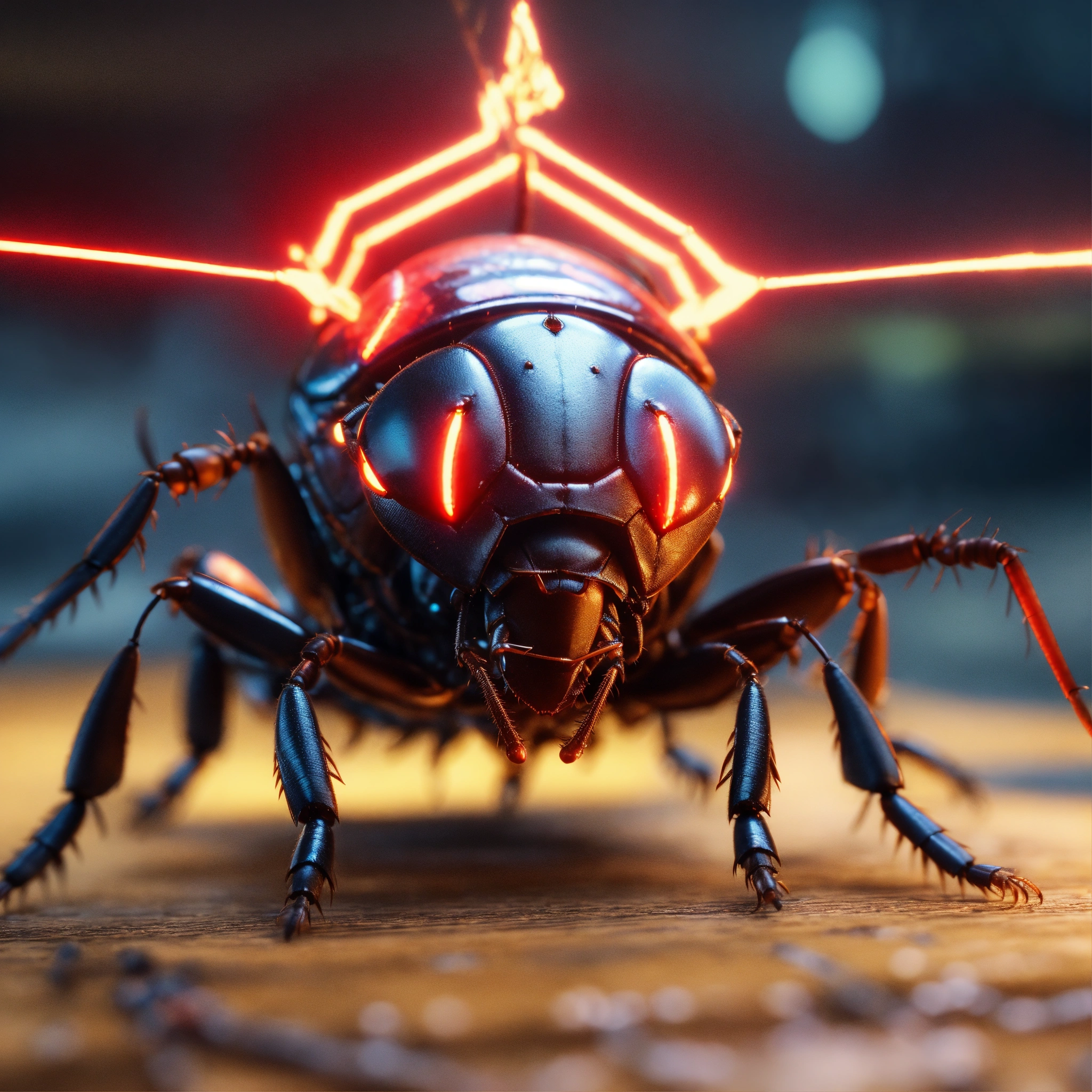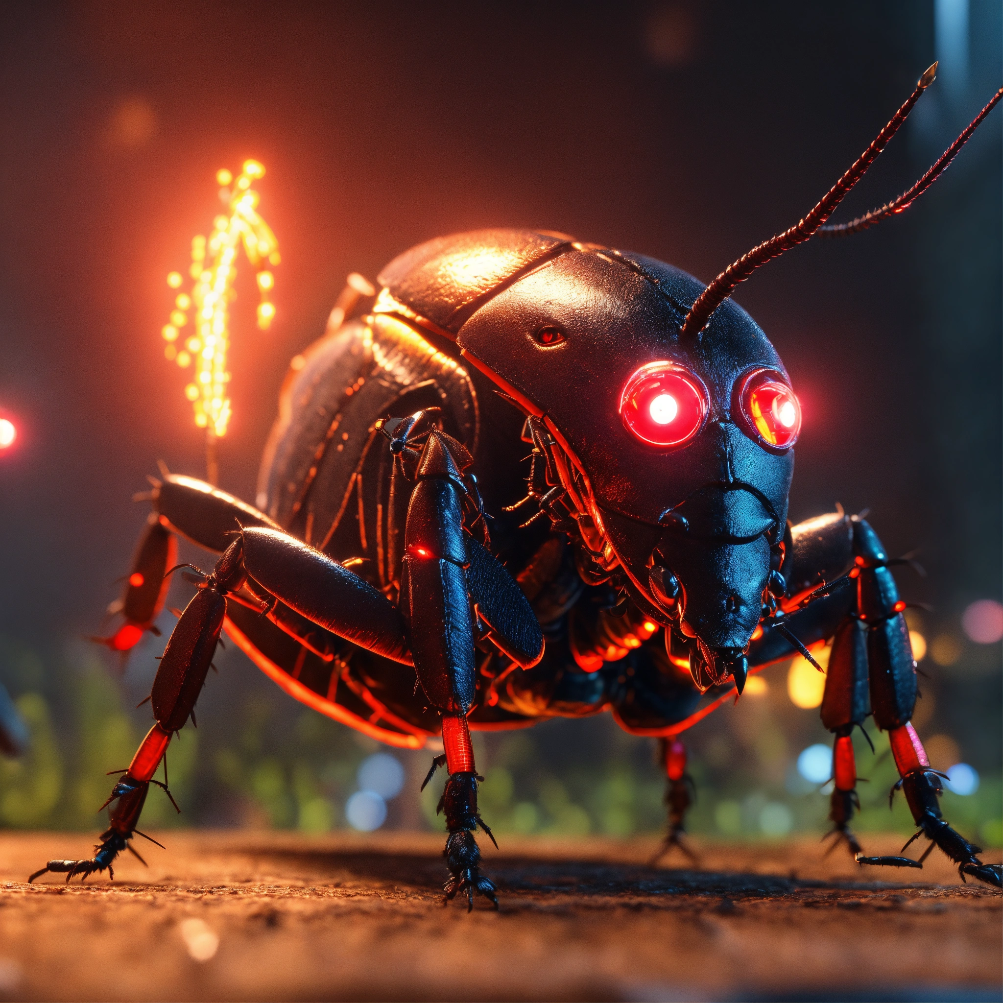 Clan of black cockroach faced humanoid with red glowing eyes, detailed circuit markings, standing up laughing and ready to attack, lightning bolts shoot from its antenna, realistic, 8k, pixar unreal engine