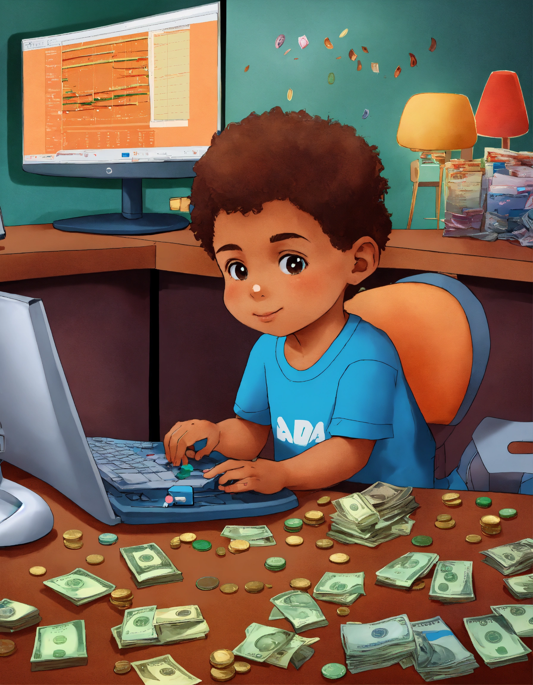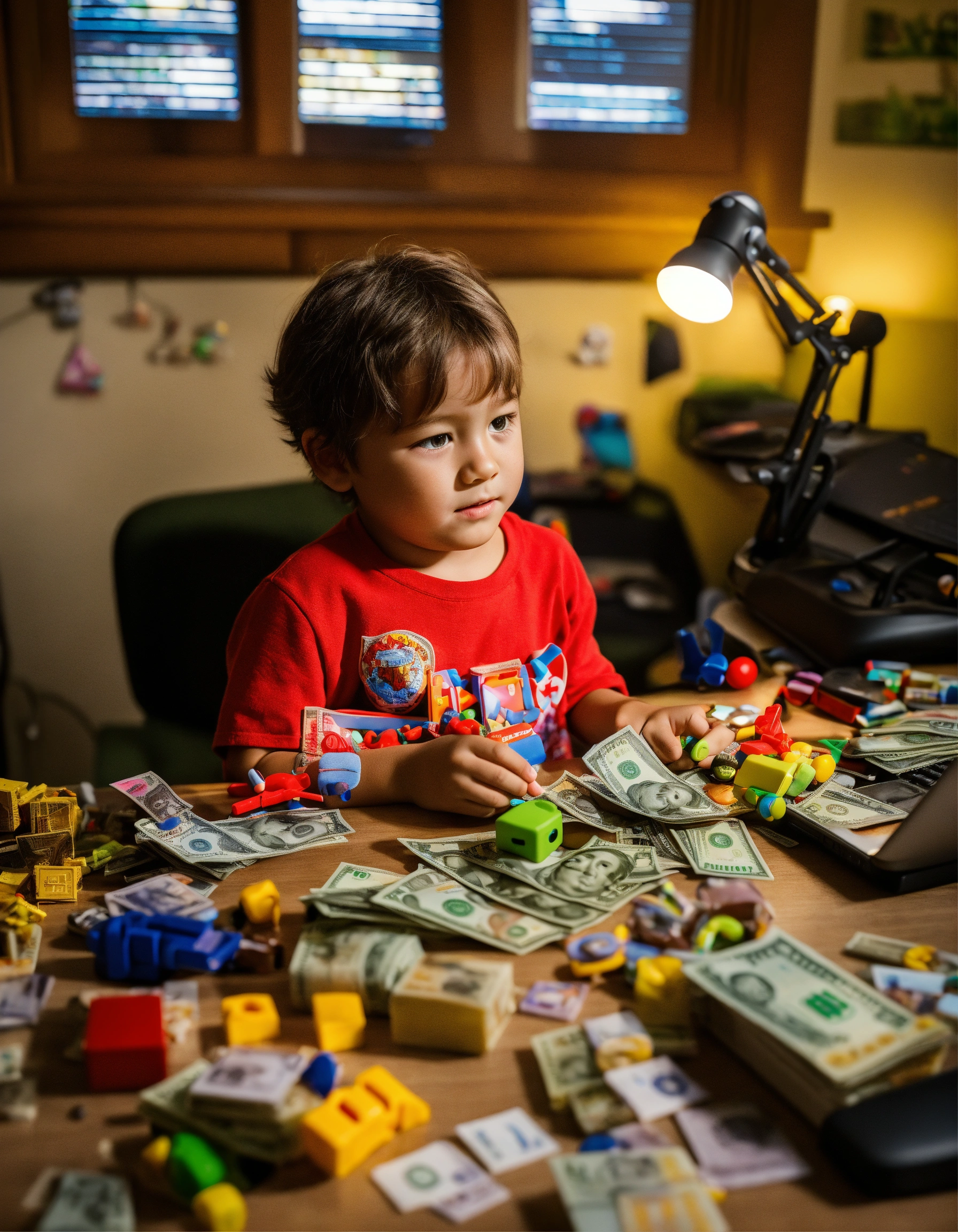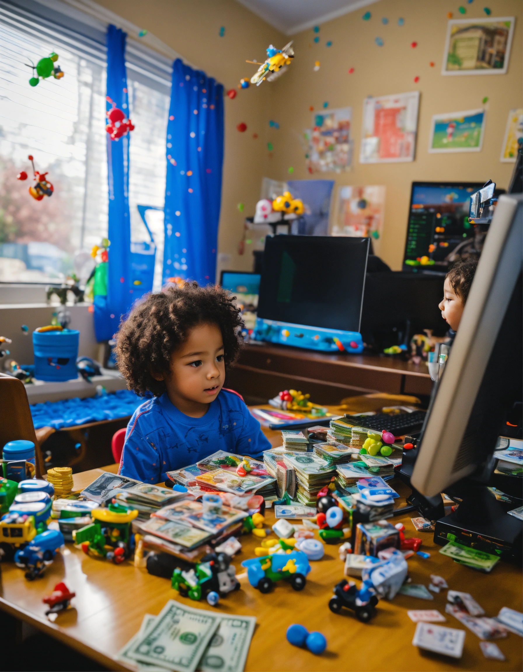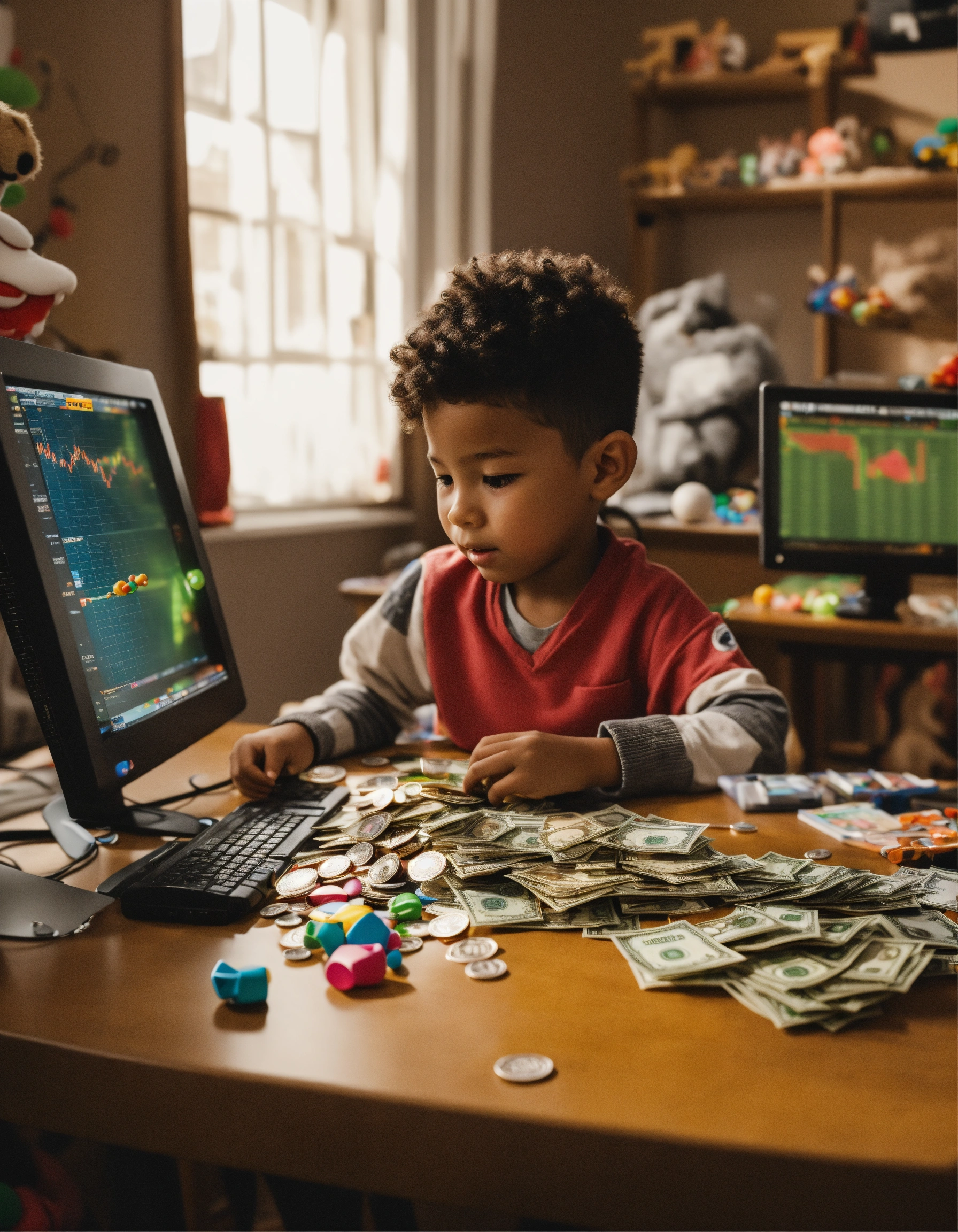 A child in front of the computer doing day trading operations with some toys scattered around and money on the table