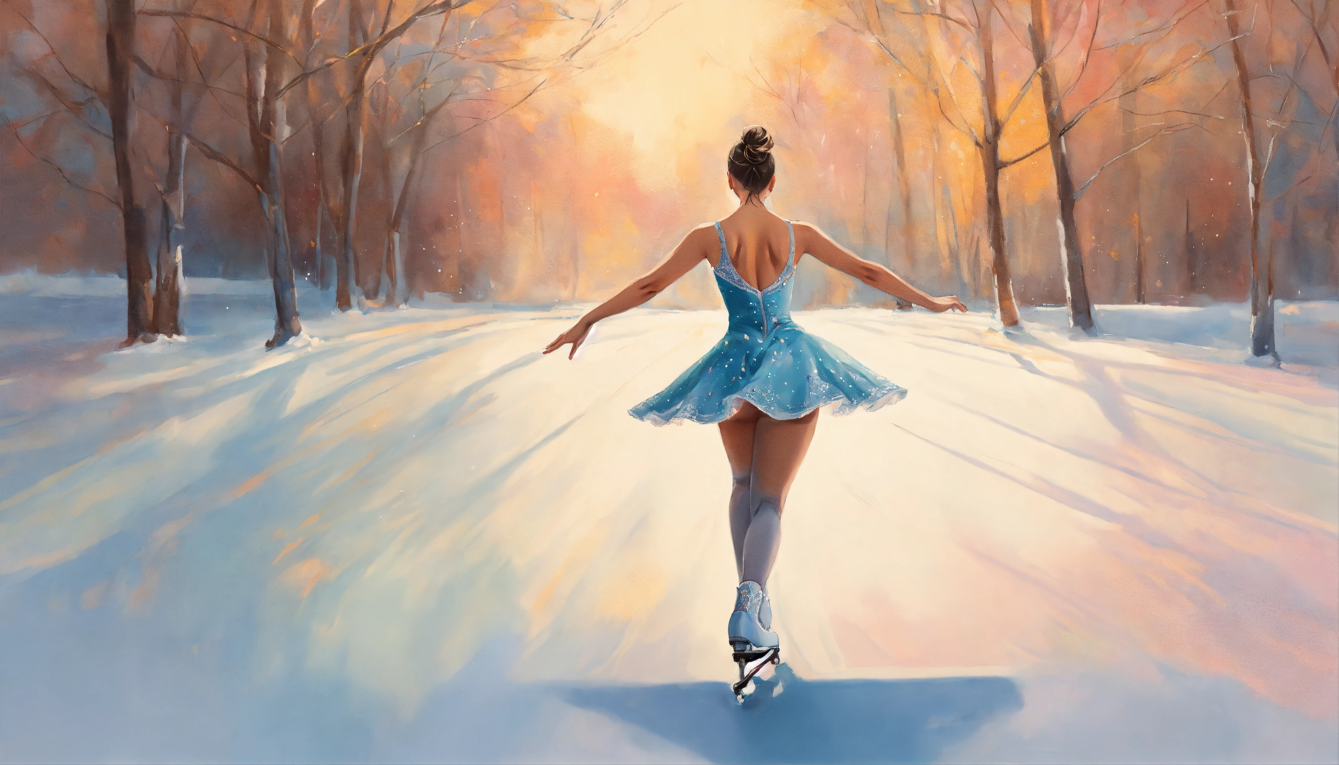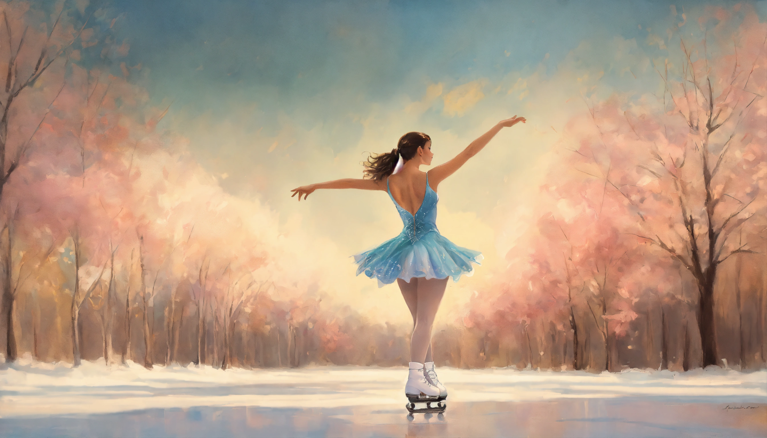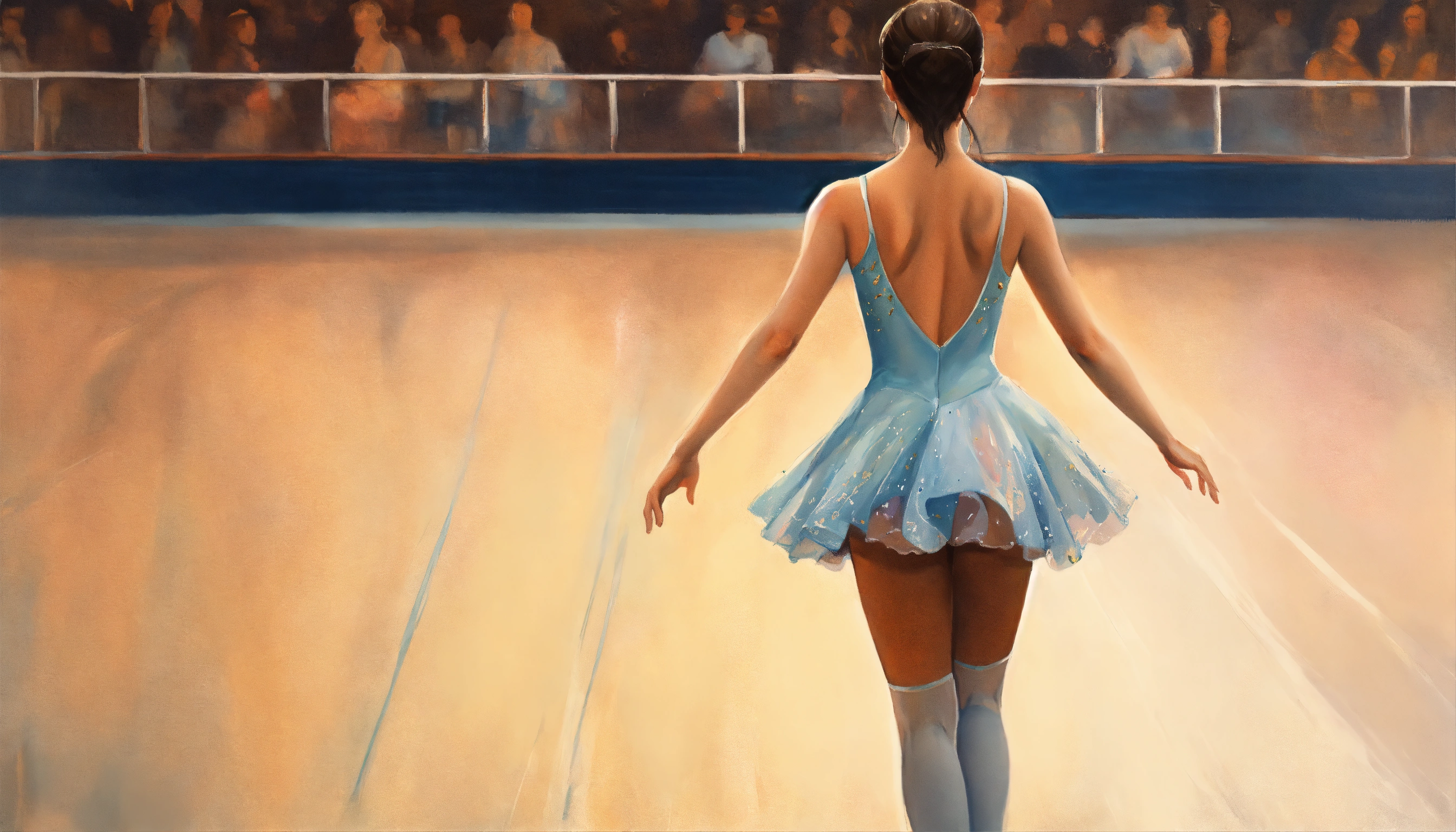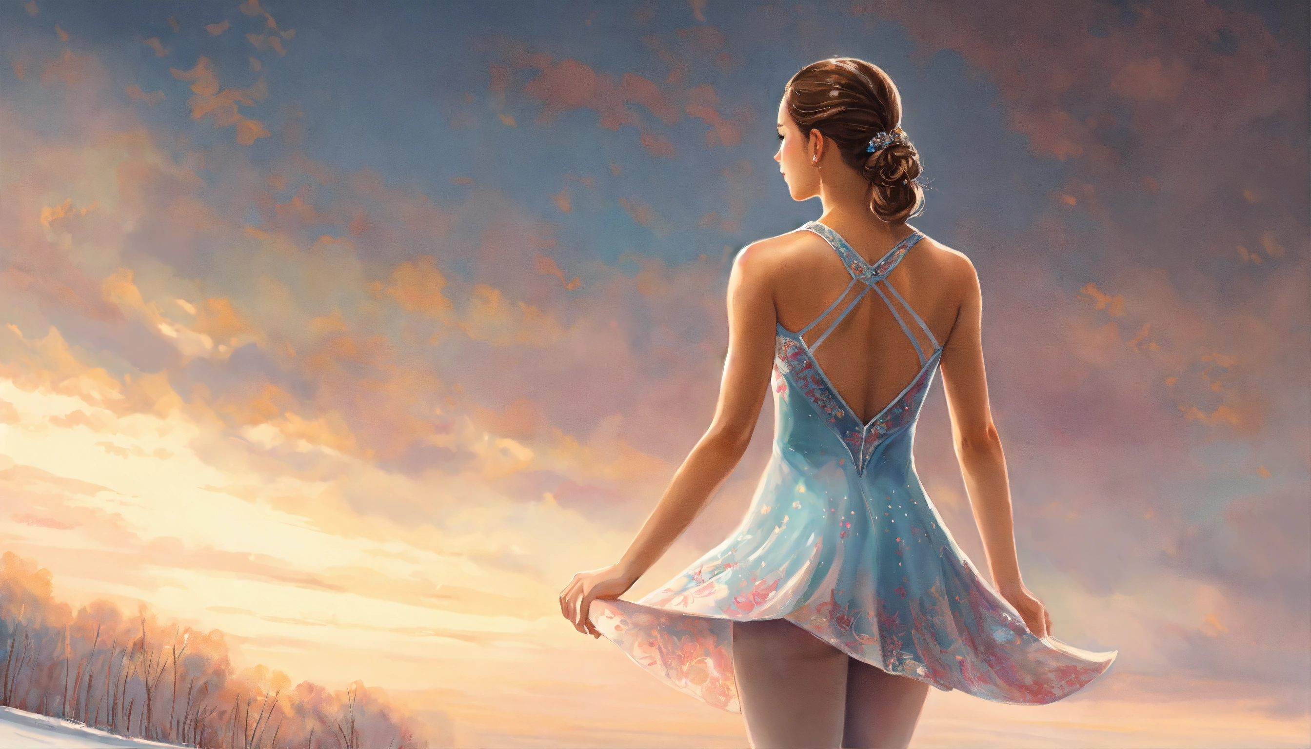 Painting of a young female figure skater from the back wearing a detailed skate dress, soft colors, wide angle