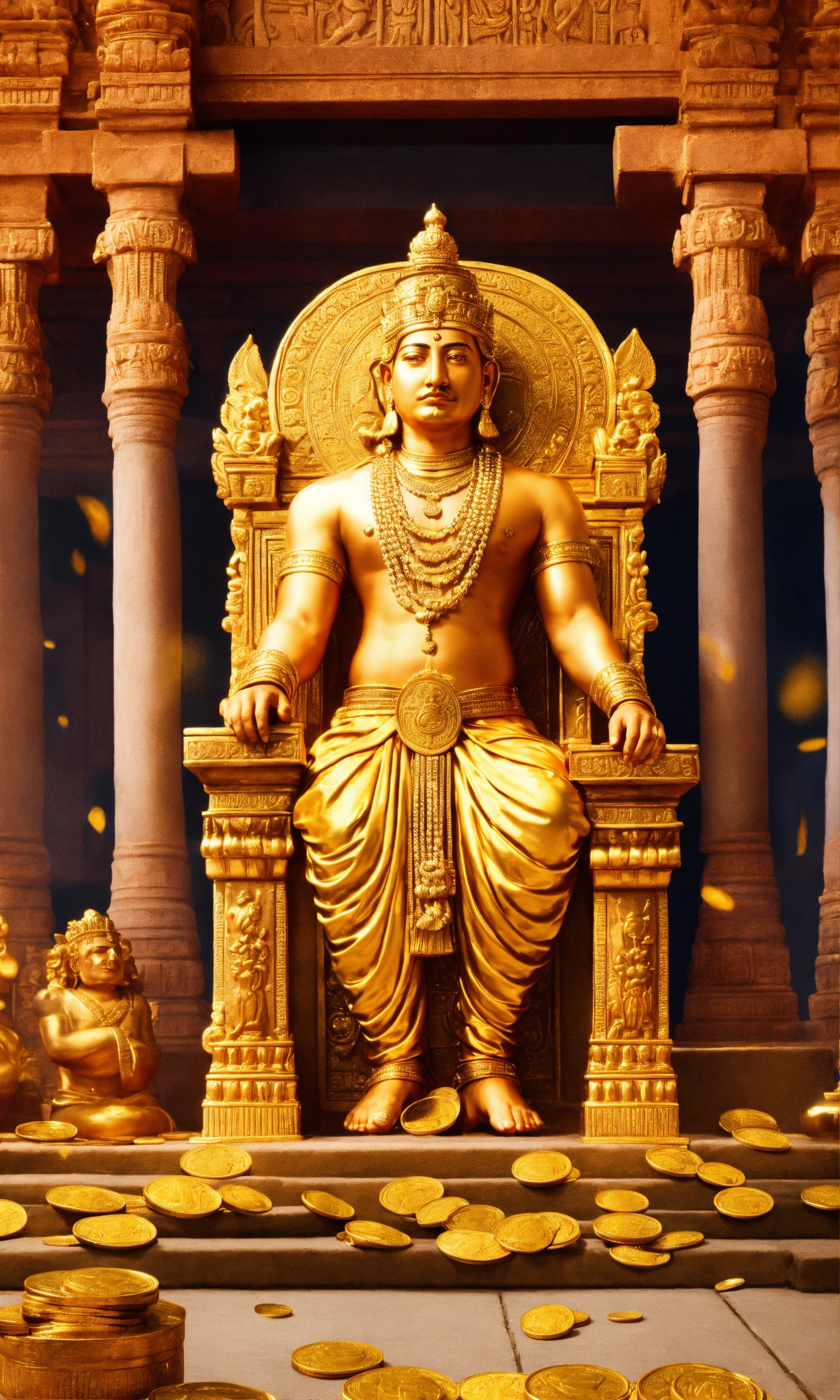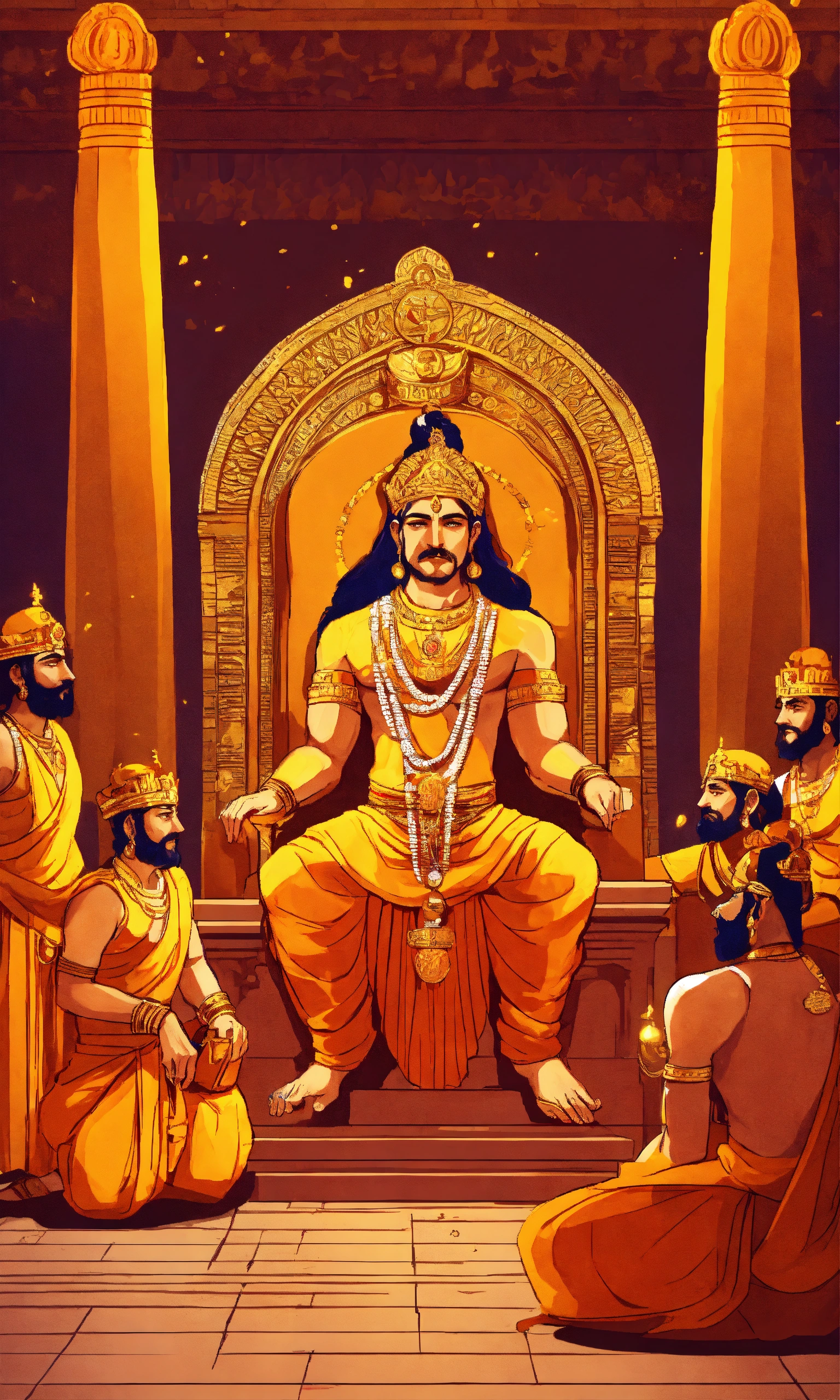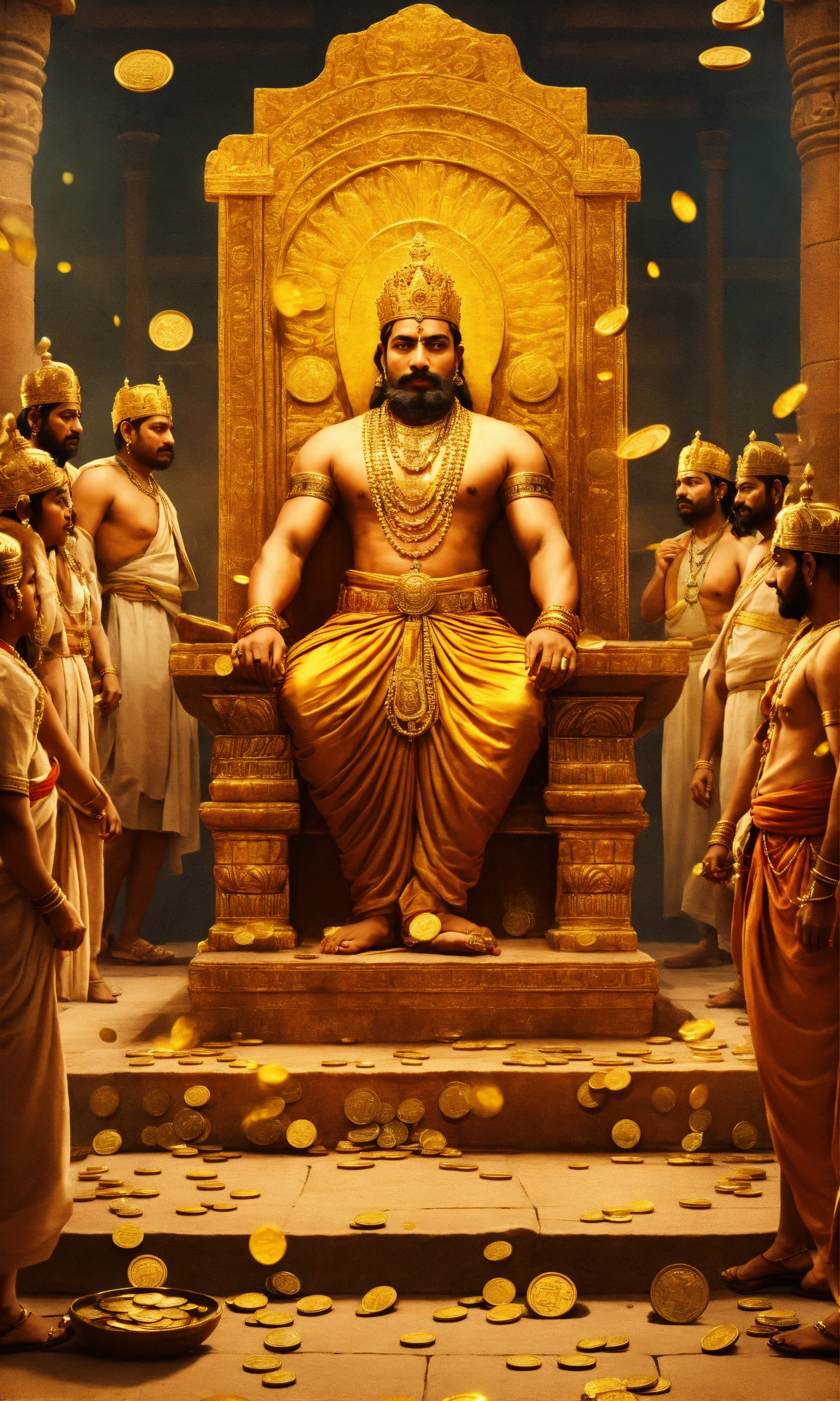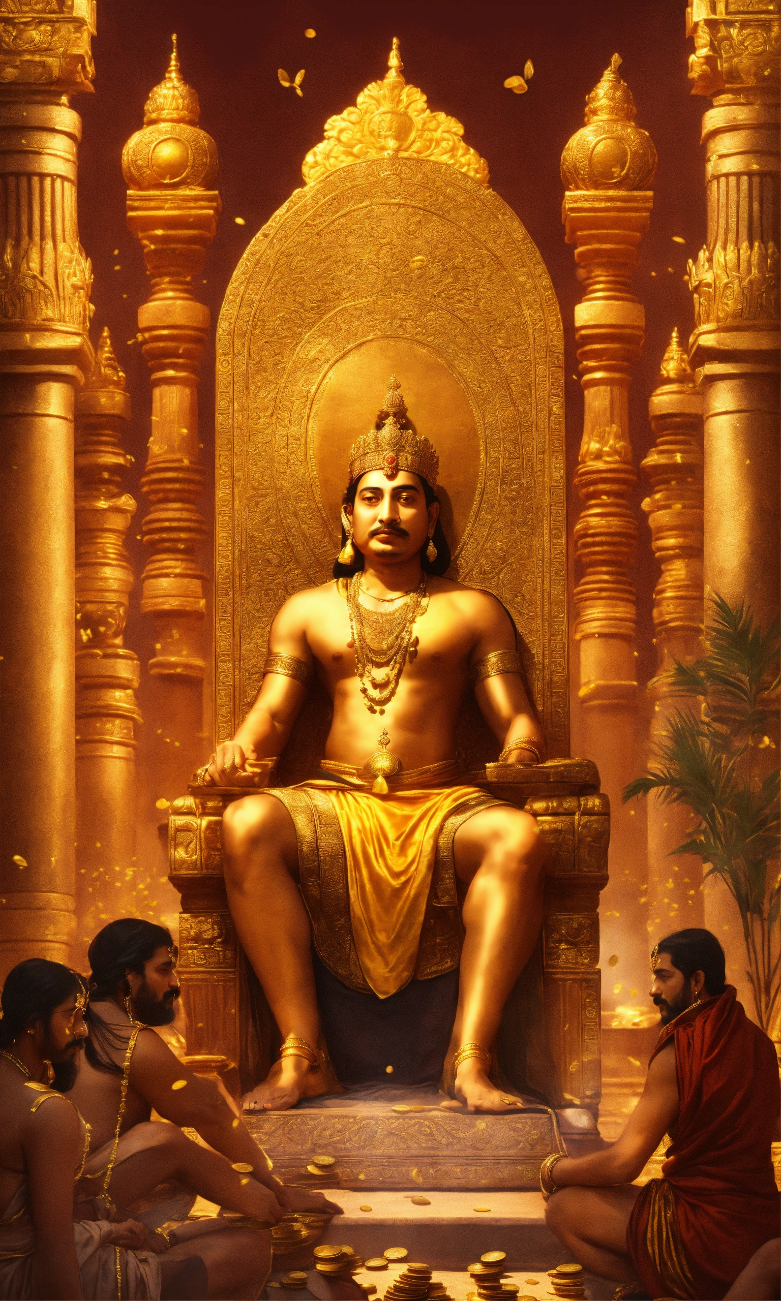 Ancient chola dynasty king sitting on throne in his court and poets in court are sitting and some standing, lots of gold coins spread on land infront of king
