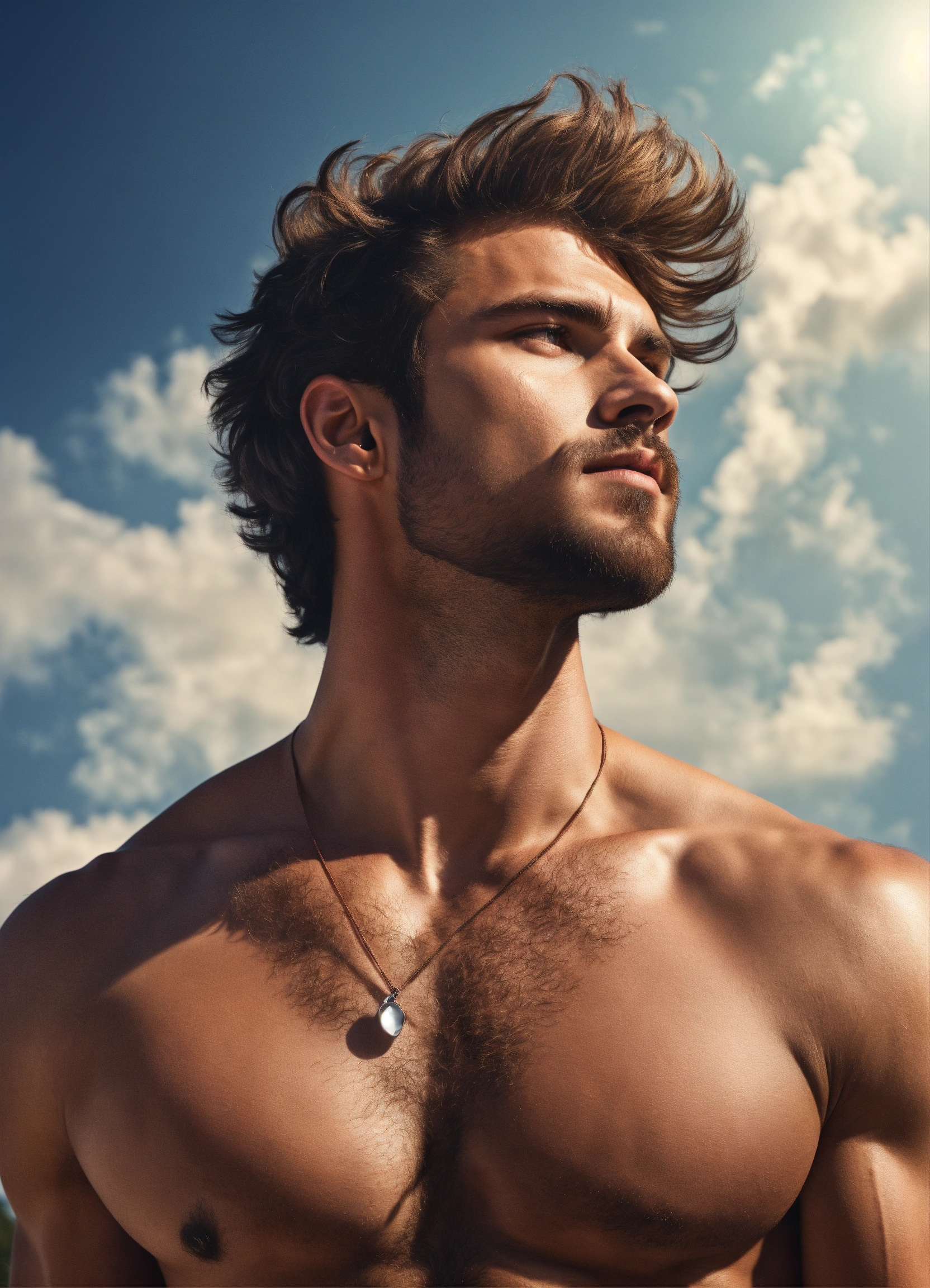 Gorgeous well built guy, open shirt, hairy chest, looking up at the skies, 4k resolution, photo realistic image