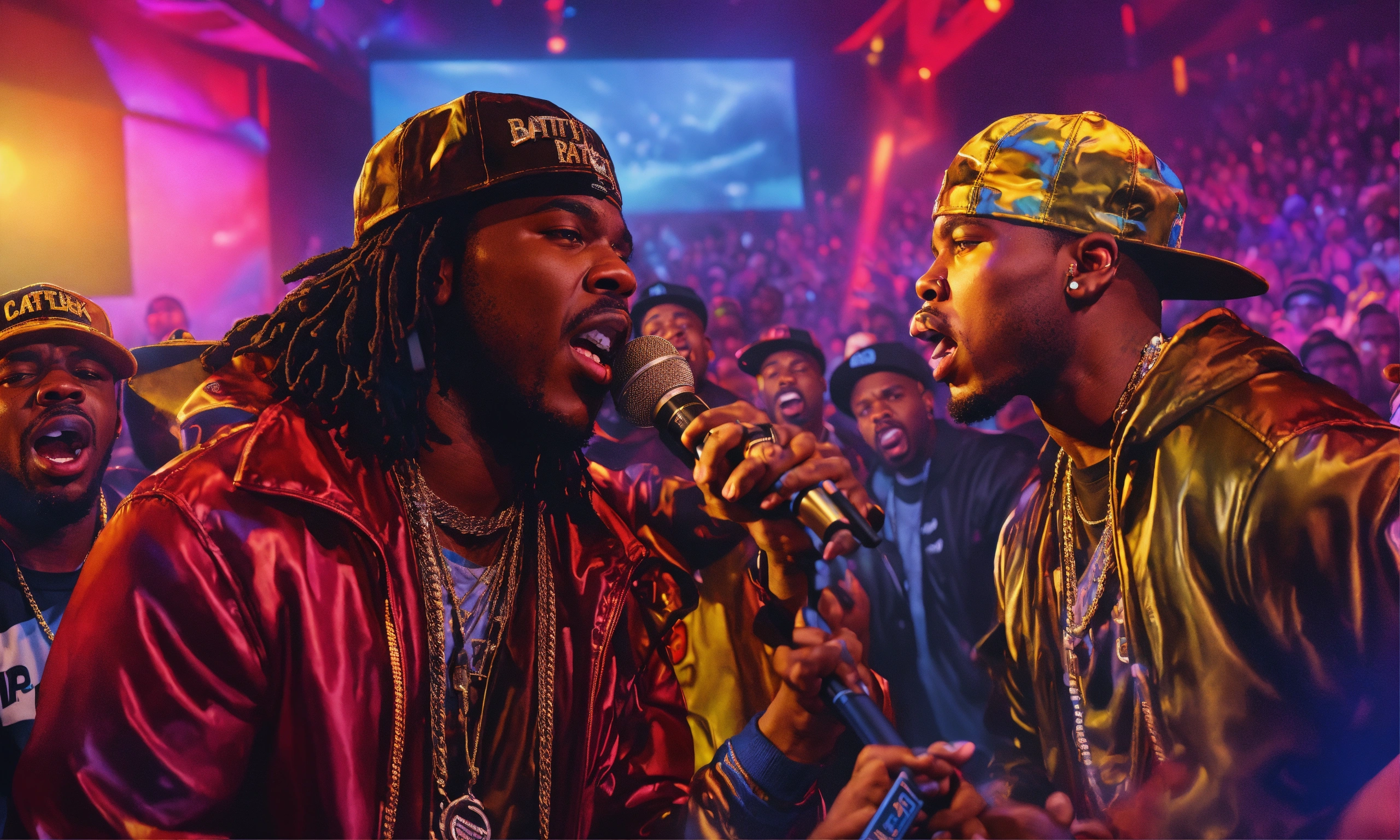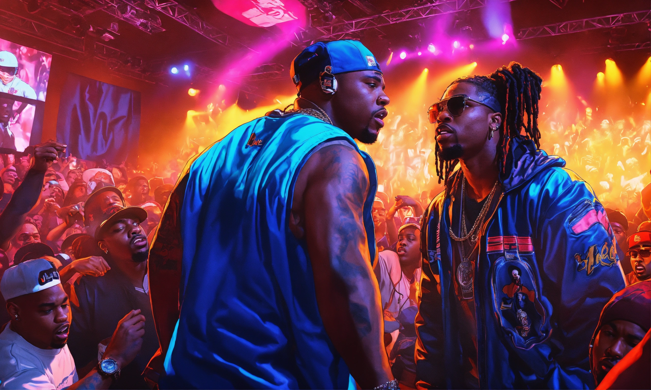 Pop art, hyperrealist portrait of battle rapper "geechi gotti " vs " eazy the block captain" in a url rap battle league rapper "remy ma in the middle judging the battle battling another rapper on stage cheering in background, fancy interior fantasy art, photo realistic, dynamic lighting, art station, poster, volumetric lighting, very detailed faces, 4 k, award winning