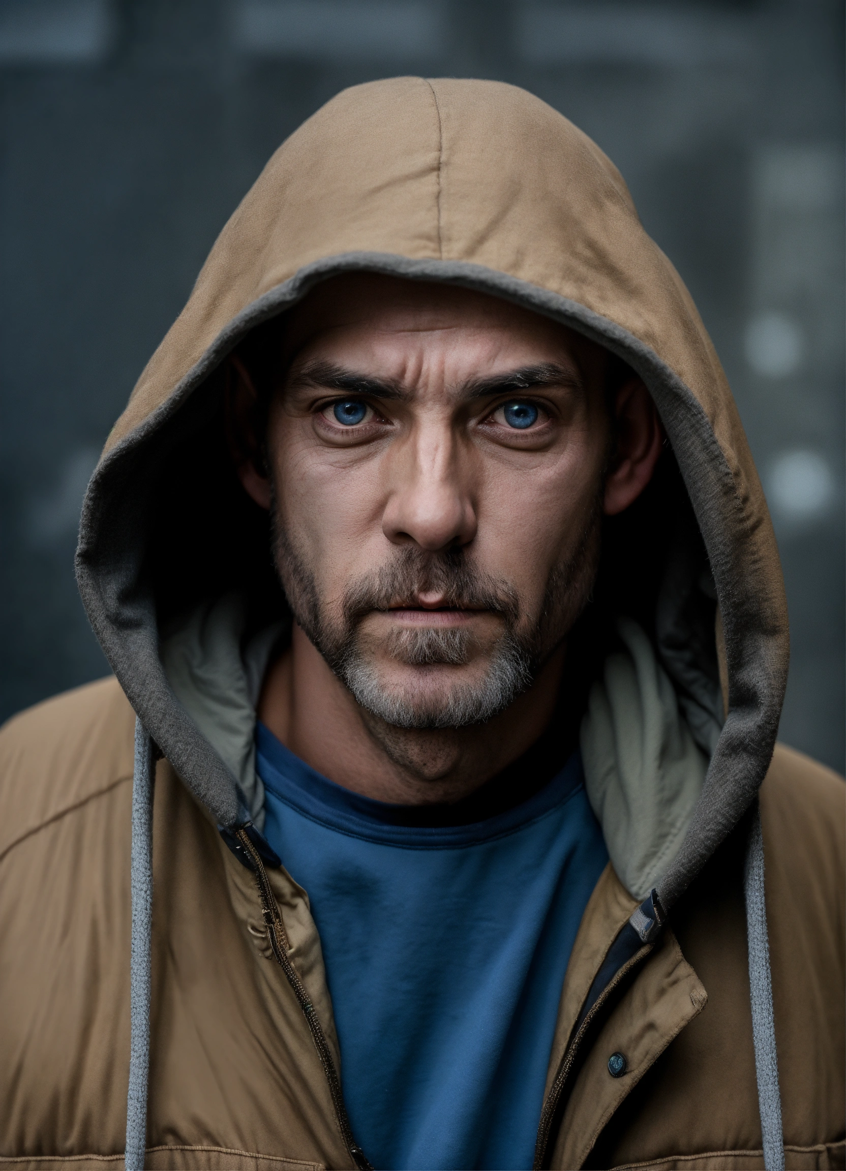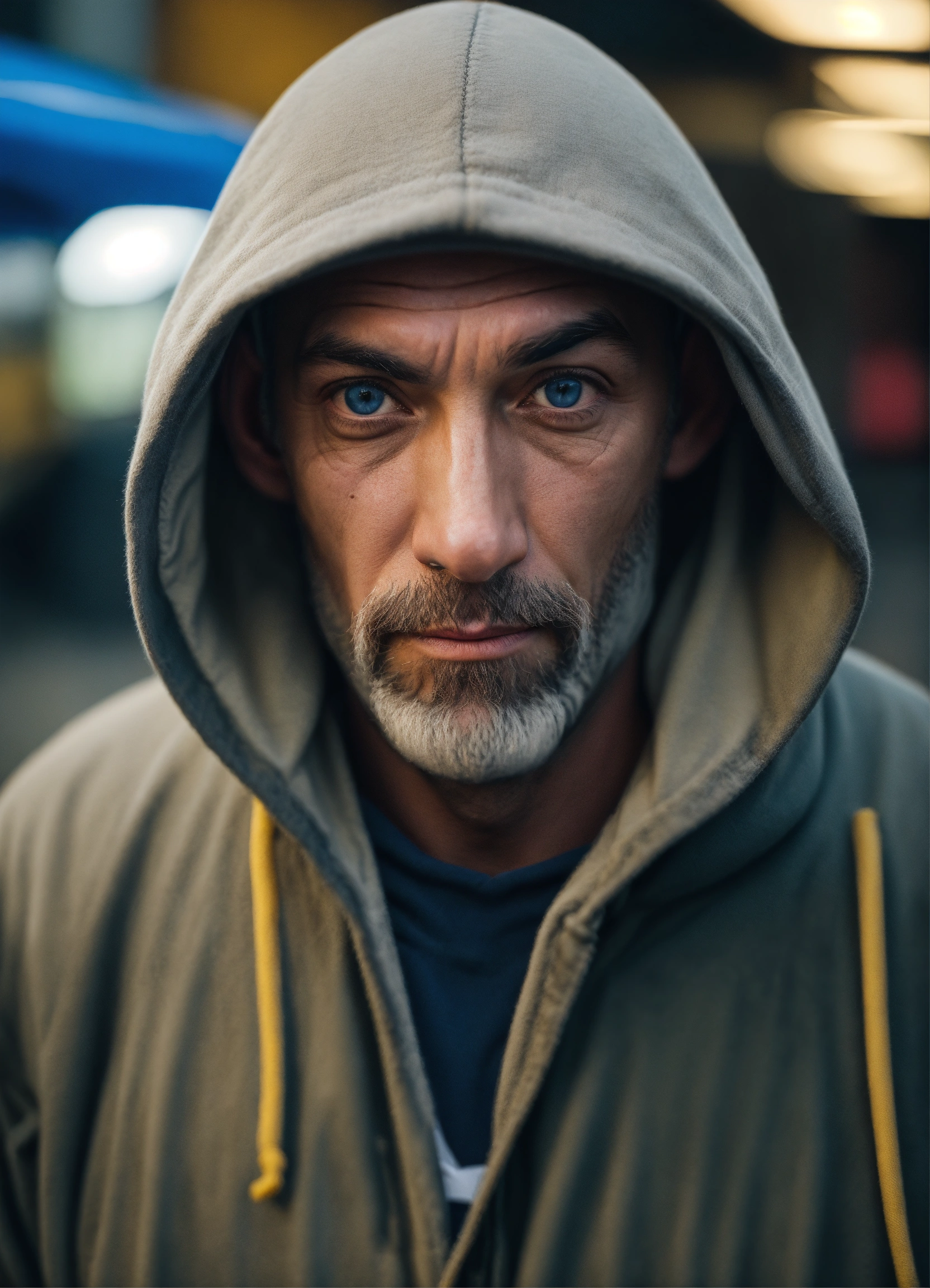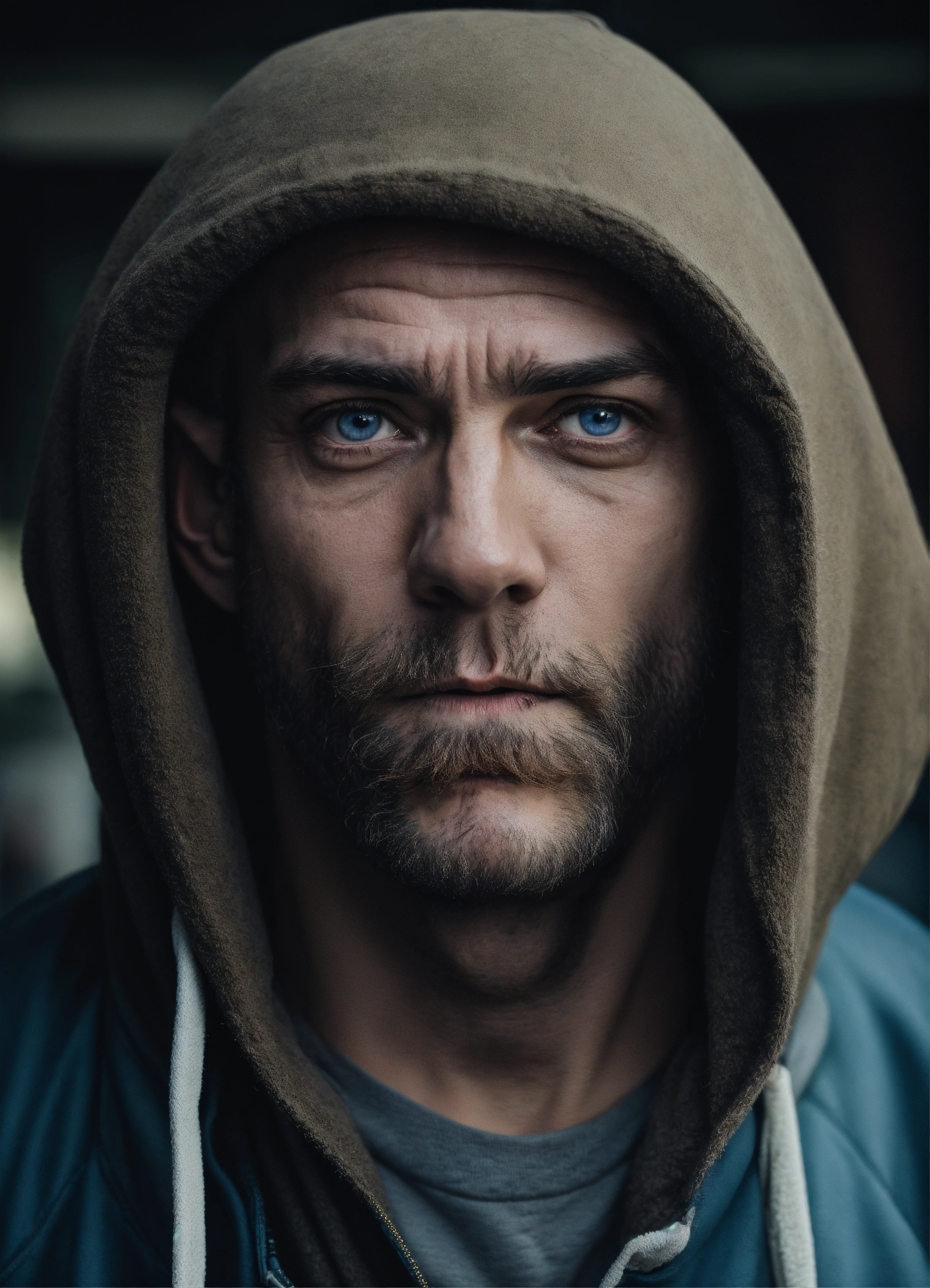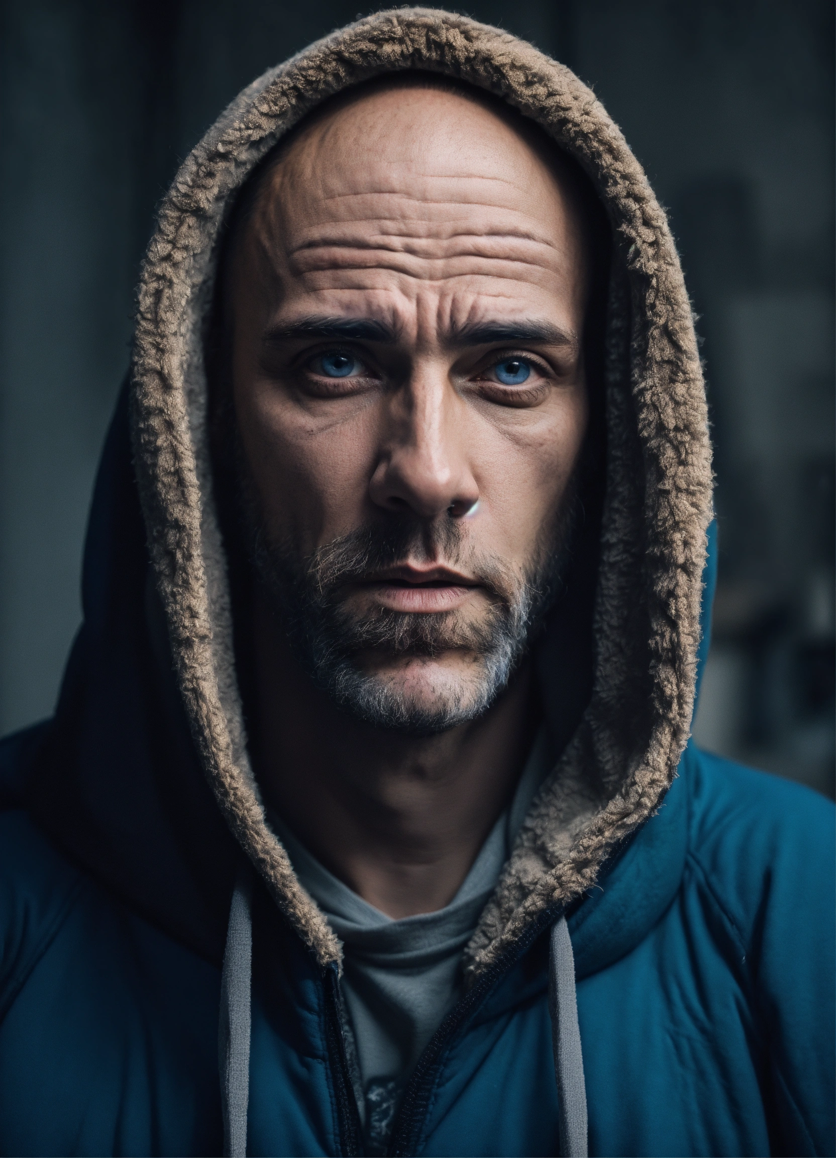 A huge bald homeless man, extended protruding brow forehead, blue-grey eyes, crooked mouth, large ears, wearing a hoodie up over his head
