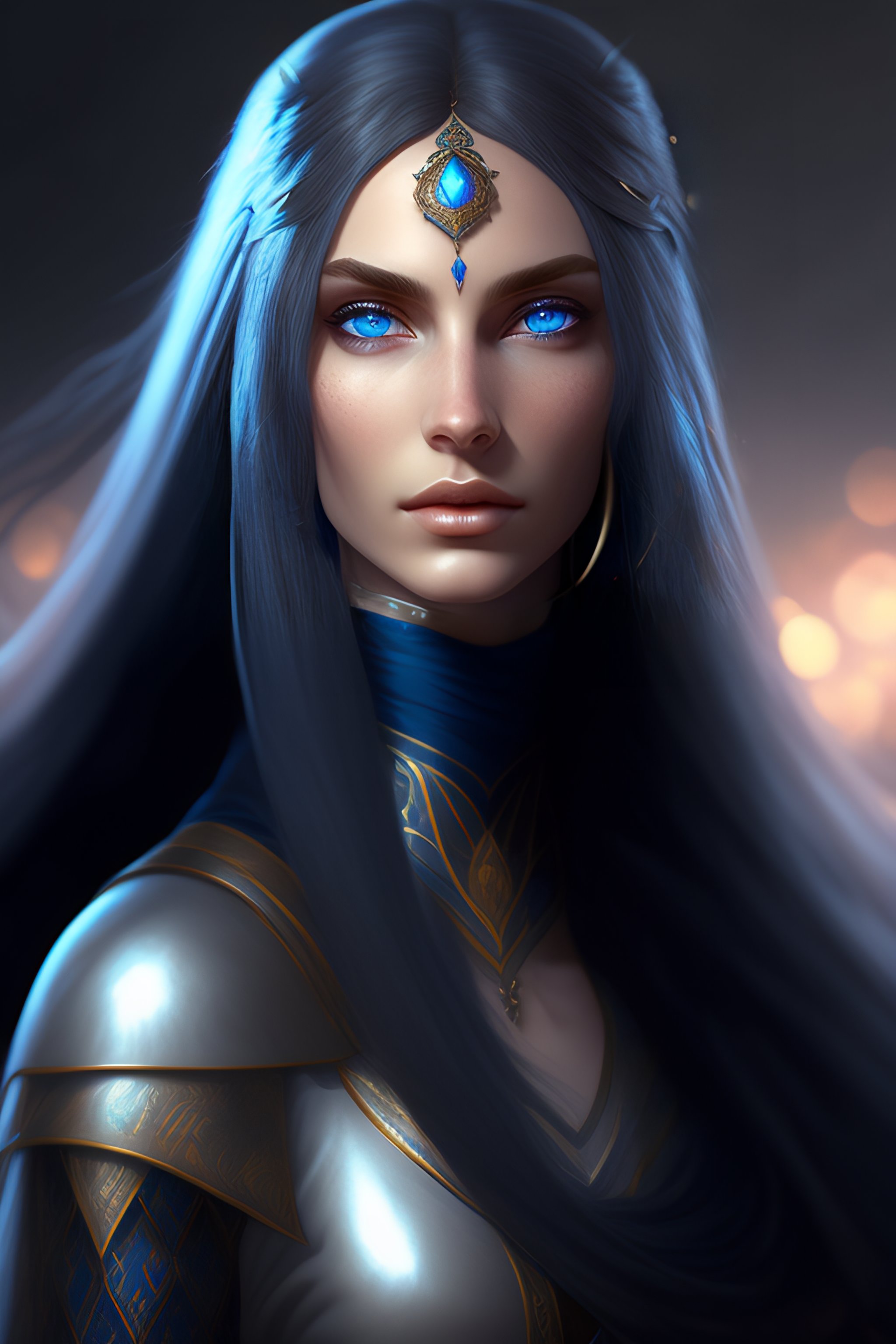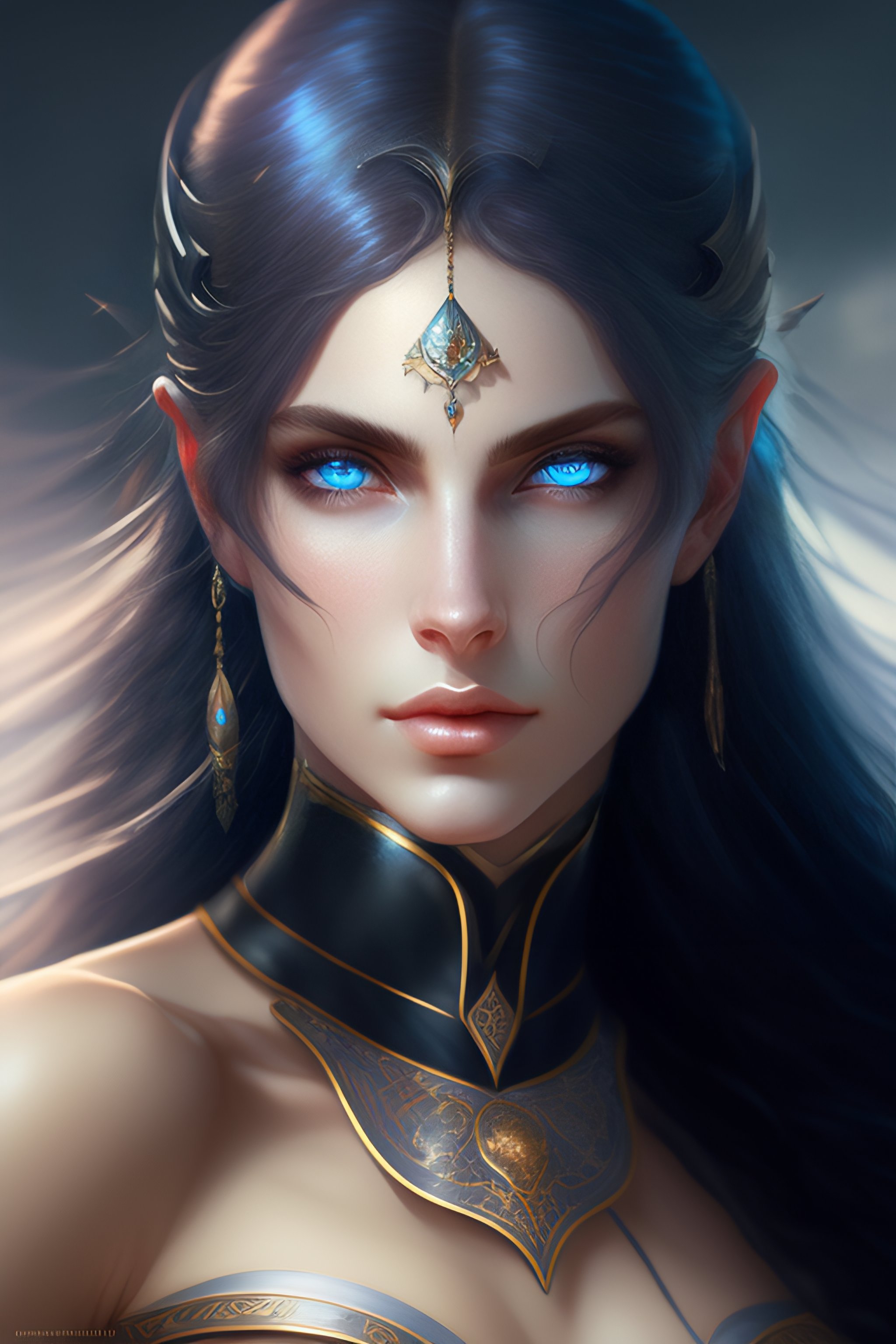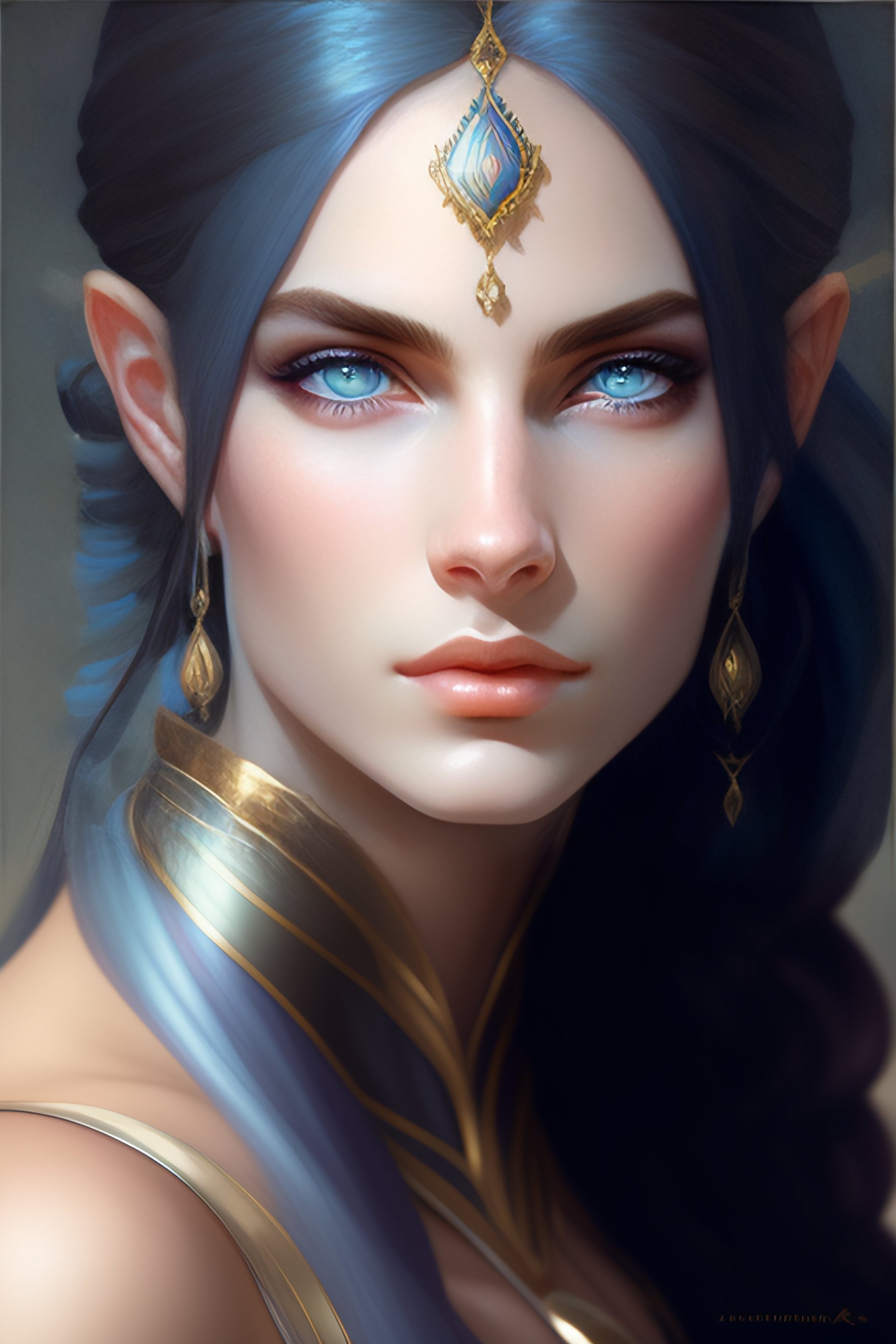 Portrait of beautiful dark elf girl, pale blue eyes, eyeshine, headshot, pale skin, 4k, rule of thirds, extreme detail, detailed drawing, trending artstation, hd, fantasy, d&d, realistic lighting, by alphonse mucha, greg rutkowski, sharp focus, backlit, symmetrical features, rule of thirds, black straight hair