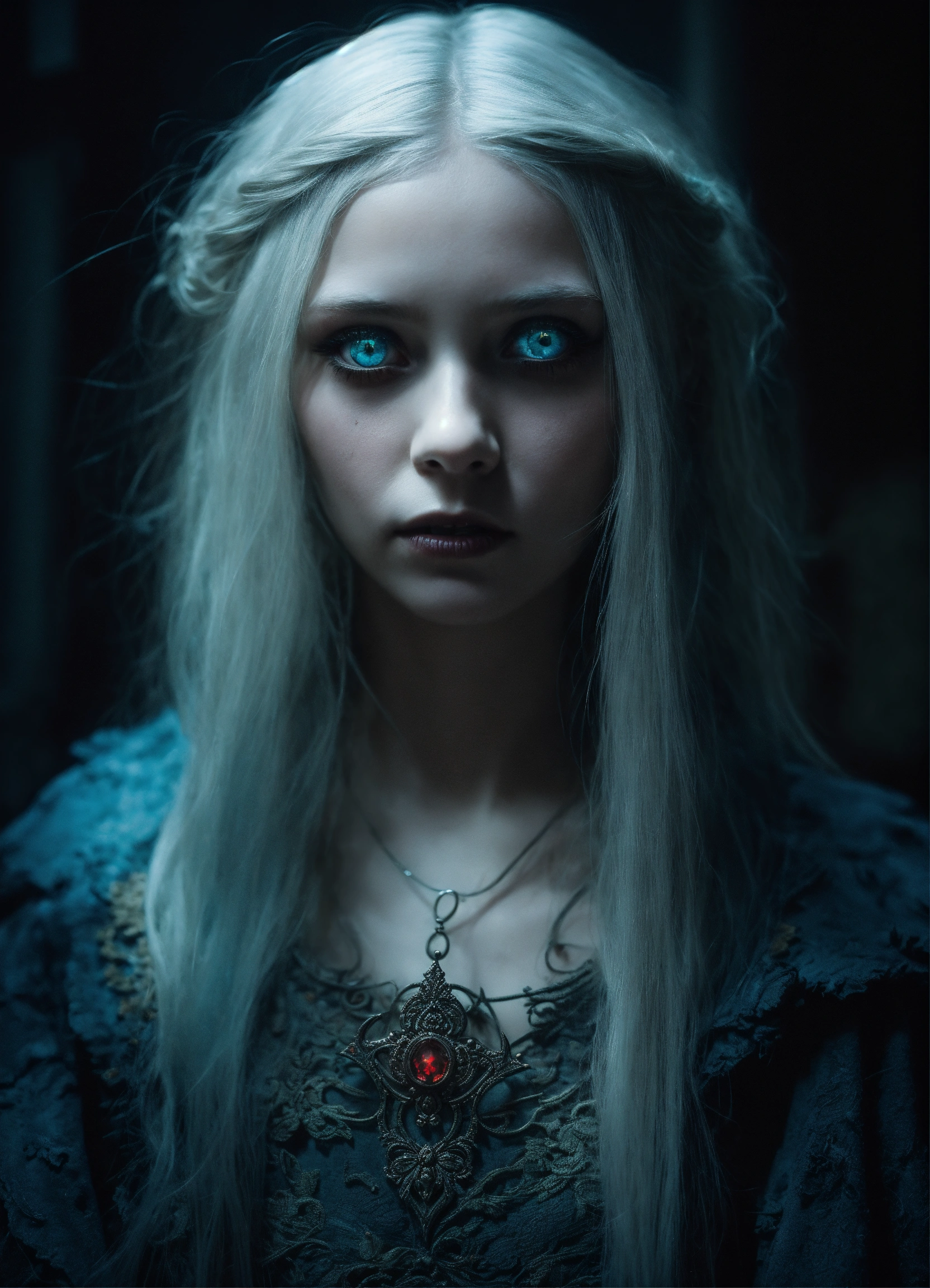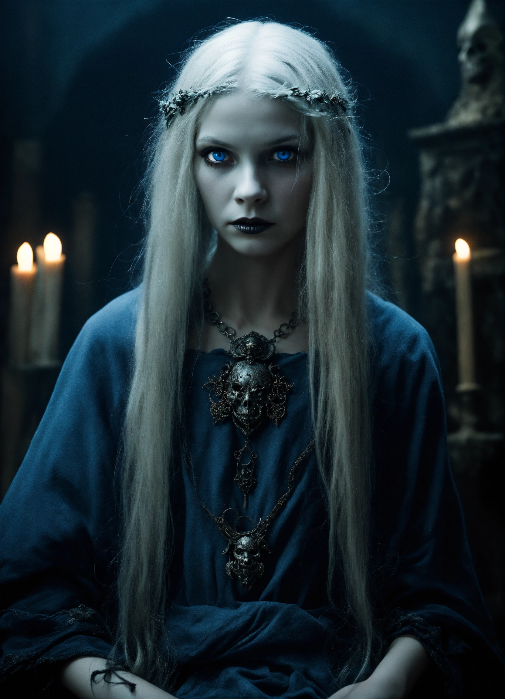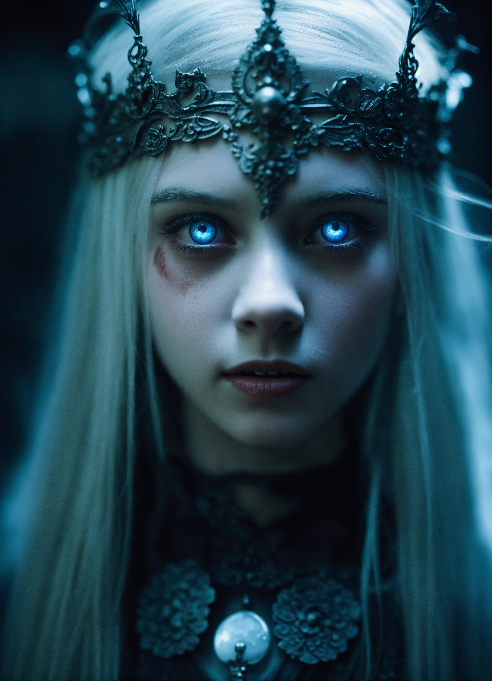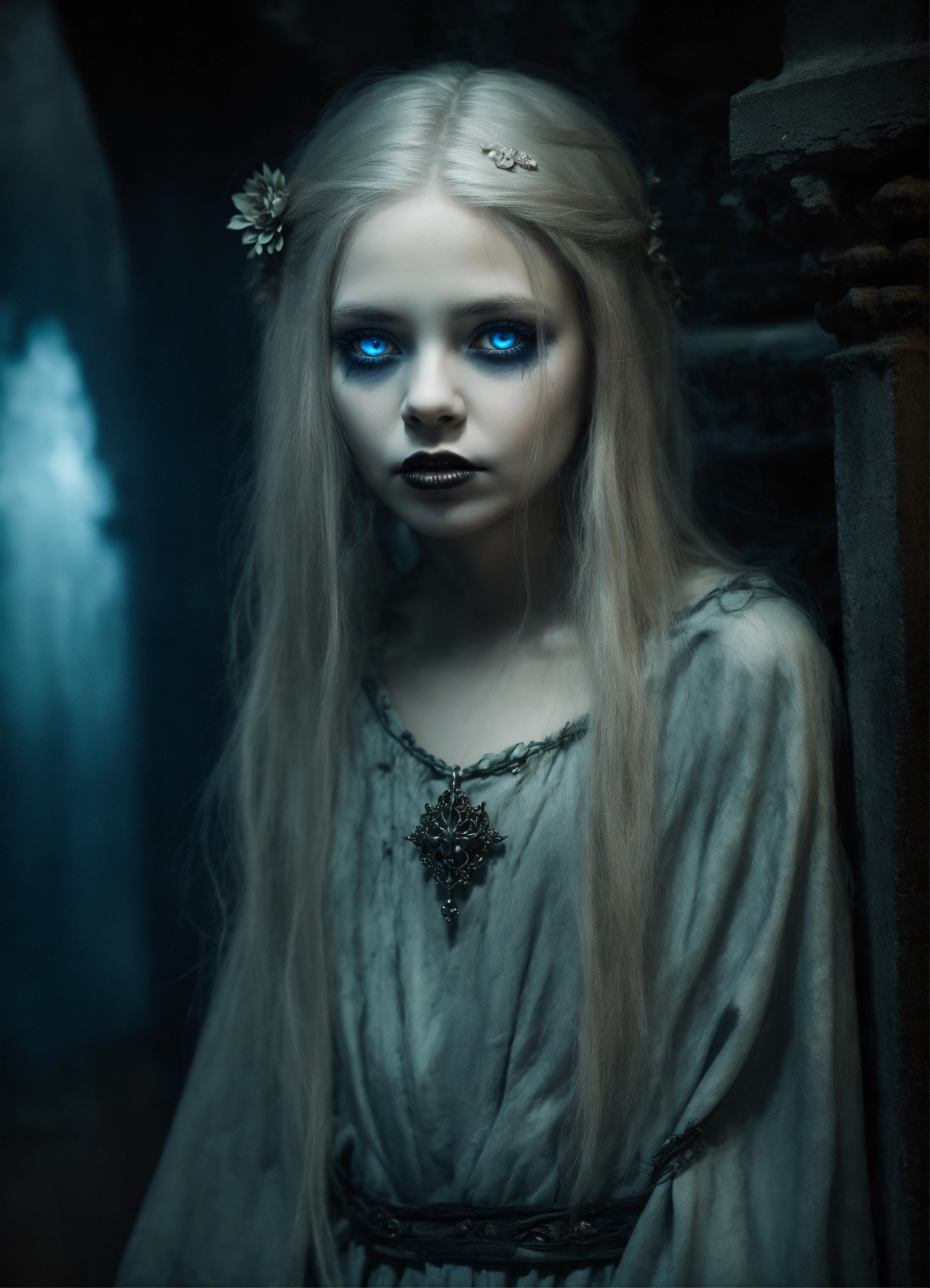 Body portrait, eleven year old childish female goth necromancer, very skinny and emaciated with long silverwhite hair and alabaster skin pale as a corpse and glowing blue eyes is overcome by darkness in a gloomy crypt, slim face, innocent looking, graceful, wispy, glowing blue eyes, ghostly, rotting flesh, dead, evil, demonic, undead, darkness, grotesque, mysterious, dark, cold ambient lighting, focus on face, extremely detailed, fantasy, medieval setting