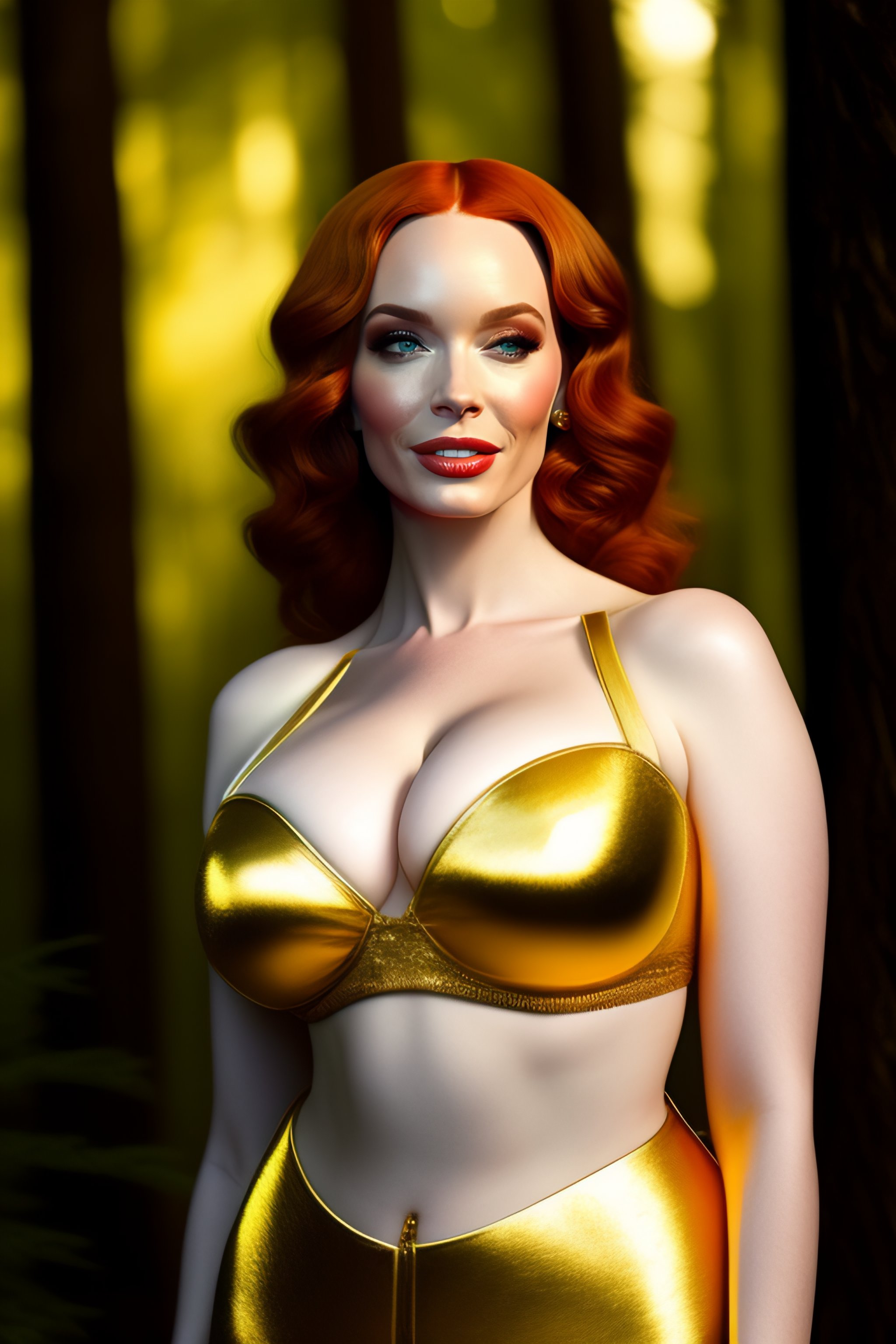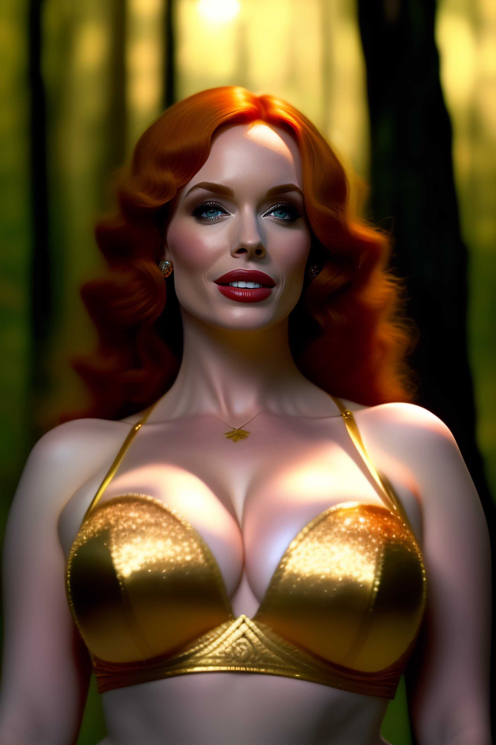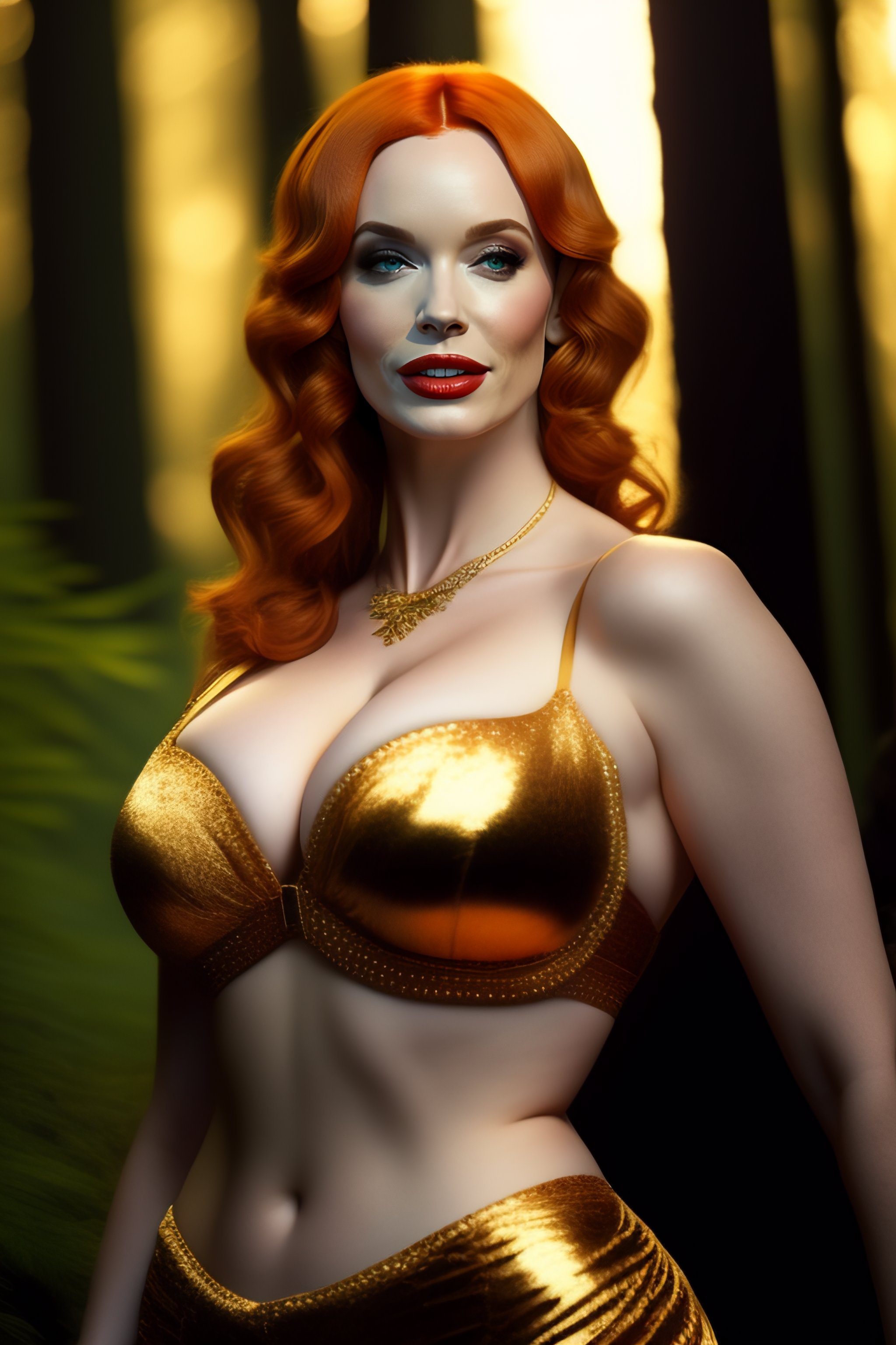Amazing beautiful christina hendricks with mouth wide open in forest with gold bra, wide lens, full body