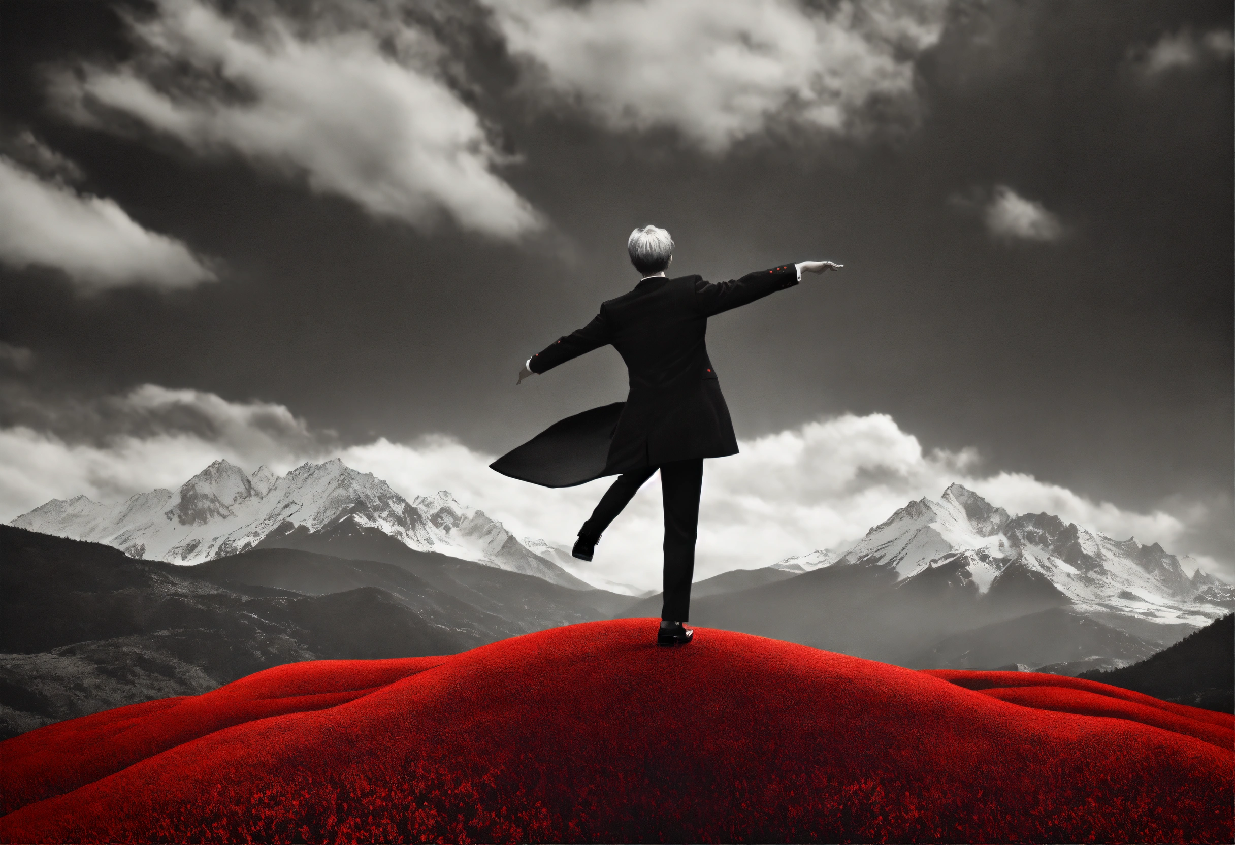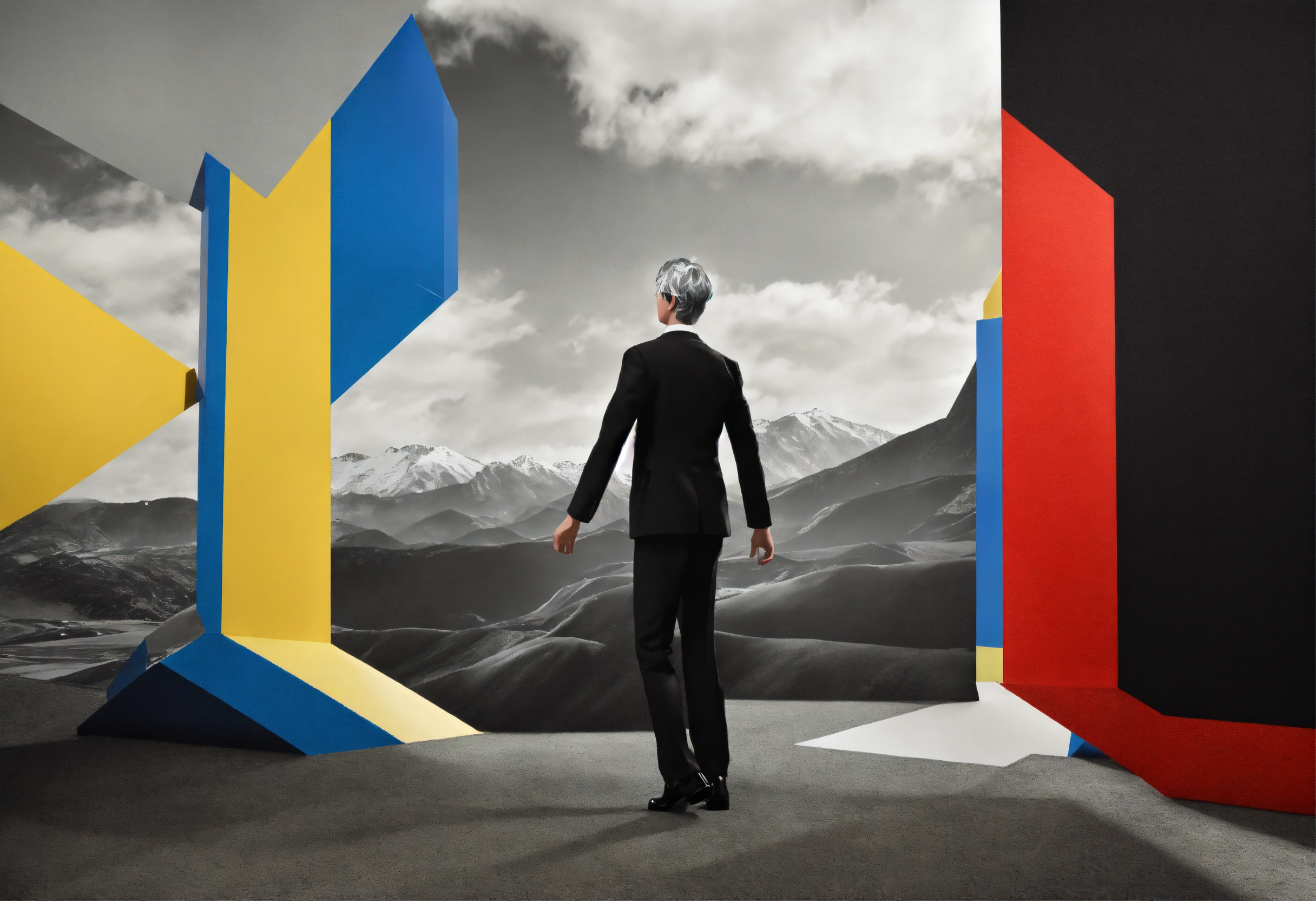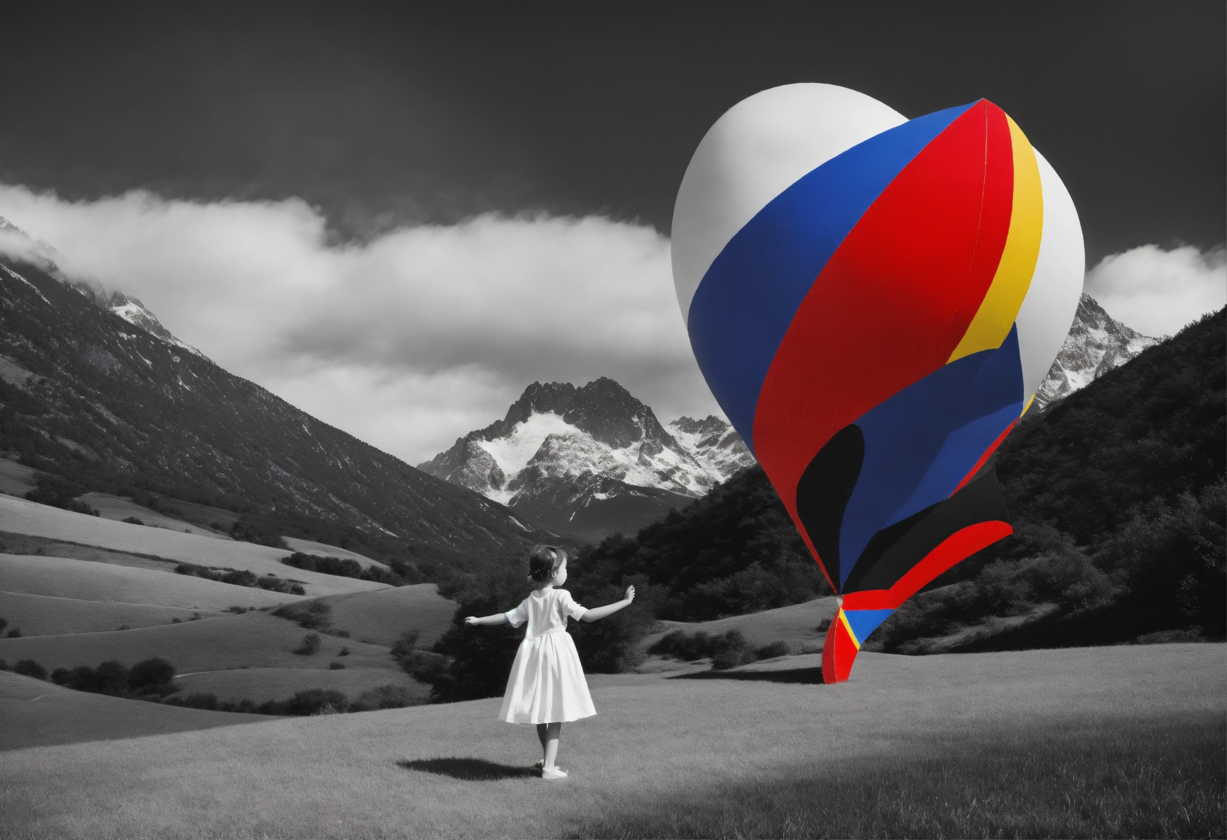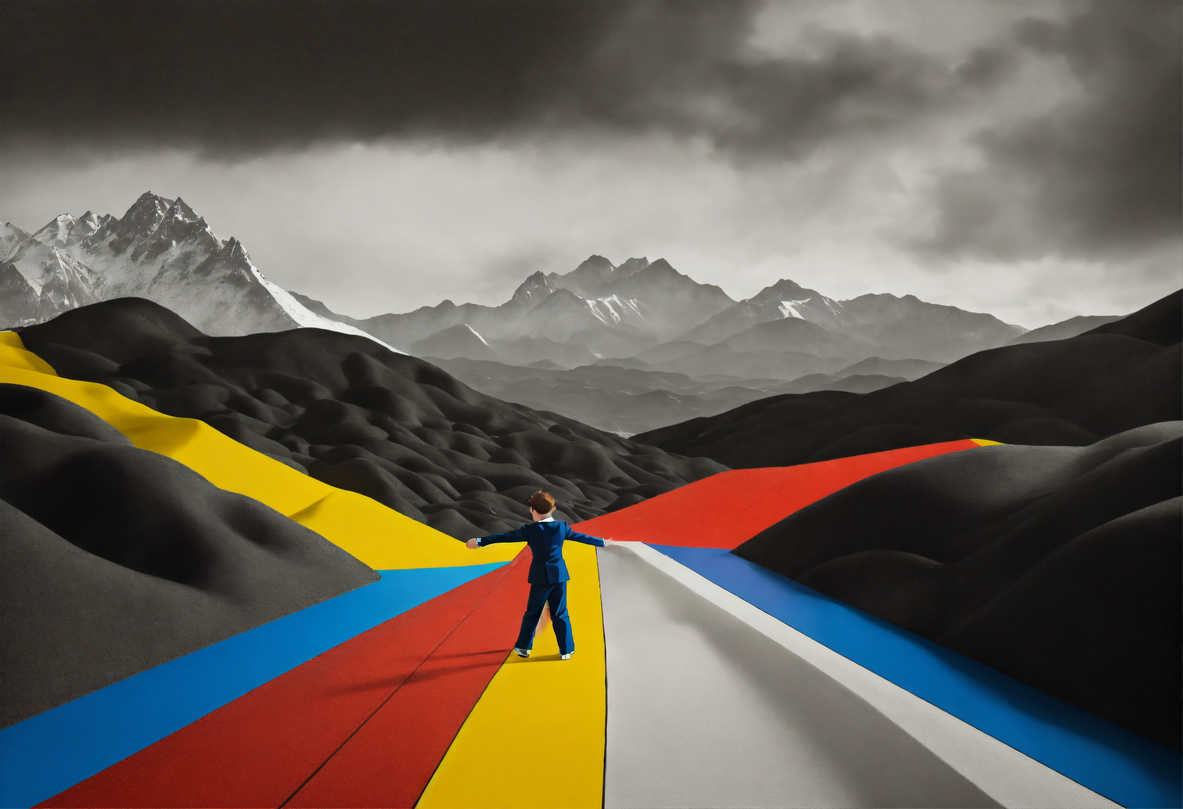 Balck and white and primary colors, 3d abstract landscape, realistic middle-aged dancing pose child photography, immersive-inspired art deco, mountains landscape, rene magritte inspiration.