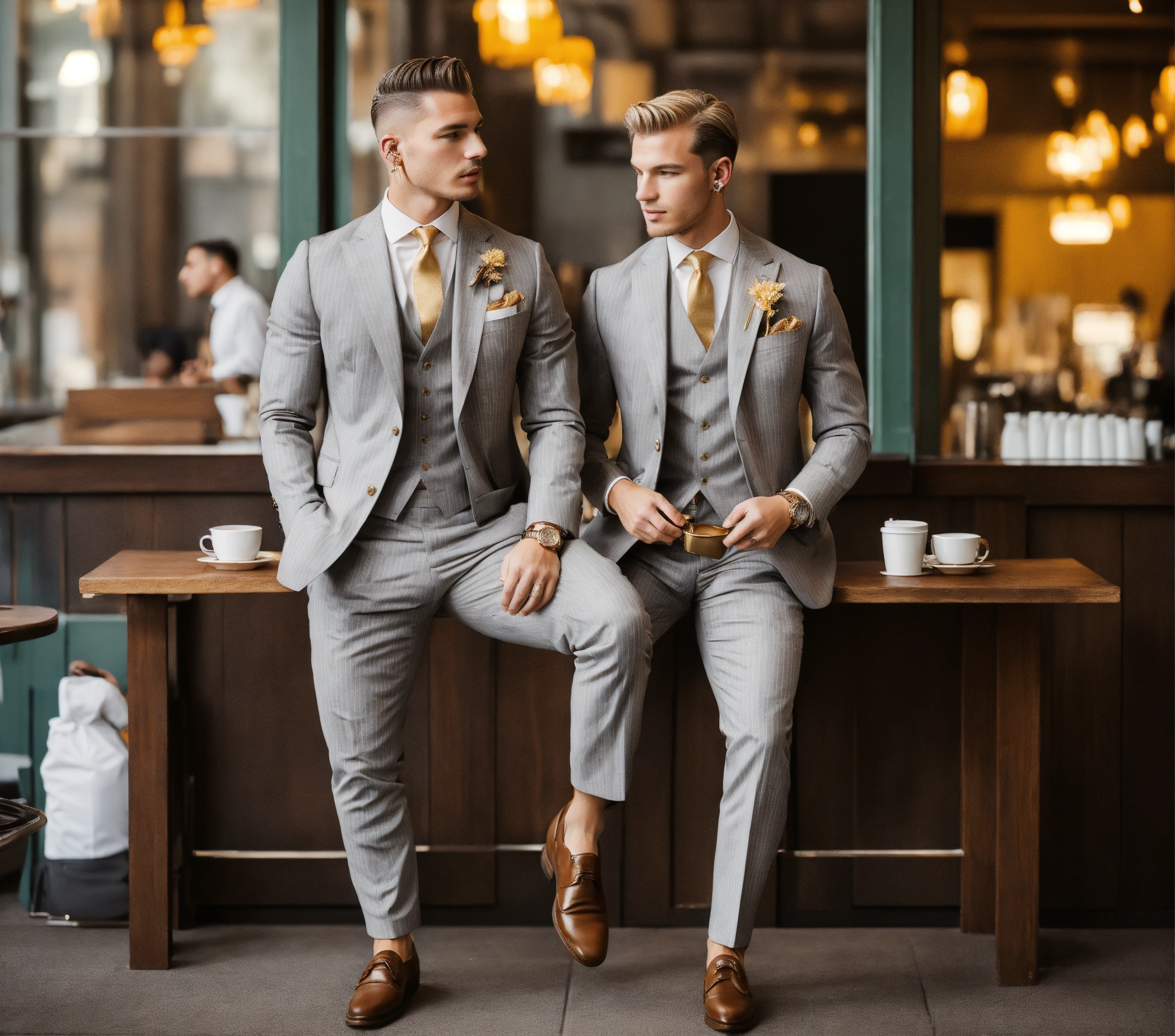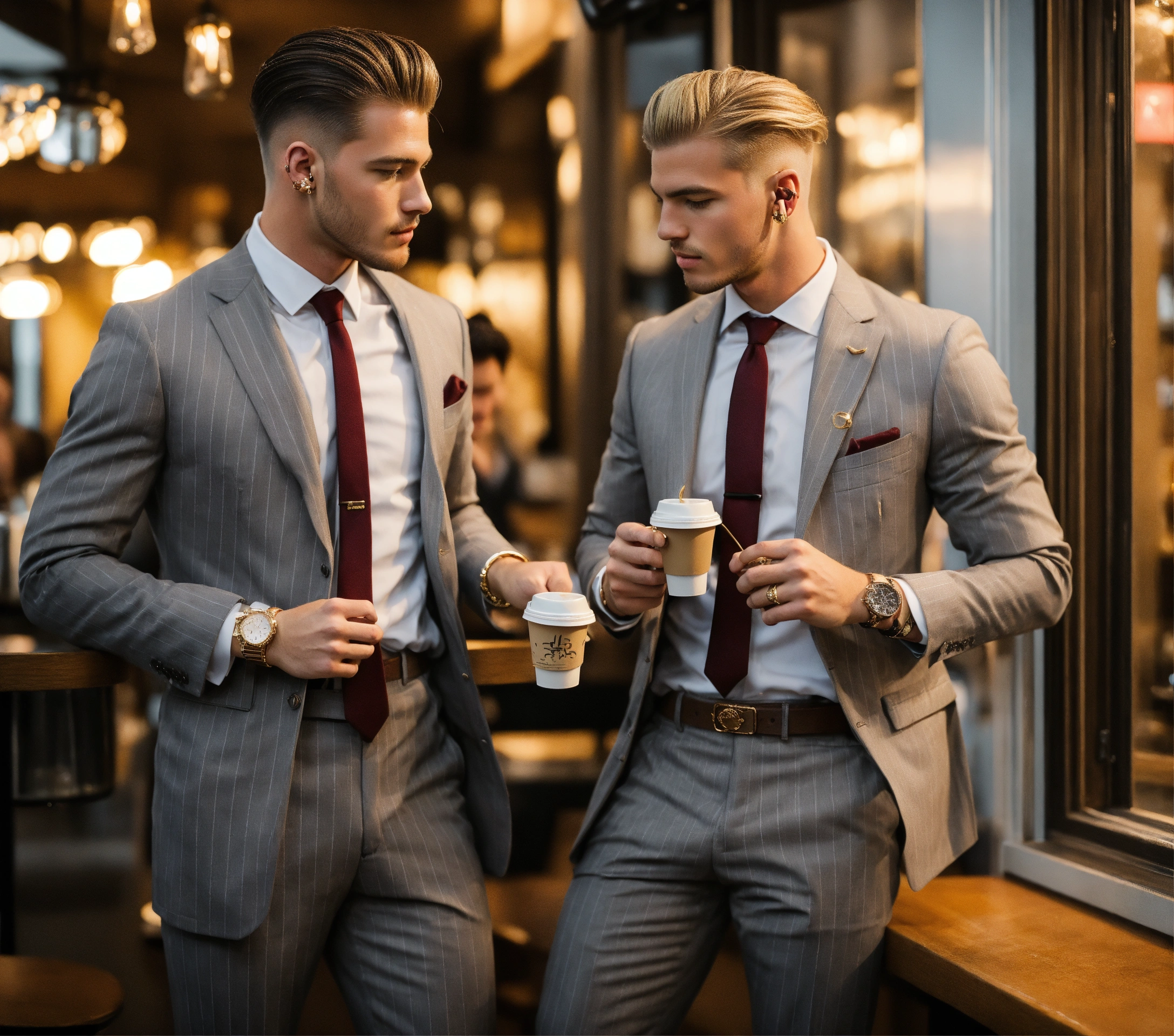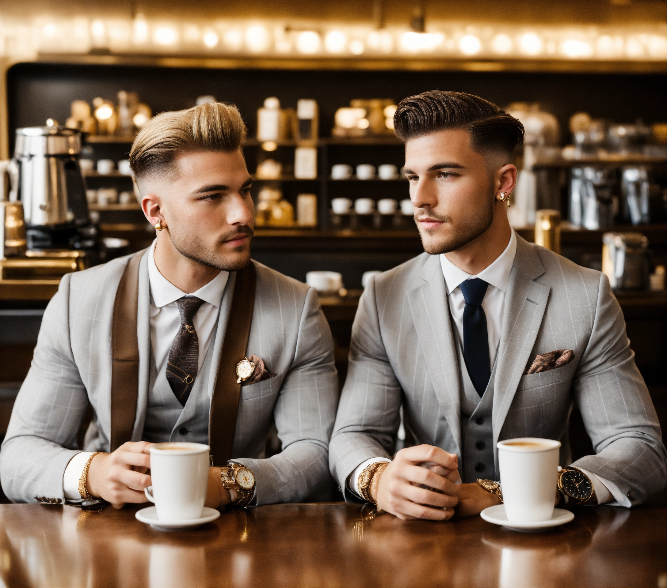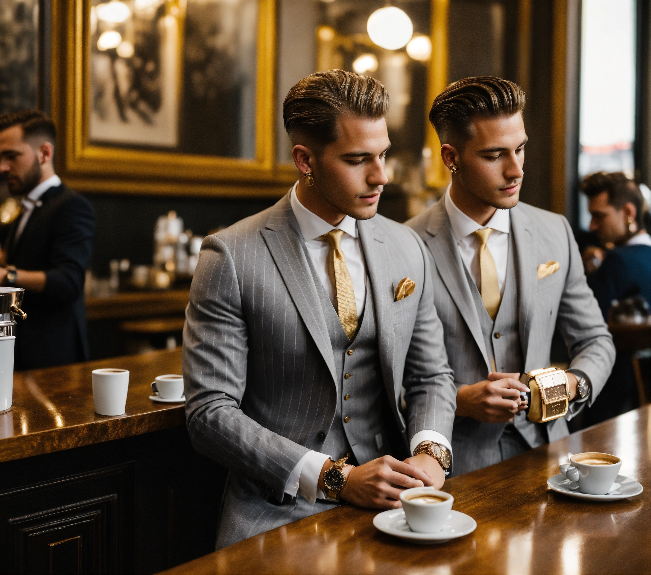 Two young blonde and brunette male gentlemen in light grey pinstripe suit, pompadour haircut, brown monkstrap shoes, with golden watch, earings and bracelet, standing in line for coffee