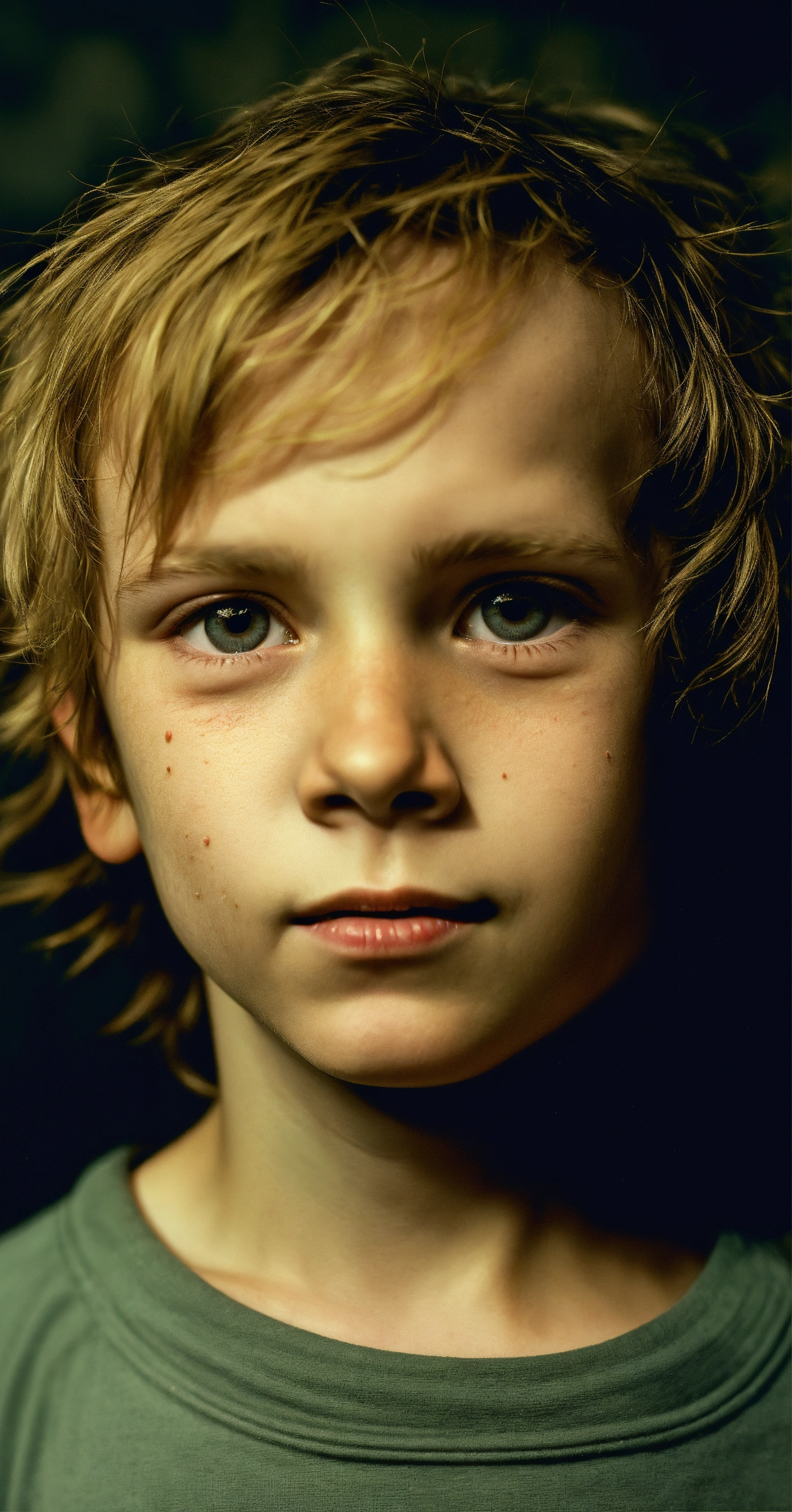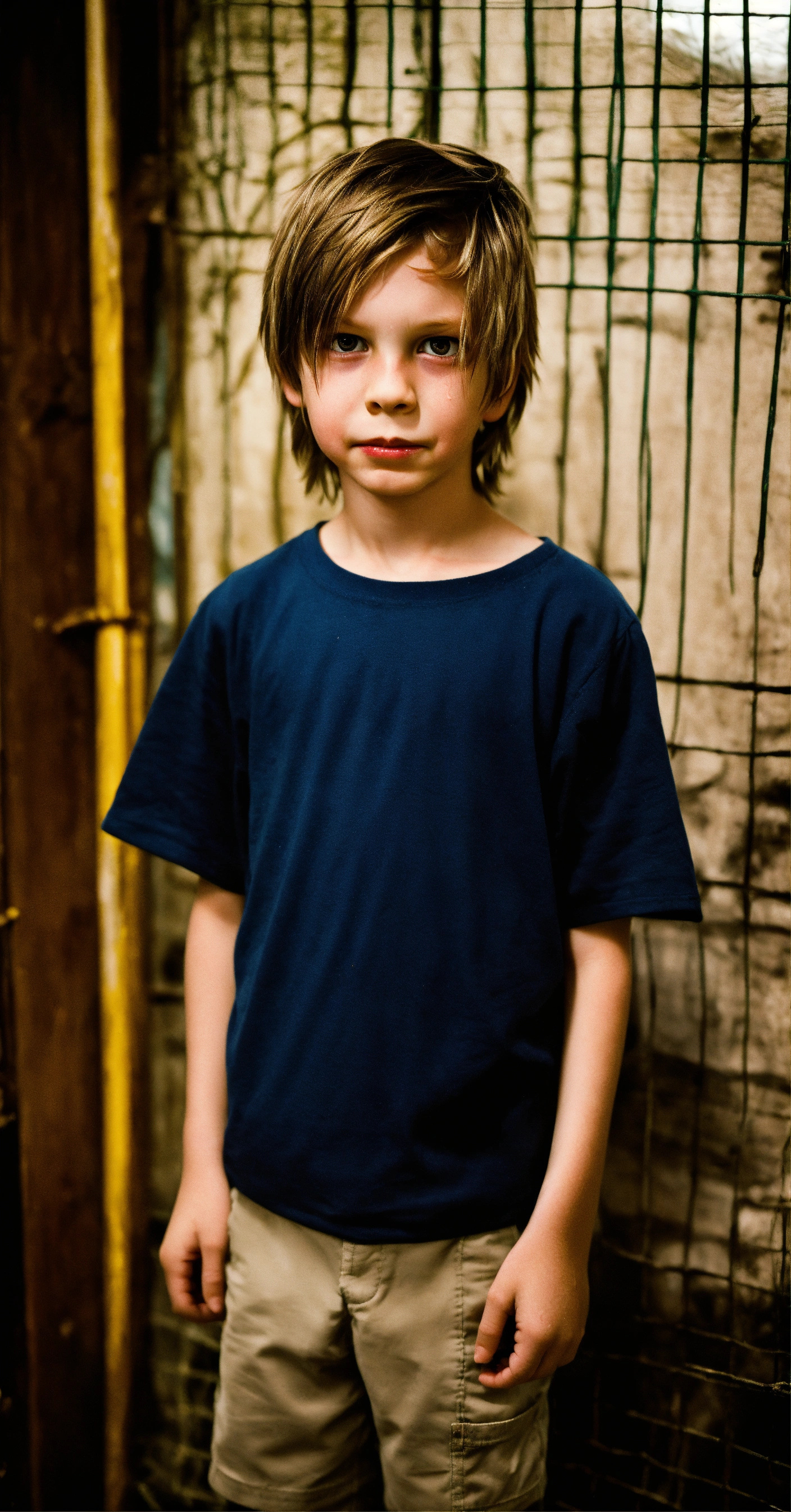Photo of a 9-year-old boy, creepy, pale skin, sickly, thin, dark circles under eyes, sneer, greasy hair, smirk, scary, full body image, weird
