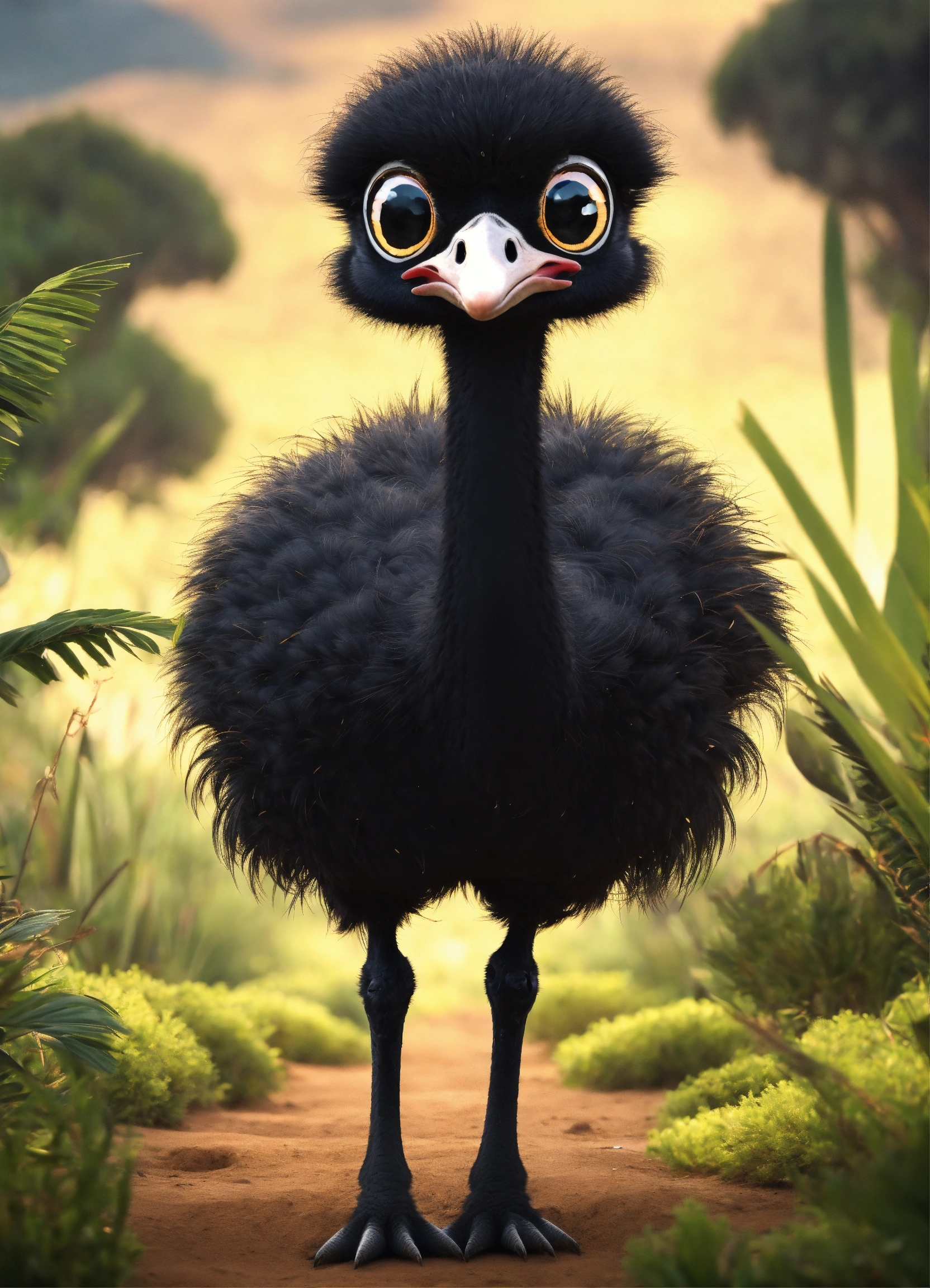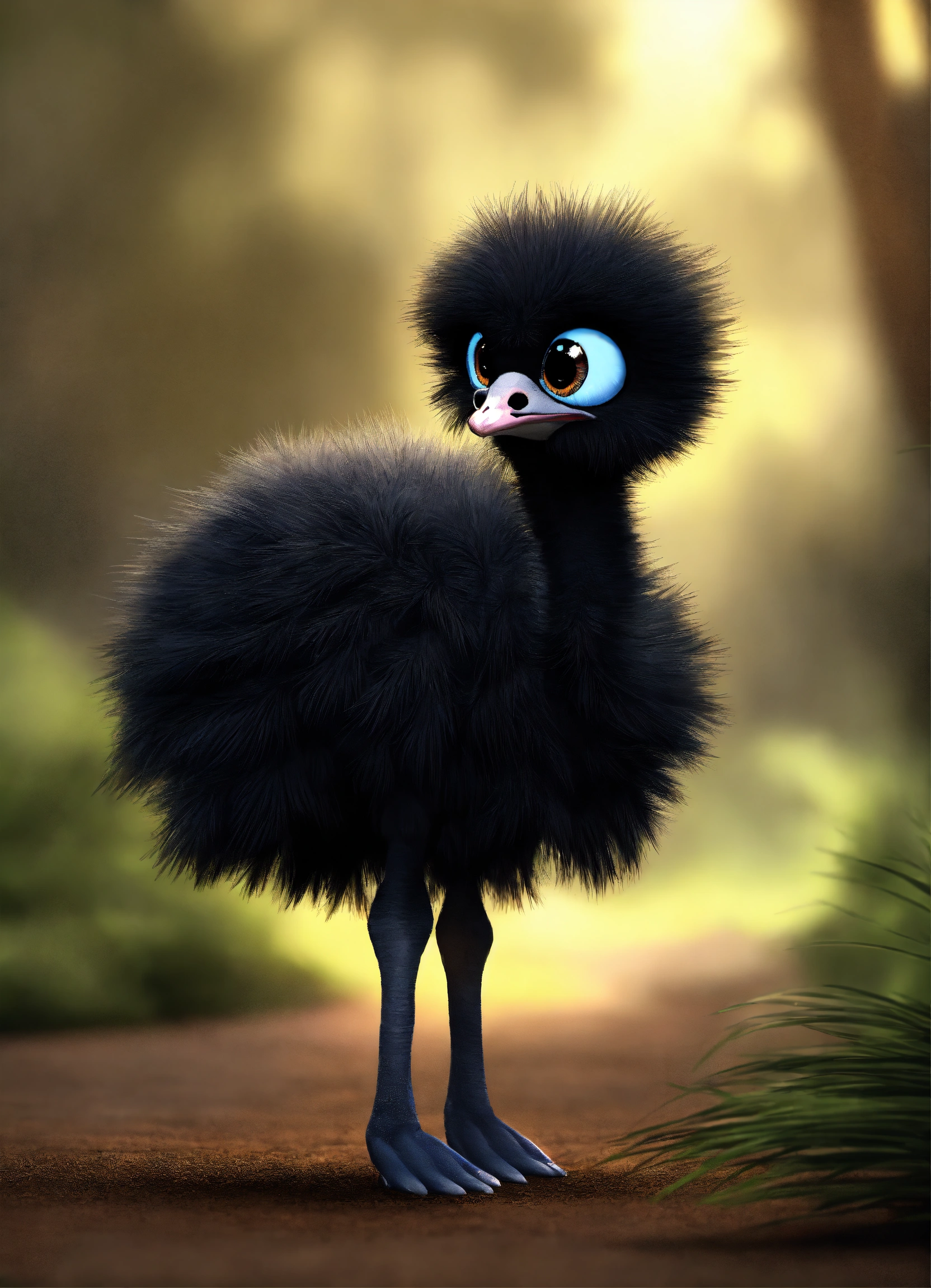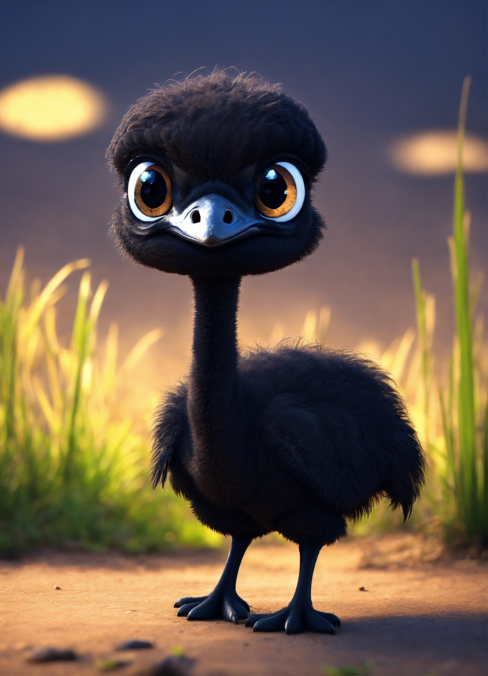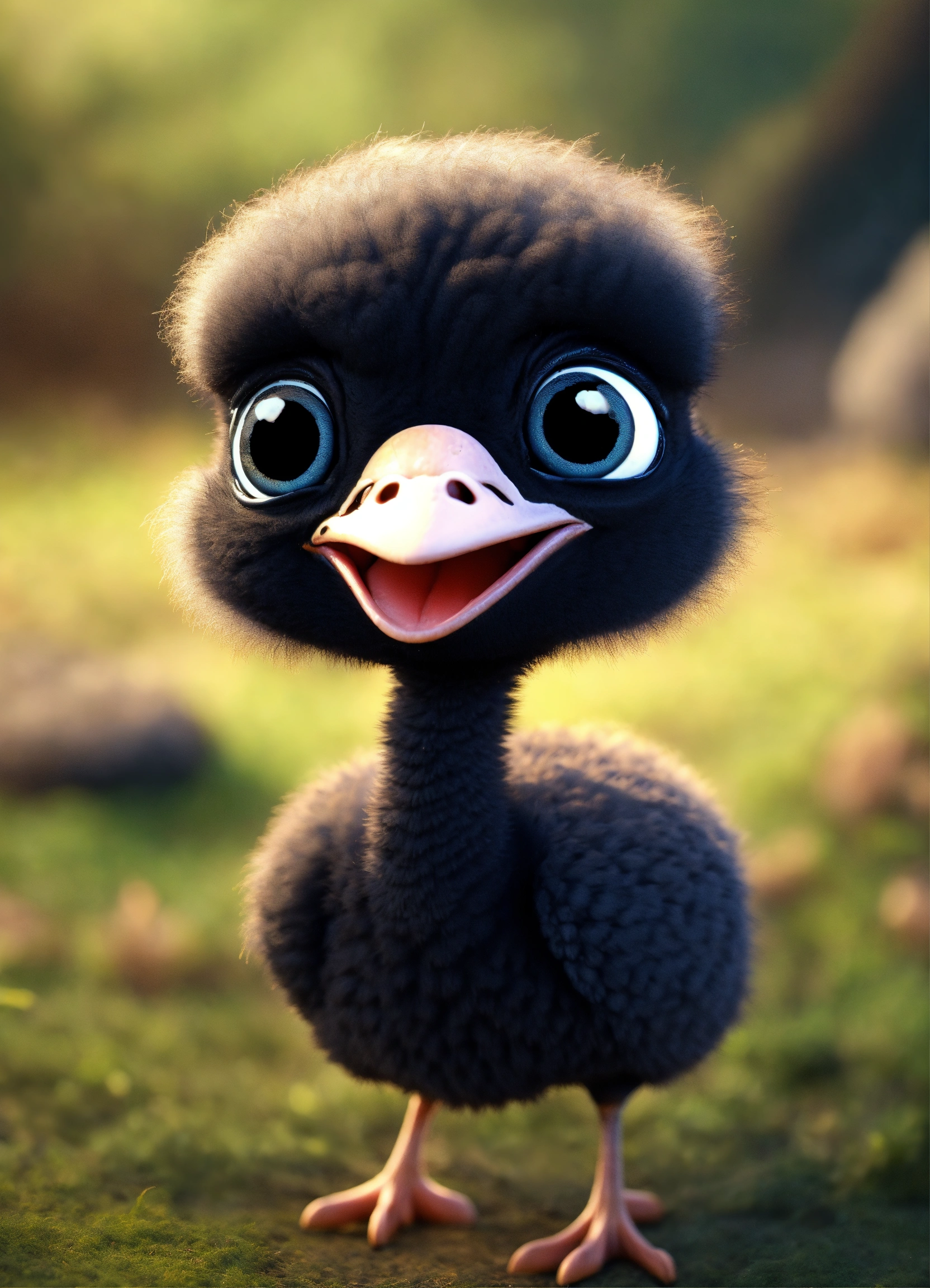 A cute all black baby ostrich with big eyes