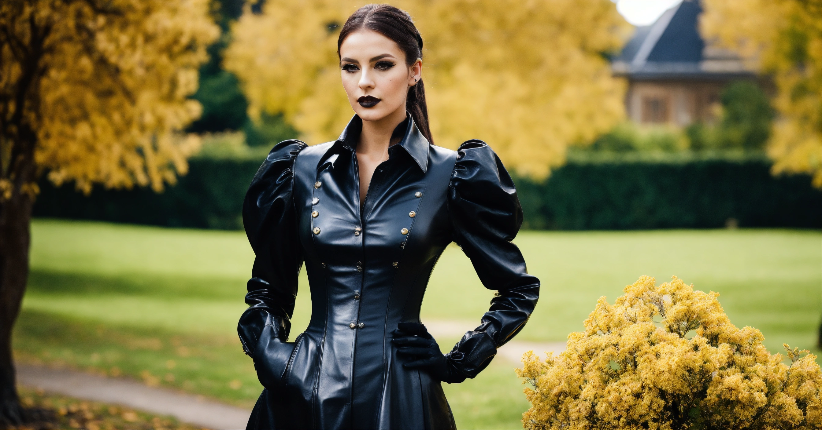 Two stunning french seductress women fashion model, brunette straight high ponytail, black leather corset, long strict victorian governess wide black long leather shirt dress with long big puff sleeves and big buttons, mansion park with sunny daylight, white office shirt collar, leather gloves, eyeliner makeup, black leather boots