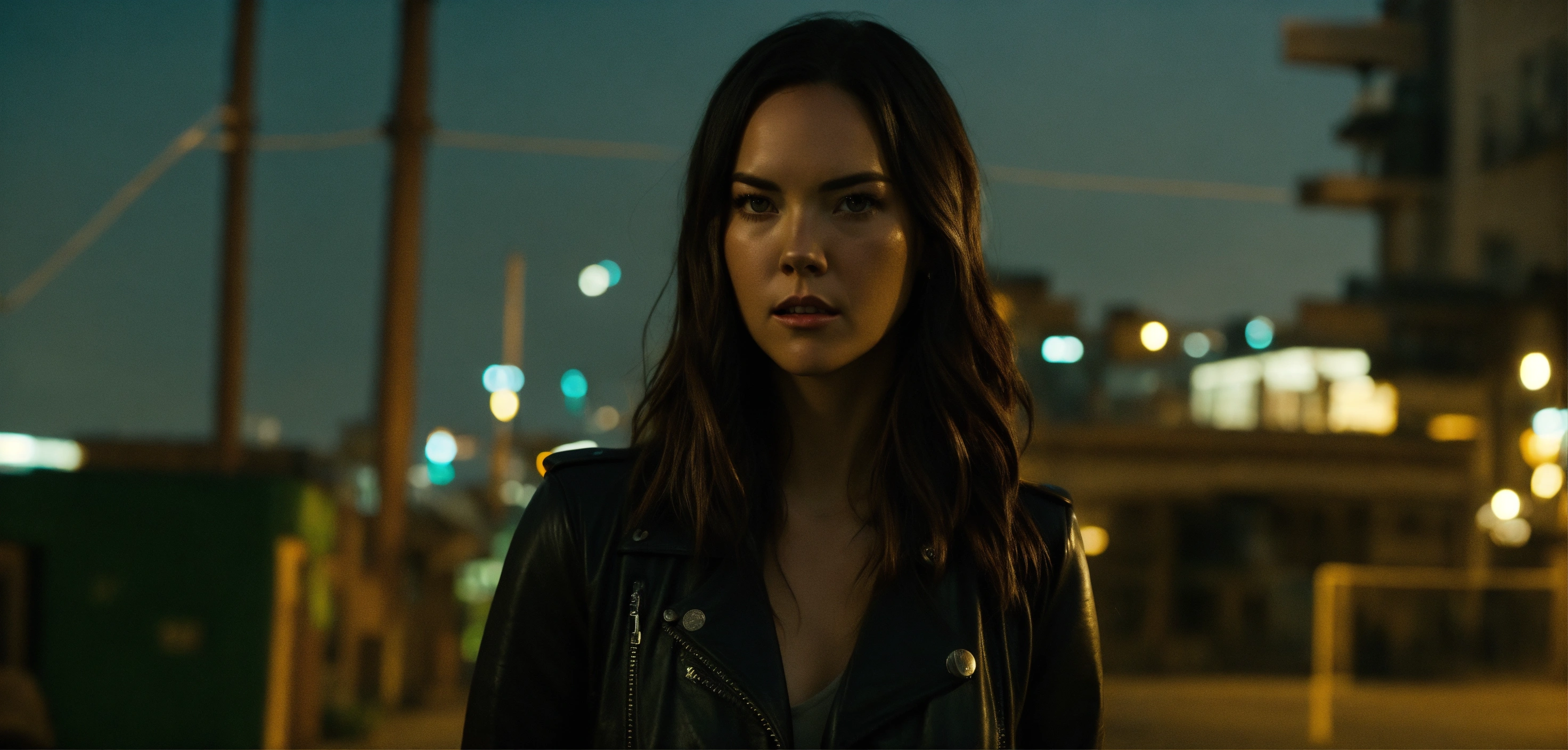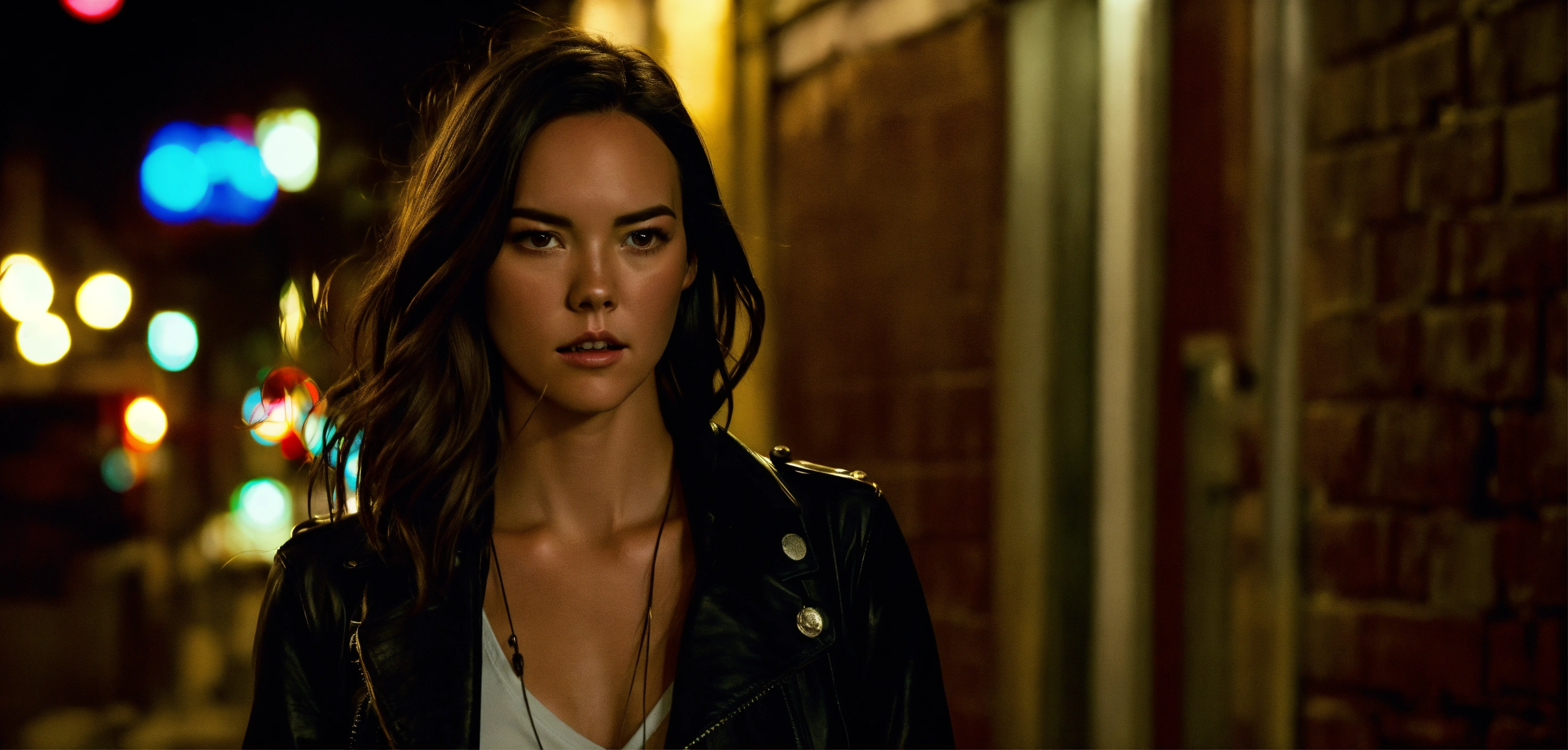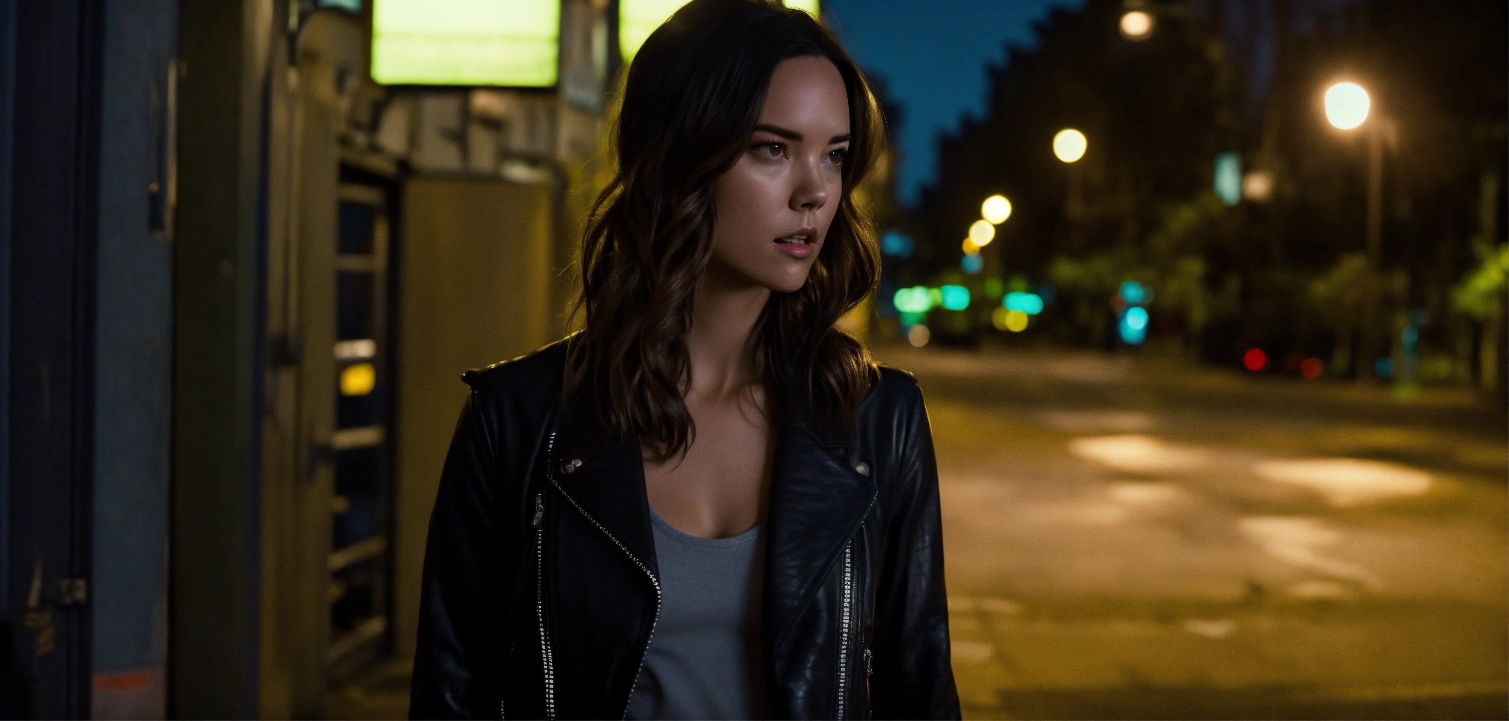 Very beautiful 25 years old odette annable, cute big eyes, crime survival serial killer victim, suspenseful, night, city, life-or-death situation, leather jacket, cinematic, realistic walk, closed mouth