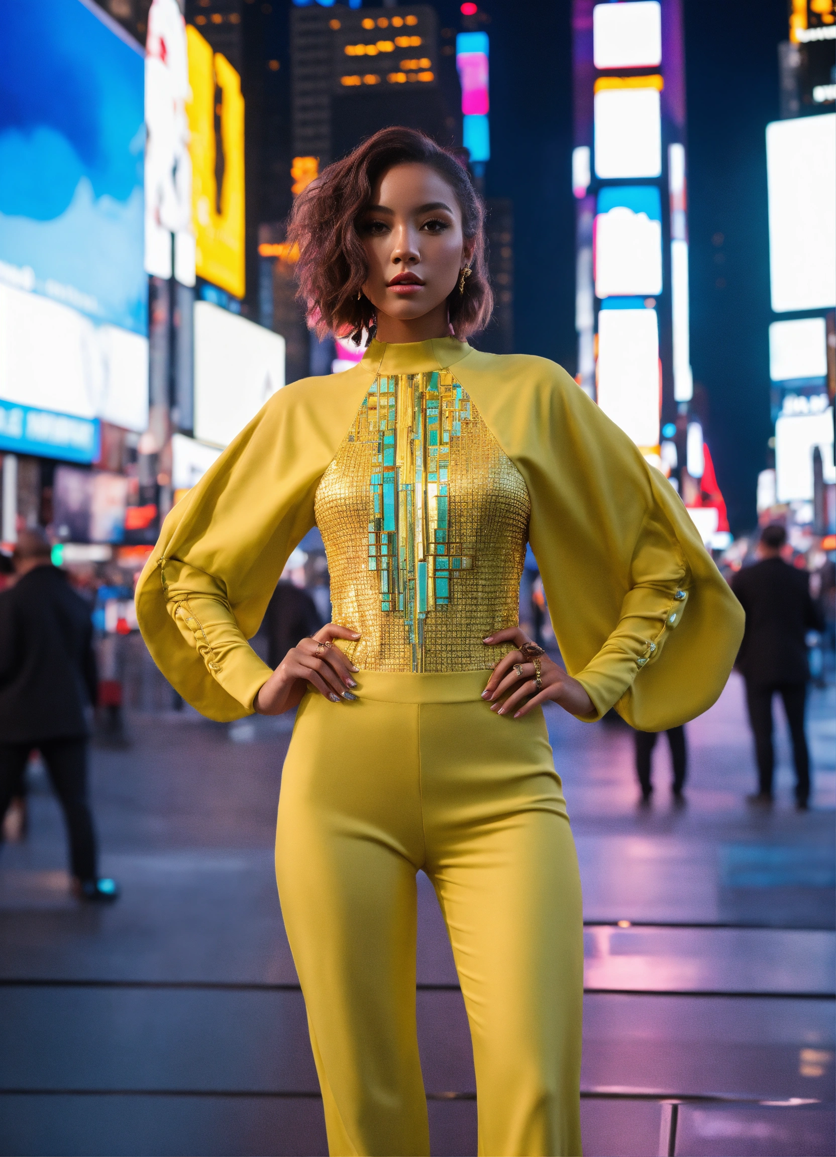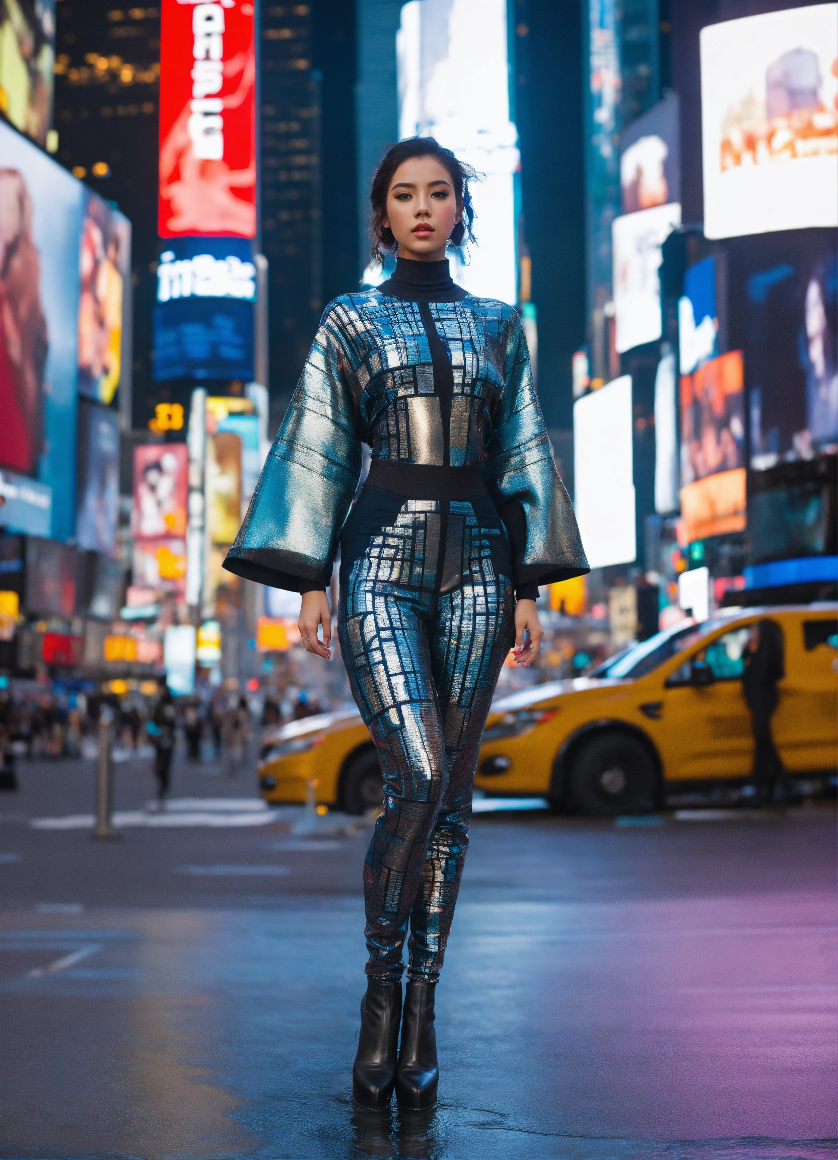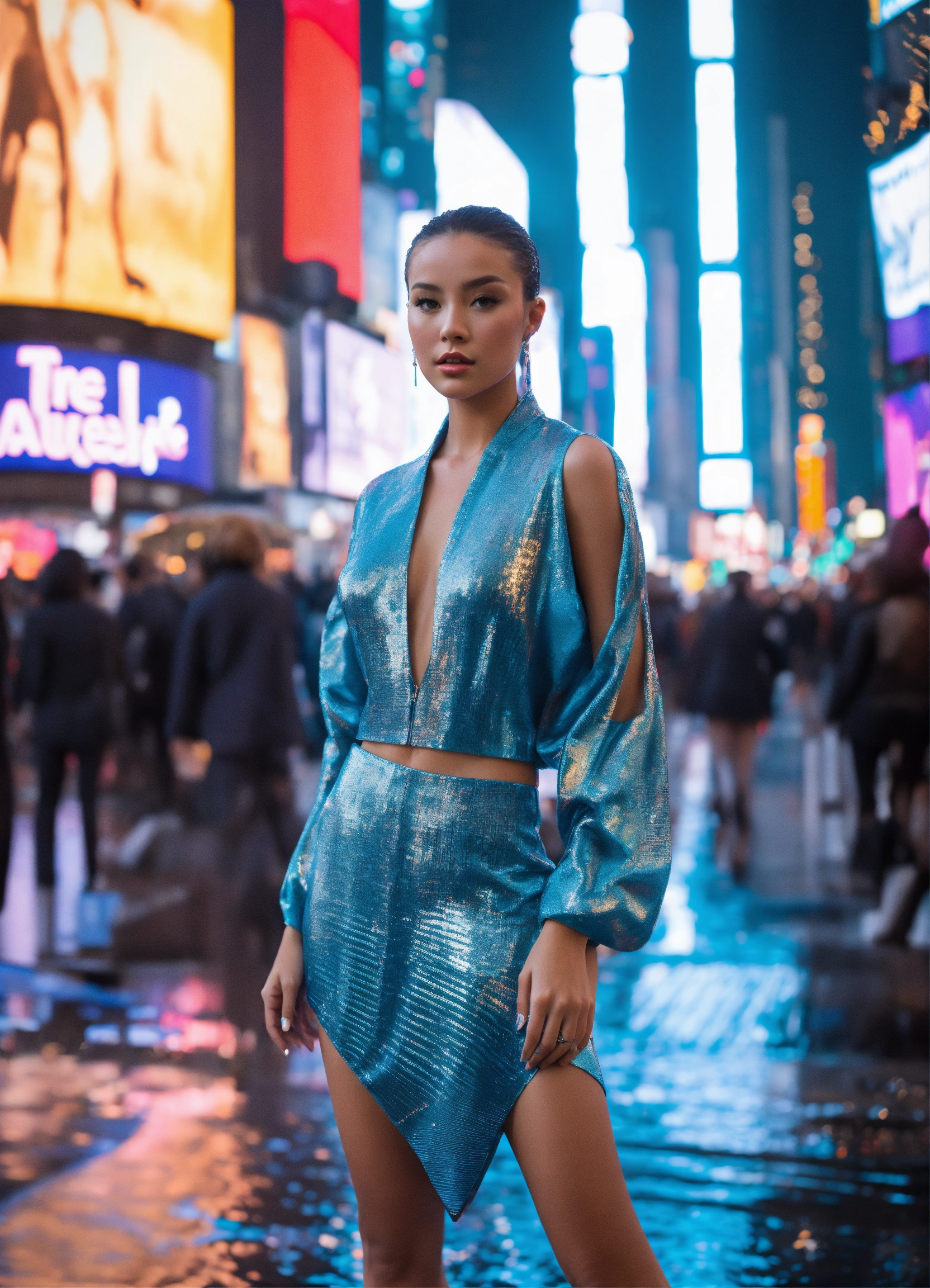 Ultra realistic full body photo of petite female model modeling upscale very artistic futuristic dolman sleeve water inspired outfit on times square