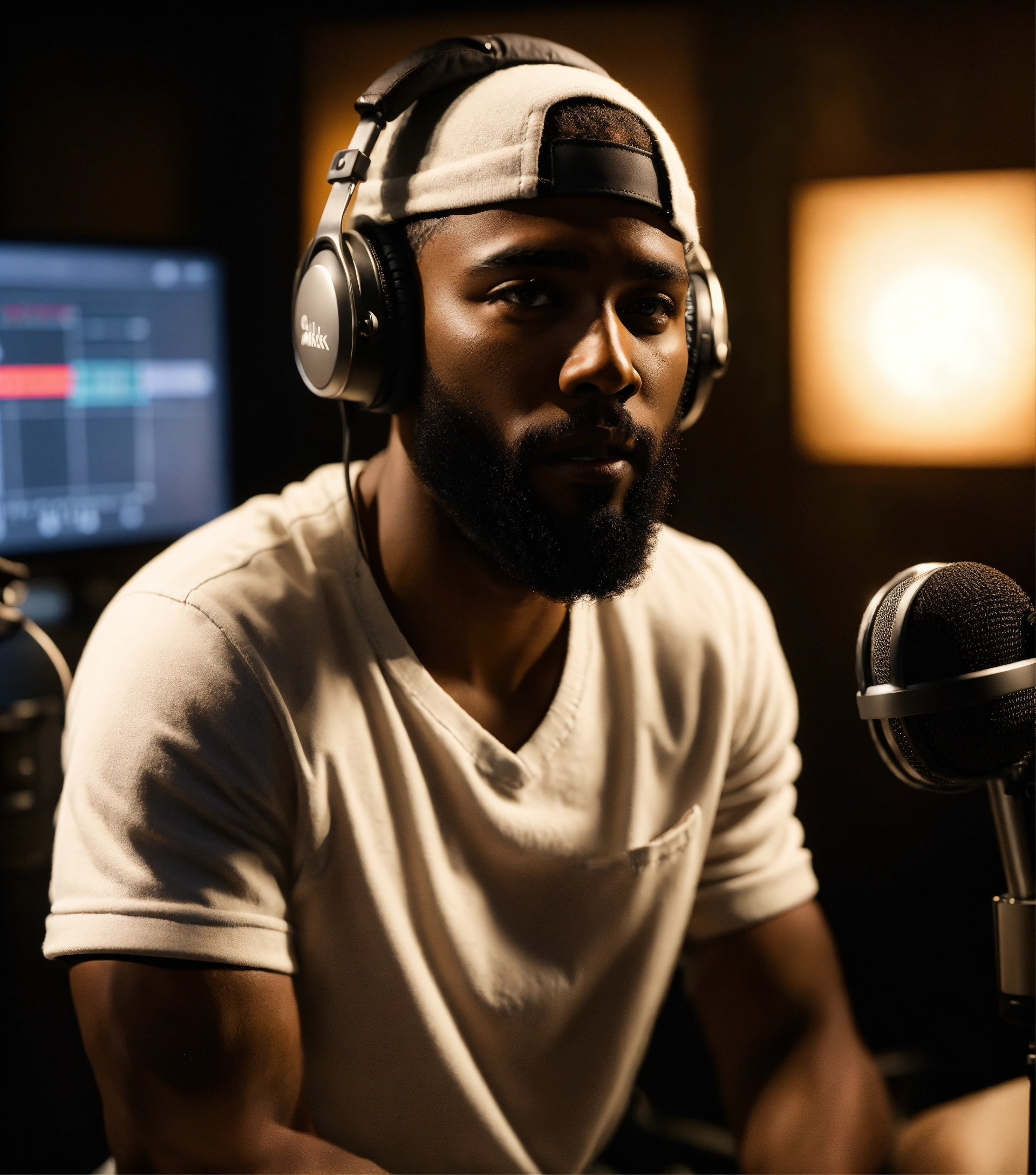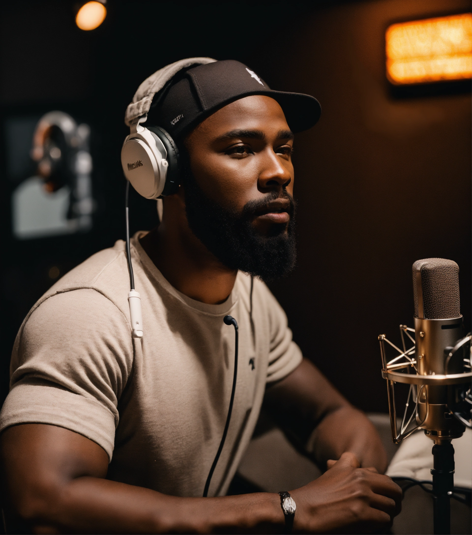 Real photo of a gugu e michaels chocolate dark skin tone handsome black man with beard, front profile, bald with white cap, talking into a mic with a short mic stand at a podcast studio, in a very large fancy studio, wearing long sleeve to the wrist brown and white sweat shirt and white atlanta sun visor, black jeans, very realistic, ultimate detail, 8k, face front looking straight into the camera, 8k, expensive recording studio with dark brown background, extreme detail, cinematic lighting, face front, brown eyes looking at camera.