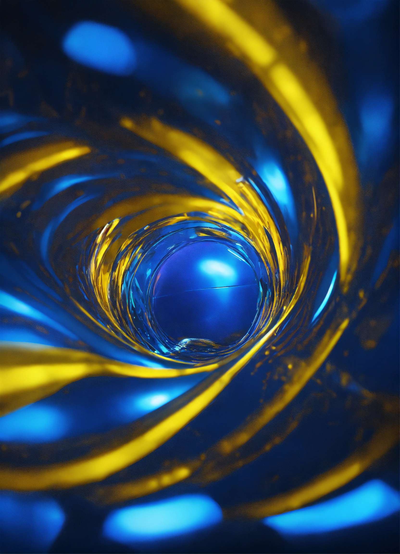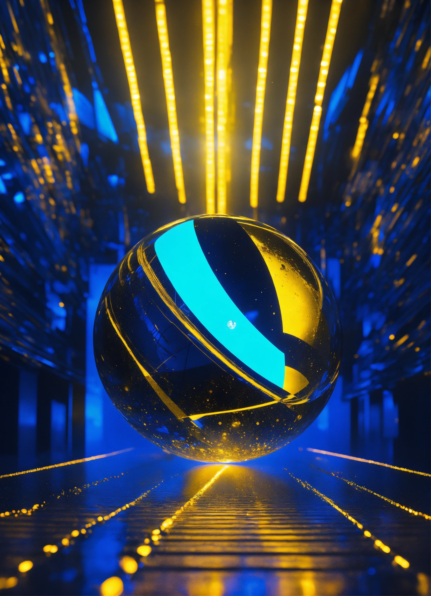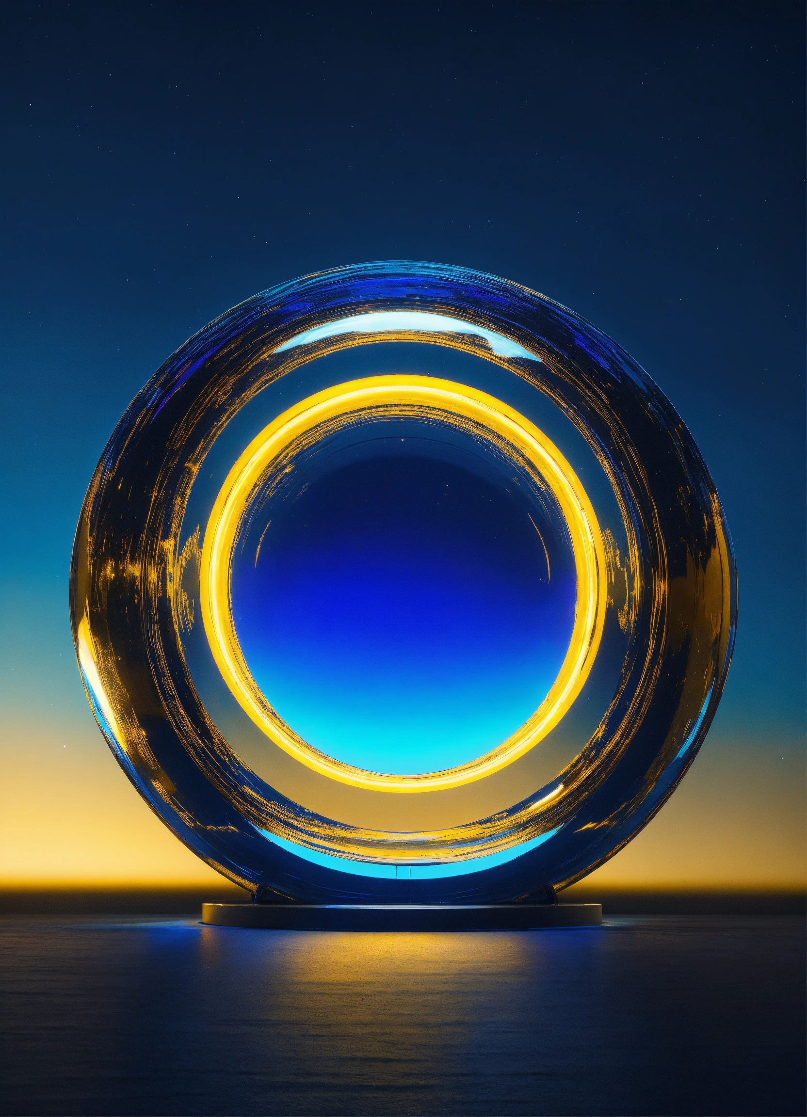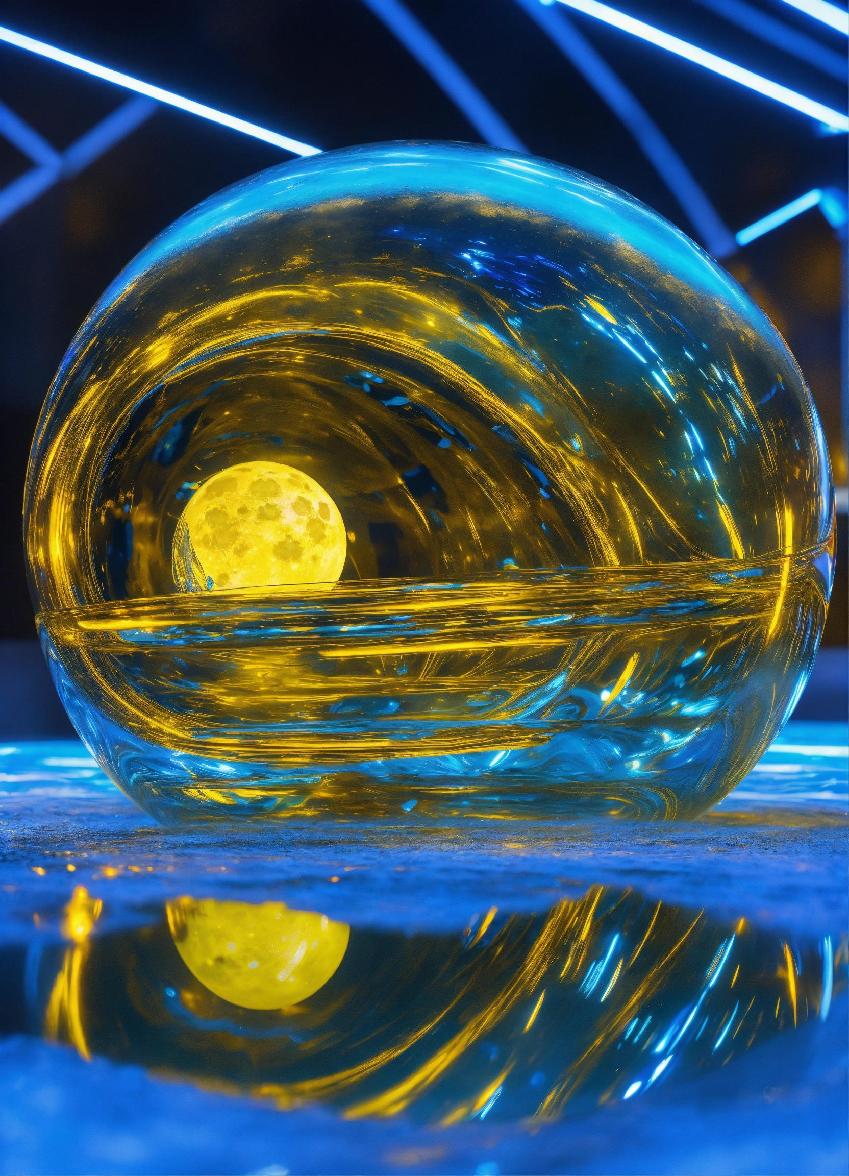Metallic and glassy textured surface, vivid tones of blue and yellow, surreal futuristic neatly object, heavenly and intense neon lights, a glass installation on the air without little things. surreal and clean background. symbolizing a portal to another dimension. reminds and feel moon shape. one abstract representative object floating. --s 1000 --c 15