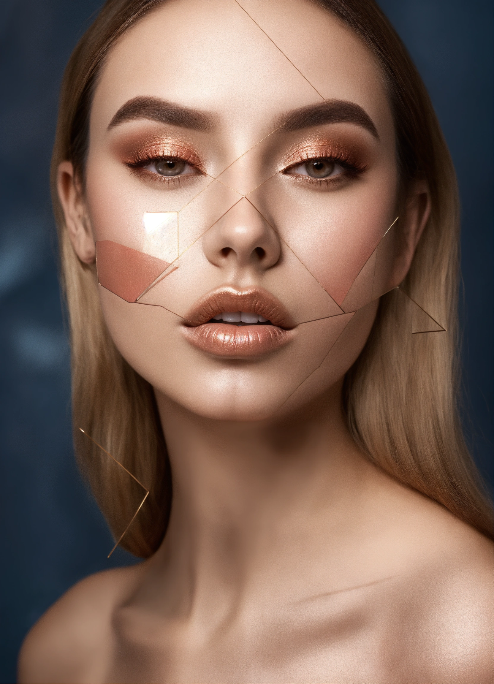 Lips makeup in triangle upside down shaped mirror, beautiful woman with triangle bottom shaped face with large forefront and thin chin