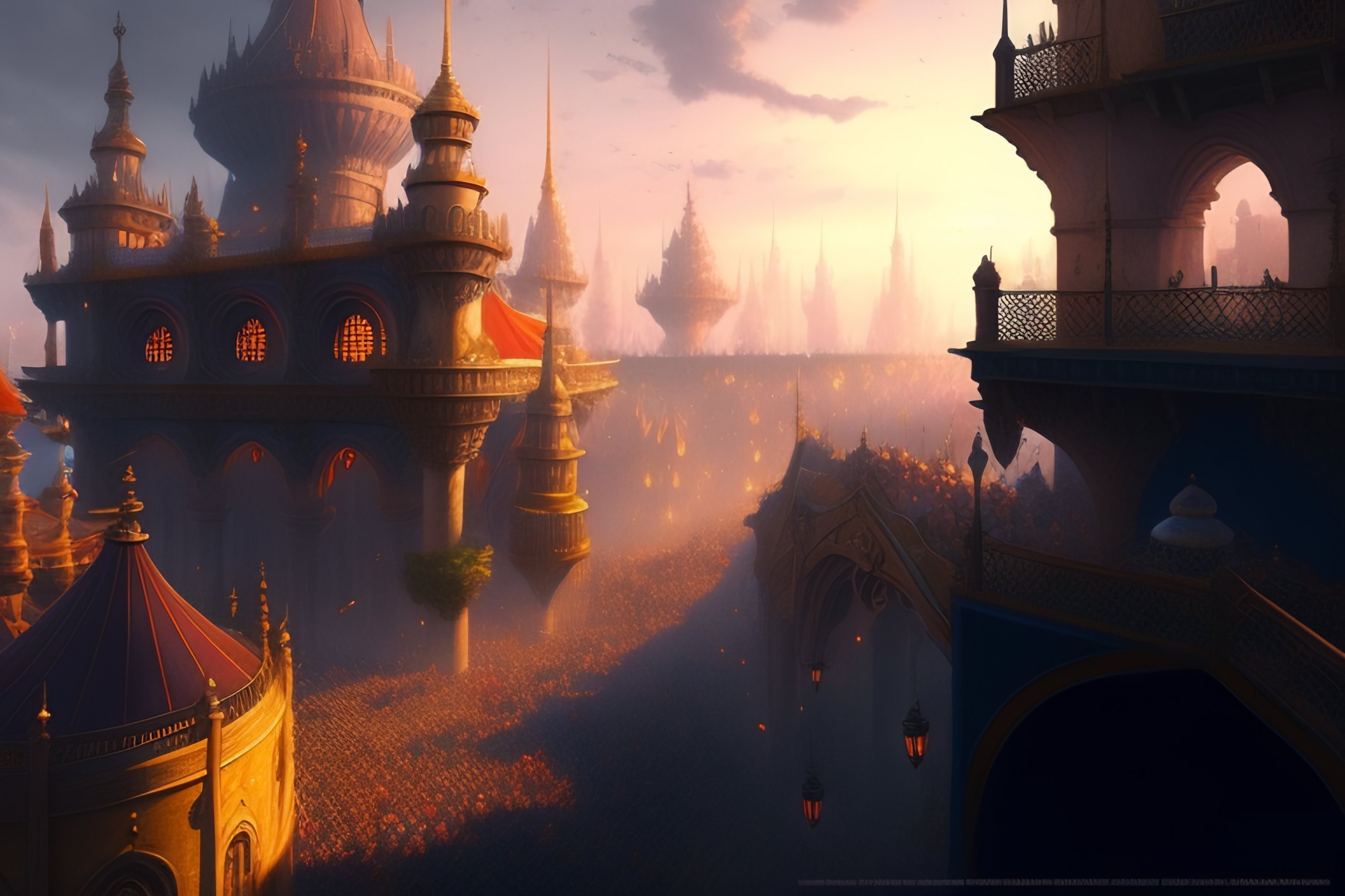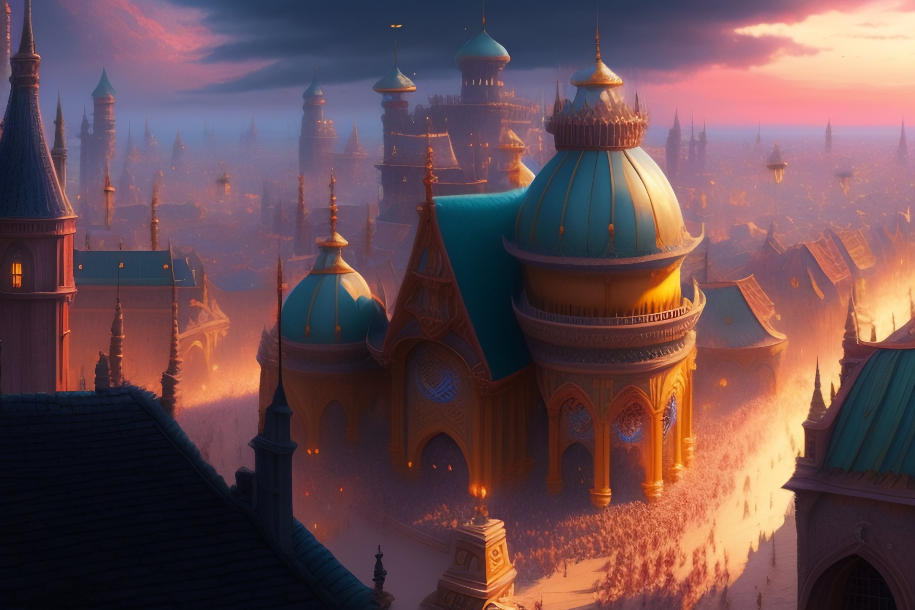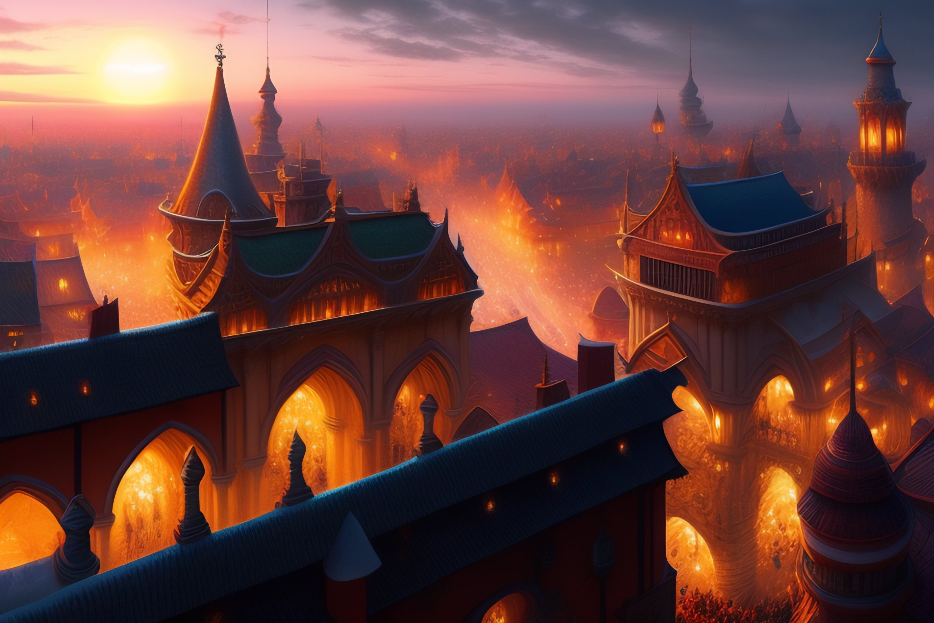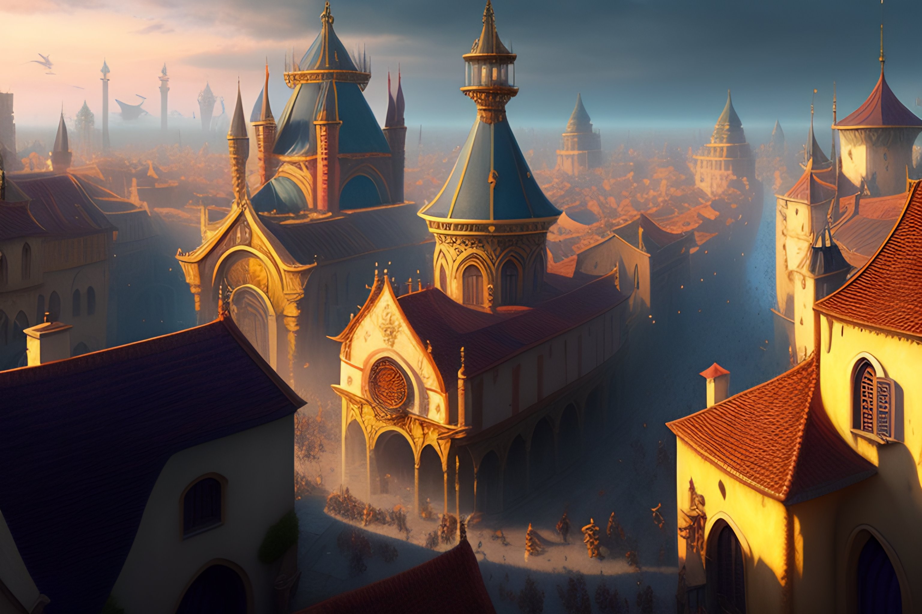 Medieval capital city, fantasy, hyper detailed, buildings, sunrise, matte painting by marc simonetti, jonathan solter, greg rutkowski, masterpiece, cinematic, hyperdetailed, photorealistic, hyperrealism, architecture, aerial view