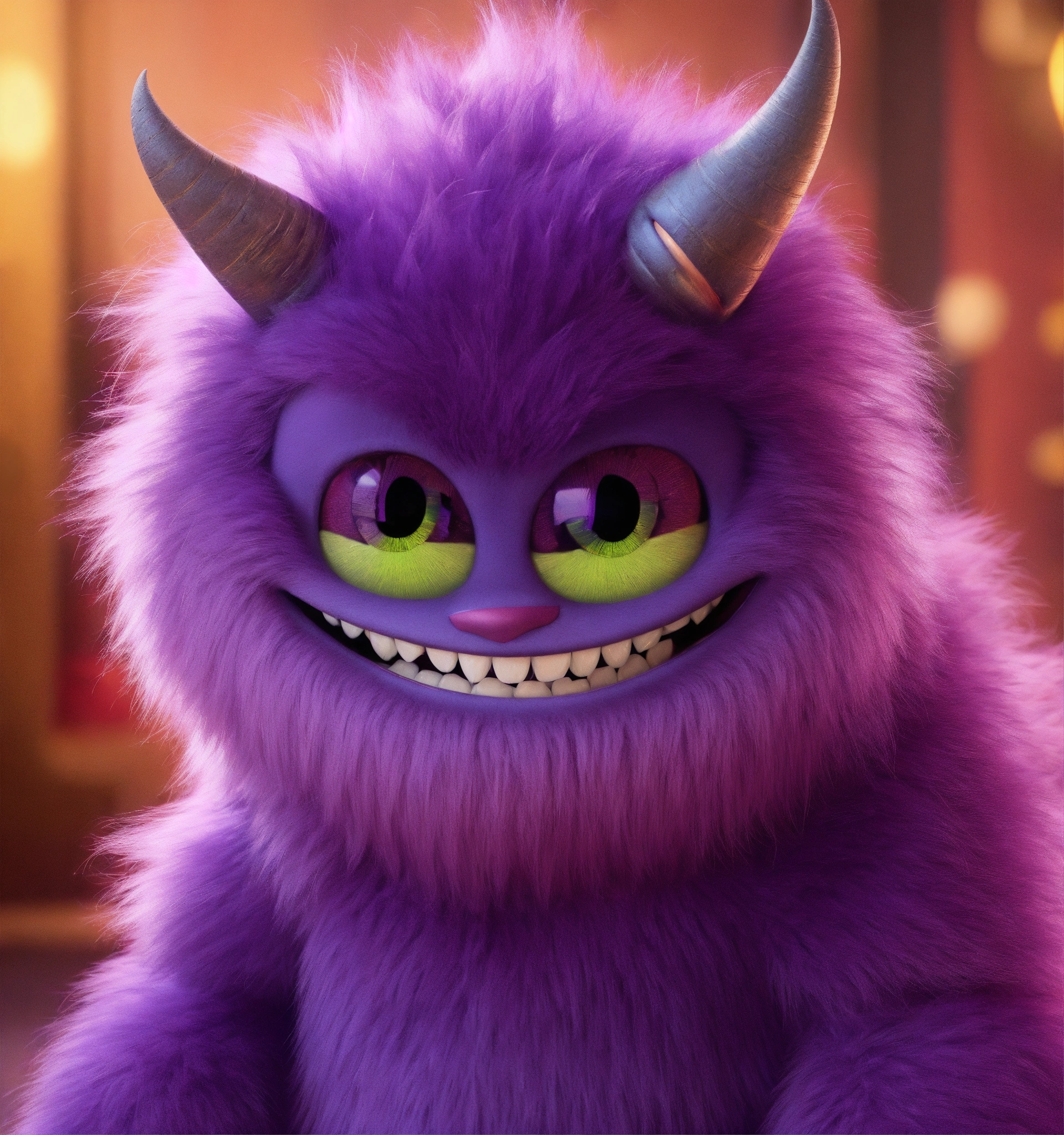 Zoom out on an over friendly, fun loving, hairy, tall, violet colored fur, monster, glowing eyes, cartoon character, pixar, disney