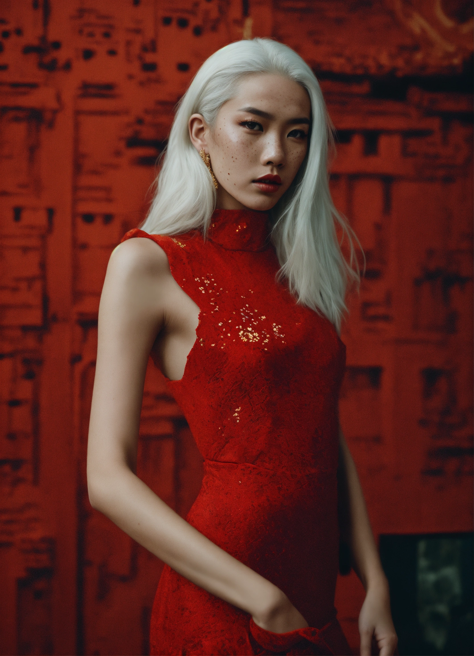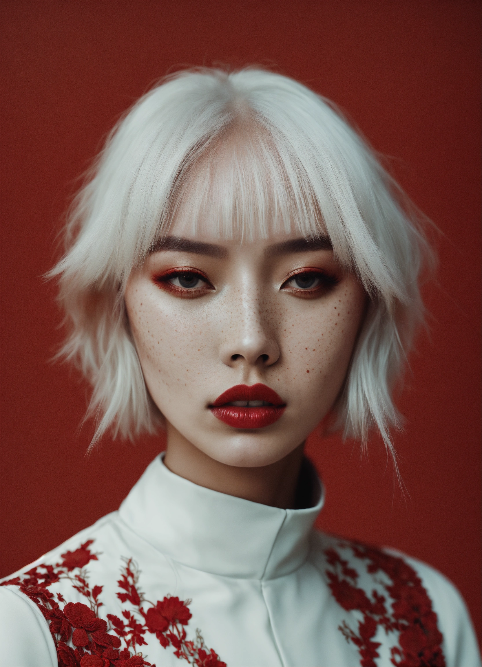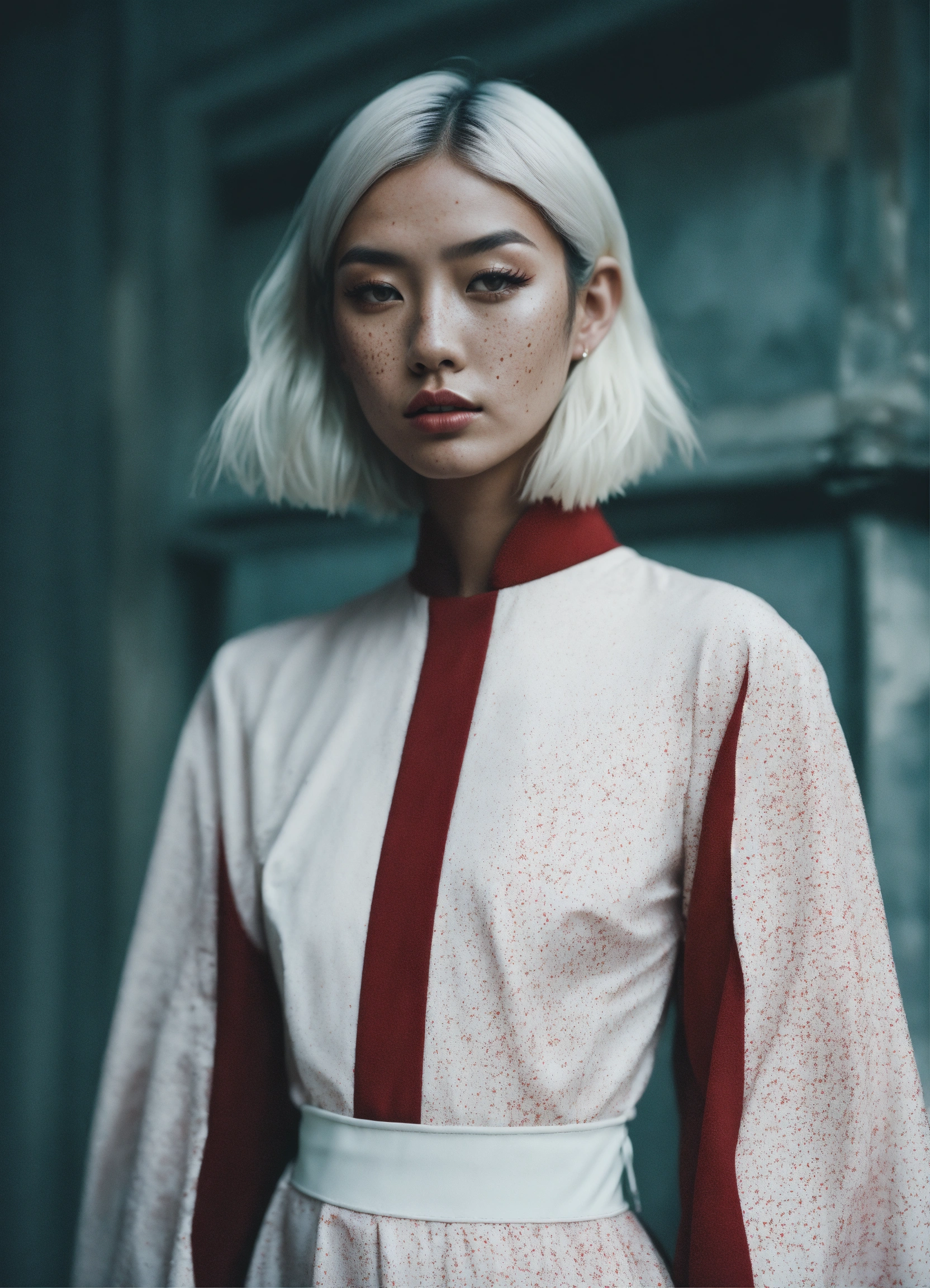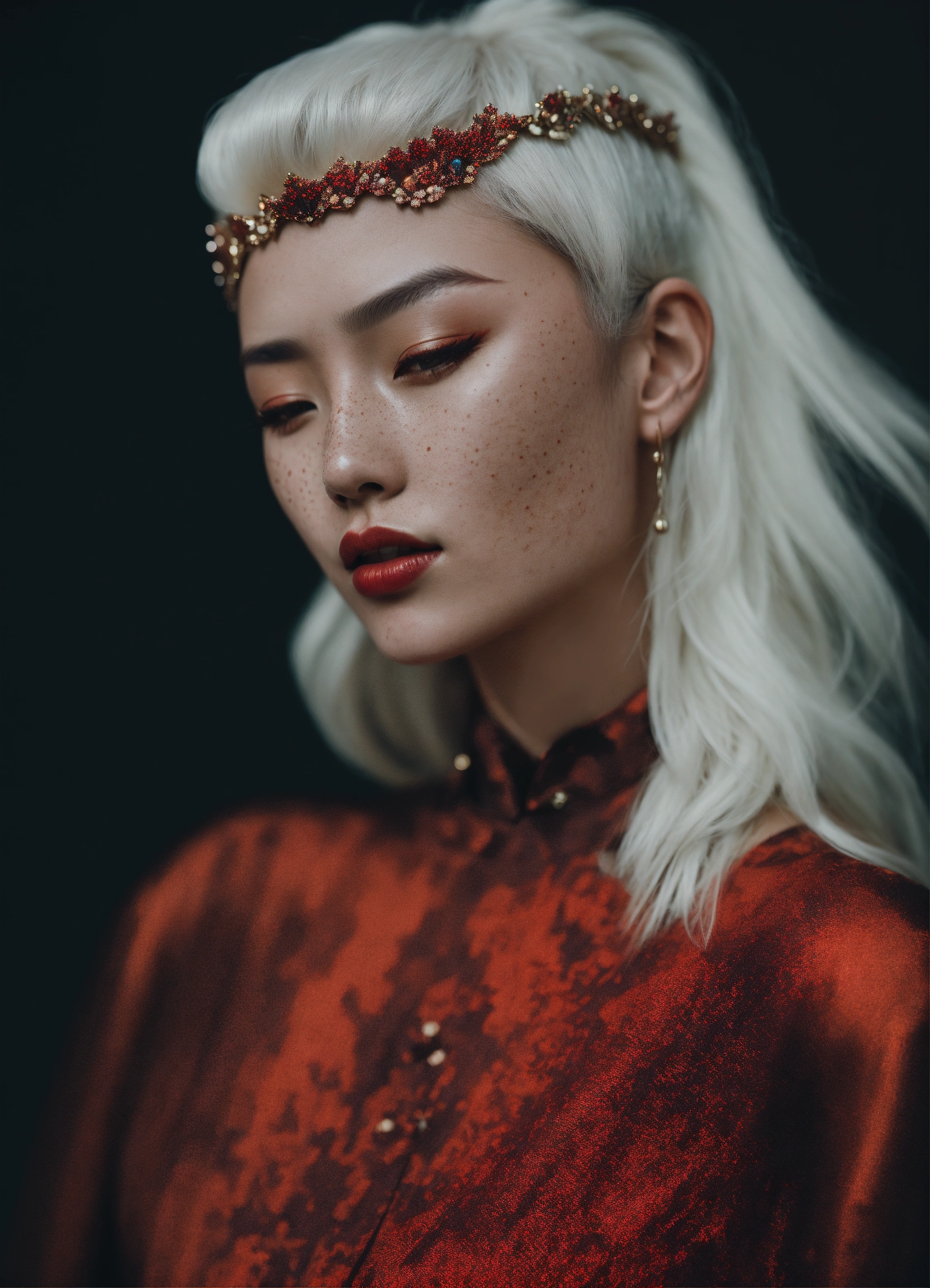 Beautiful model with attitude, asian exótico, white hair with red subtones, freckles, haris nukem, editorial magazine, full body, fashion photography, high future fashion, alessio albi photographer, crown in head, print dress