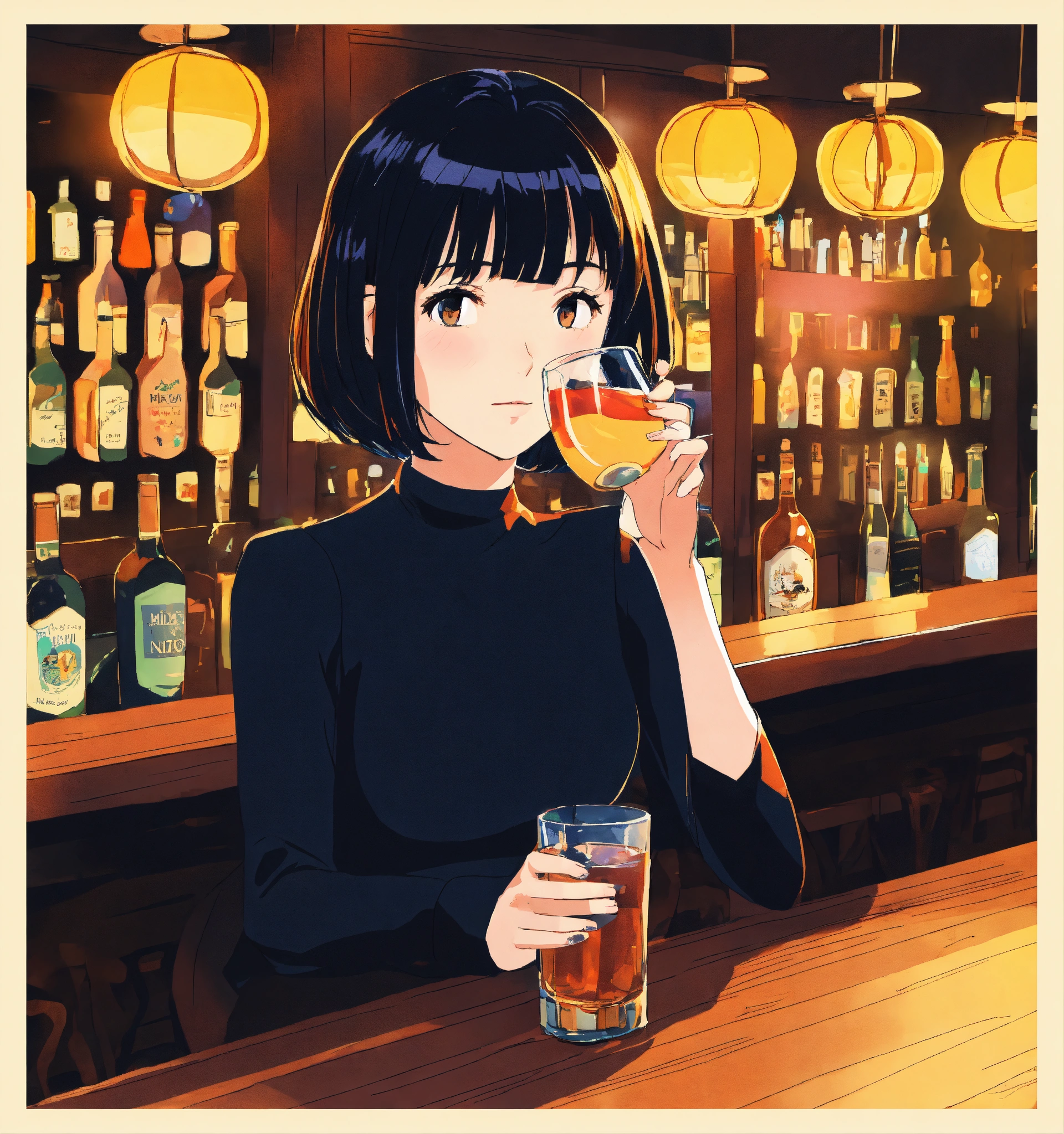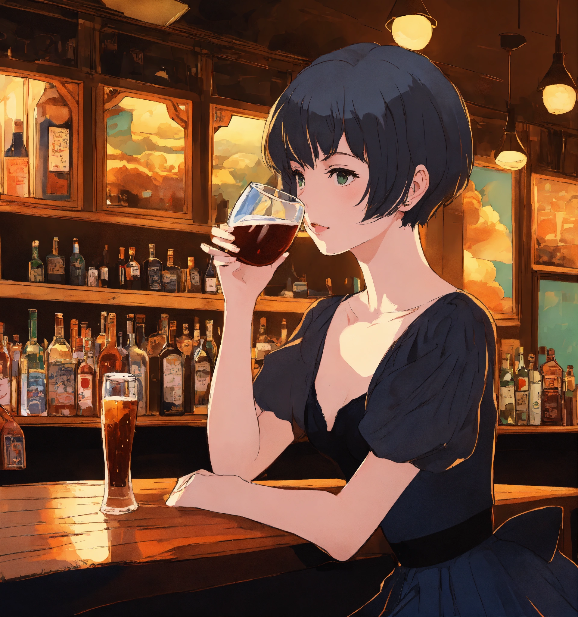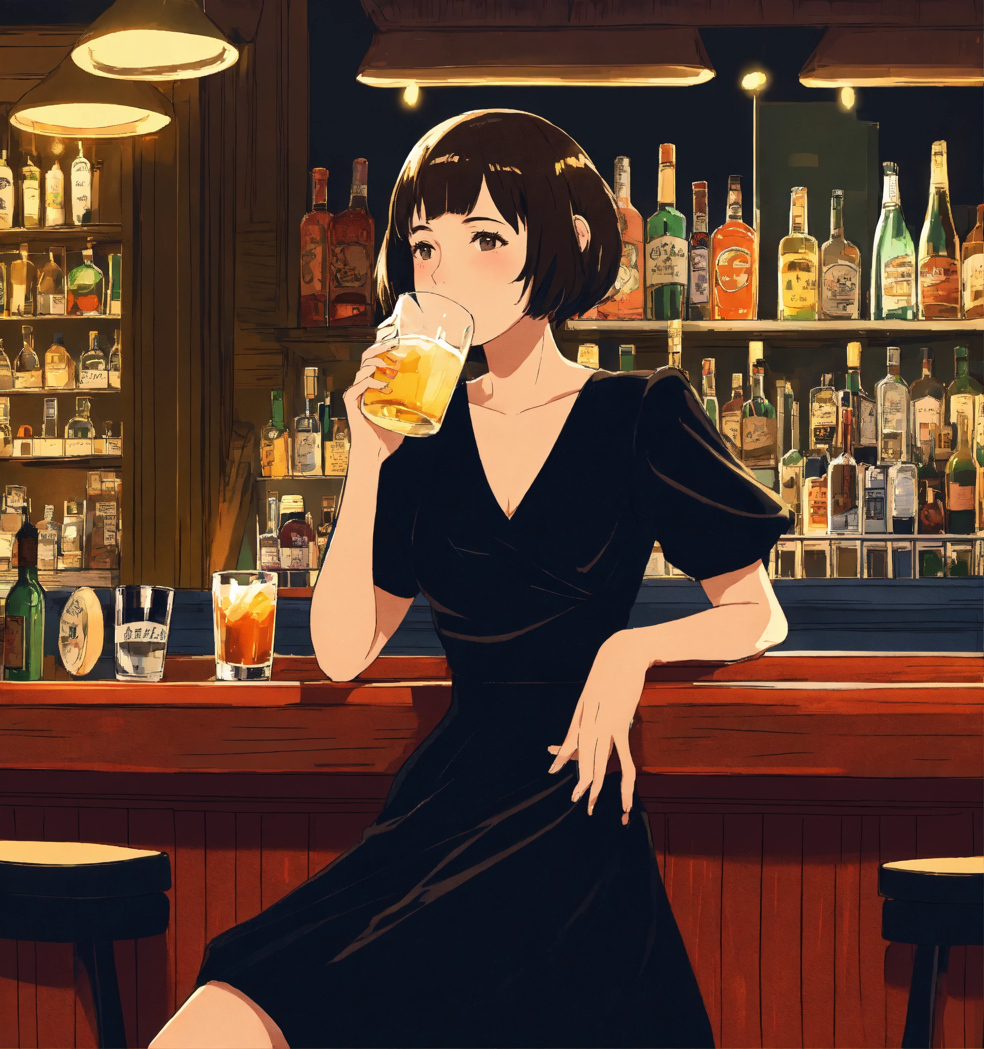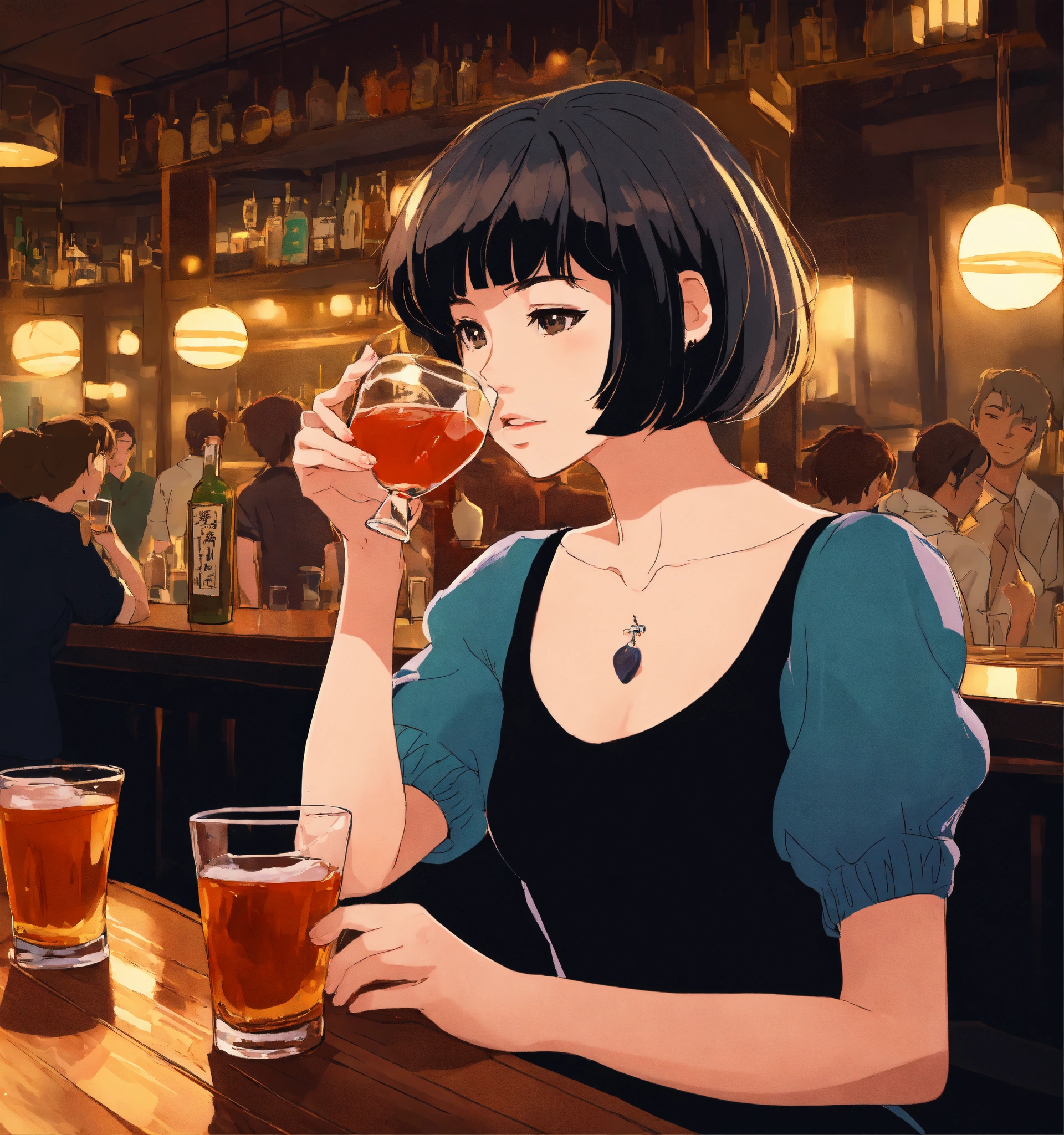 1 woman, beautiful, 20 years old, short hair, drinking at a bar, black dress, studio ghibli style illustration, wide angle