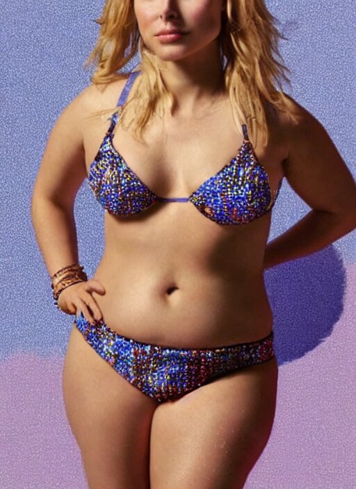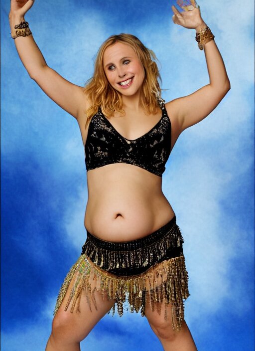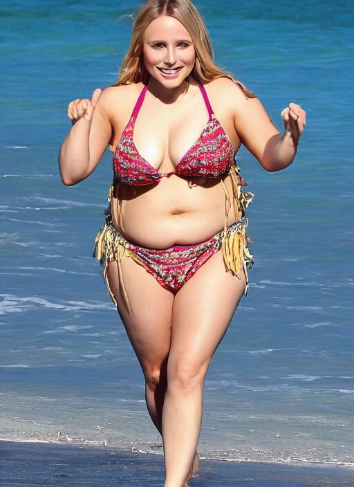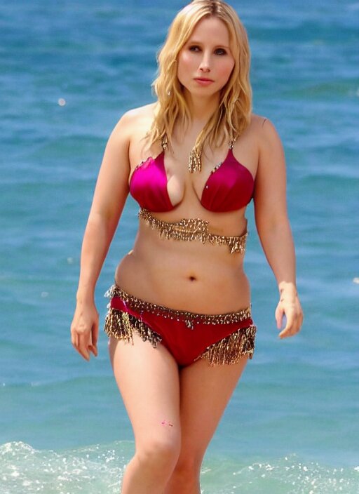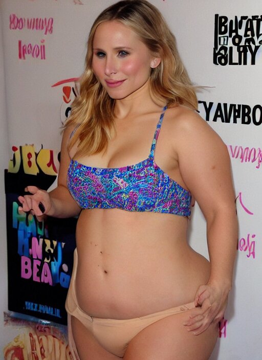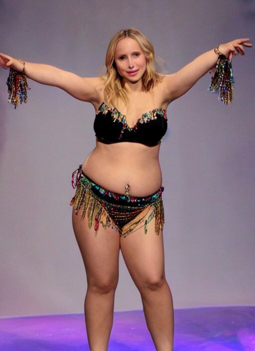 Jiggly sexy fat chonky thick chubby curvy kristen bell with a very big fat round hanging chubby belly dancing in a bikini